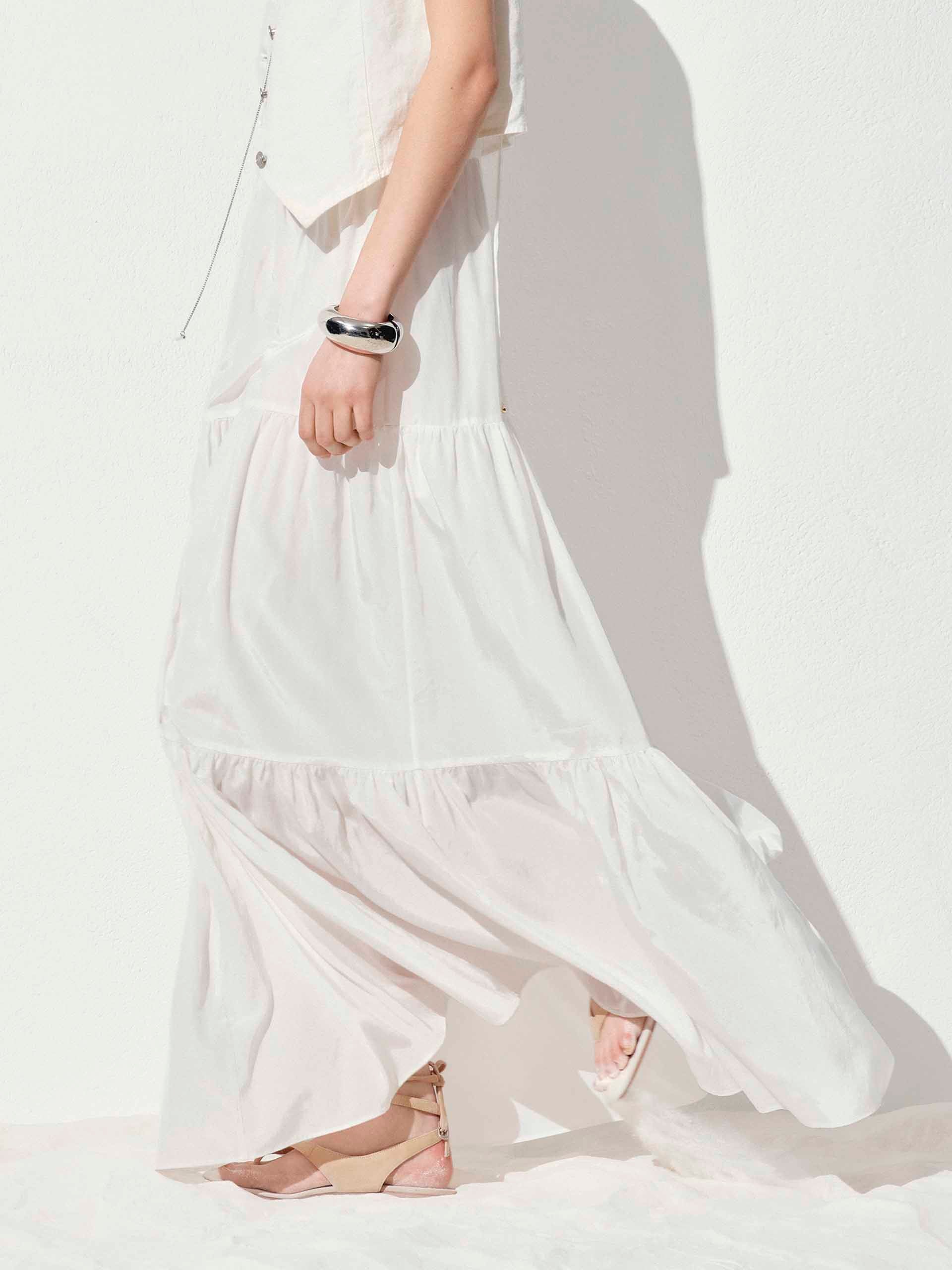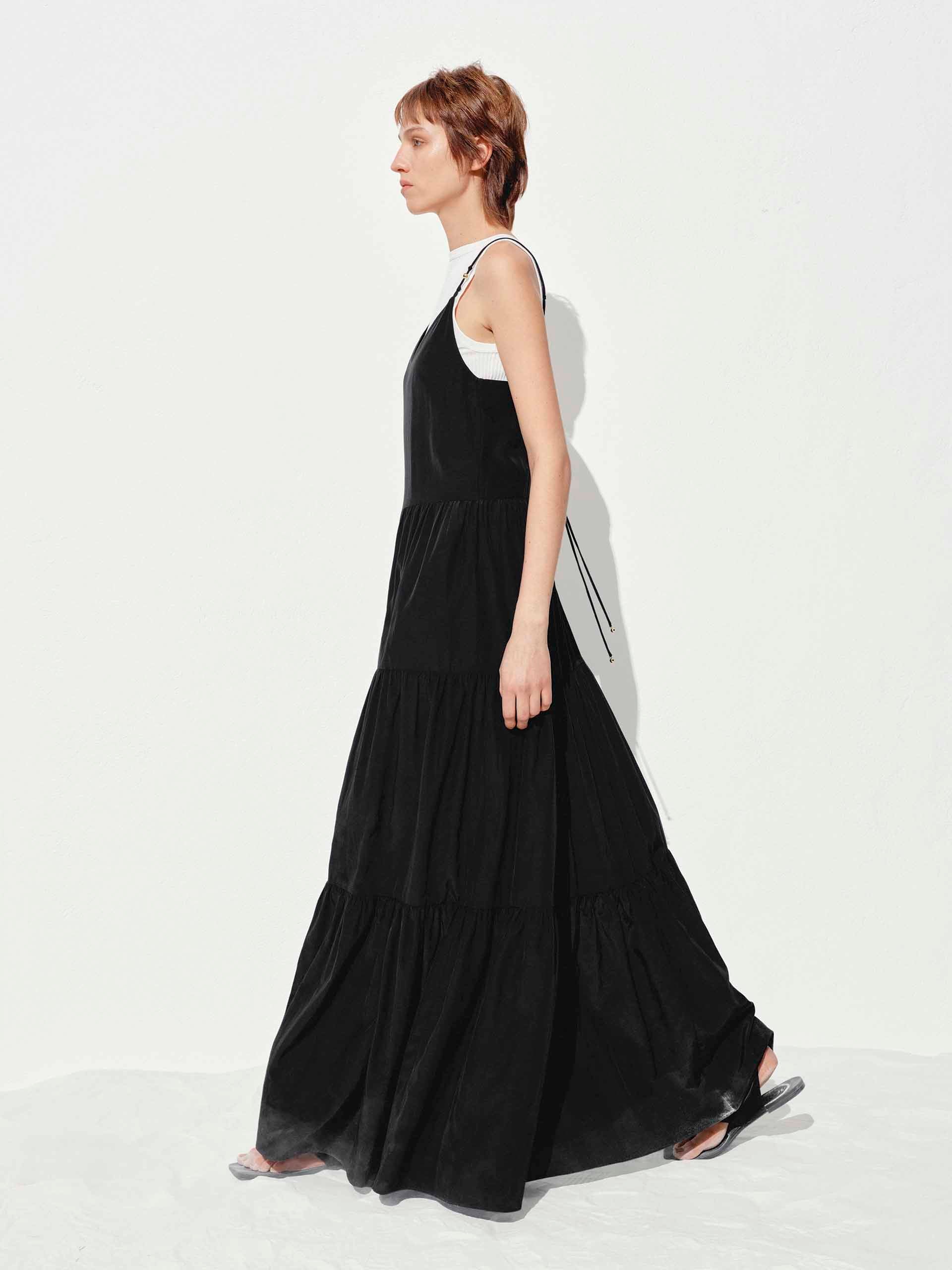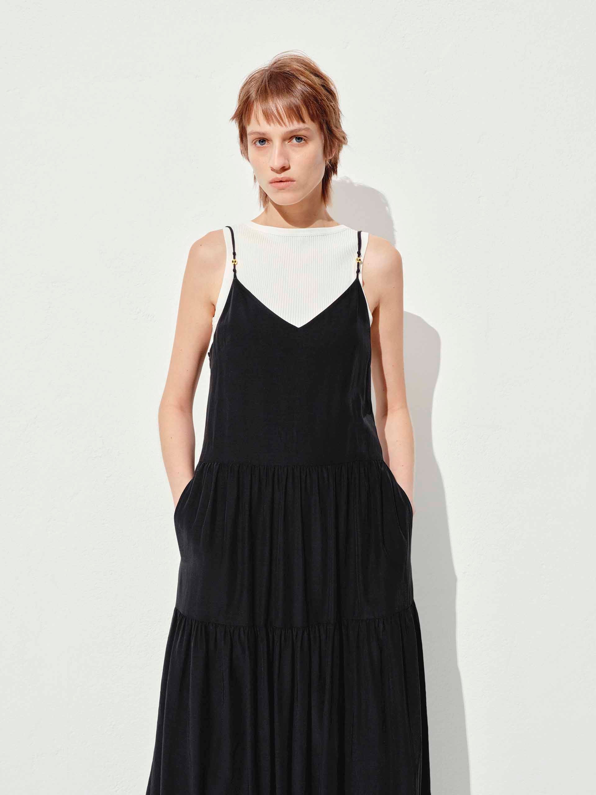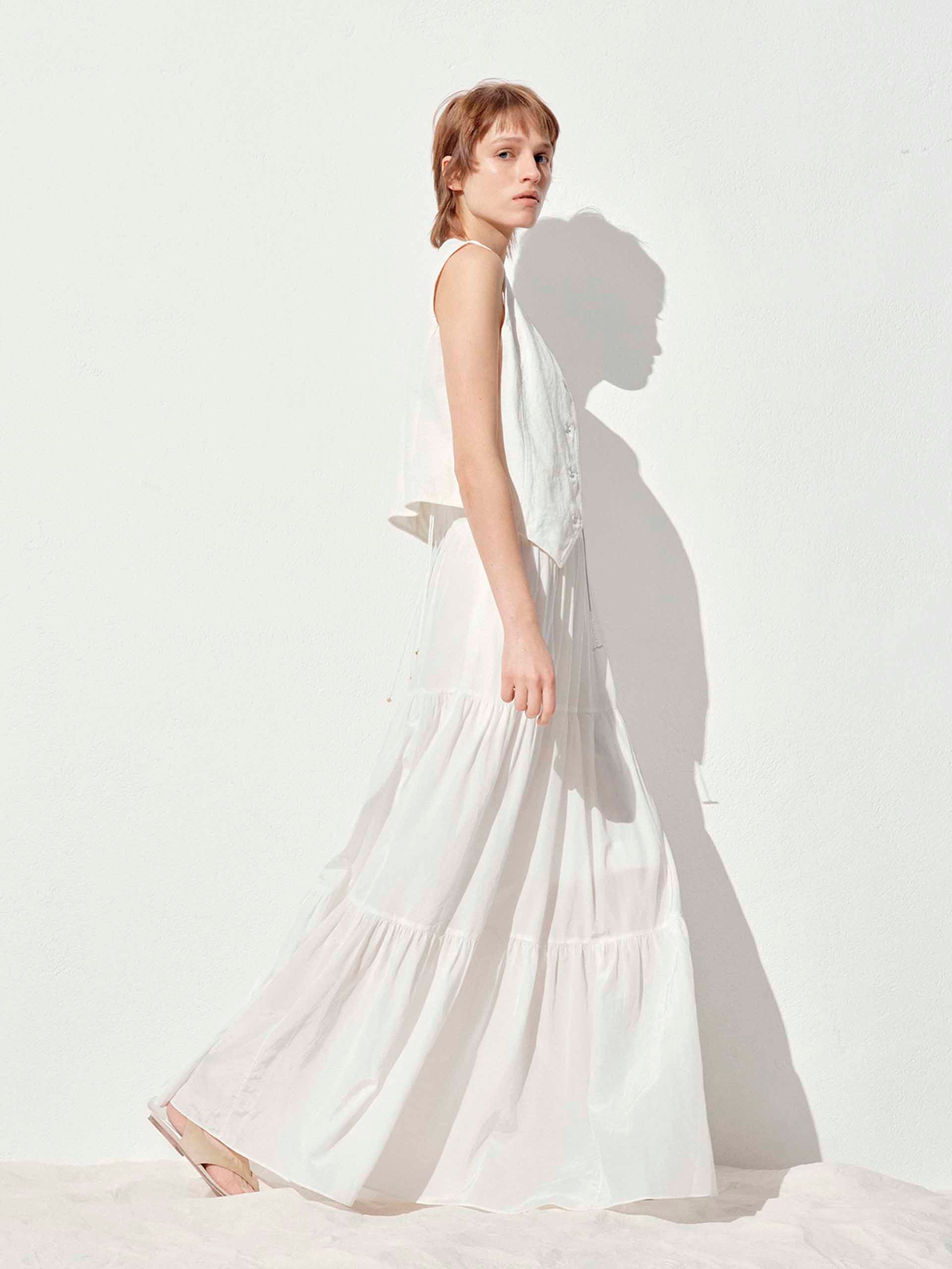 Expertly crafted for comfort and style, our spaghetti straps maxi dress features delicate spaghetti straps and a flattering V-neckline. The pleated design adds texture and dimension, while the side pockets provide convenience and functionality. Pair with the matching waistcoat for a more sophisticated and charming look.