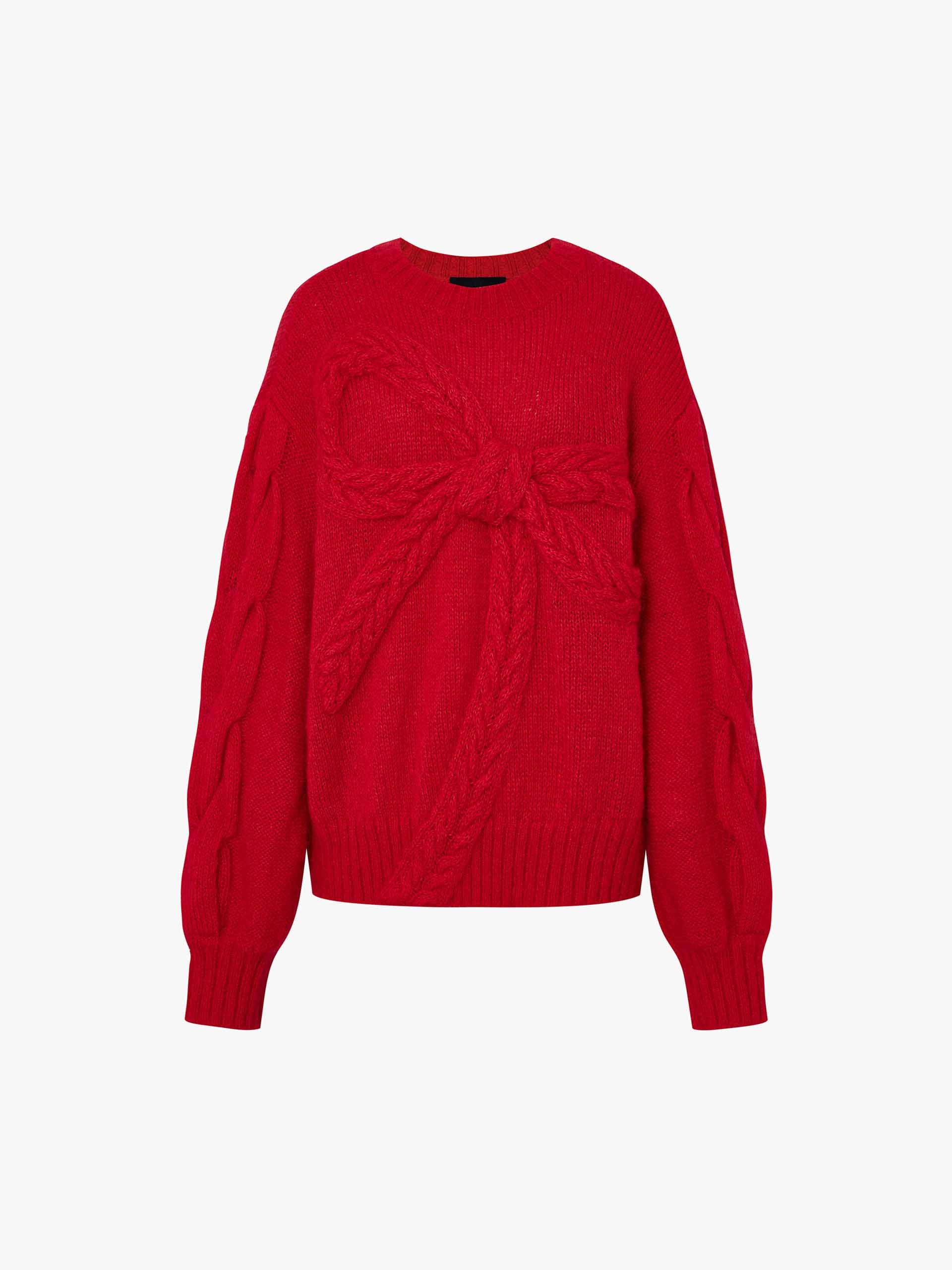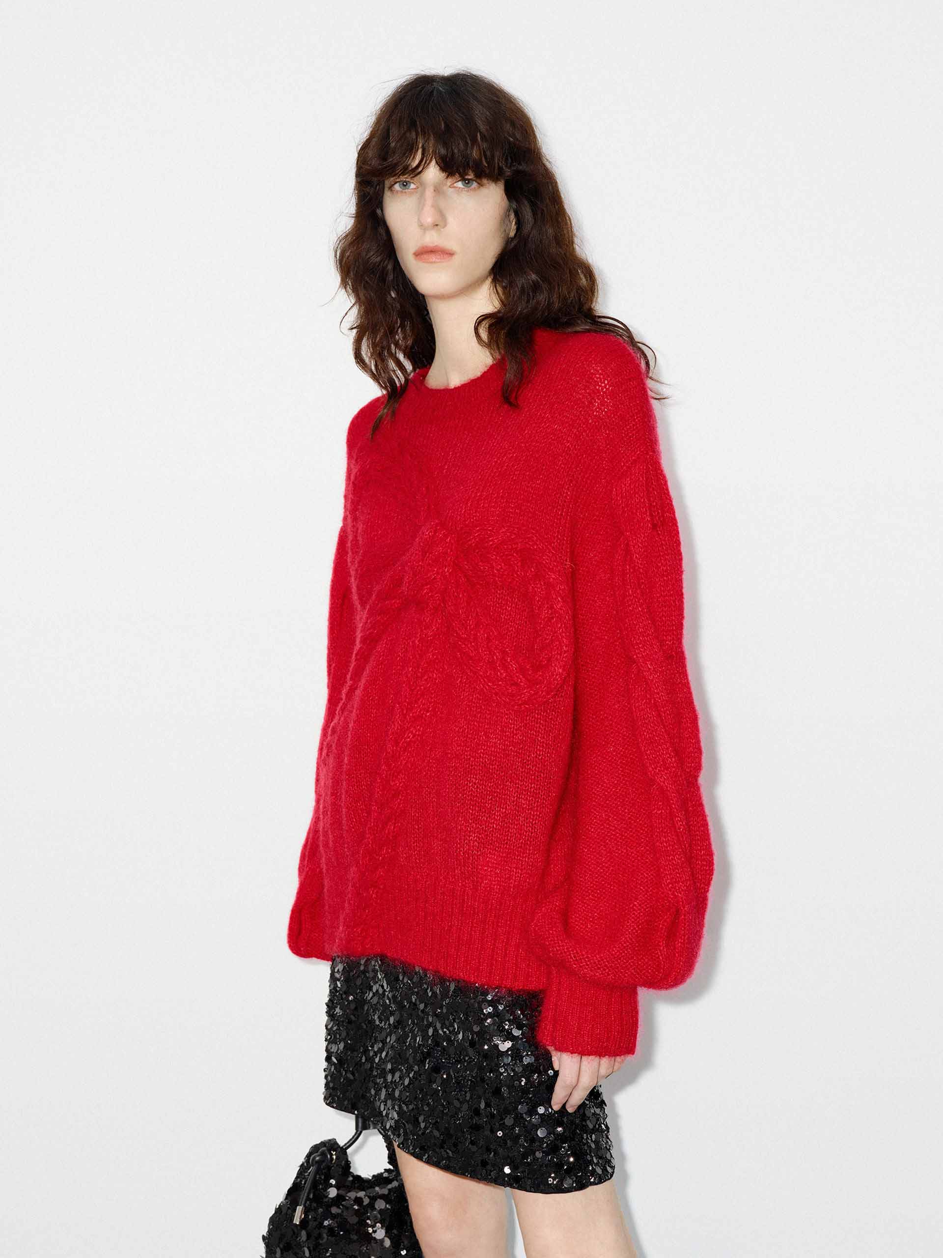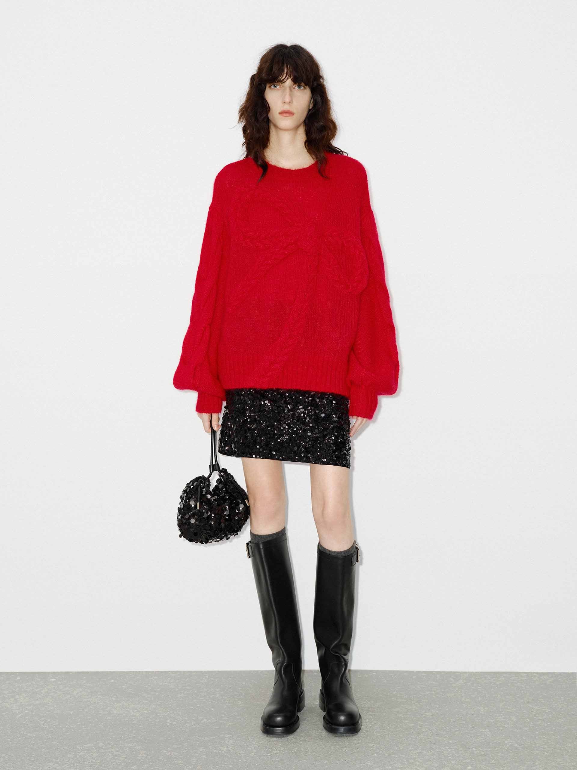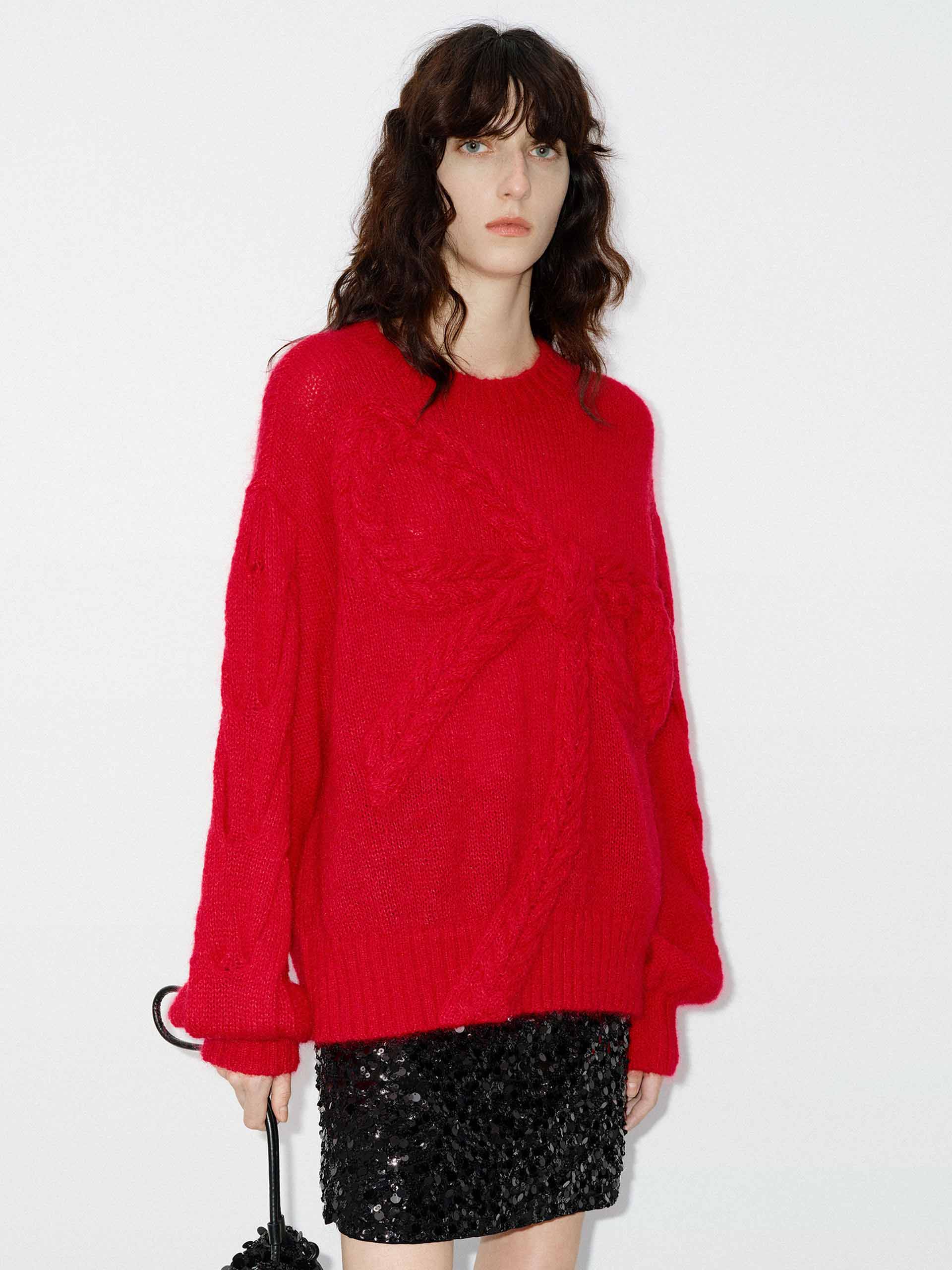 This sweater is made from a blend of wool, Mohair, and other fibers, giving it a luxuriously weighty hand feel. Its relaxed silhouette allows easy layering, while the knitted bow detail on the front adds a chic touch. Available in red and grey, pair it with a mini sequin skirt for a stylish ensemble.