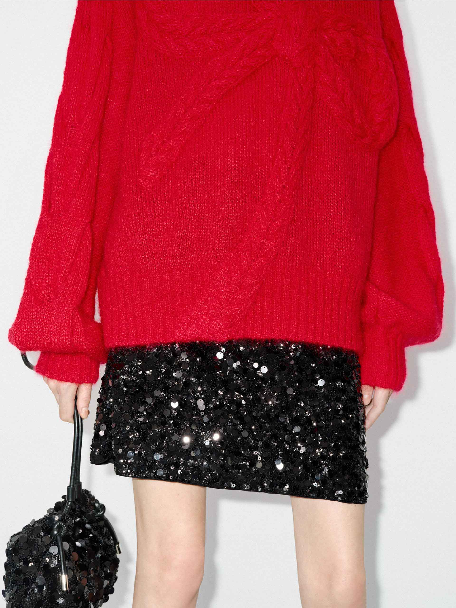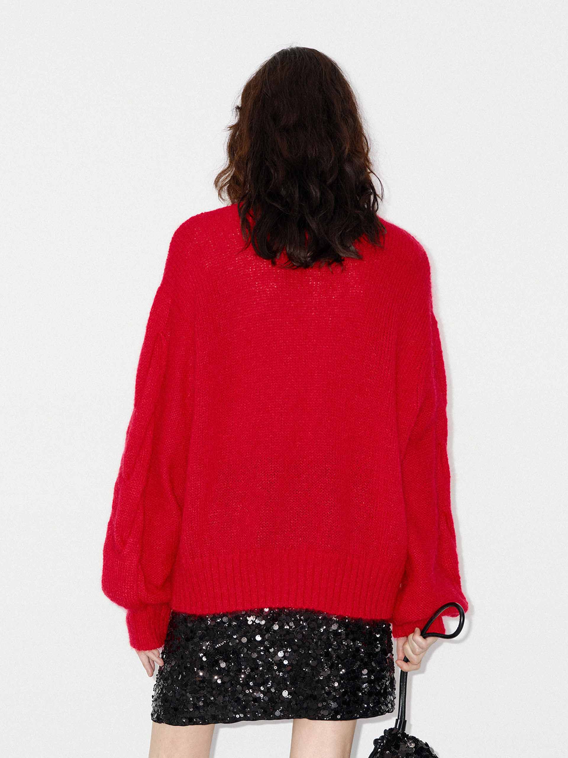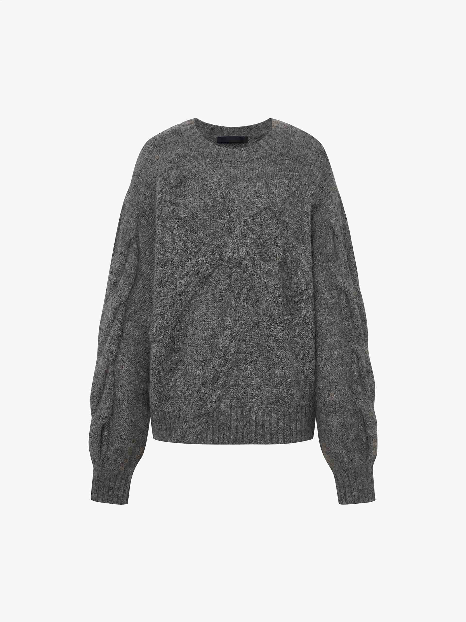 This sweater is made from a blend of wool, Mohair, and other fibers, giving it a luxuriously weighty hand feel. Its relaxed silhouette allows easy layering, while the knitted bow detail on the front adds a chic touch. Available in red and grey, pair it with a mini sequin skirt for a stylish ensemble.