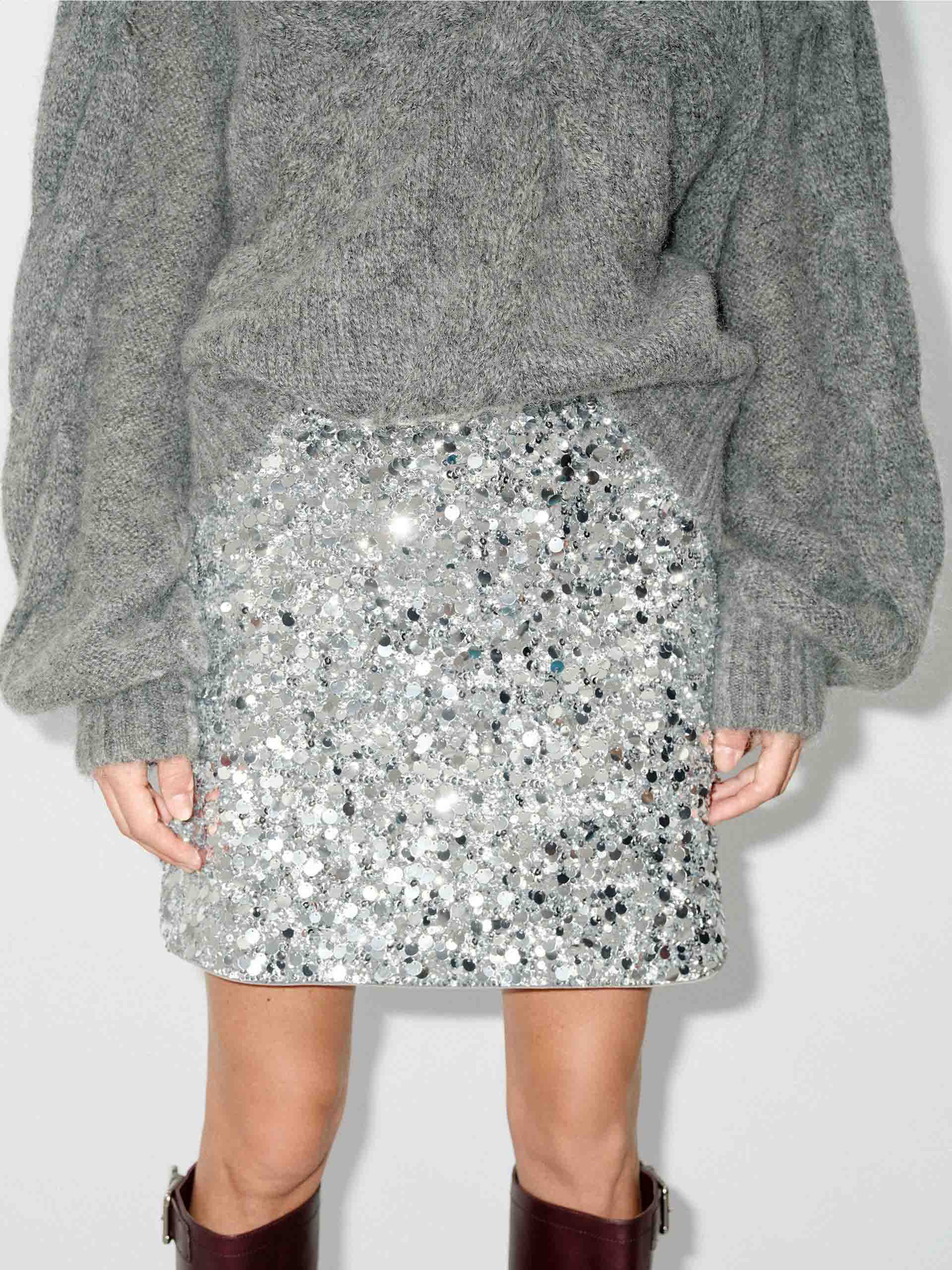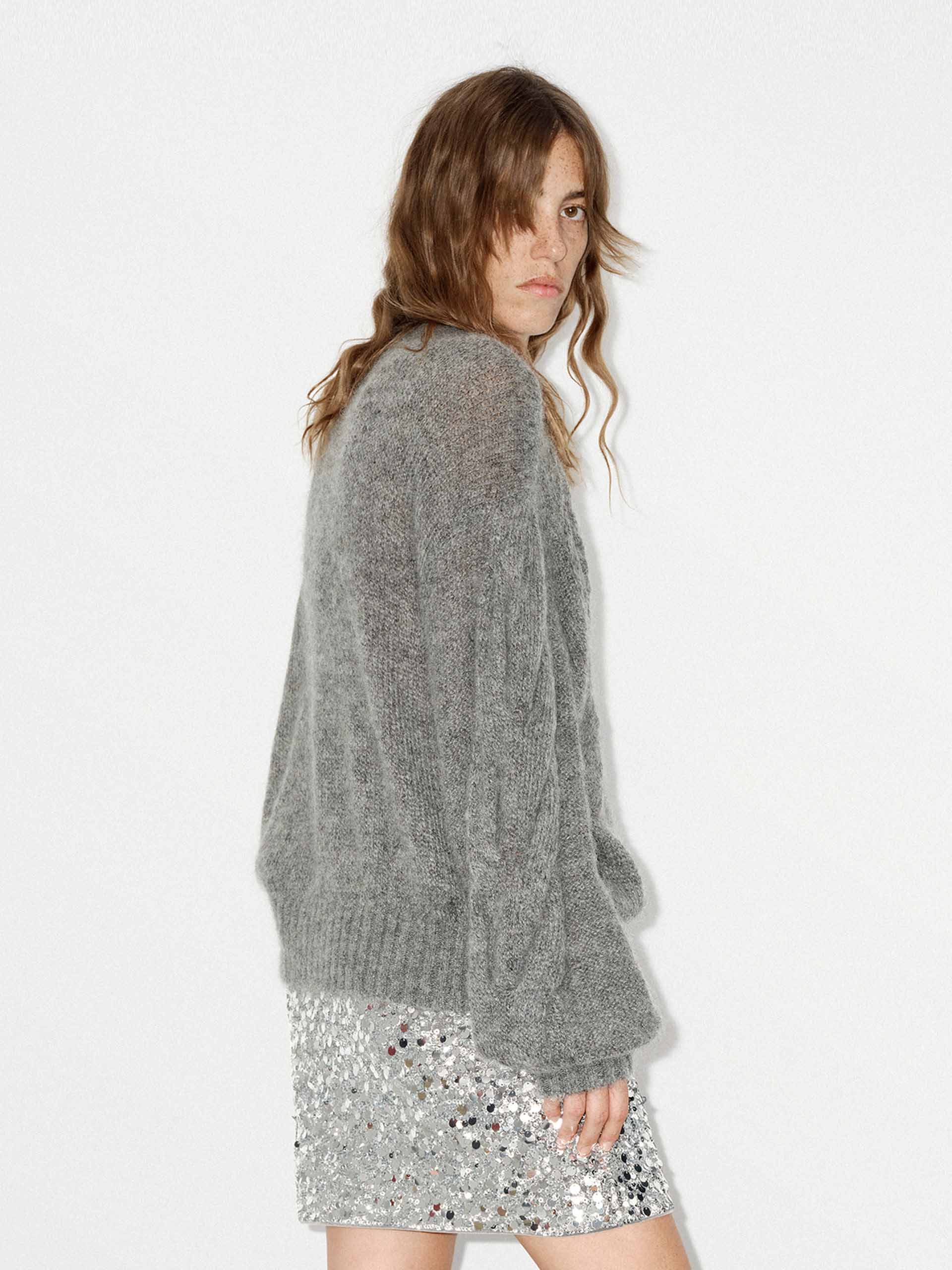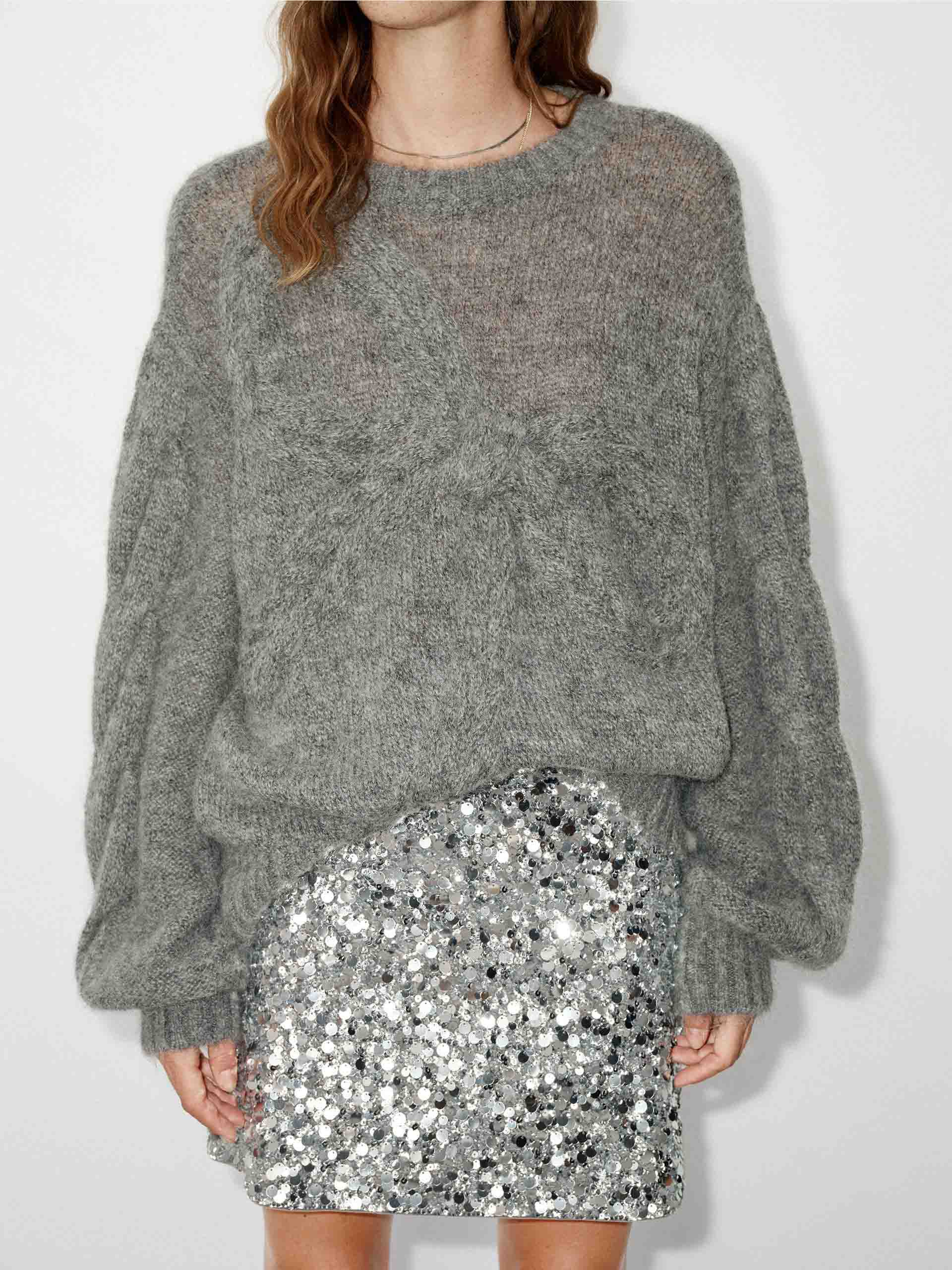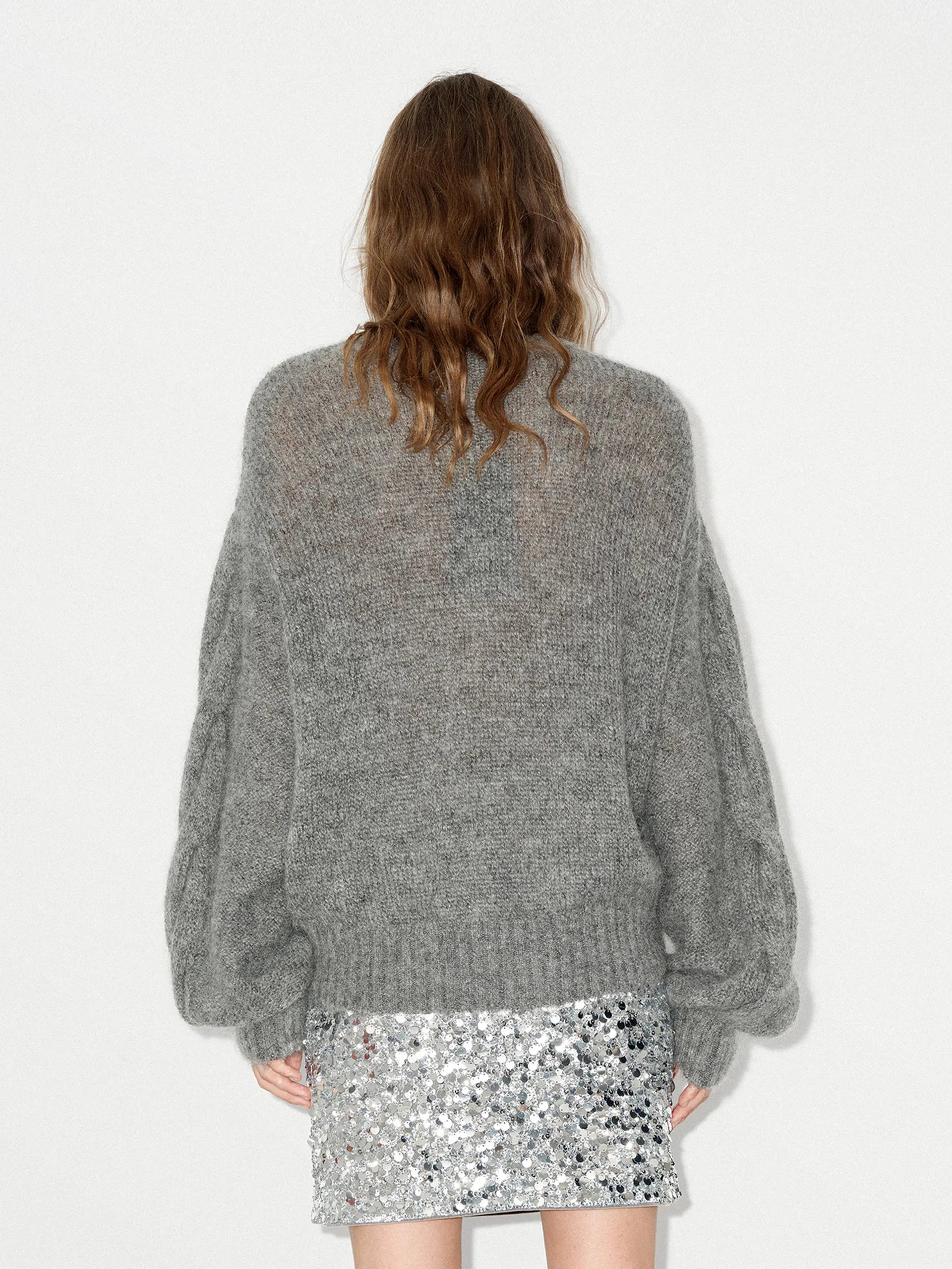 This sweater is made from a blend of wool, Mohair, and other fibers, giving it a luxuriously weighty hand feel. Its relaxed silhouette allows easy layering, while the knitted bow detail on the front adds a chic touch. Available in red and grey, pair it with a mini sequin skirt for a stylish ensemble.