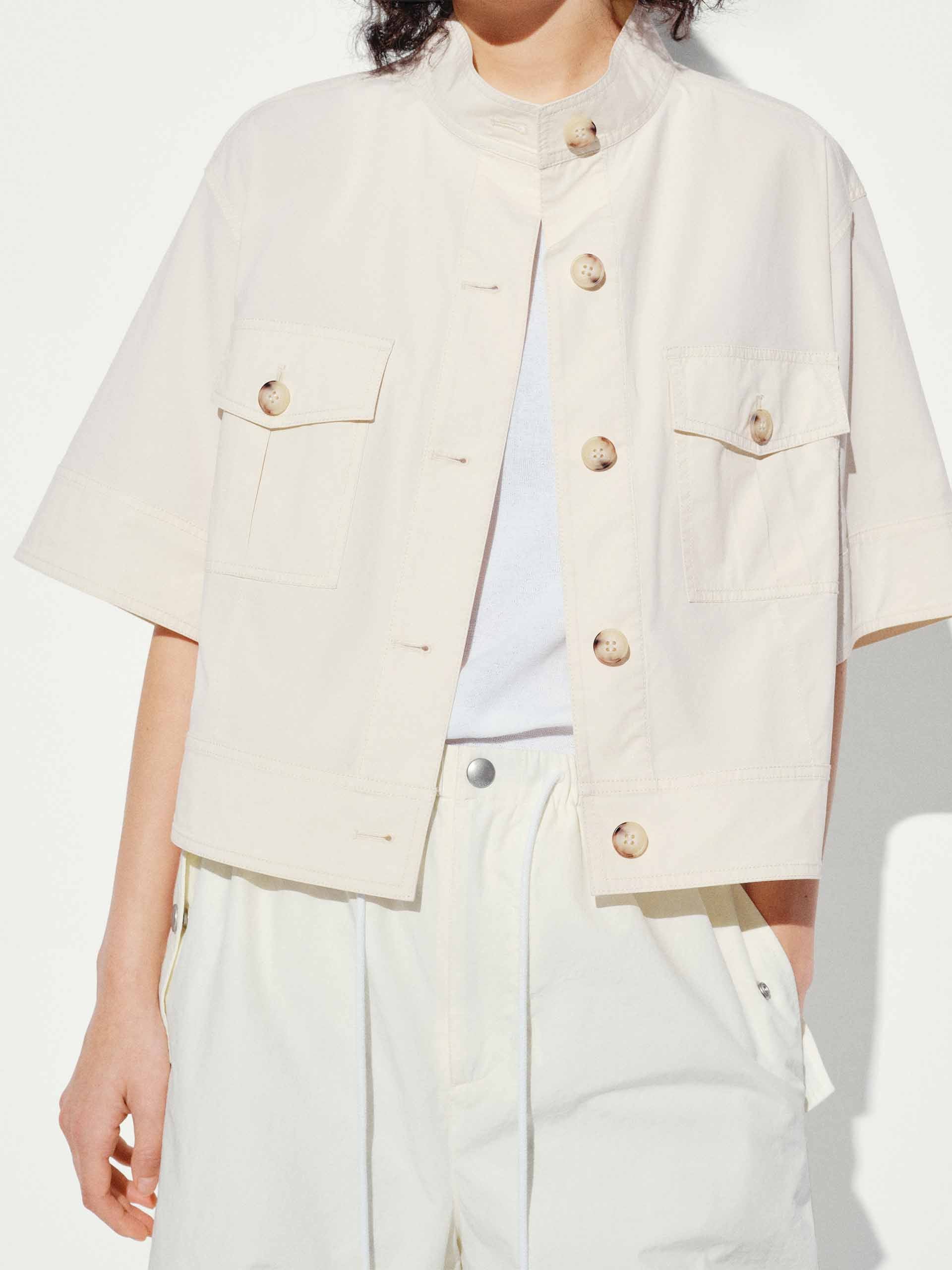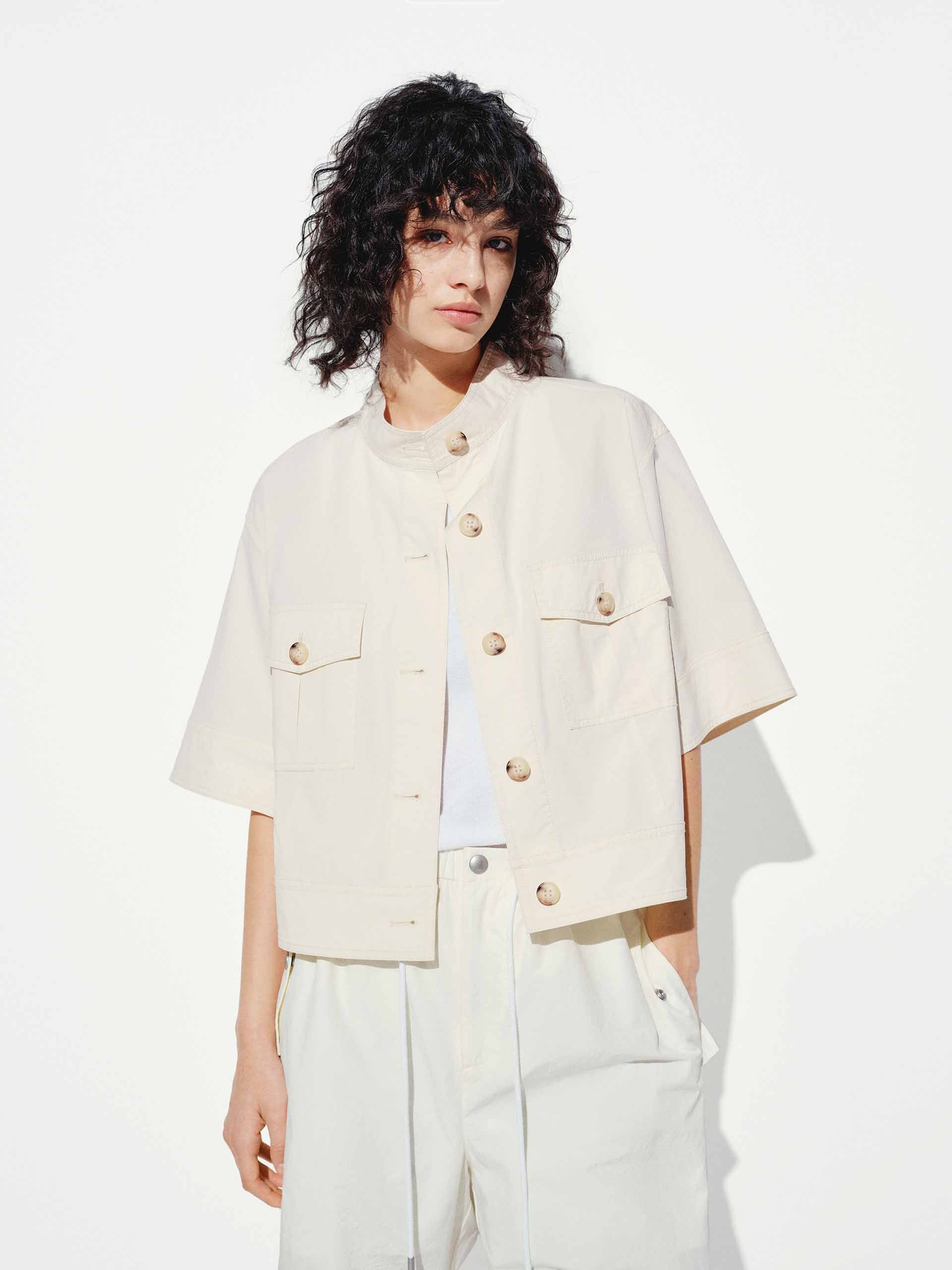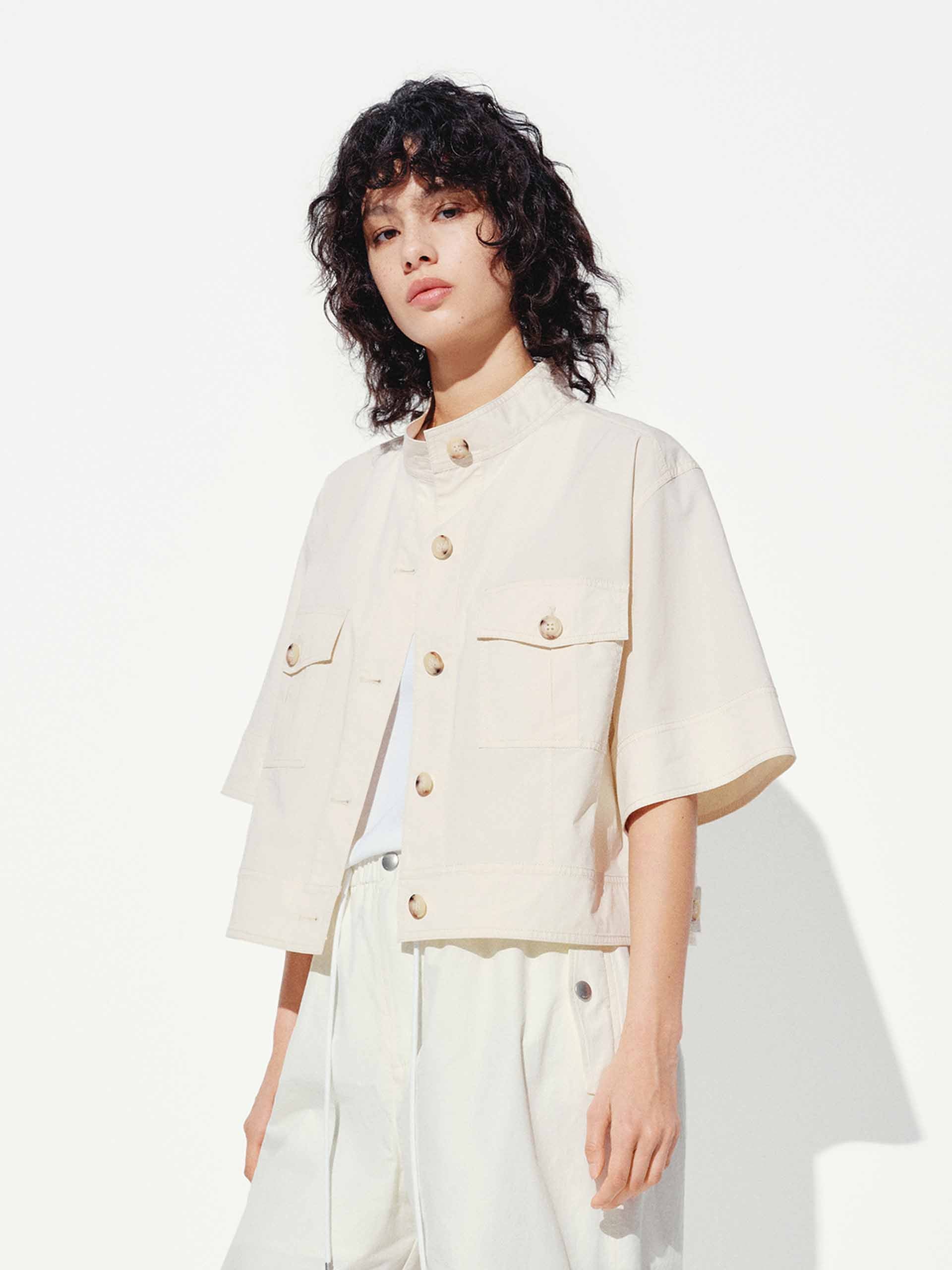 Make a bold statement with this cropped-fit jacket, designed to blend utilitarian edge with contemporary style. The structured stand-up collar and short sleeves create a striking silhouette, while the button-front closure ensures a polished finish. Wear it open for relaxed vibes or buttoned up for a more tailored look.