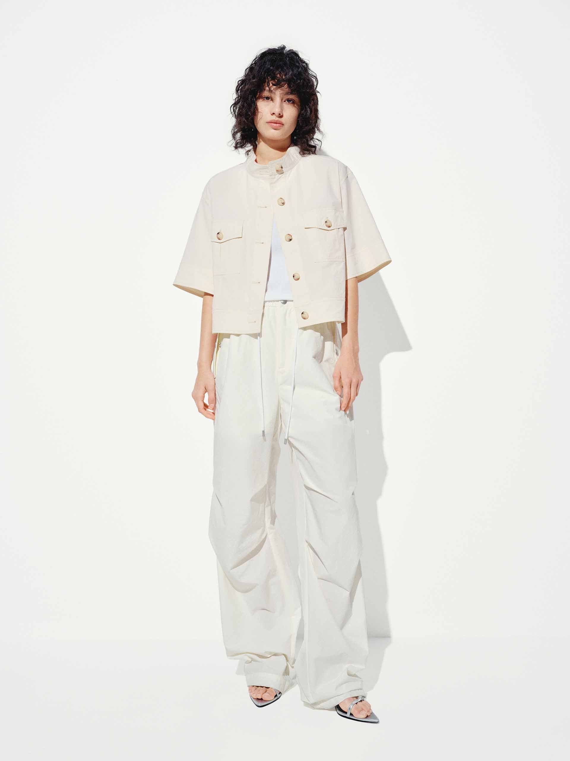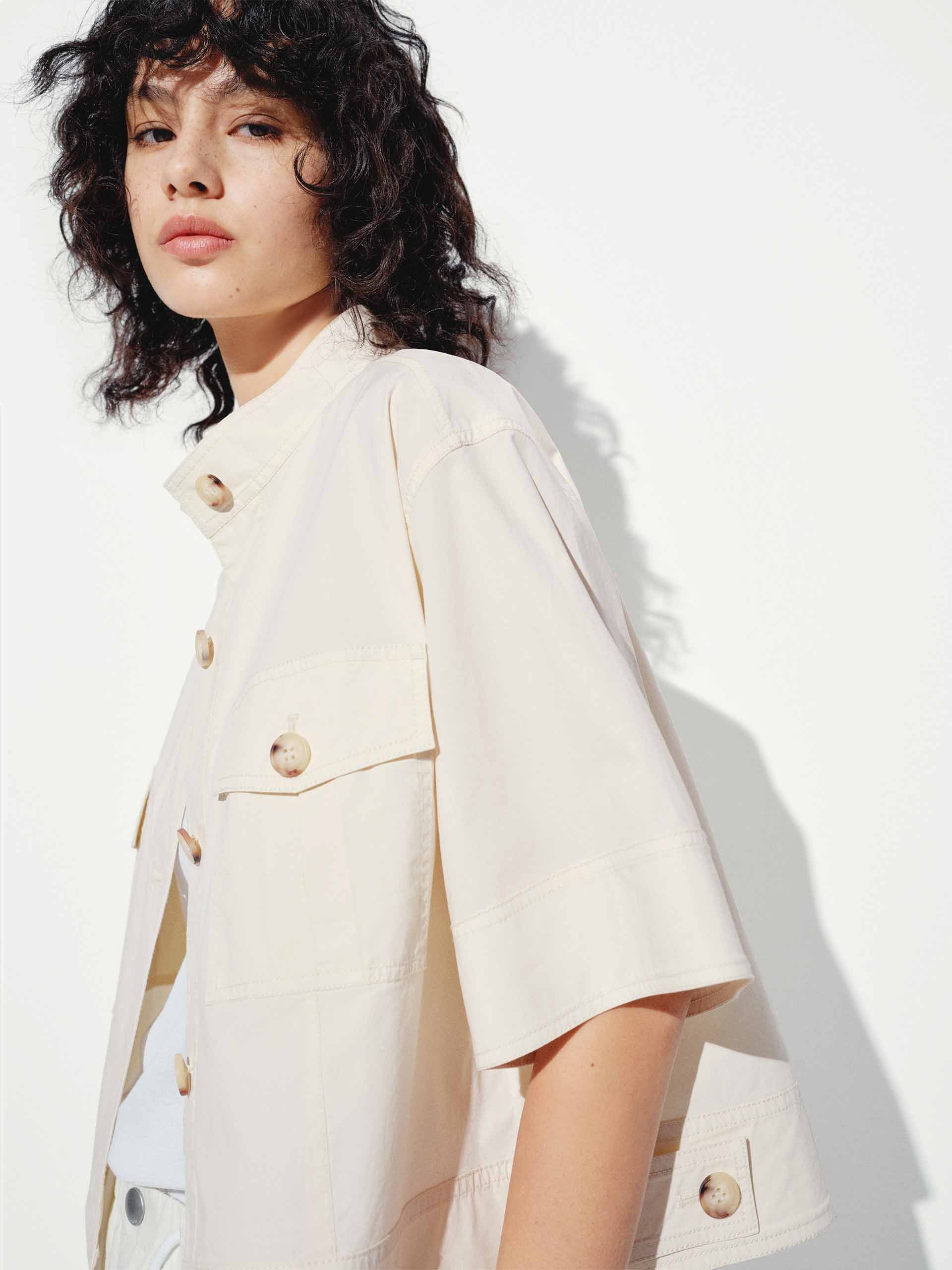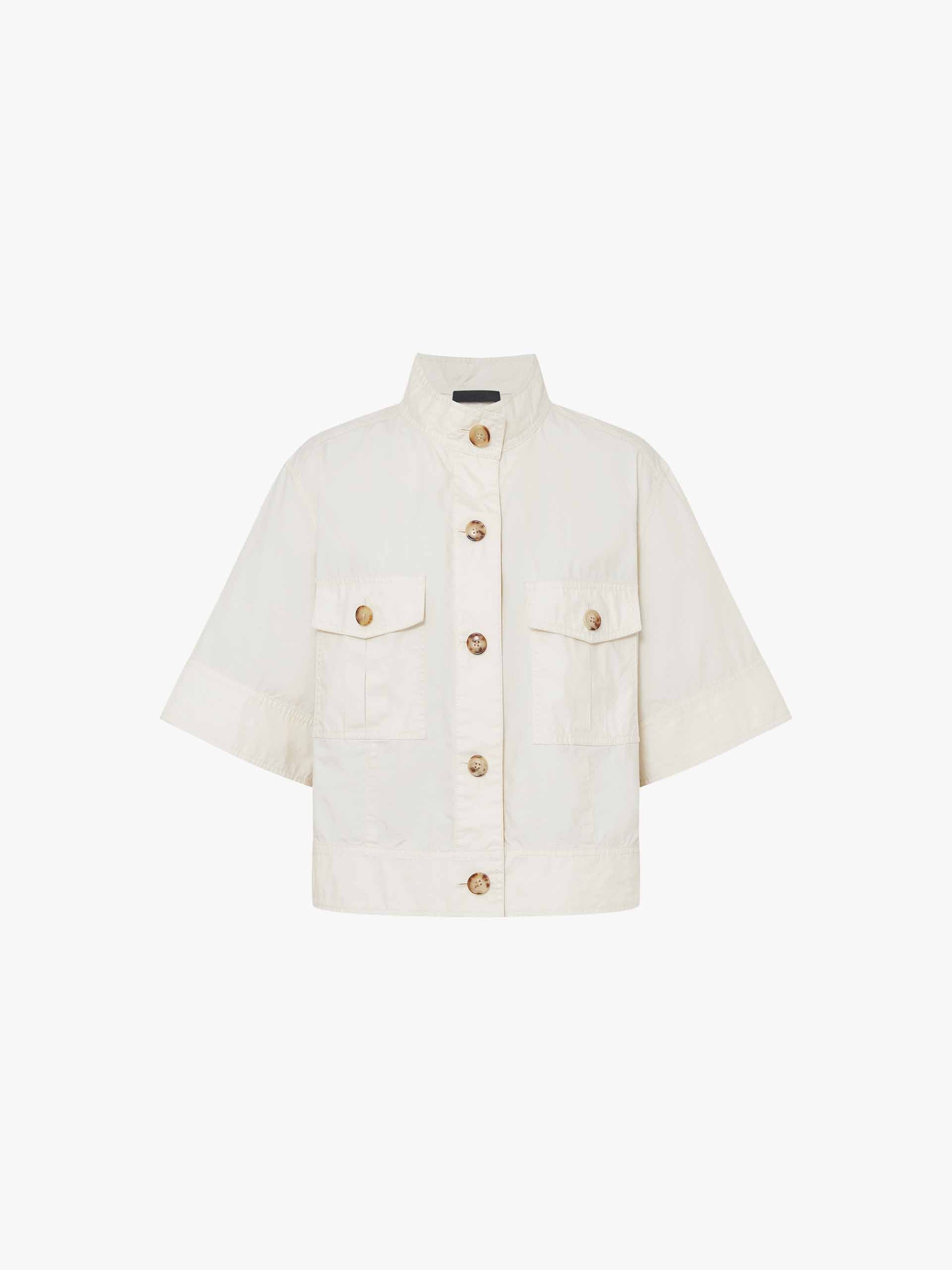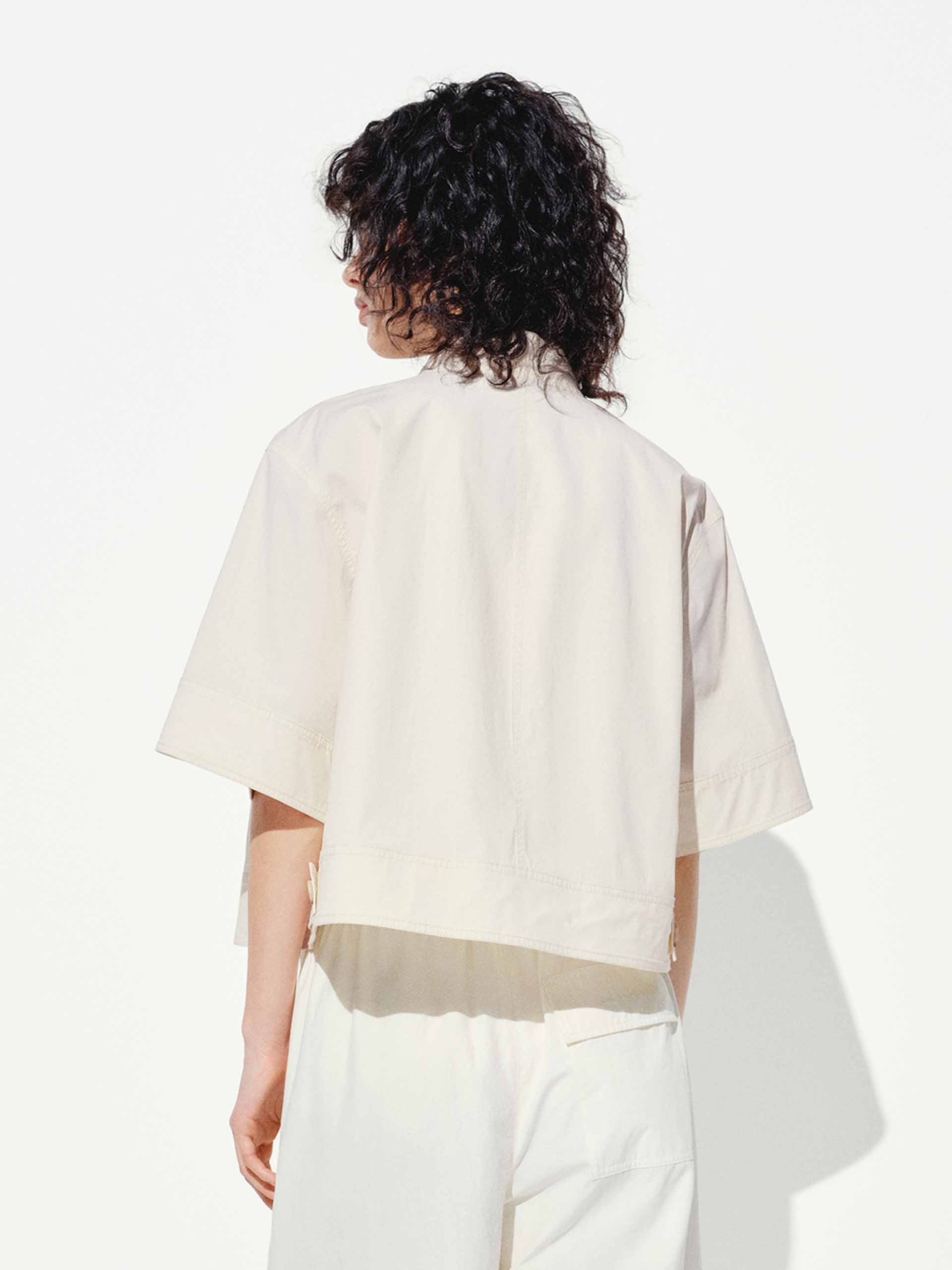 Make a bold statement with this cropped-fit jacket, designed to blend utilitarian edge with contemporary style. The structured stand-up collar and short sleeves create a striking silhouette, while the button-front closure ensures a polished finish. Wear it open for relaxed vibes or buttoned up for a more tailored look.