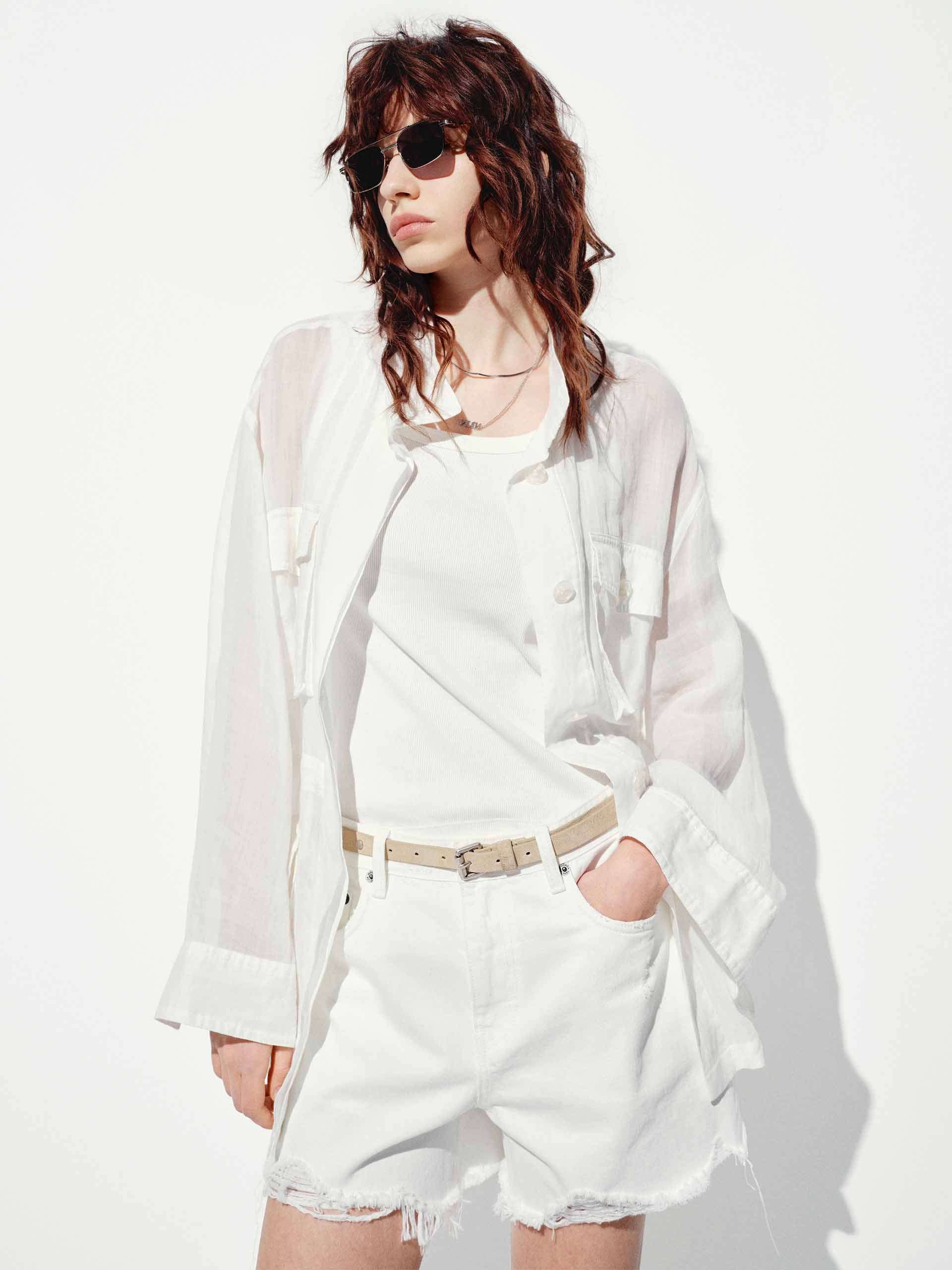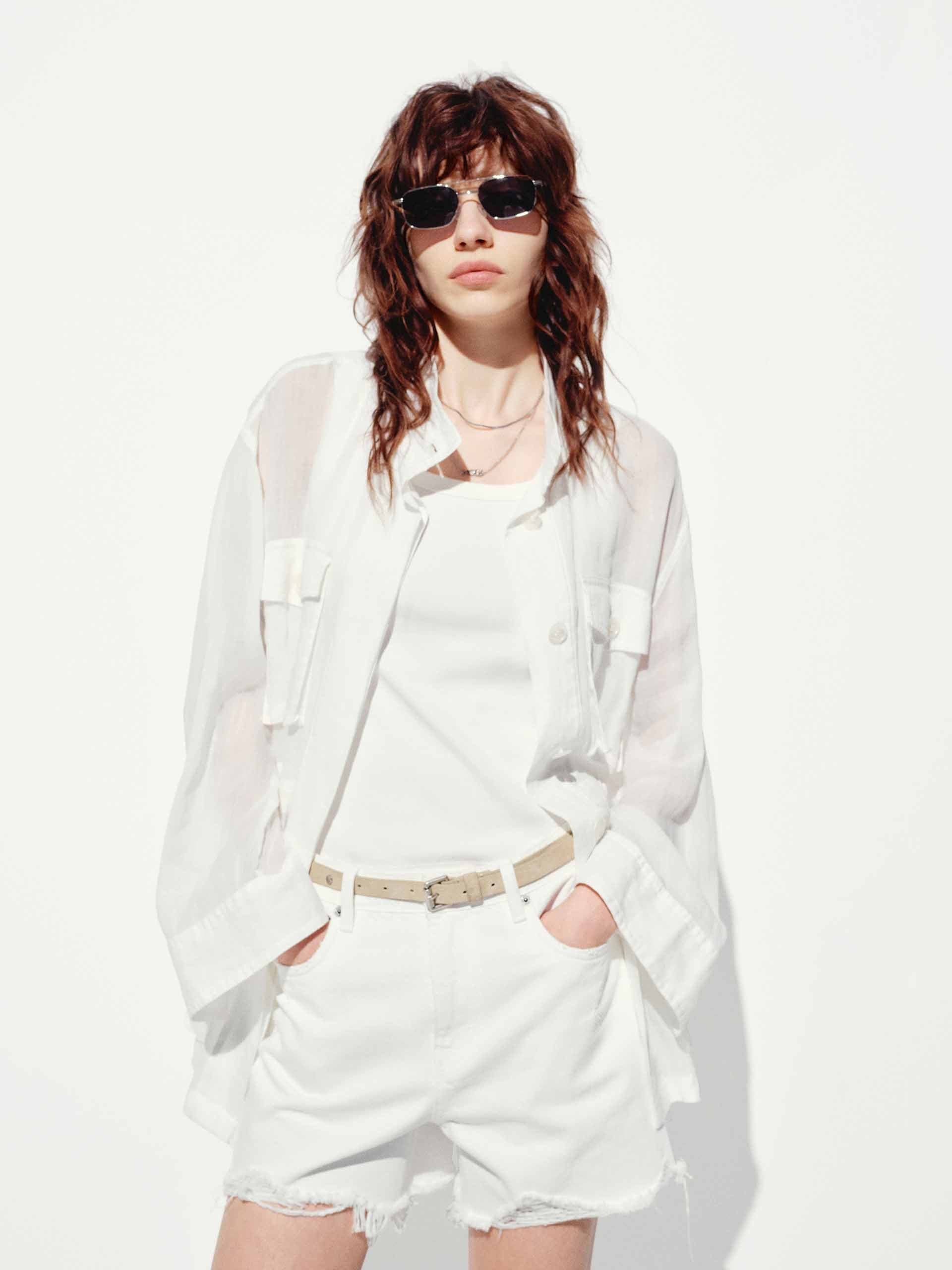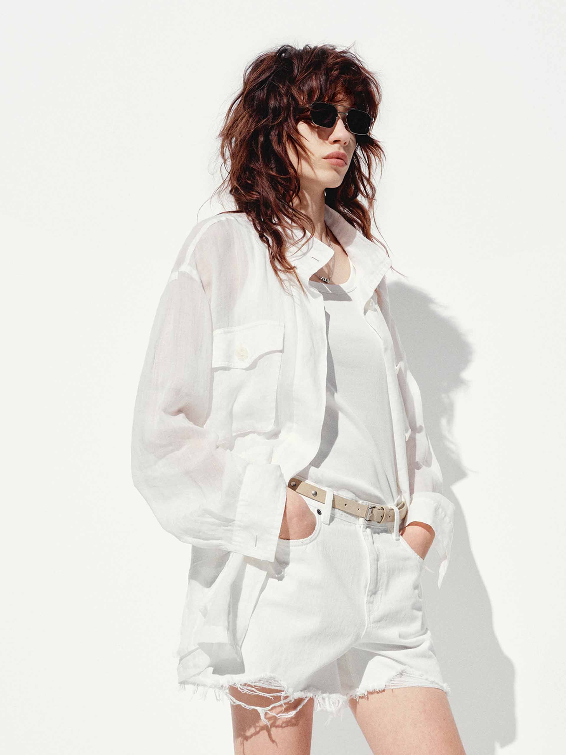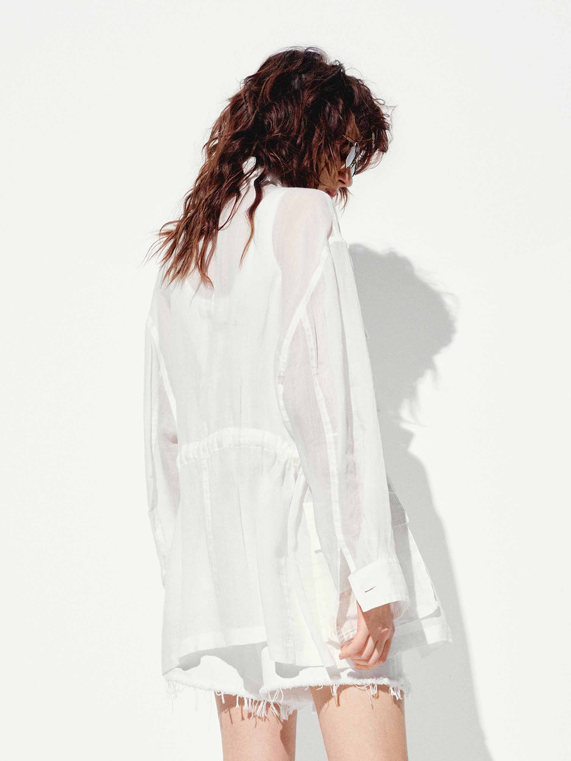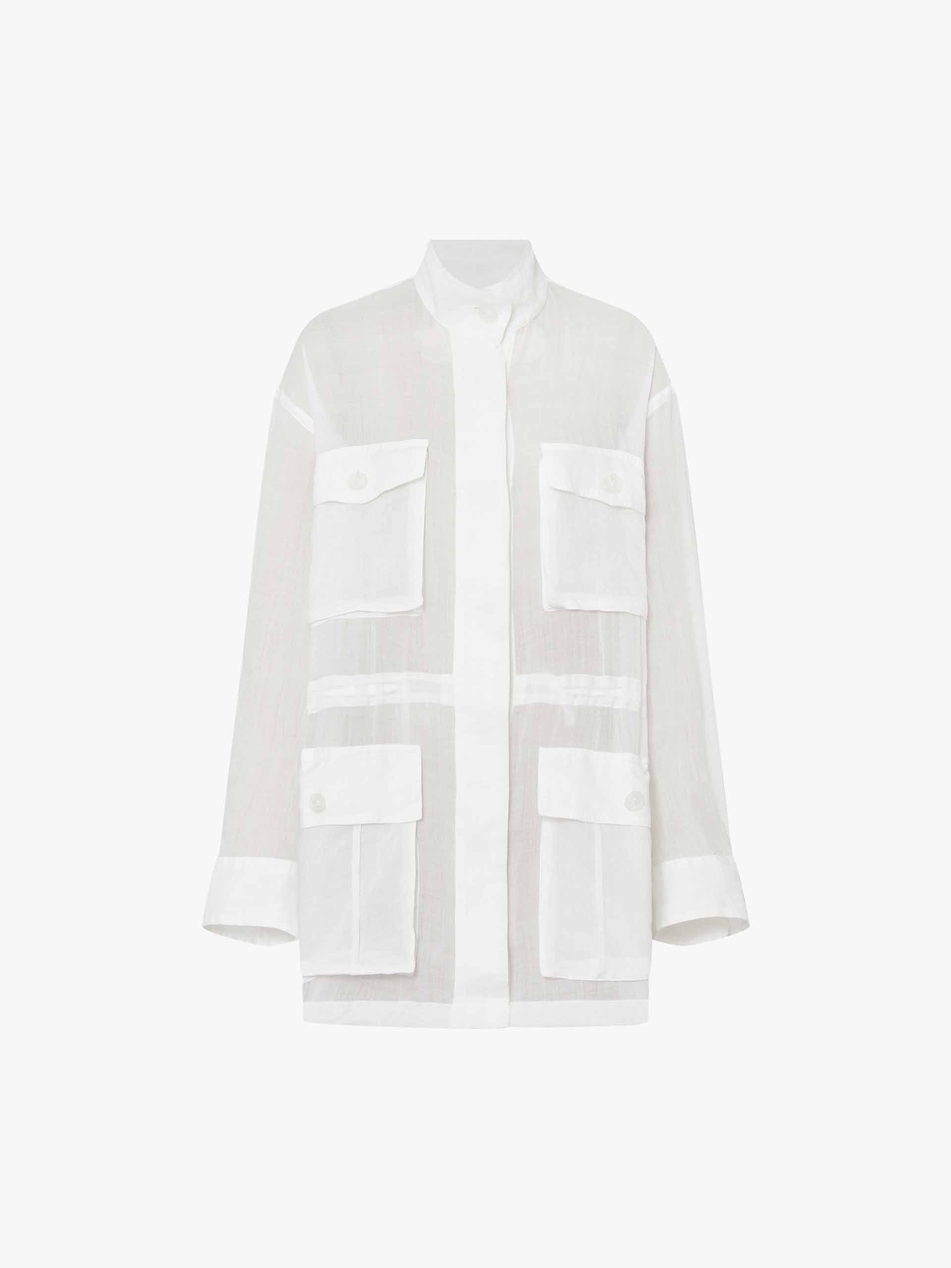 Featuring a structured stand-up collar and full button closure, this coat exudes timeless charm. Multiple pockets add practical appeal, perfect for keeping essentials close without compromising on style. The slightly sheer fabric introduces a delicate, modern edge—ideal for layering over dresses or pairing with tailored separates.