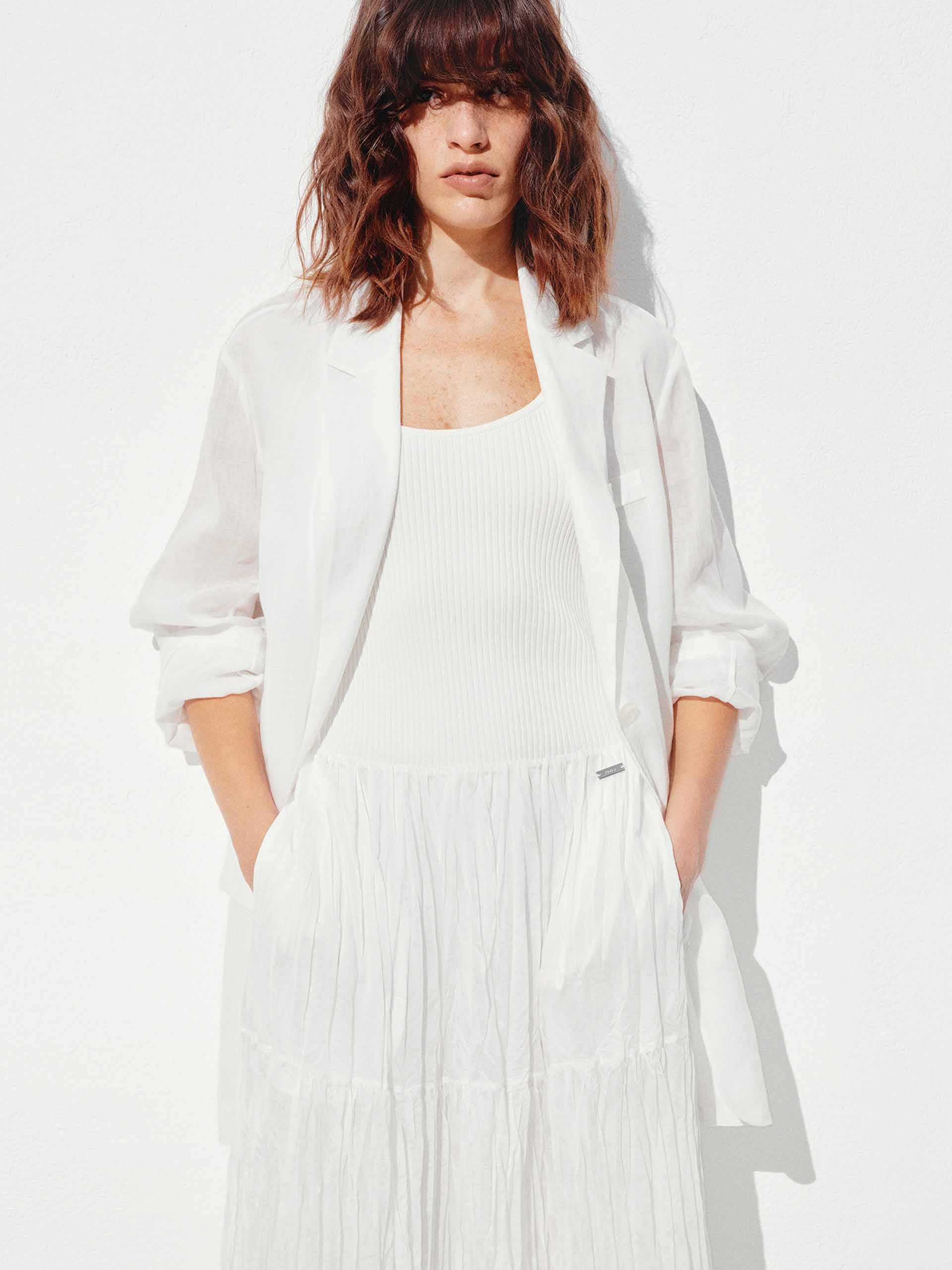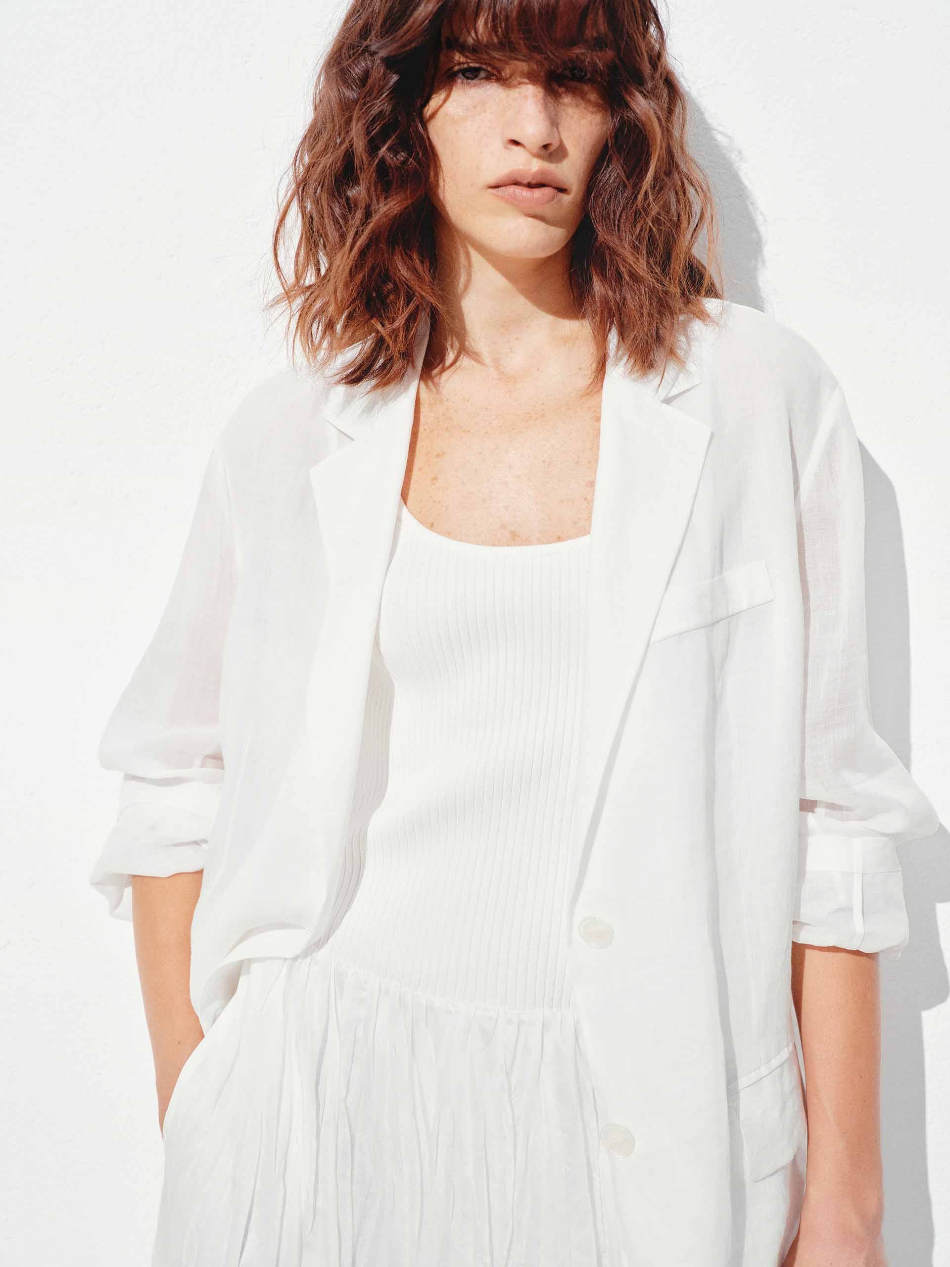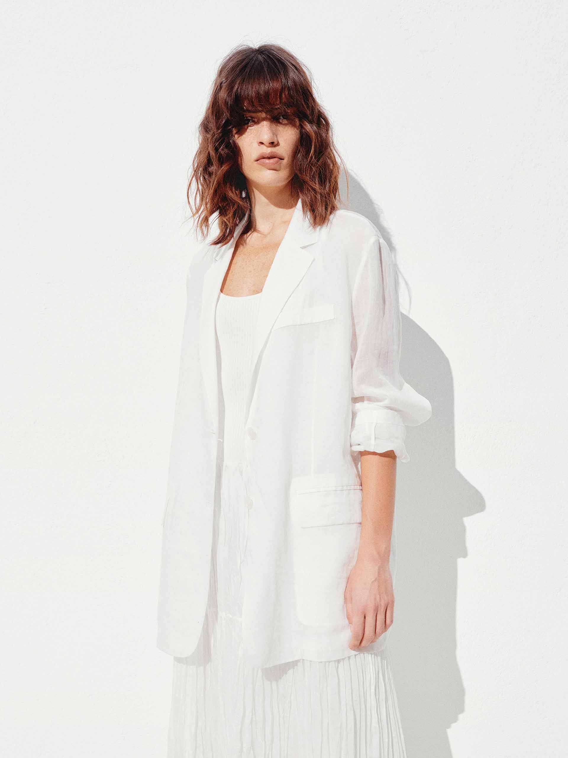Featuring a peak lapel and button closure, this blazer exudes timeless charm. The practical patch pockets enhance both style and functionality. The single-breasted design with a sleek back slit adds a touch of modern refinement. Lightweight and naturally moisture-wicking, ramie fabric keeps you cool and comfortable throughout the day.