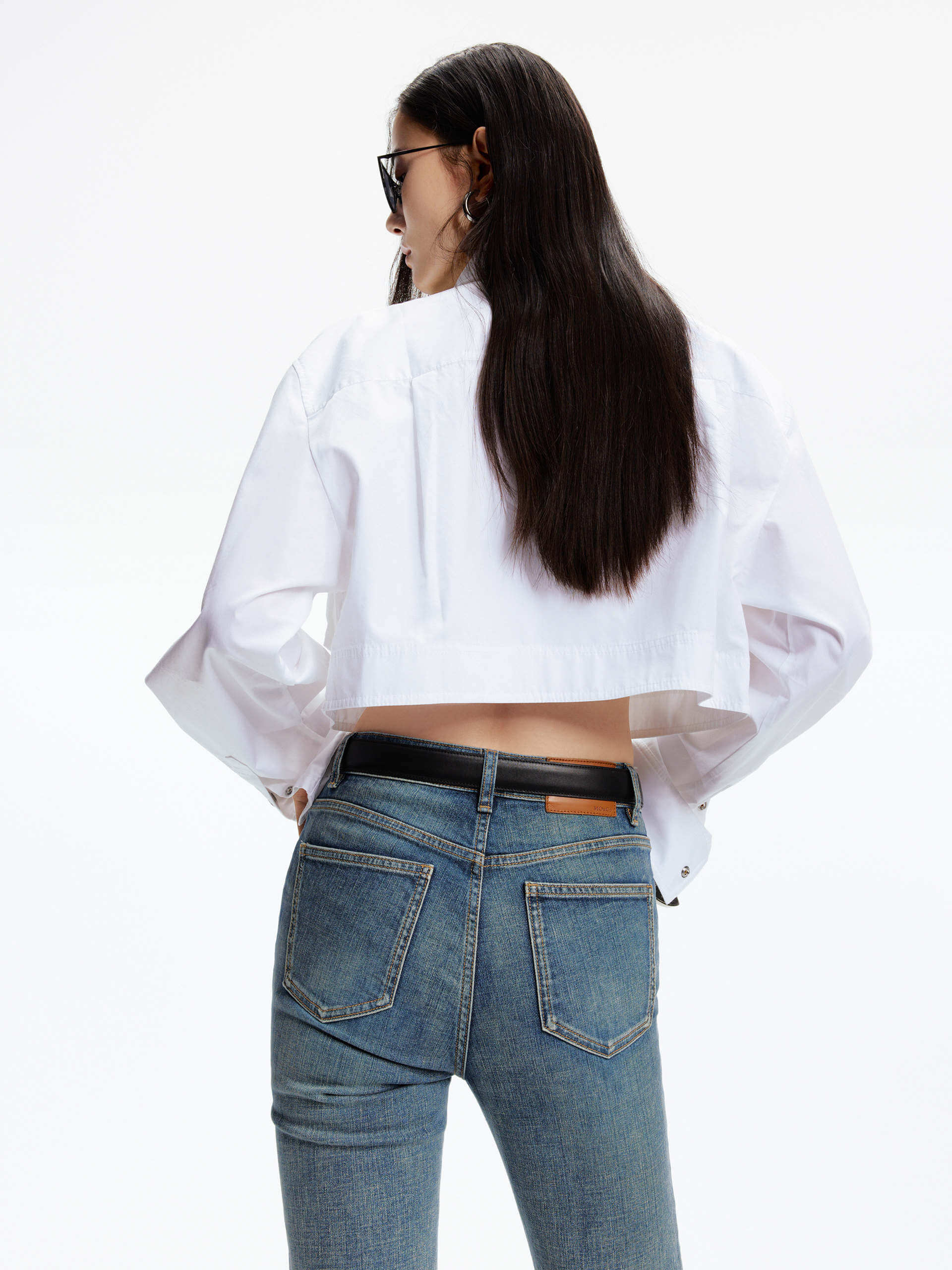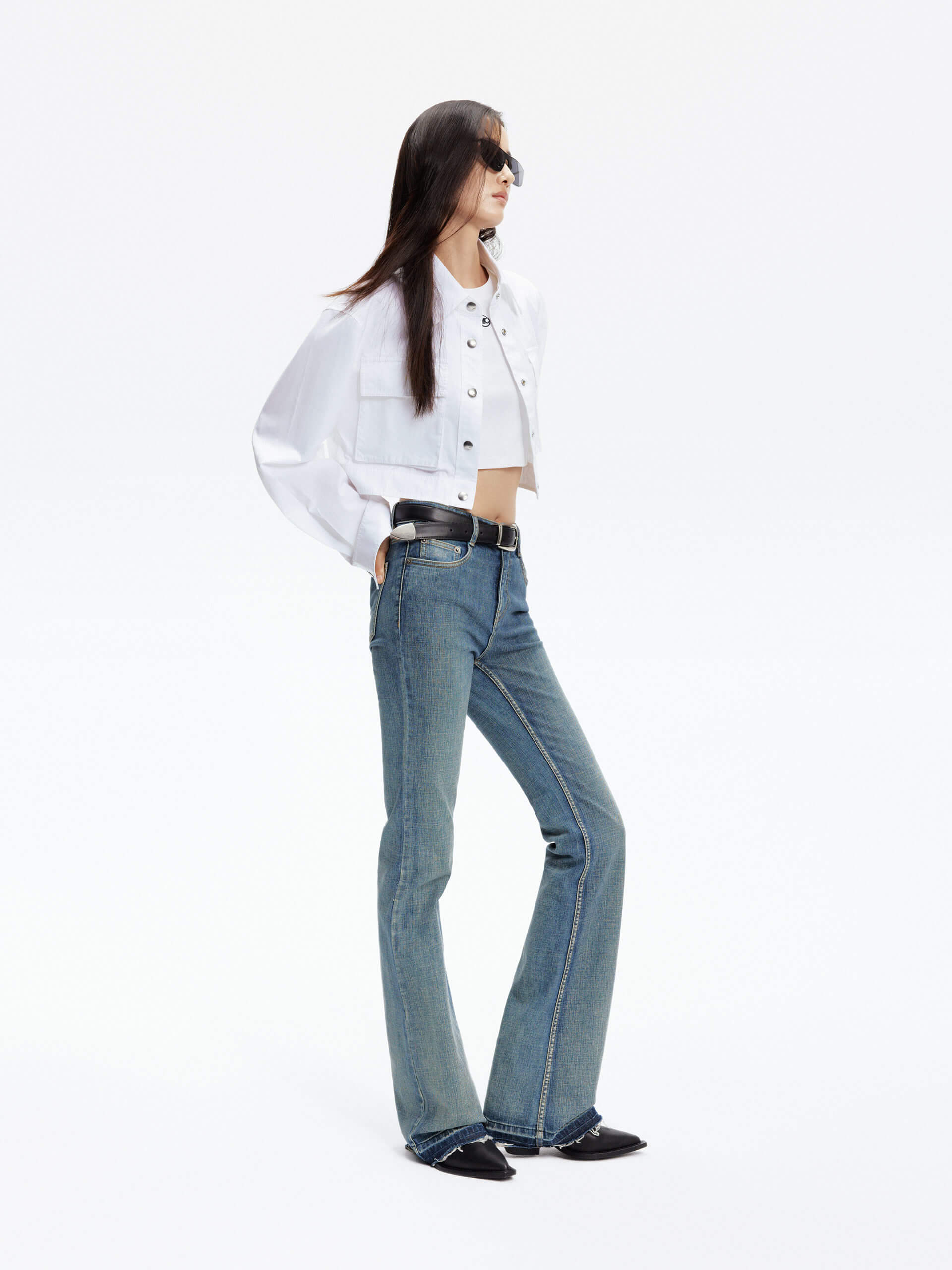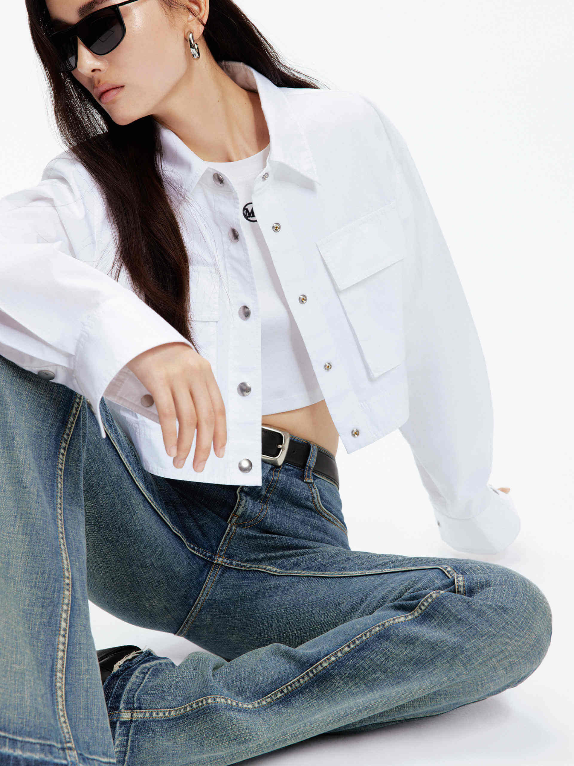 Made with pure white wash cotton, this short and loose-fitting jacket features metallic buttons for a touch of edginess. Pair it with our matching blue denim jeans for a complete, effortlessly cool look!