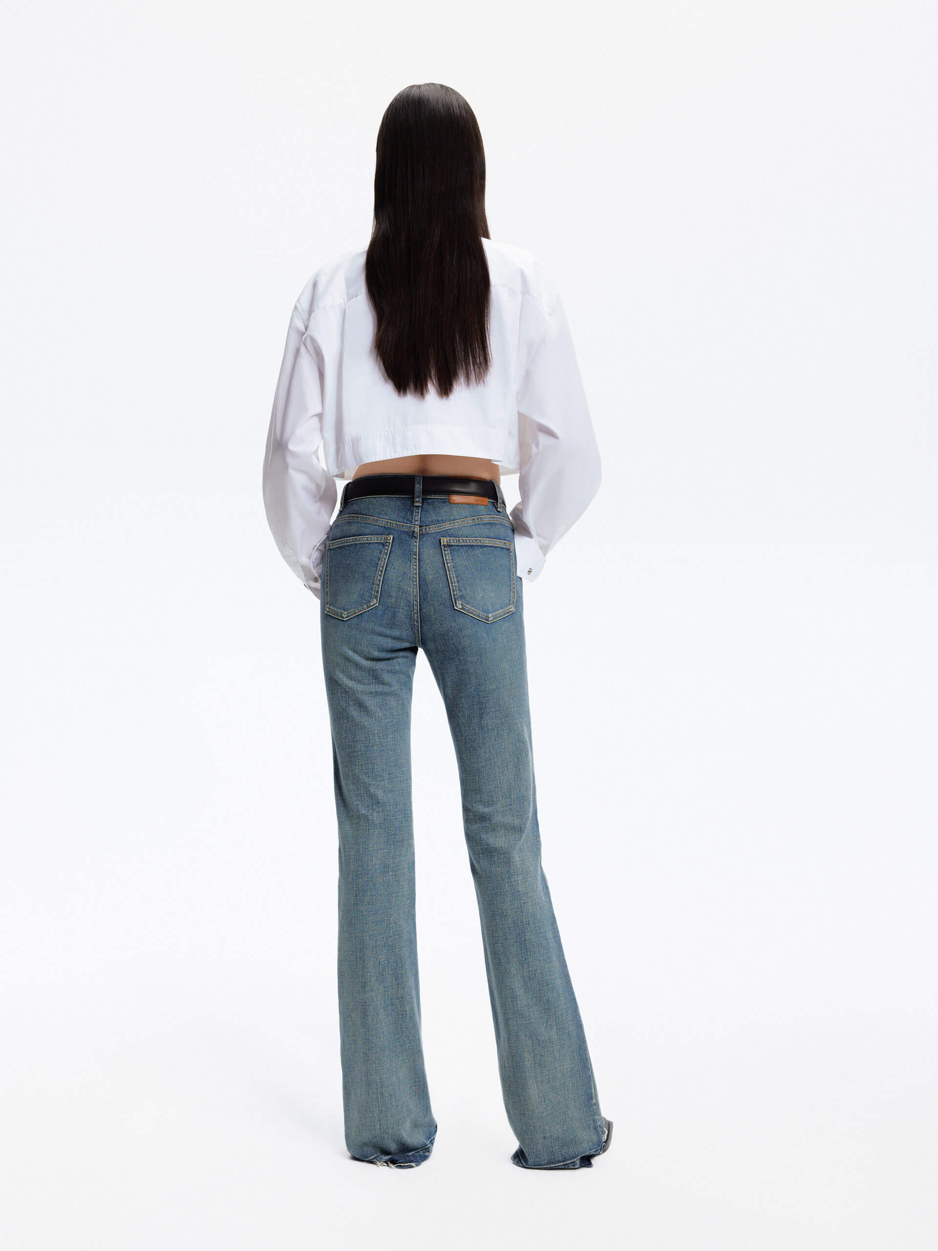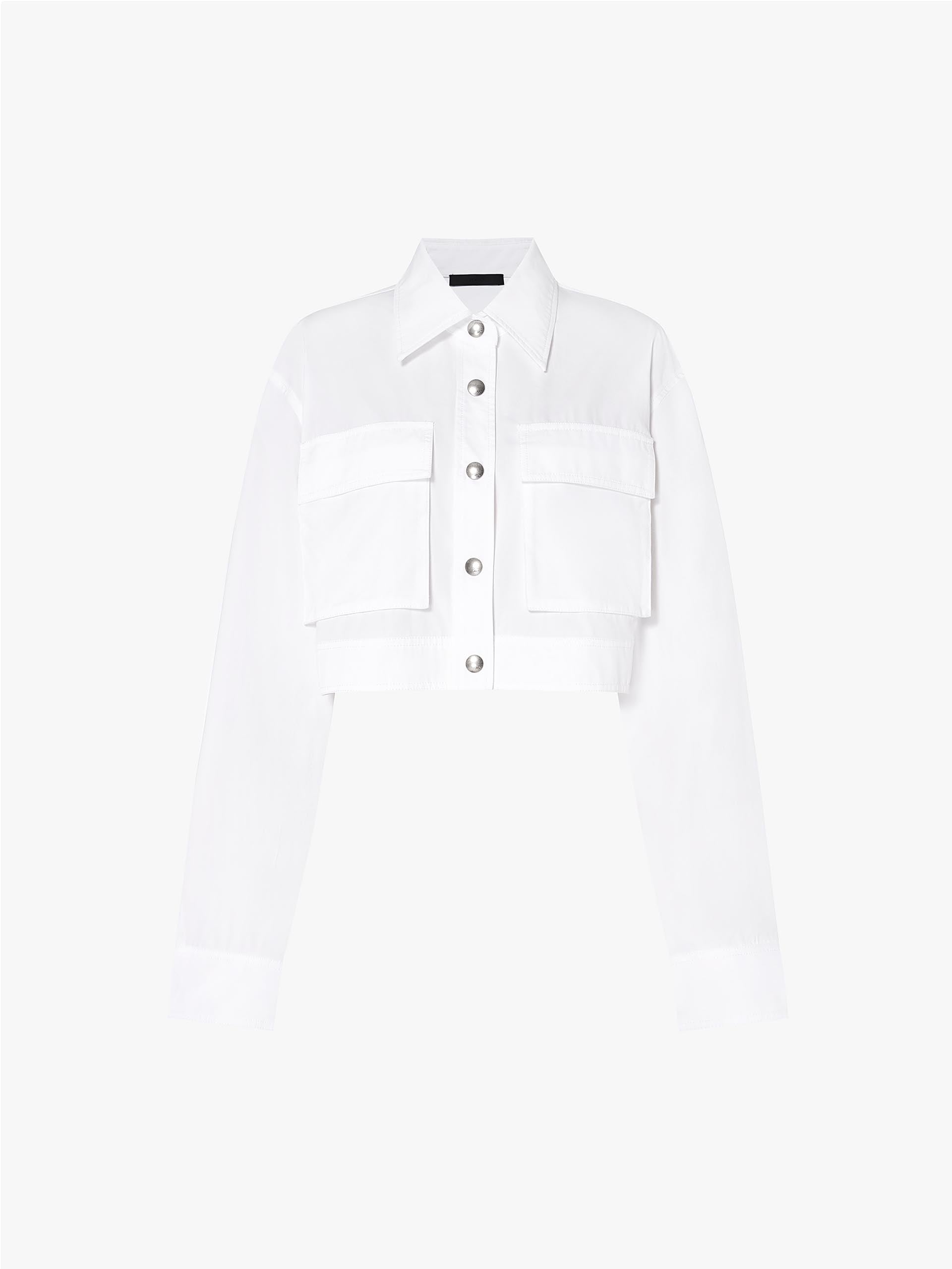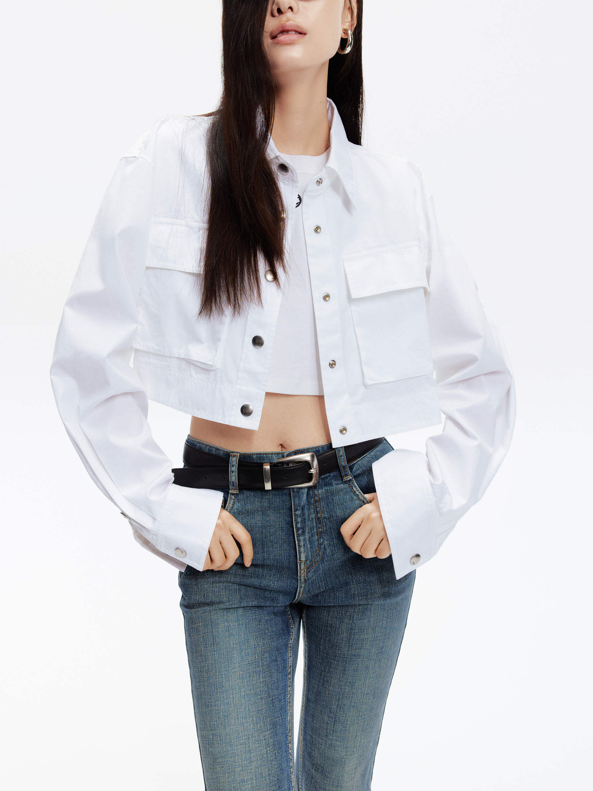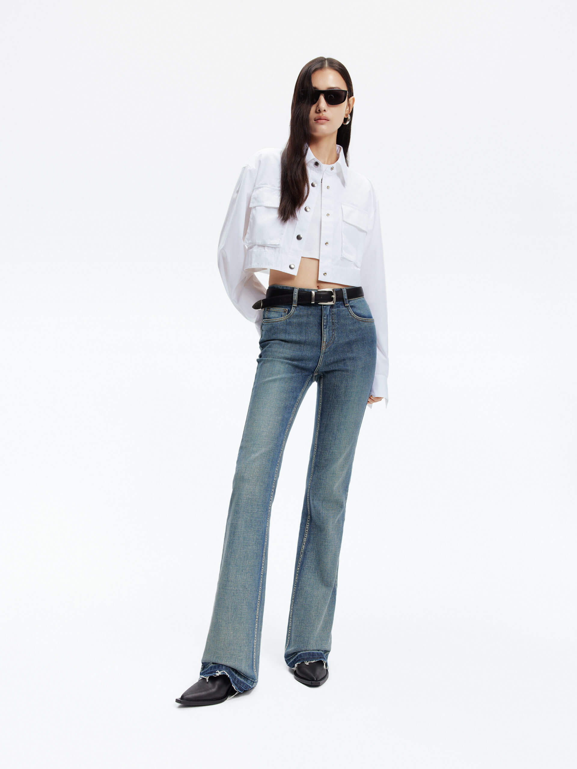 Made with pure white wash cotton, this short and loose-fitting jacket features metallic buttons for a touch of edginess. Pair it with our matching blue denim jeans for a complete, effortlessly cool look!