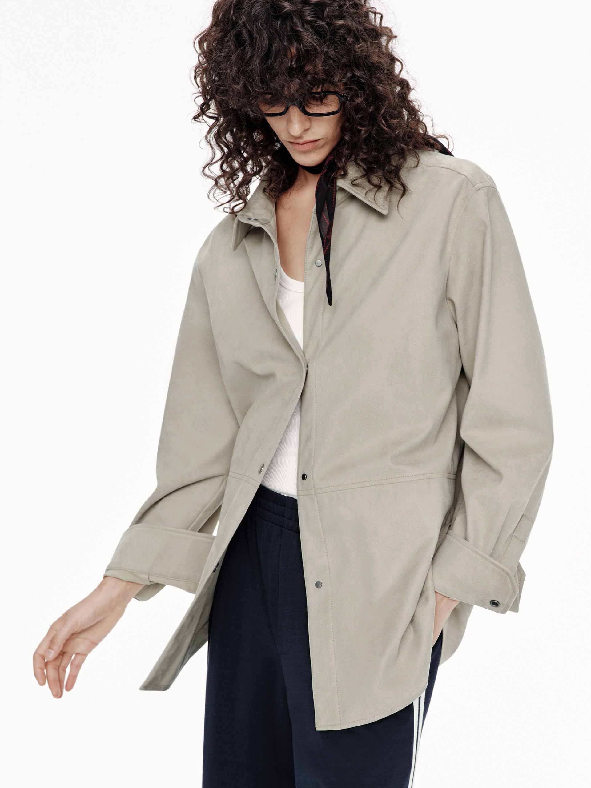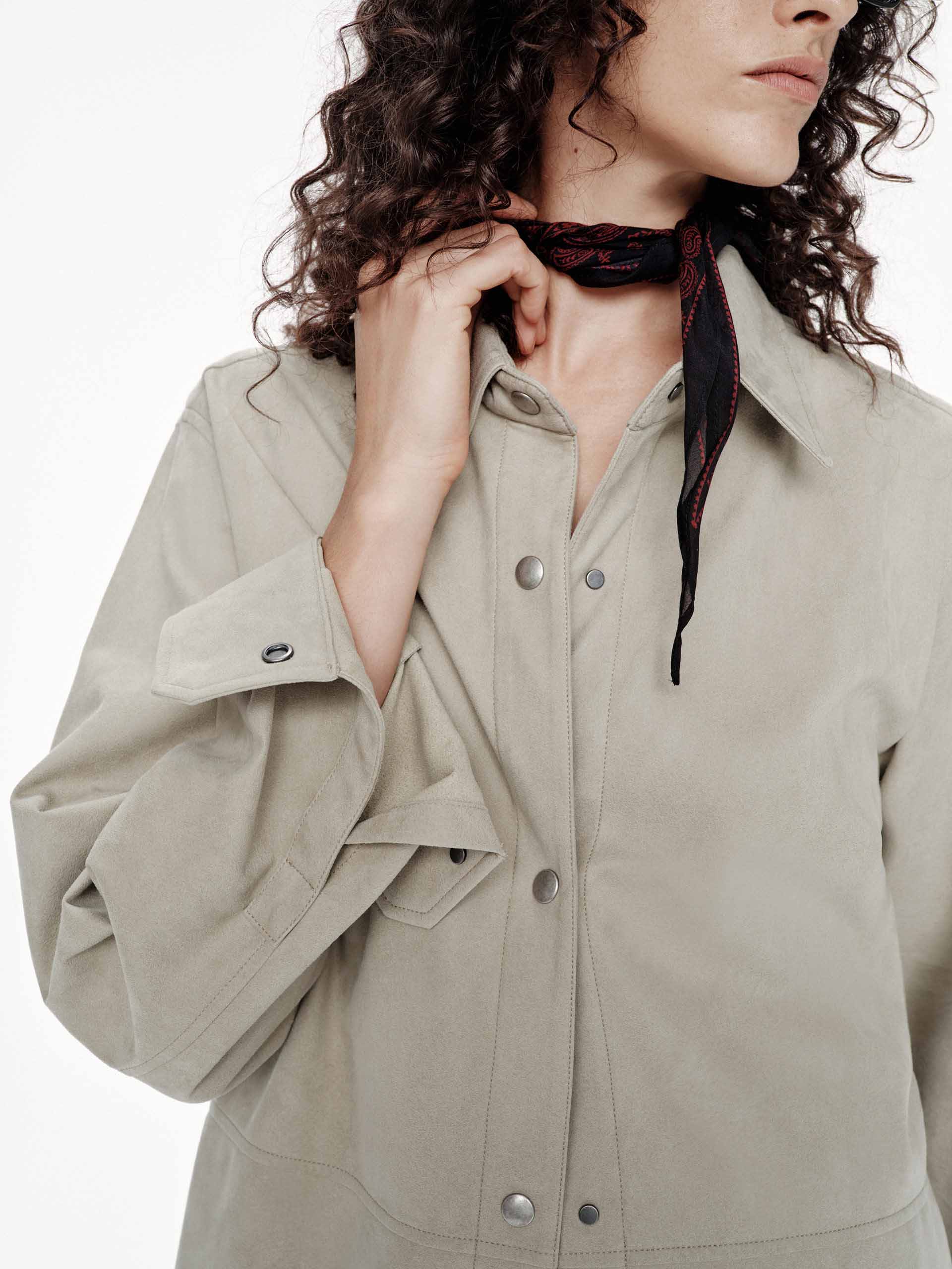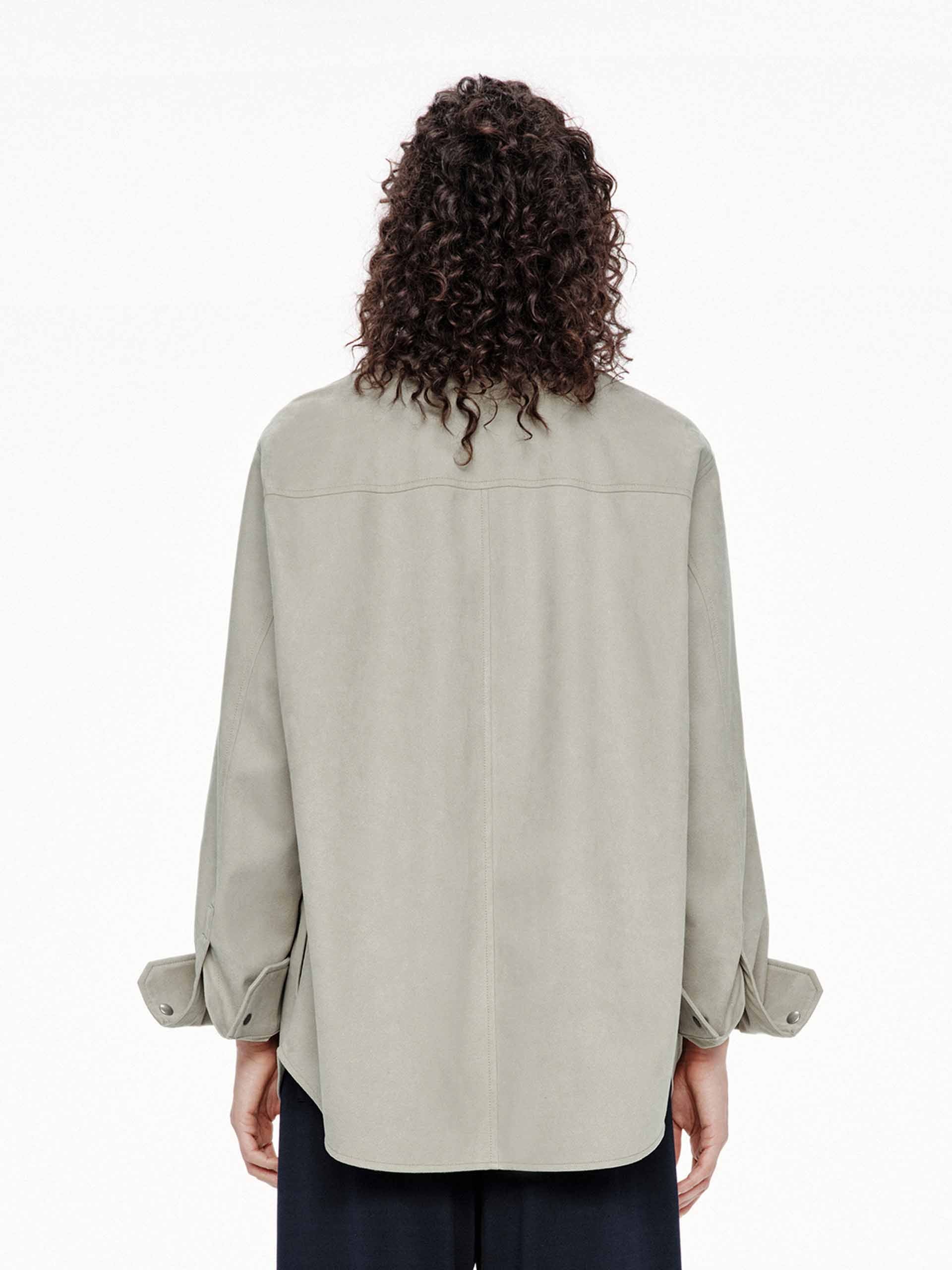 Expertly crafted from premium Faux Leather, this jacket is made from a supple faux suede fabric that offers a luxurious look. Functional side pockets offer a utilitarian touch, while the snap cuff design on the long sleeves allows for adjustable styling. The front features a sleek snap button closure detail, ensuring a secure and streamlined look.