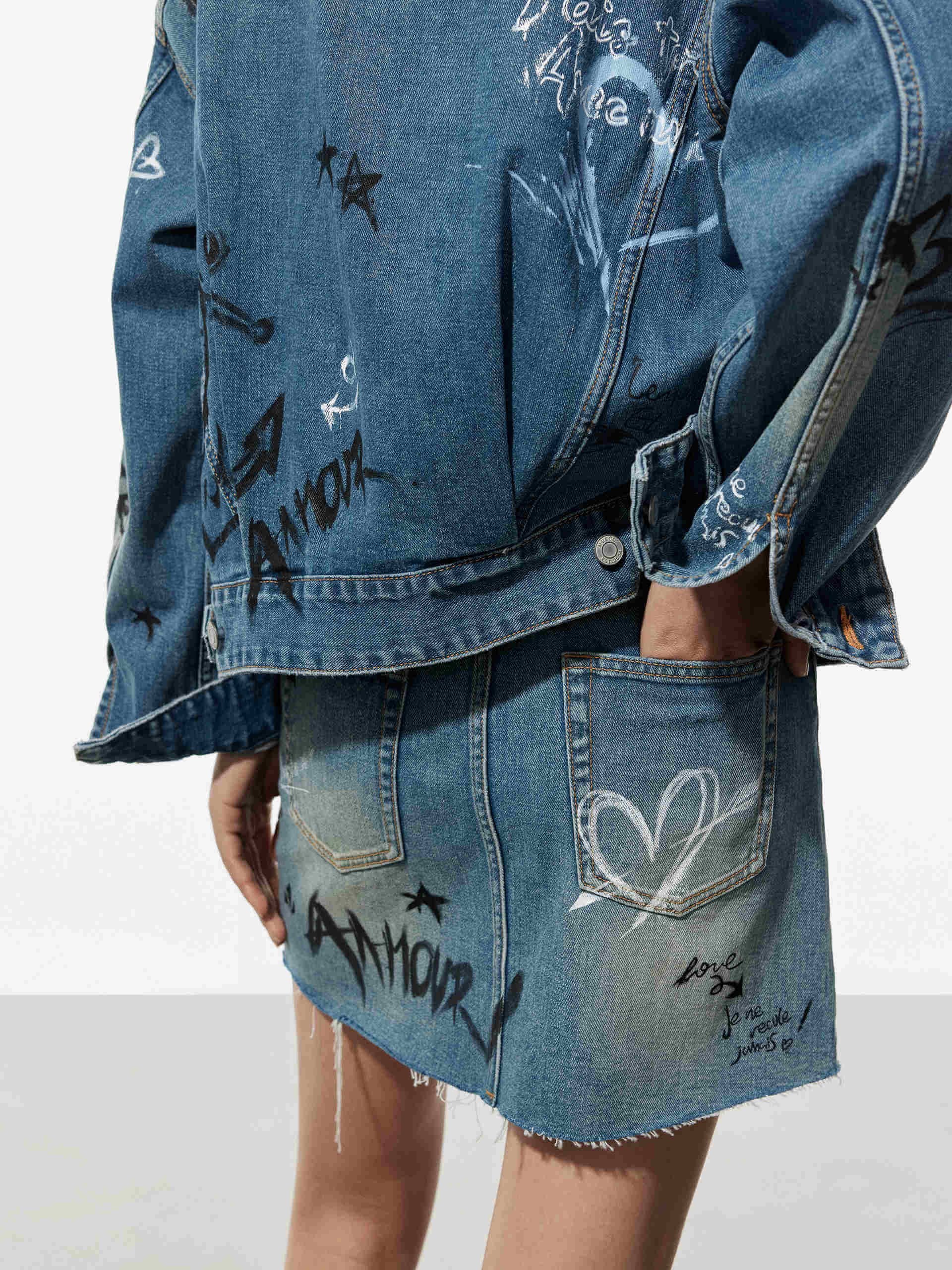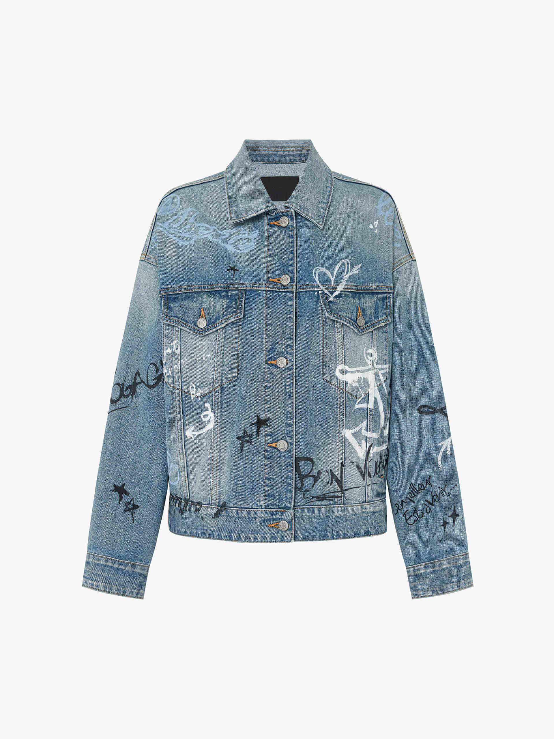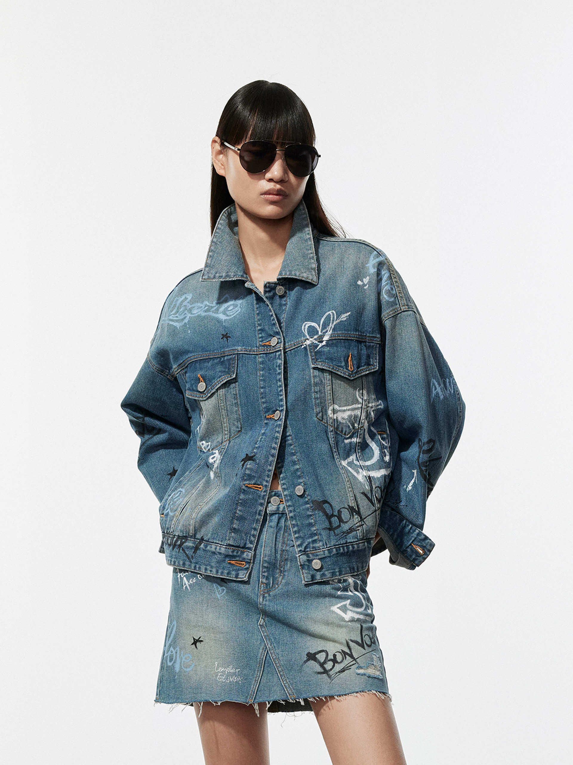 Made from high-quality denim material, this jacket is both comfortable and durable, allowing you to wear it season after season. Featuring a unique graffiti pattern design and button closure provides an edgy and classic touch, while the oversized silhouette offers a modern twist on a timeless wardrobe staple. Pair it with our coordinating jeans or skirt for a versatile and chic look.