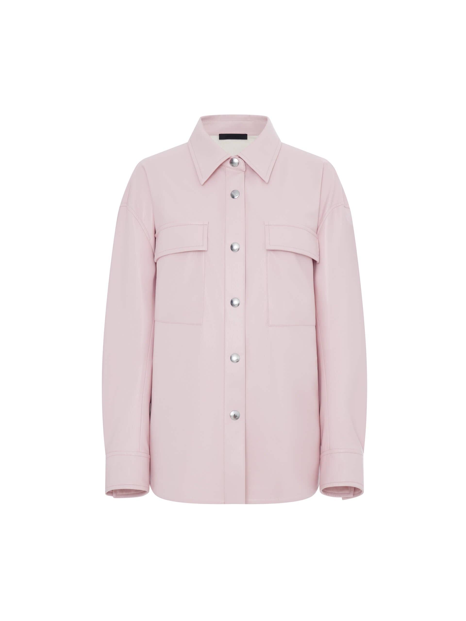 Indulge in shirt style with our jacket. The ultra-soft PU leather material, loose-fit, and elegant silver snap closures on the front and chest pocket exude sophistication. The romantic and delicate pink color adds a touch of femininity to this exclusive piece.