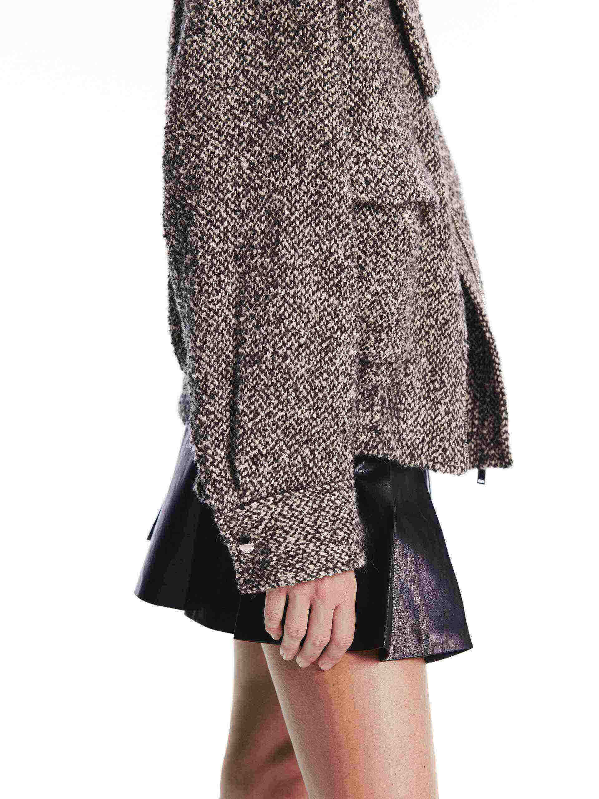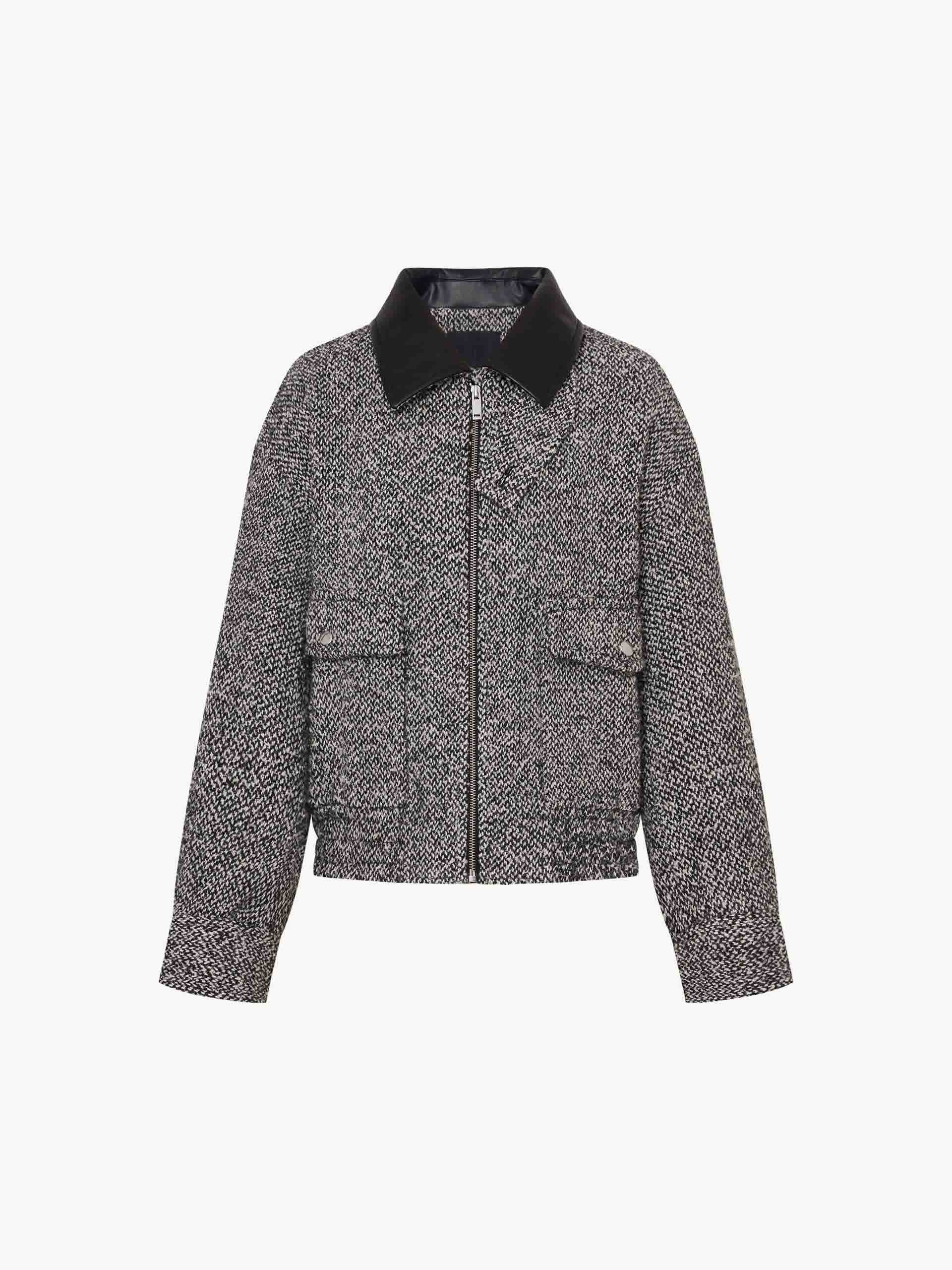 Crafted from a luxurious blend of wool, Alpaca, and other fibers, this jacket is the perfect addition to your wardrobe. Featuring a paneled faux leather collar, front flap pocket, and zip closure, this jacket combines style and functionality for a polished look.