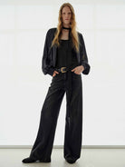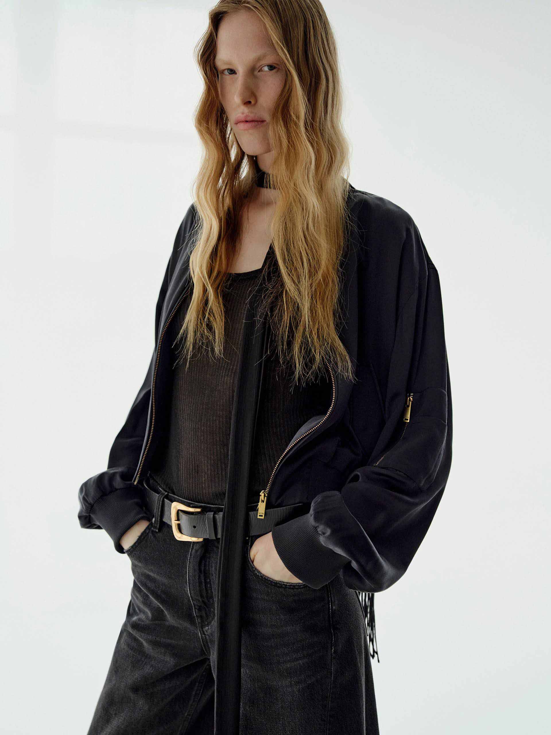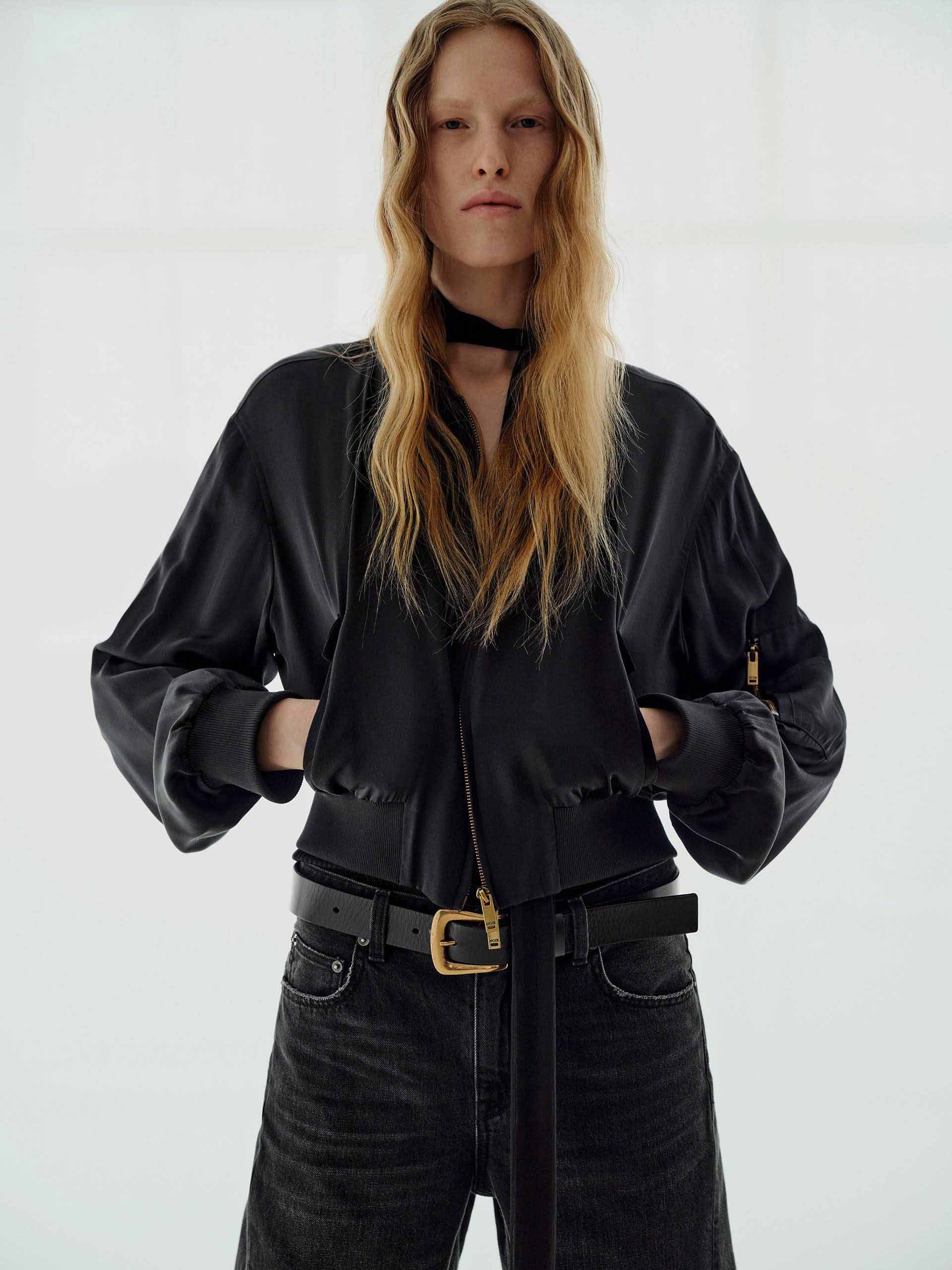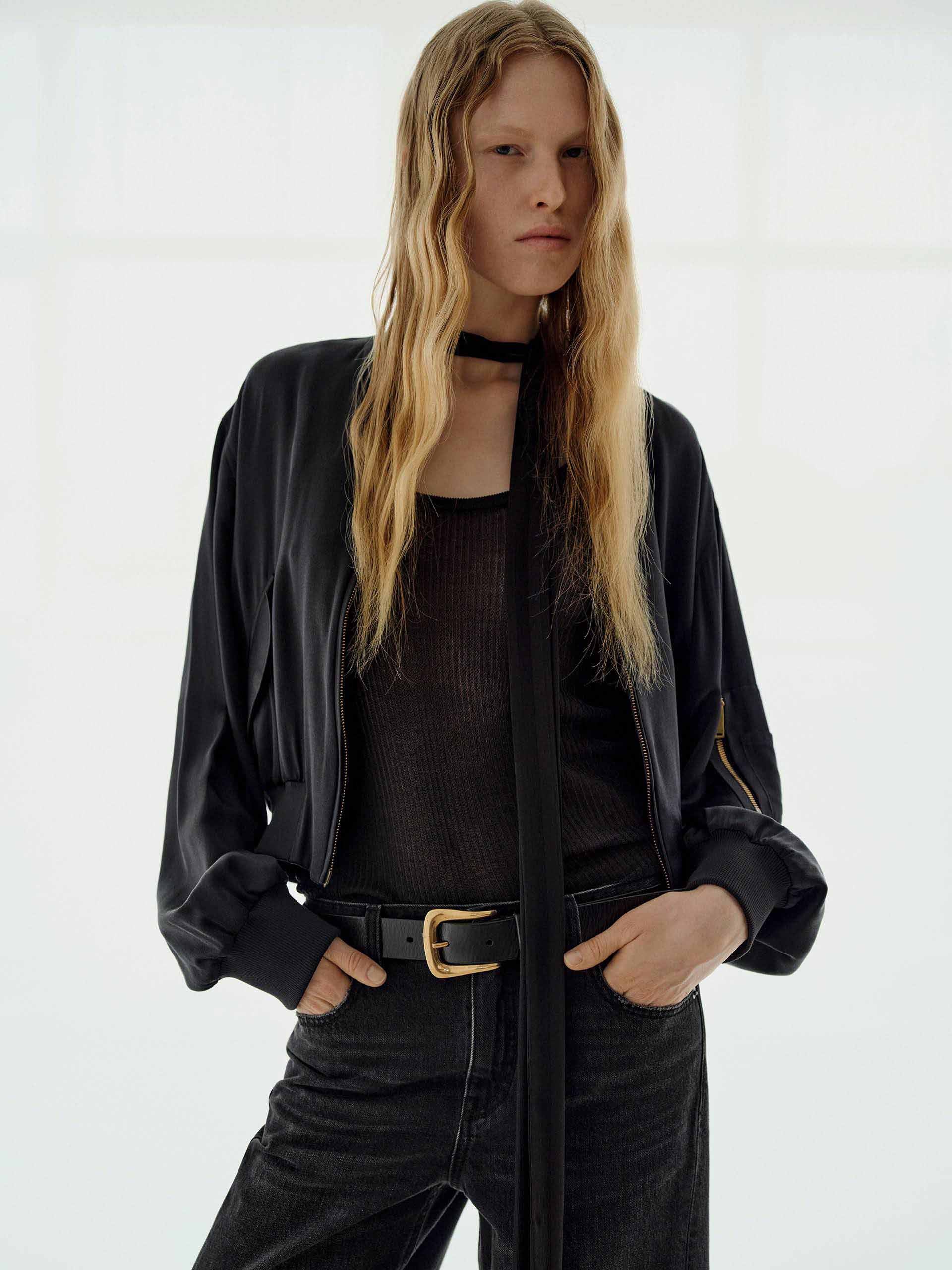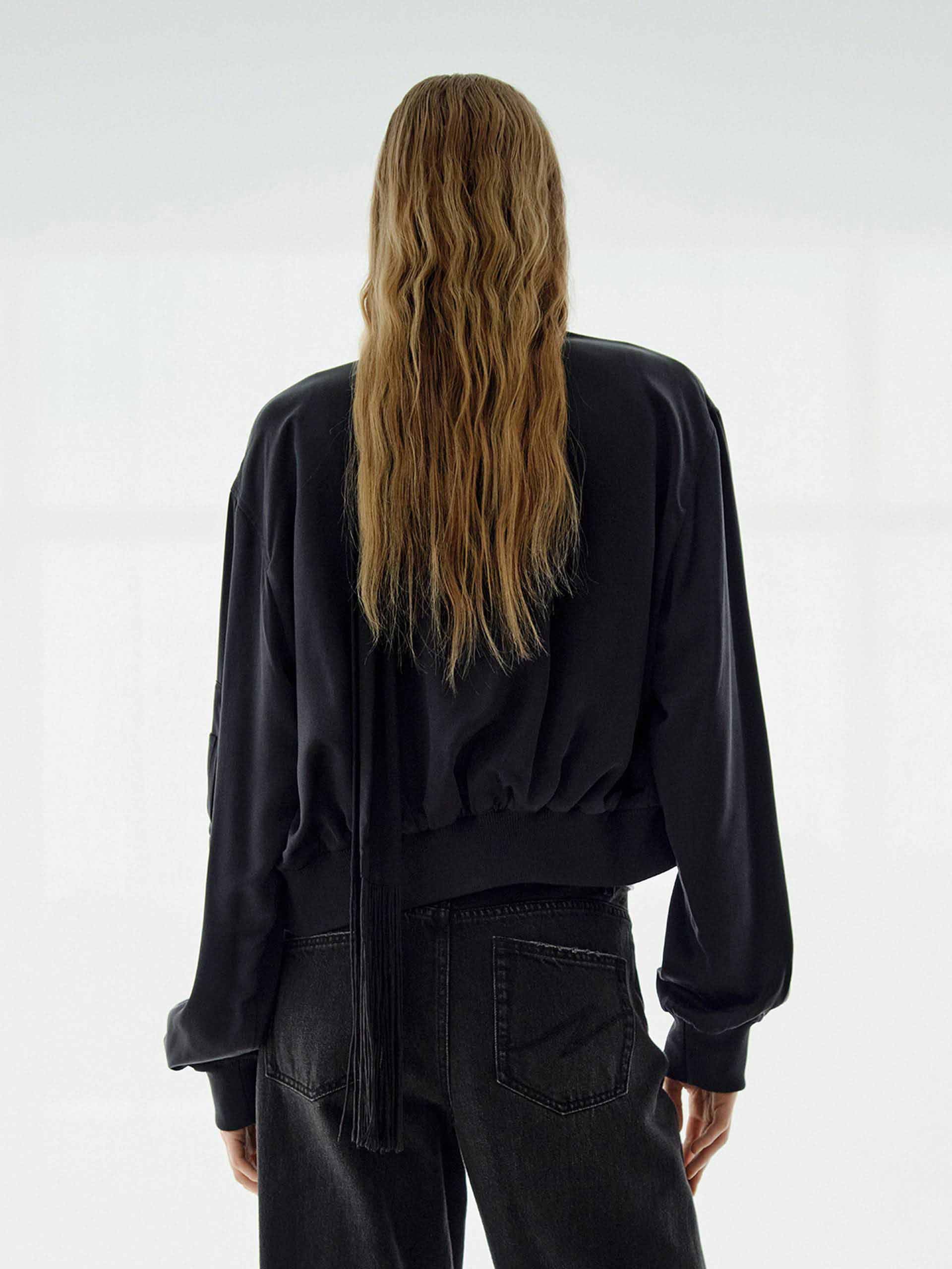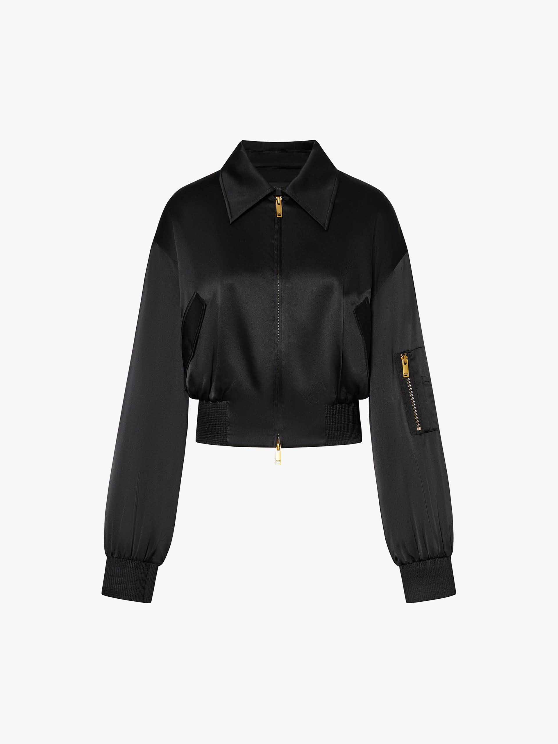 Crafted from a lightweight silk-blend fabric, this jacket offers a smooth drape with just the right amount of structure. It features a two-way zip closure for adjustable styling. The arm zip pocket introduces an unexpected utilitarian-chic detail. The cropped fit delivers a fashion-forward silhouette that pairs effortlessly with high-waisted pieces.