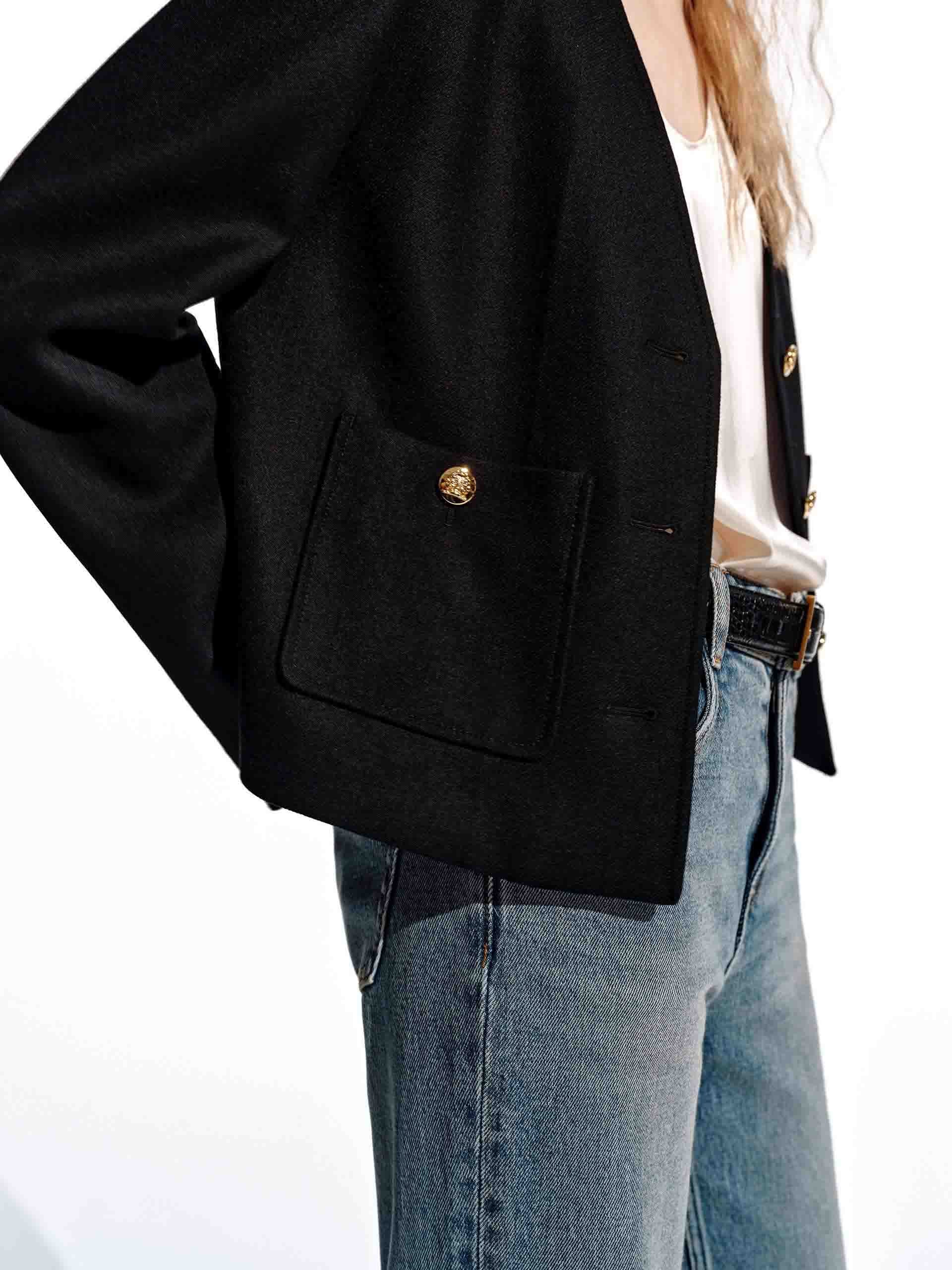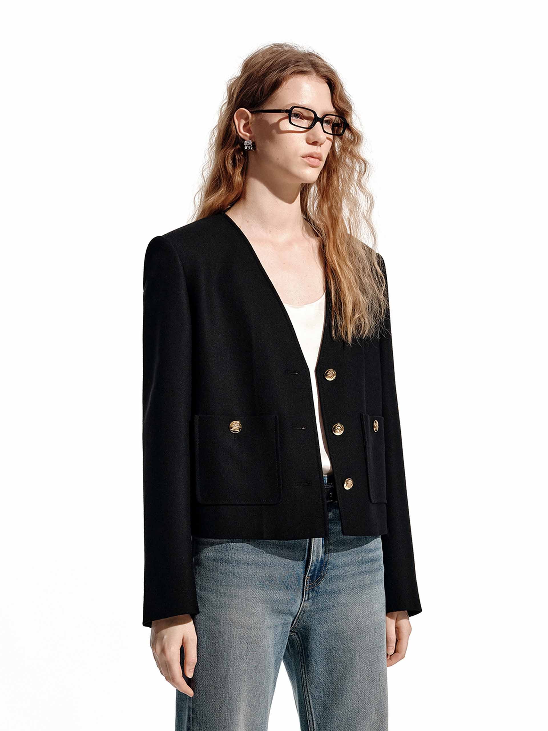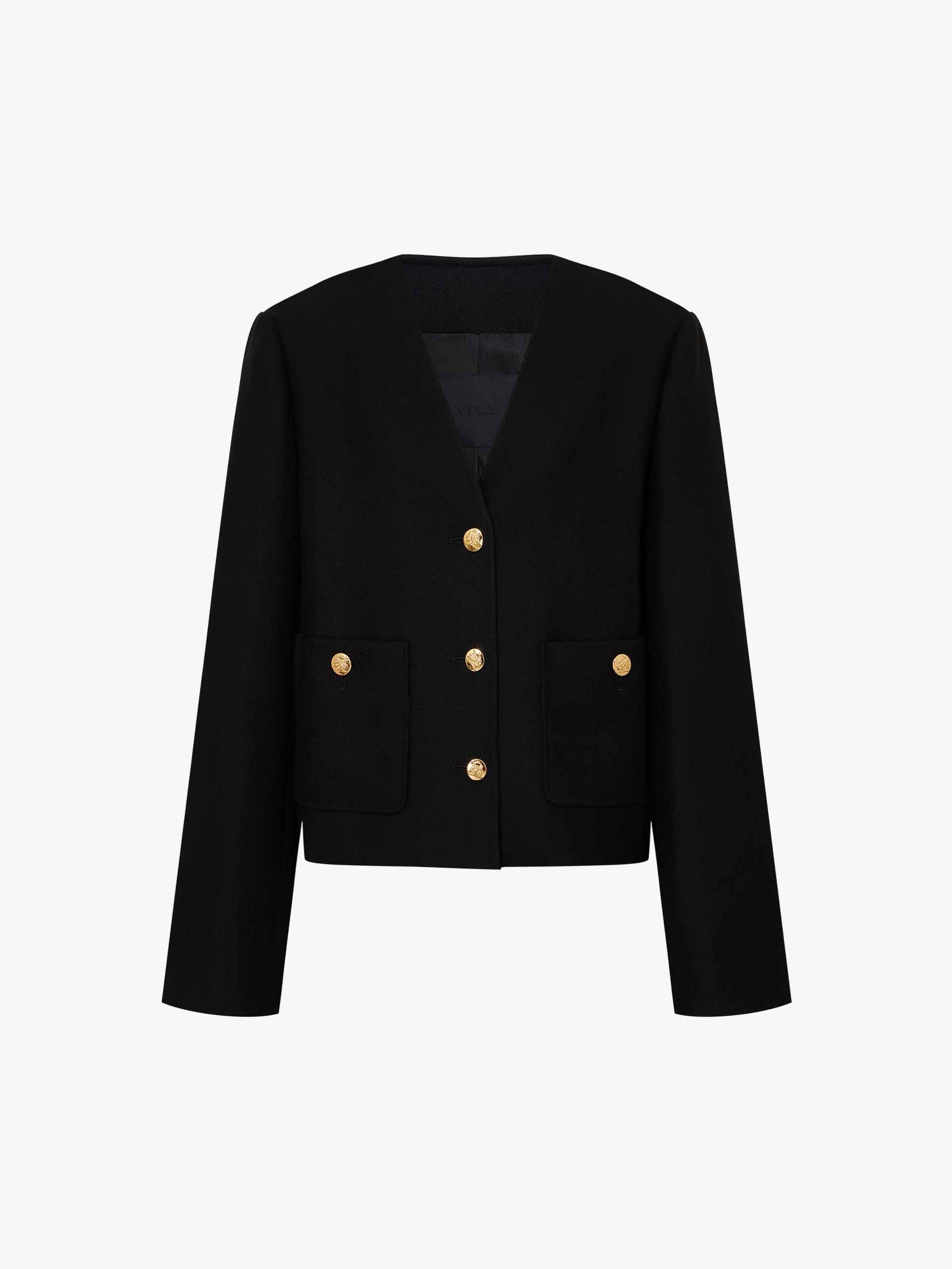 Constructed from premium Merino wool, this V-neck jacket features a padded shoulder for a structured, elegant look. Designed with a boxy fit, delicate metallic buttons, and a front pocket add a touch of sophistication. Complete with a full lining, this jacket effortlessly transitions through seasons and can be easily layered.