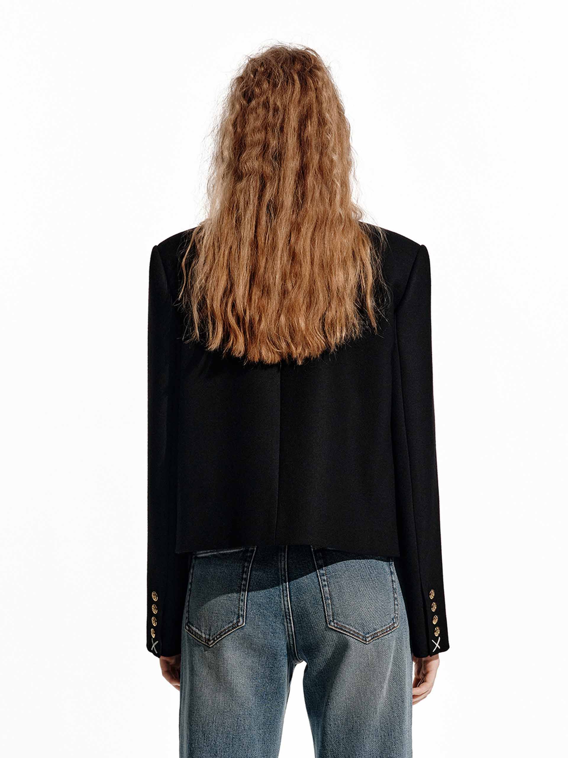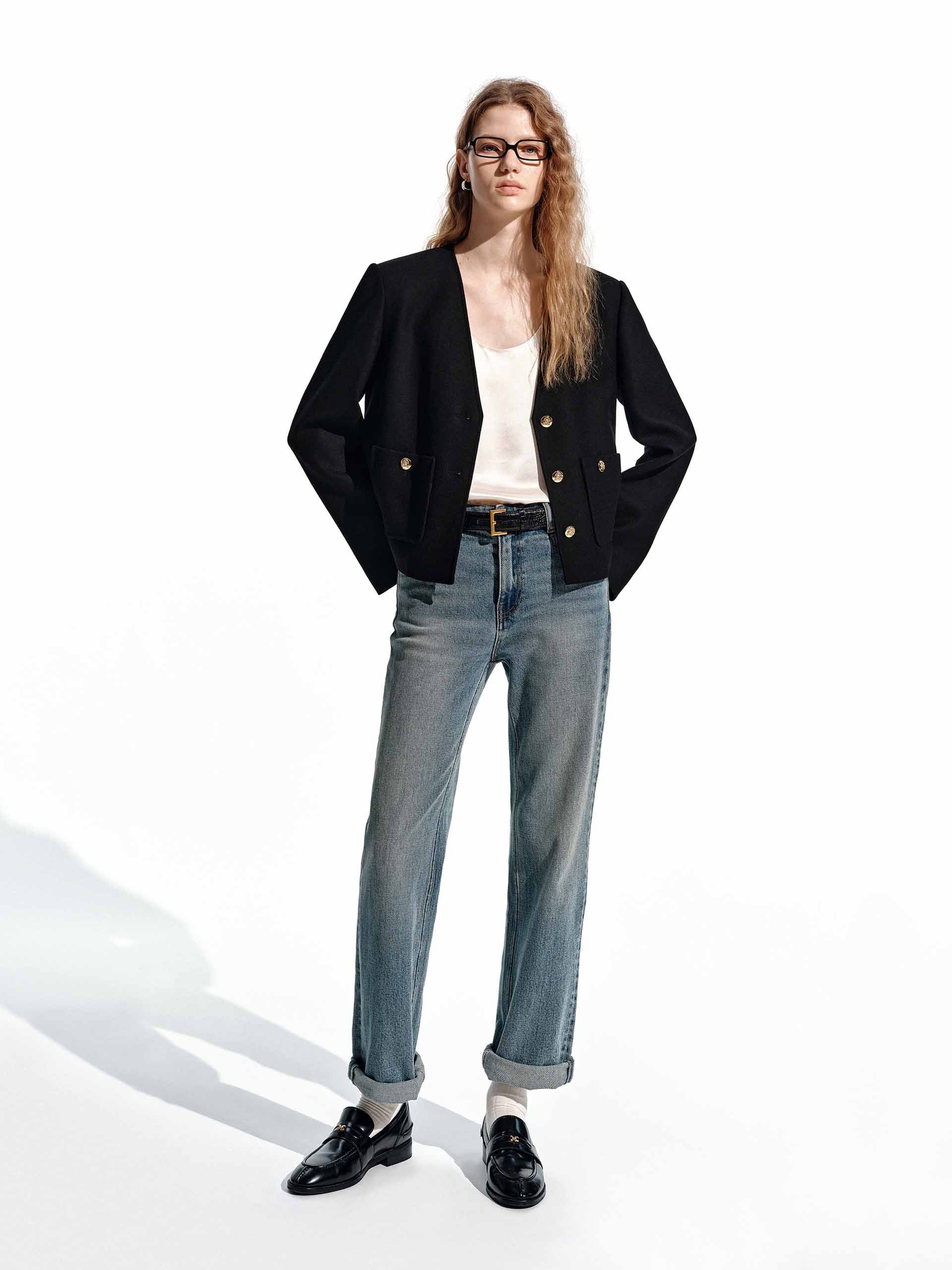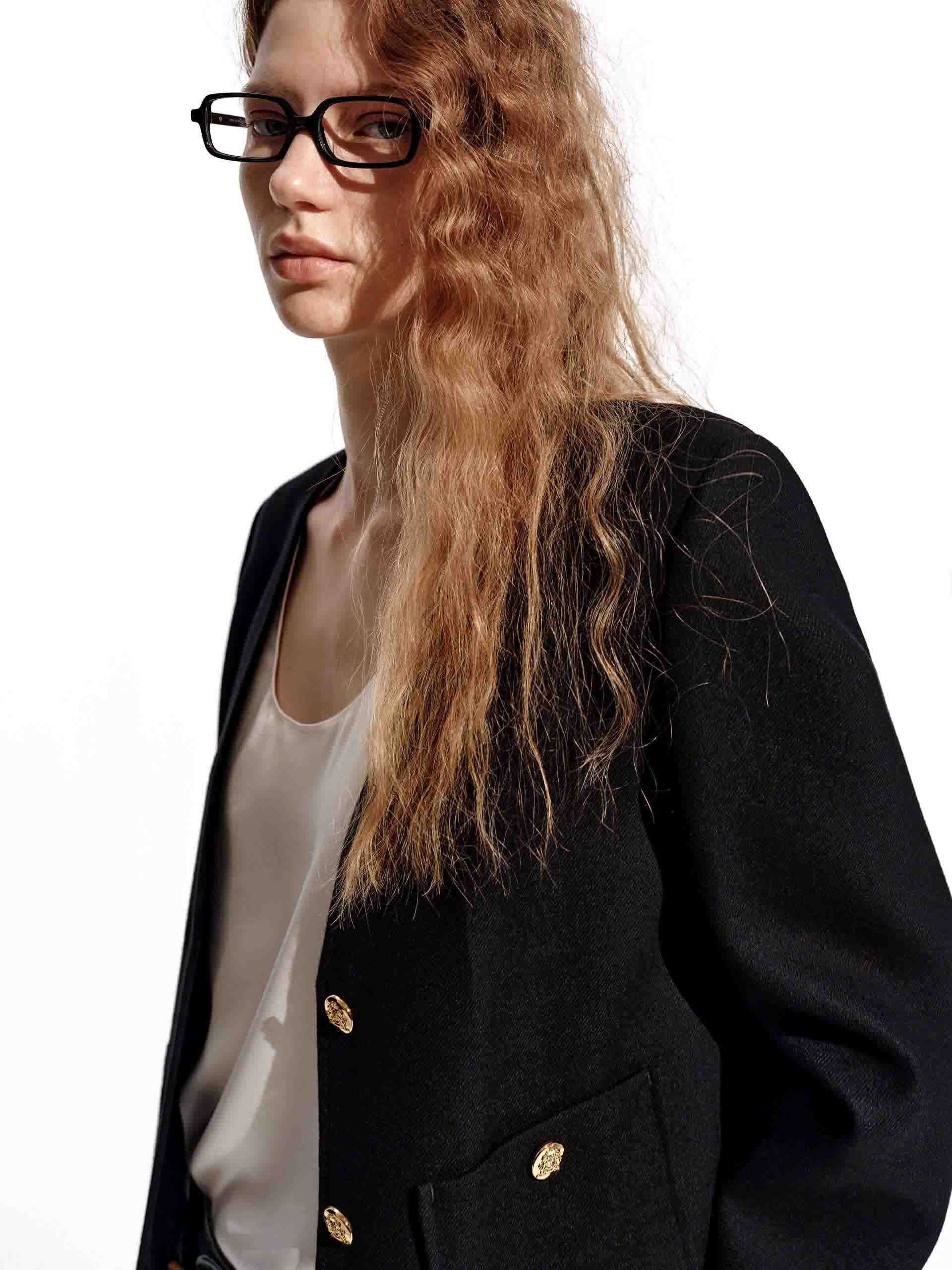 Constructed from premium Merino wool, this V-neck jacket features a padded shoulder for a structured, elegant look. Designed with a boxy fit, delicate metallic buttons, and a front pocket add a touch of sophistication. Complete with a full lining, this jacket effortlessly transitions through seasons and can be easily layered.