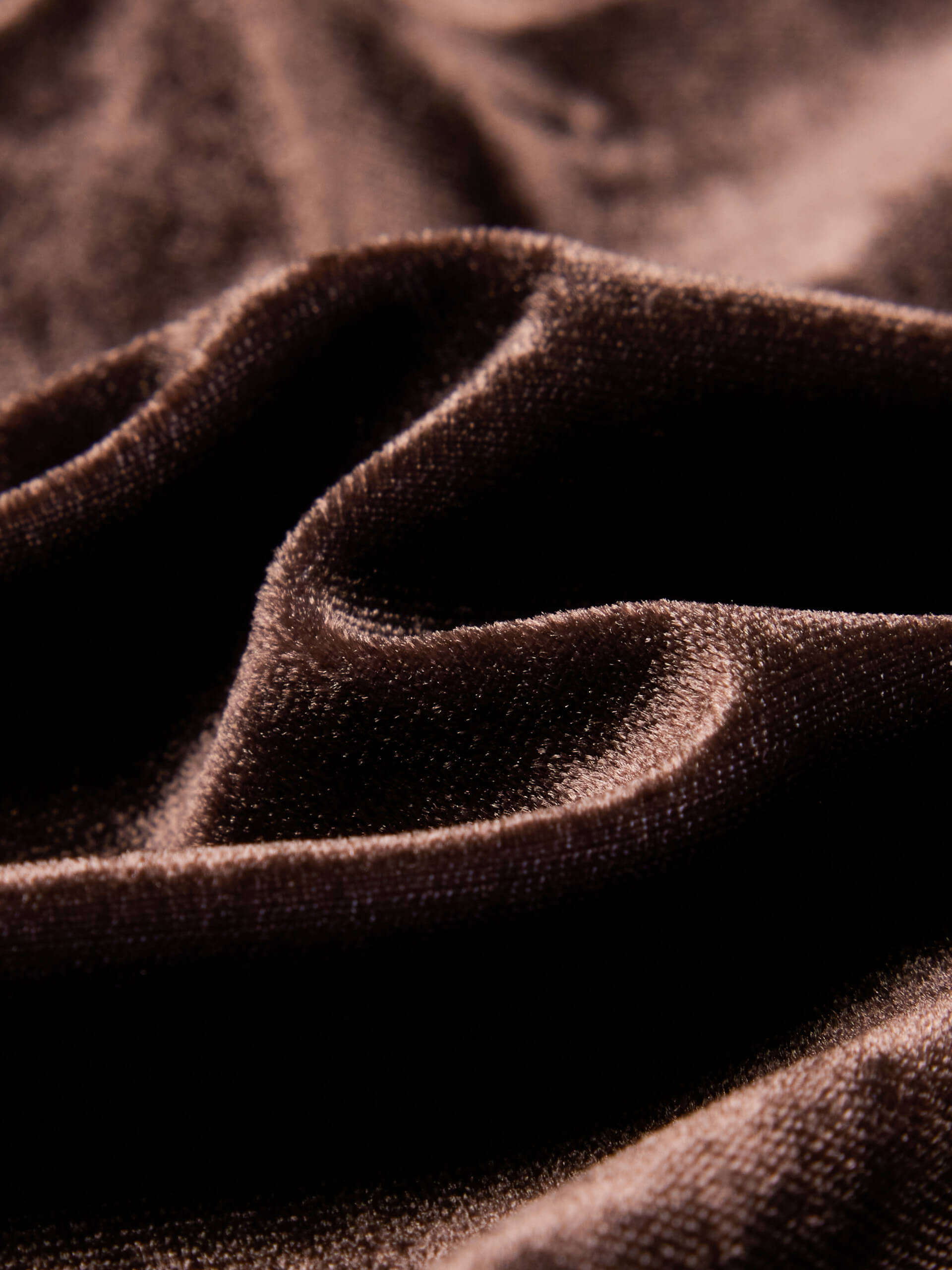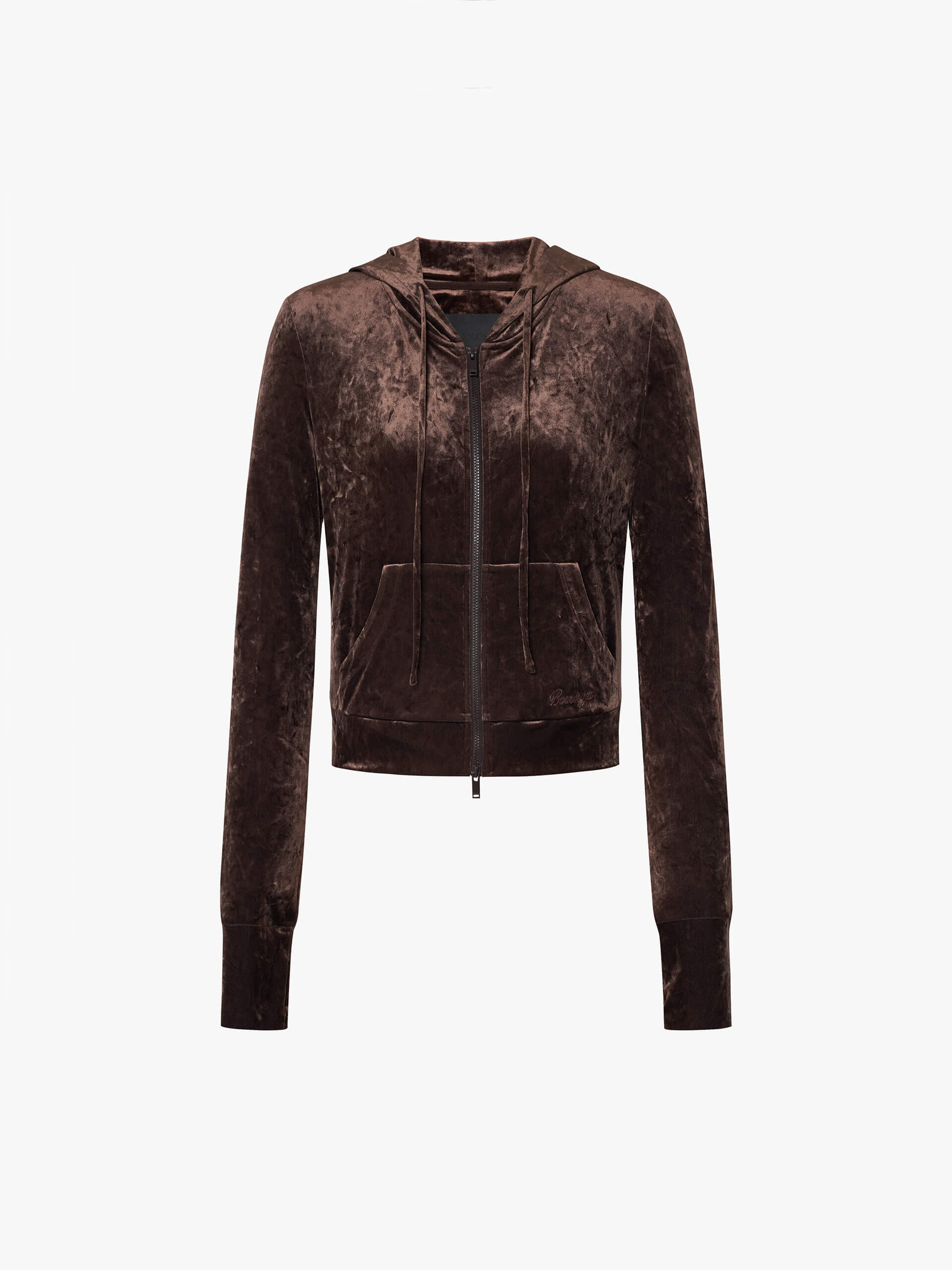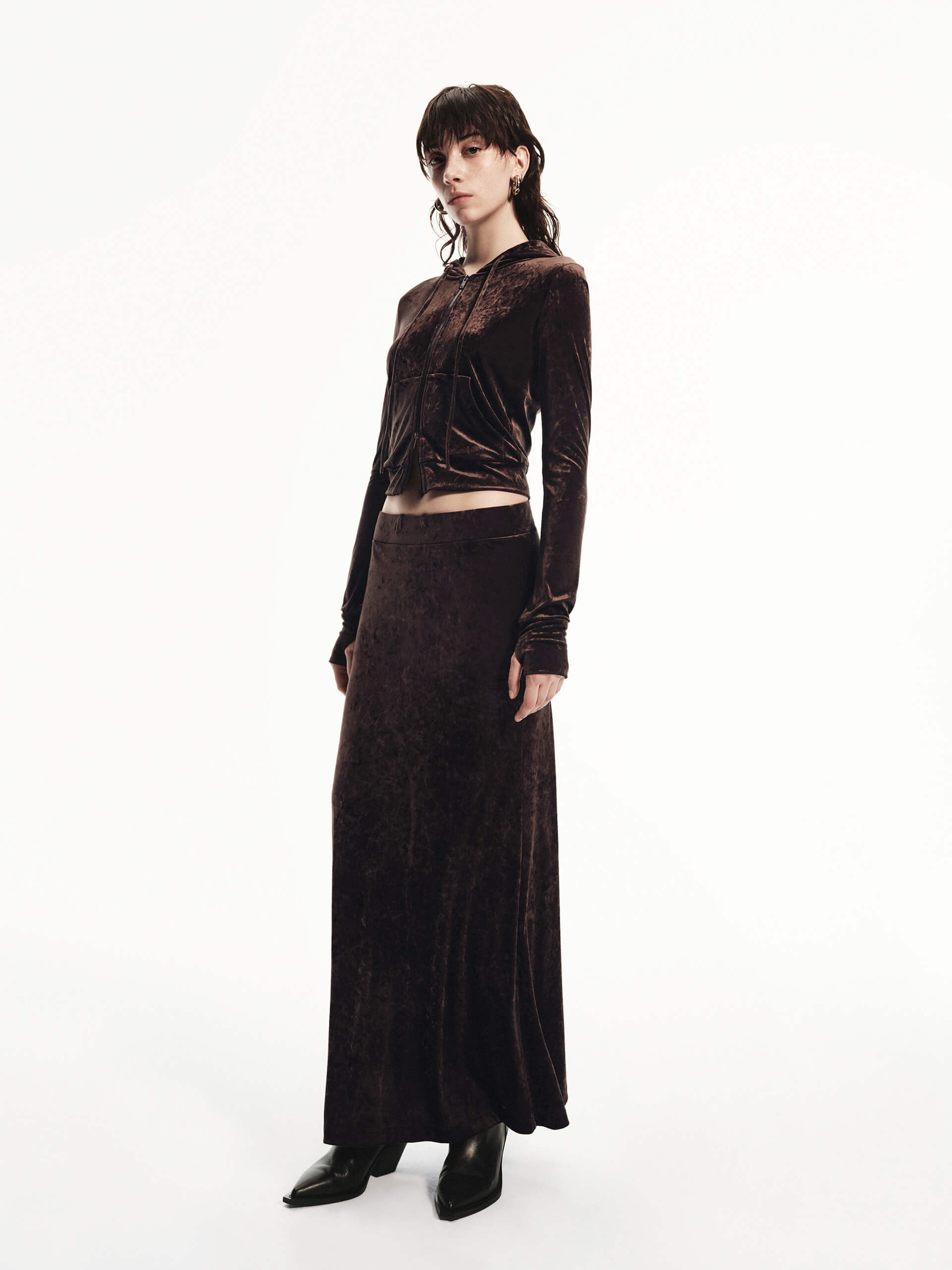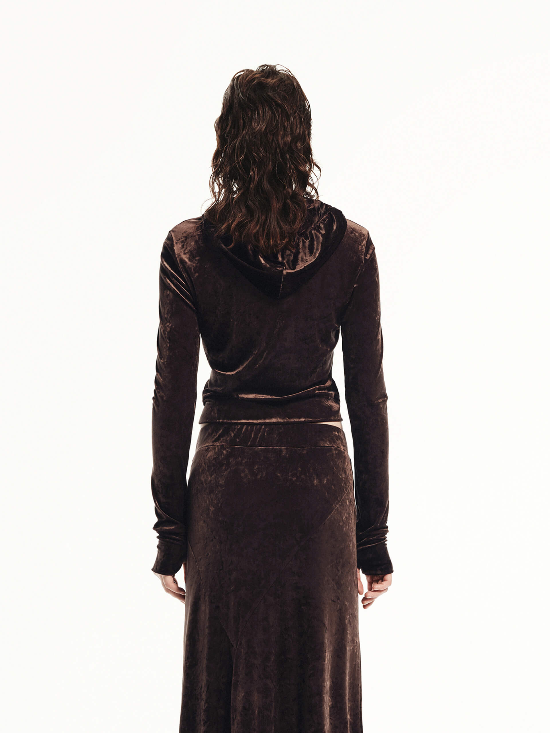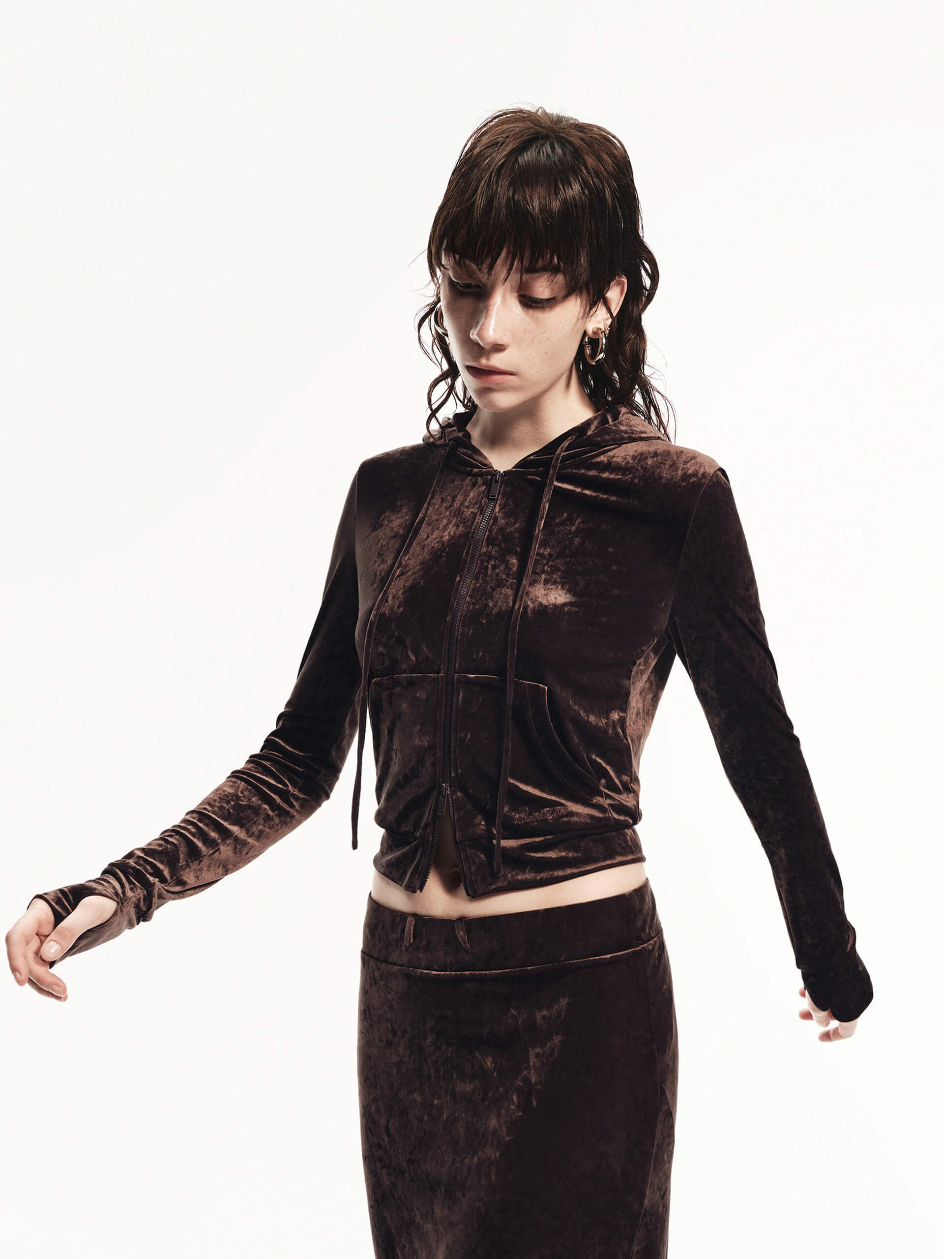 This cropped jacket features a luxurious velvet touch and a sleek zip closure with a hooded design. The thumbhole design adds a stylish touch while keeping your hands warm. Complete the look by pairing it with the coordinating skirt.