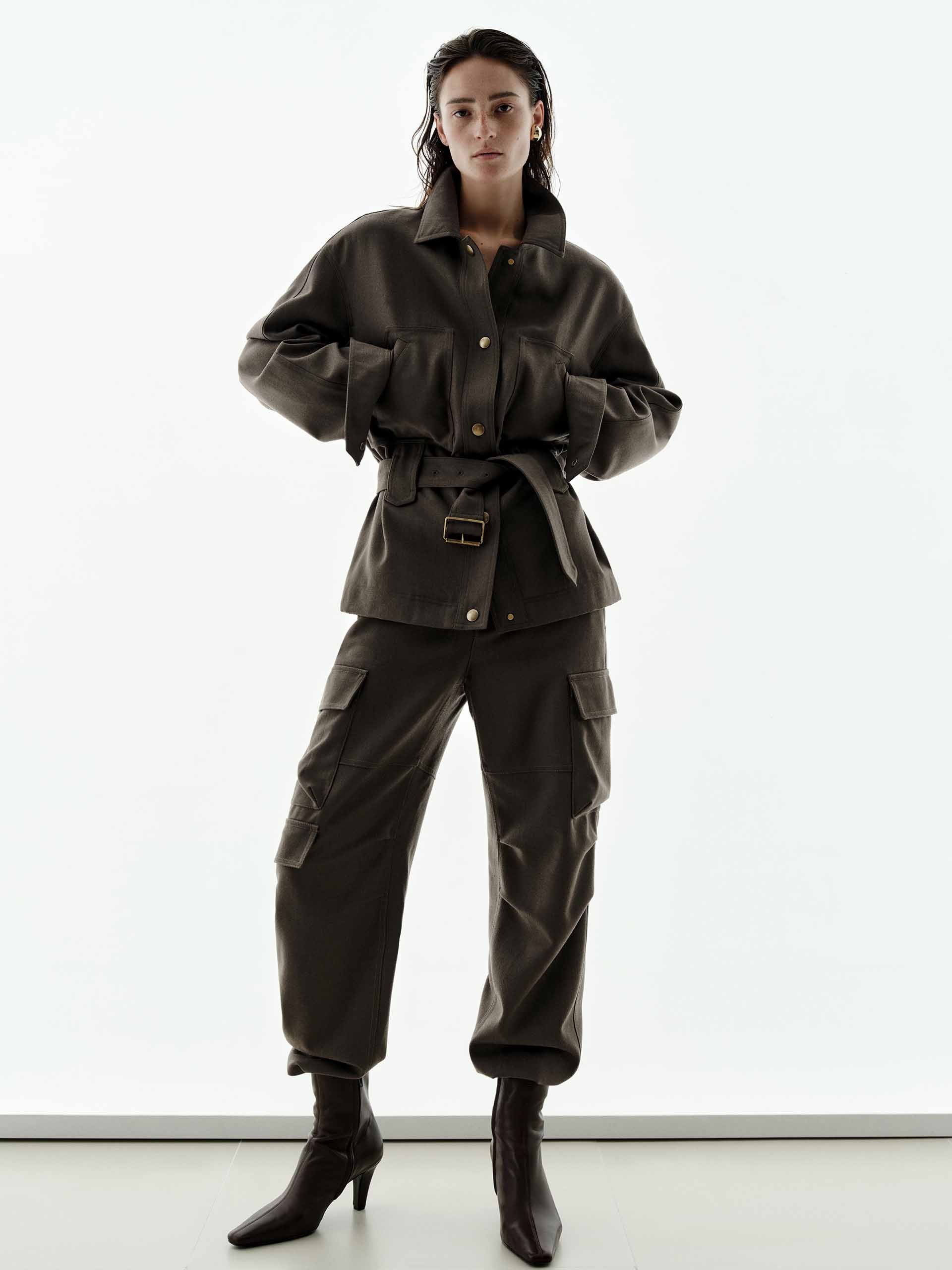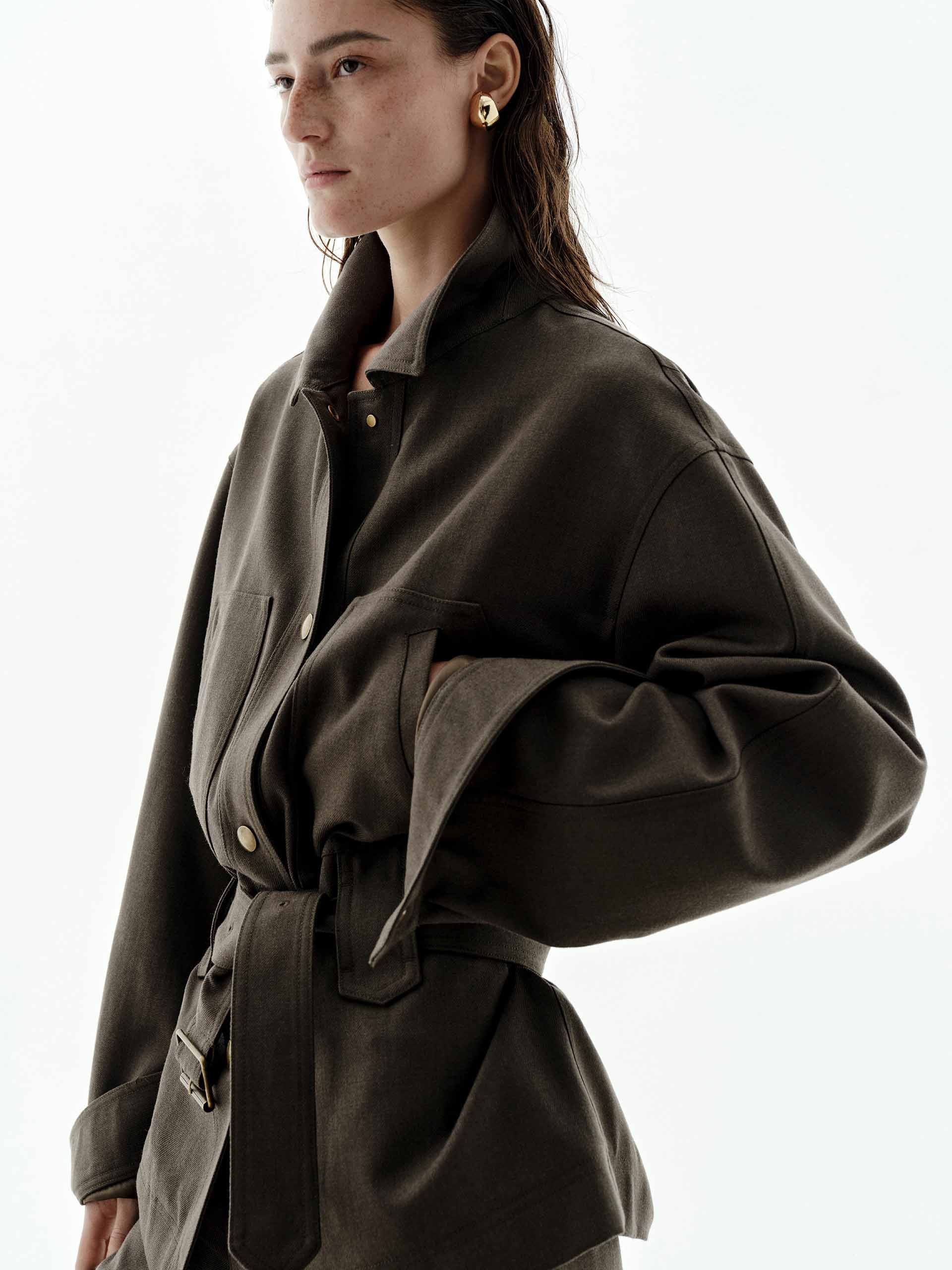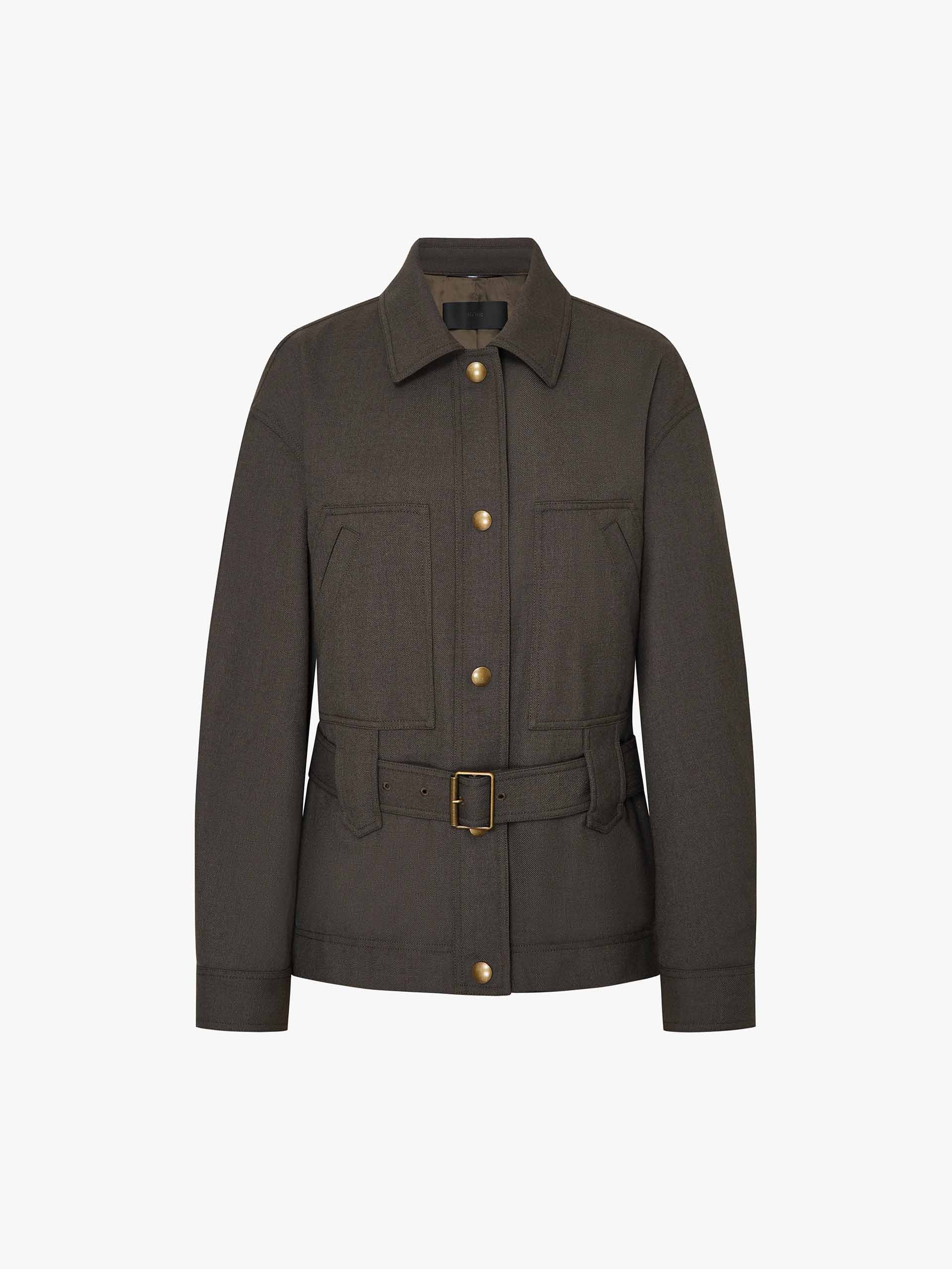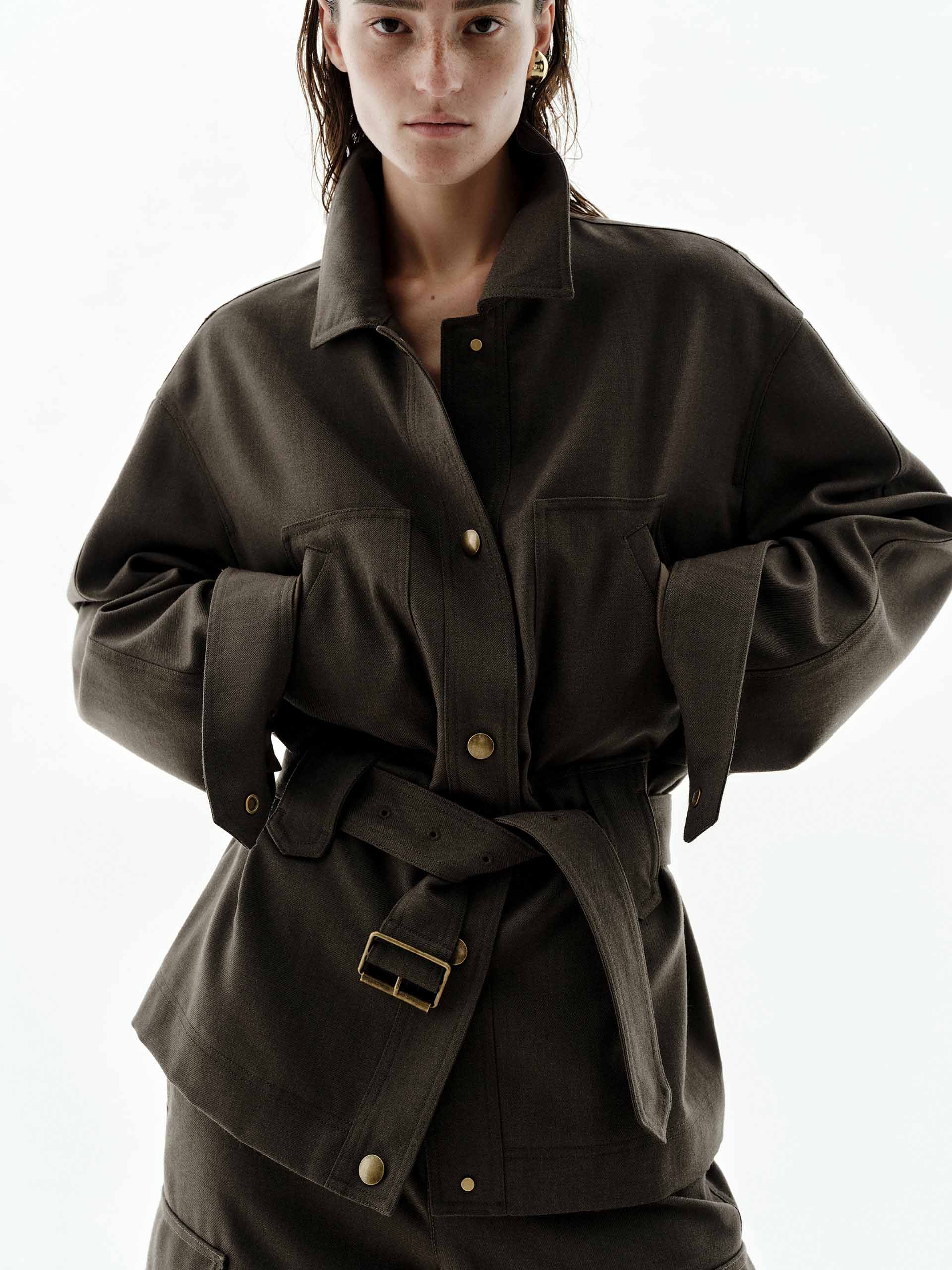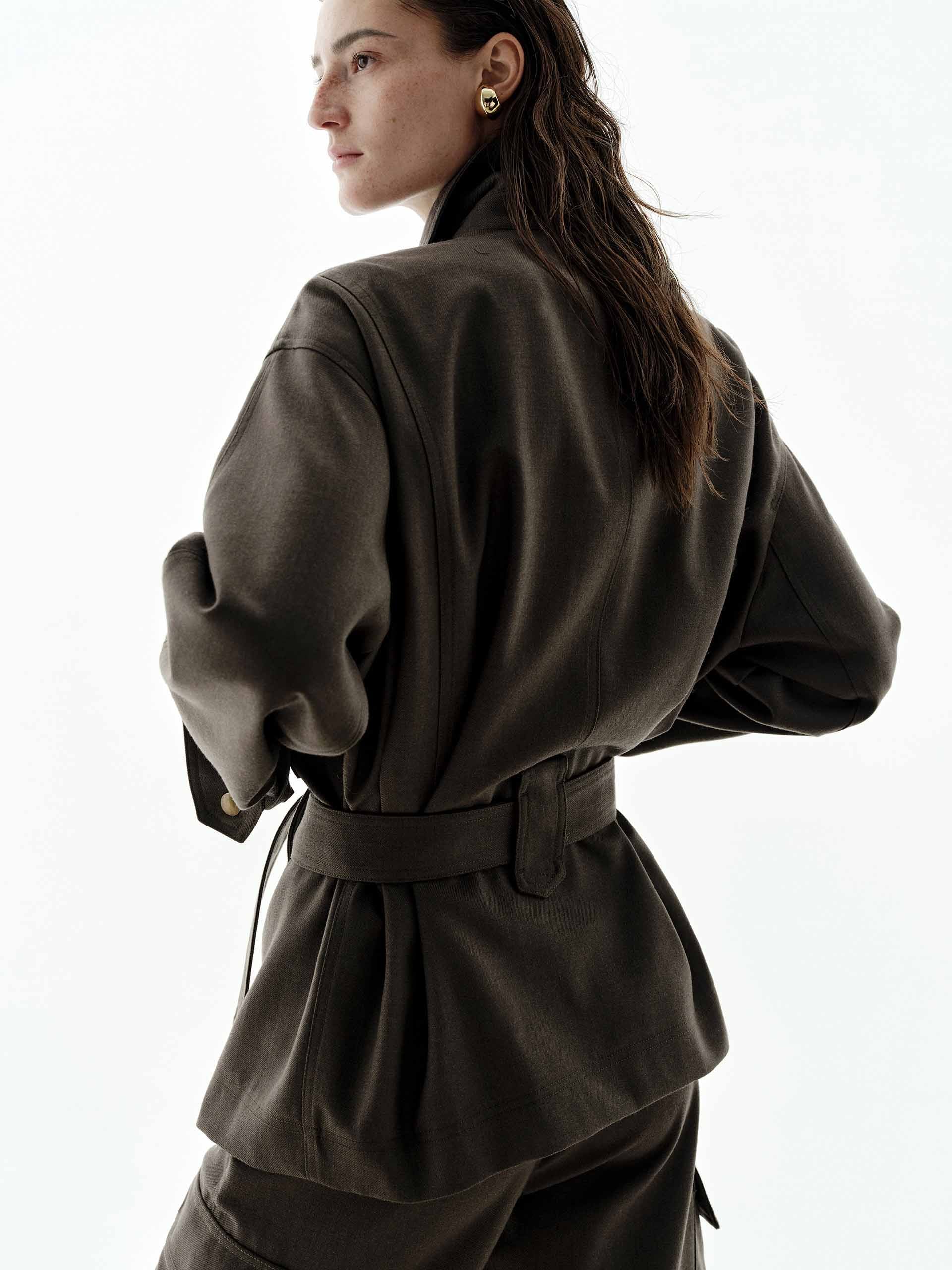 Crafted from 100% premium wool, this jacket combines classic sophistication with functional elegance. The snap button closure and matching fabric belt define the waist for a polished silhouette, while detailed chest pockets and button-adjustable cuffs add subtle utilitarian refinement. This piece moves seamlessly from professional settings to refined casual occasions.