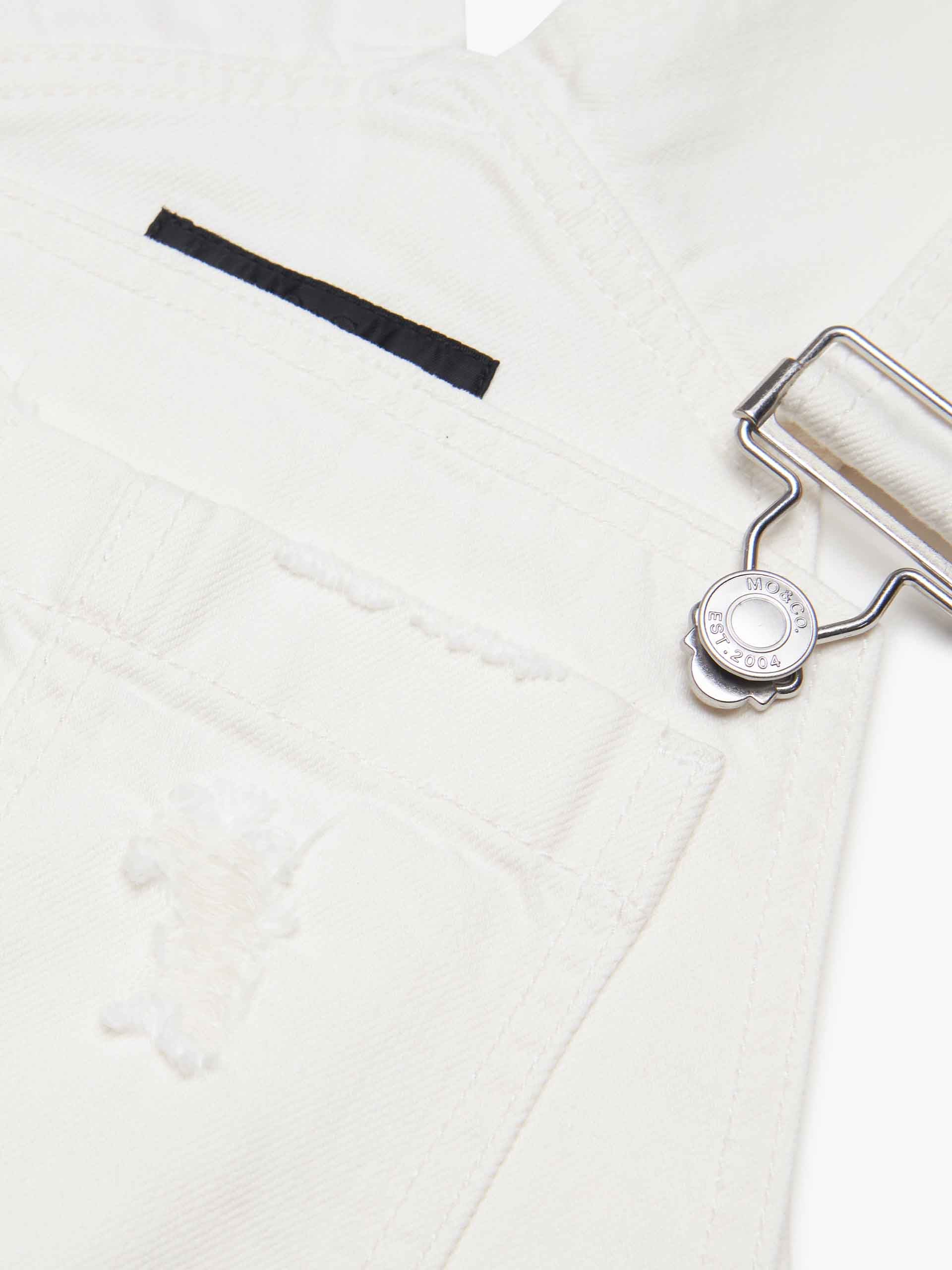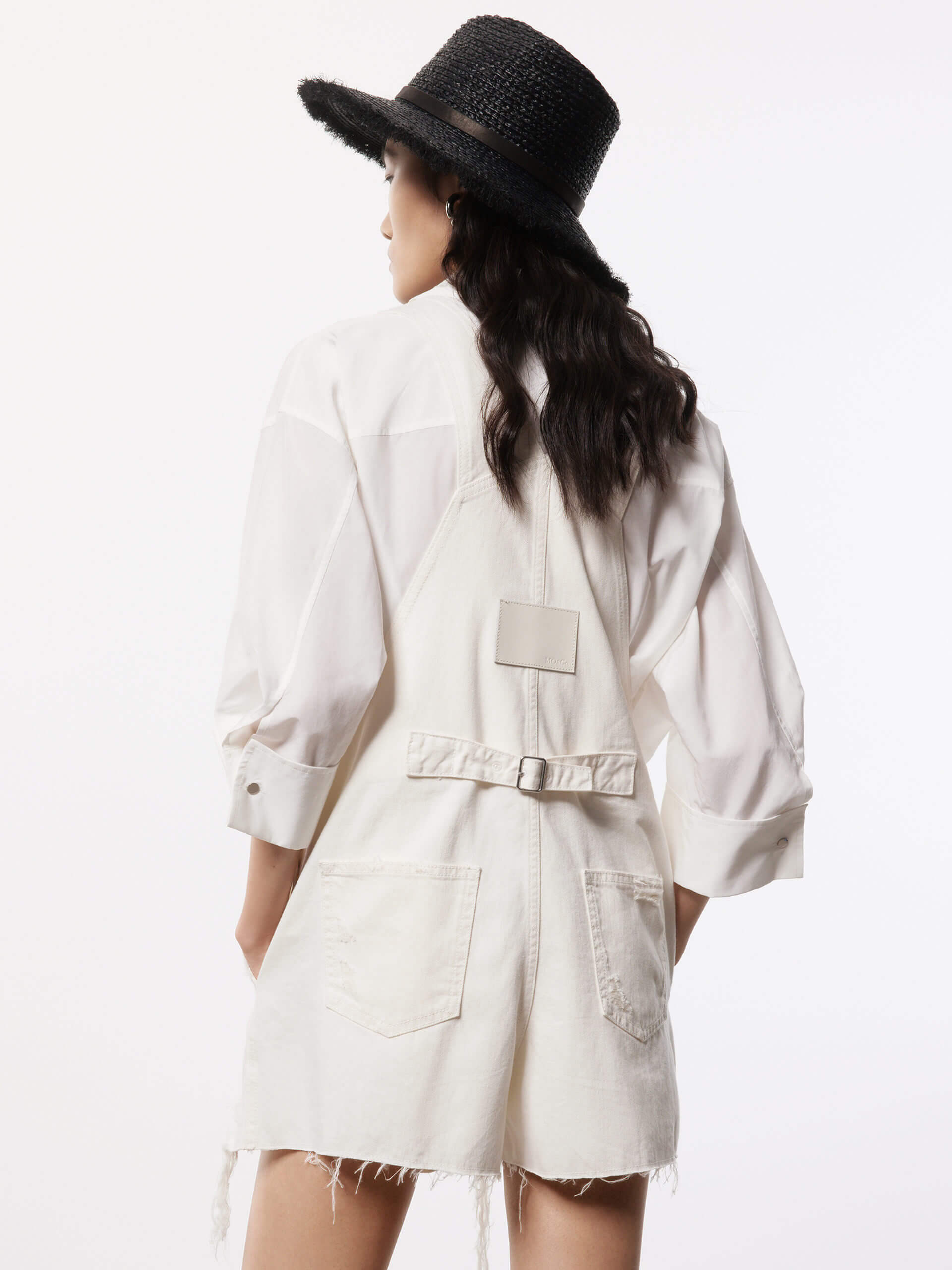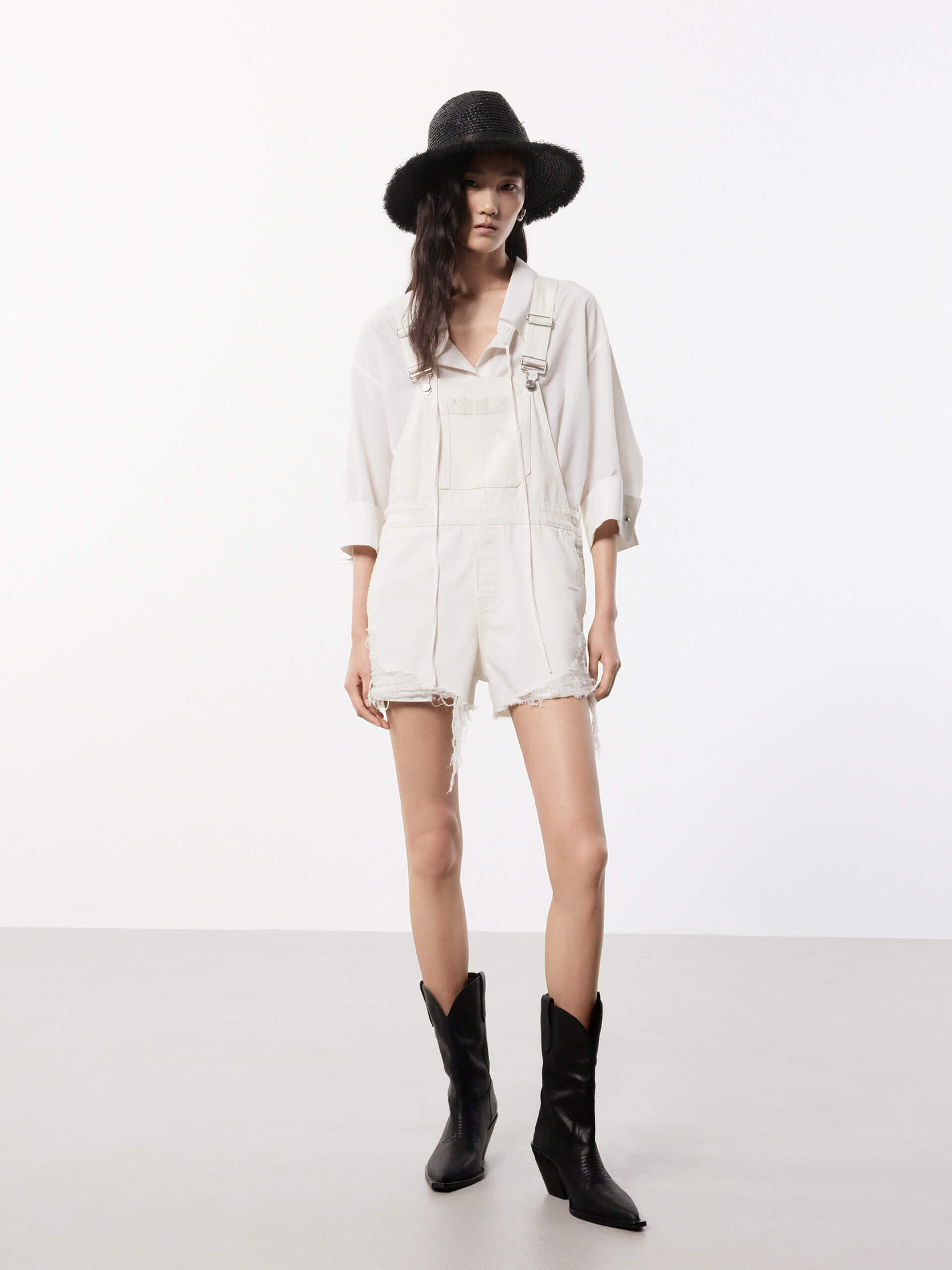 Our denim overalls are the epitome of chic and casual style. Made from a comfy cotton blend, these mini overalls feature adjustable waist and shoulder straps, as well as side pockets. The distressed add a touch of edgy sophistication. Pair them with our white shirt for a fashionable and relaxed look.