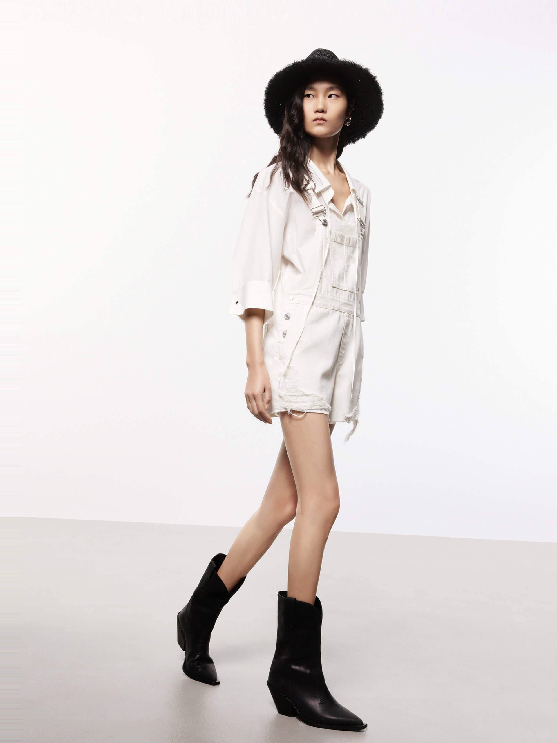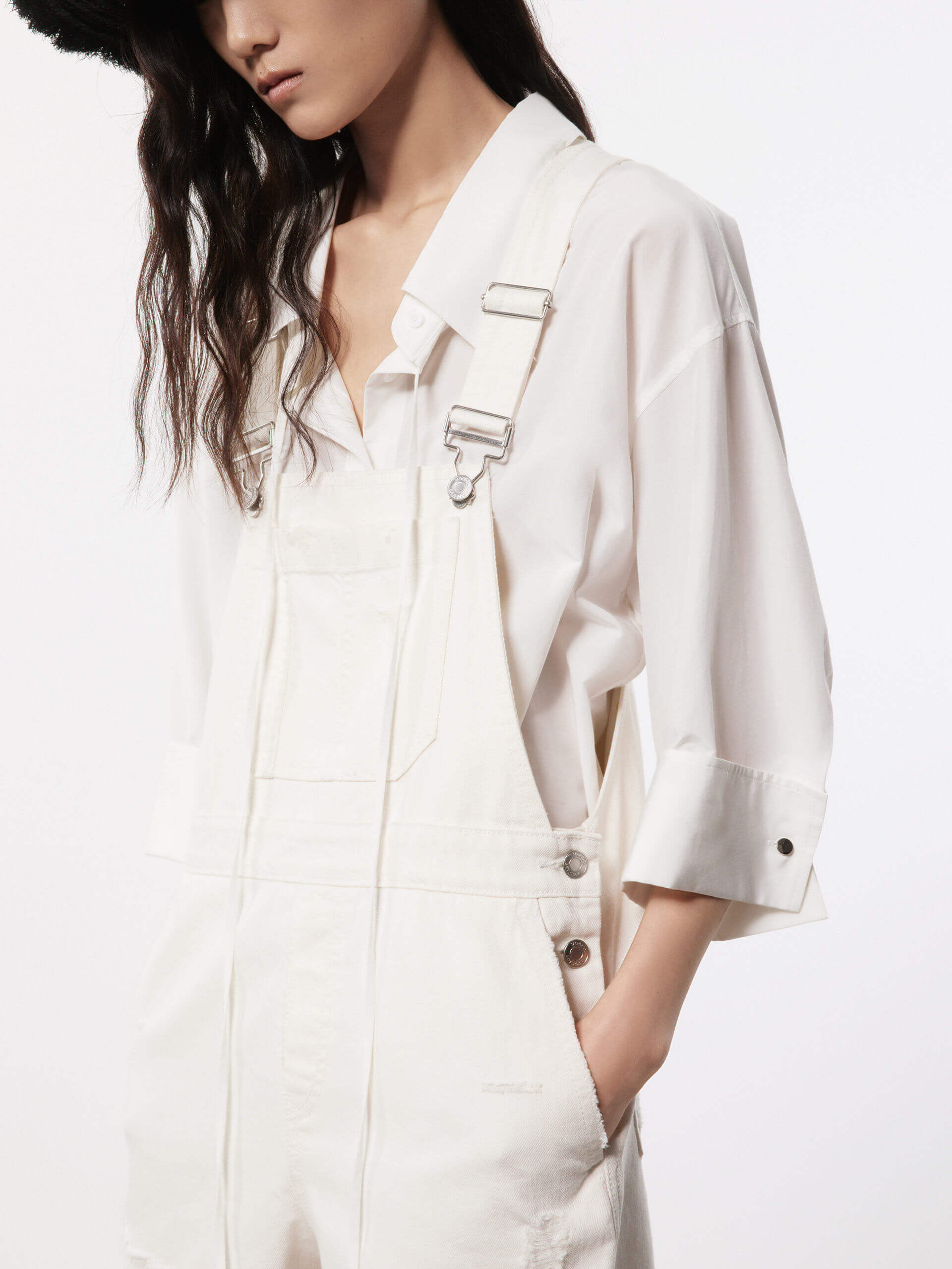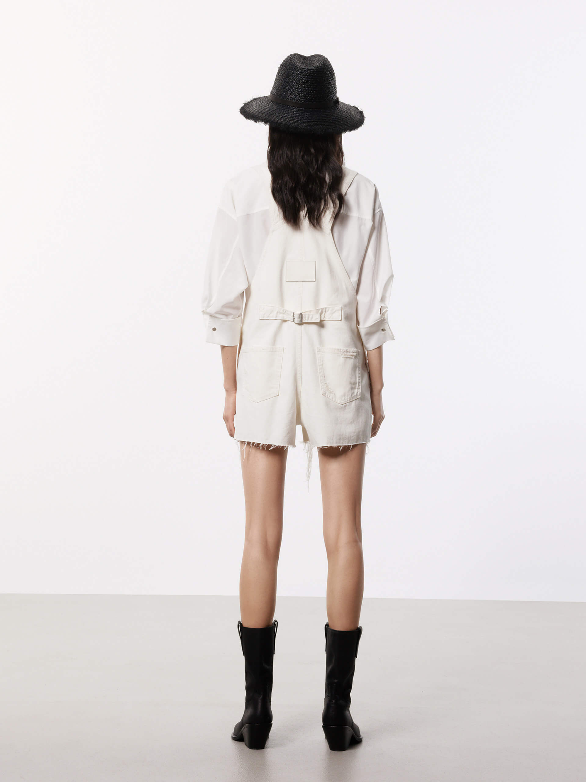 Our denim overalls are the epitome of chic and casual style. Made from a comfy cotton blend, these mini overalls feature adjustable waist and shoulder straps, as well as side pockets. The distressed add a touch of edgy sophistication. Pair them with our white shirt for a fashionable and relaxed look.