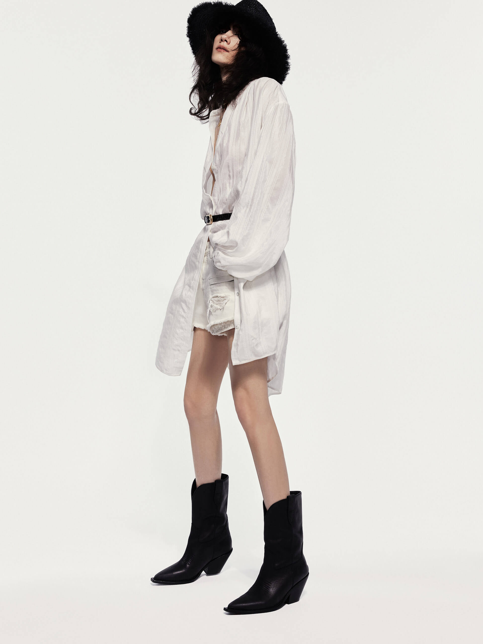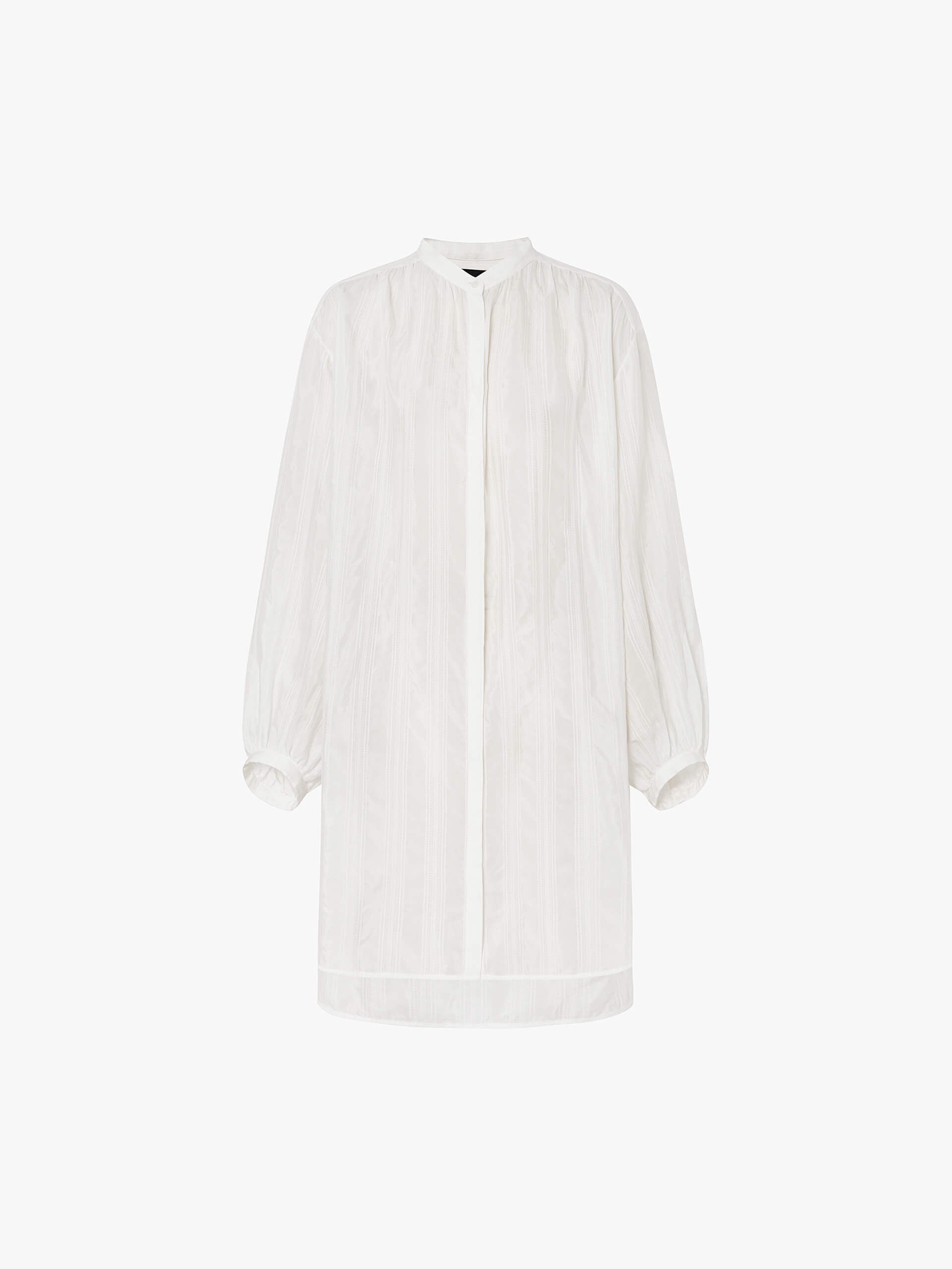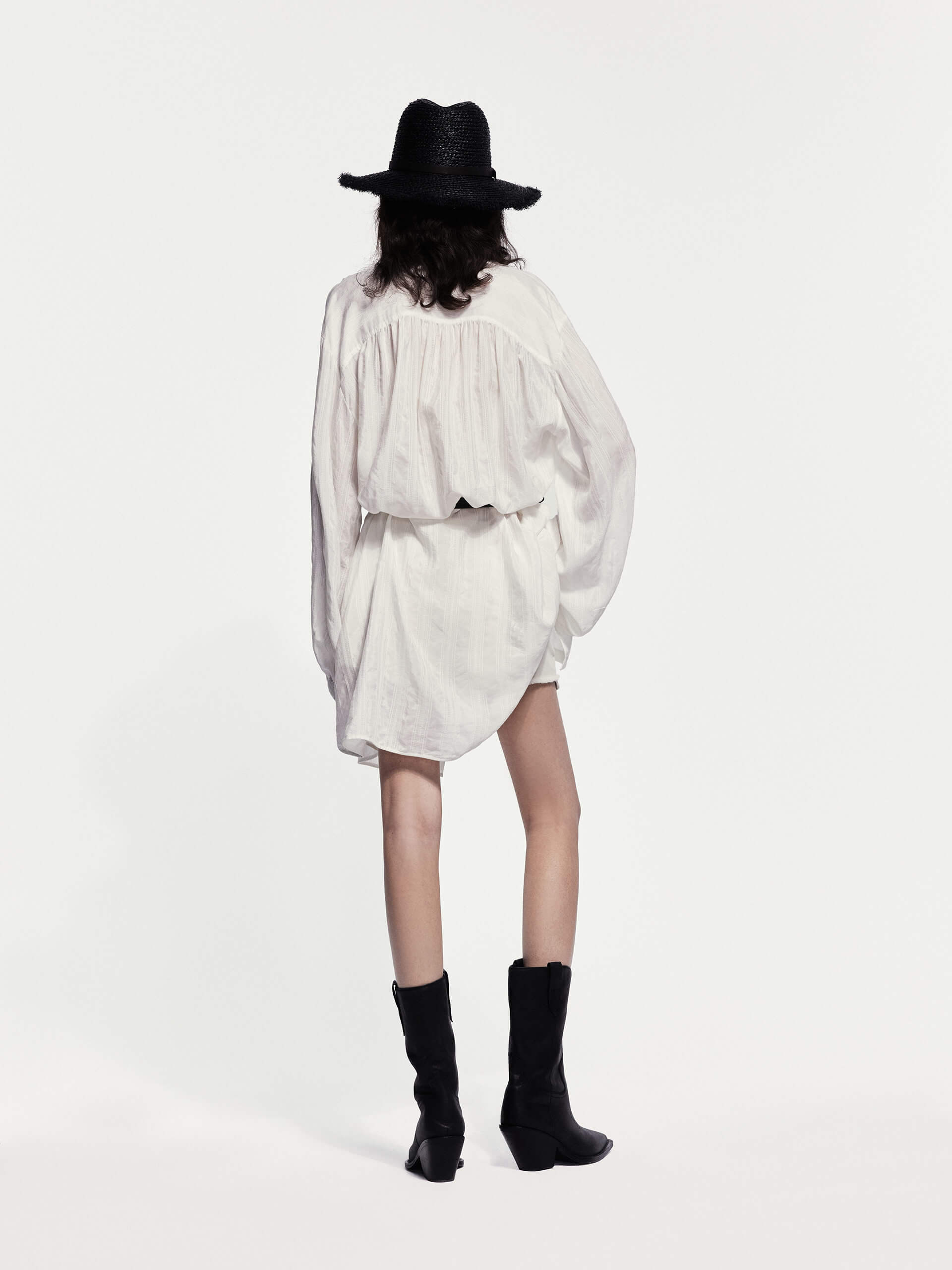 This dress exudes effortless sophistication with its shirt-style silhouette. Crafted from a luxurious blend of silk and cotton, the fabric drapes beautifully with a soft, lightweight feel. Features puff sleeves and mini length that add a romantic, modern vibe, while the pleated design creates gentle movement and flattering shape. With its understated elegance and timeless appeal, this dress perfectly captures the essence of the noir aesthetic.