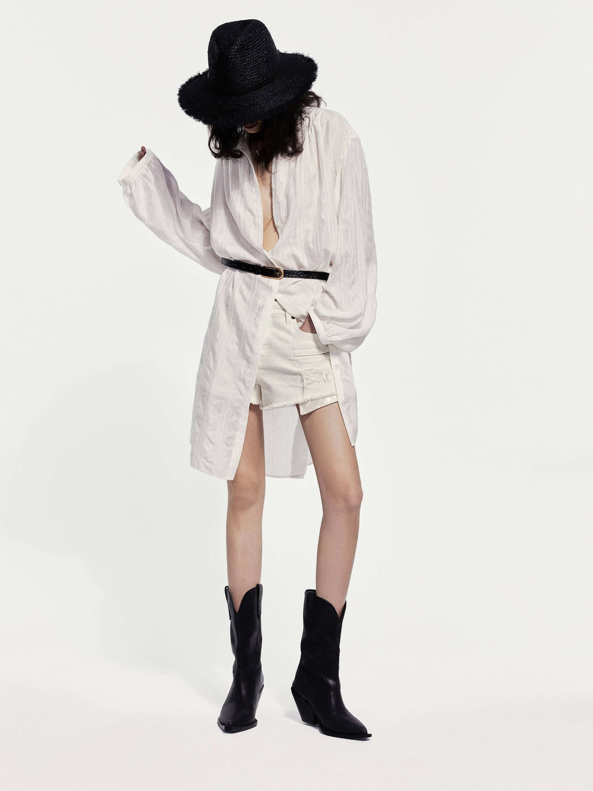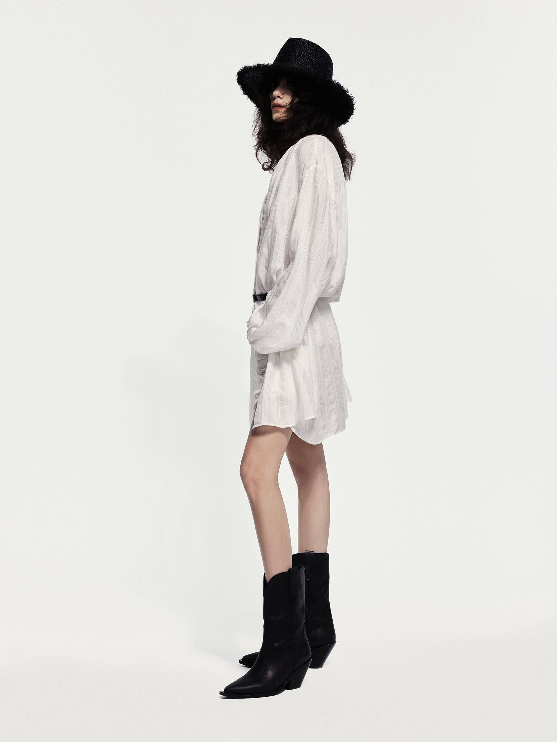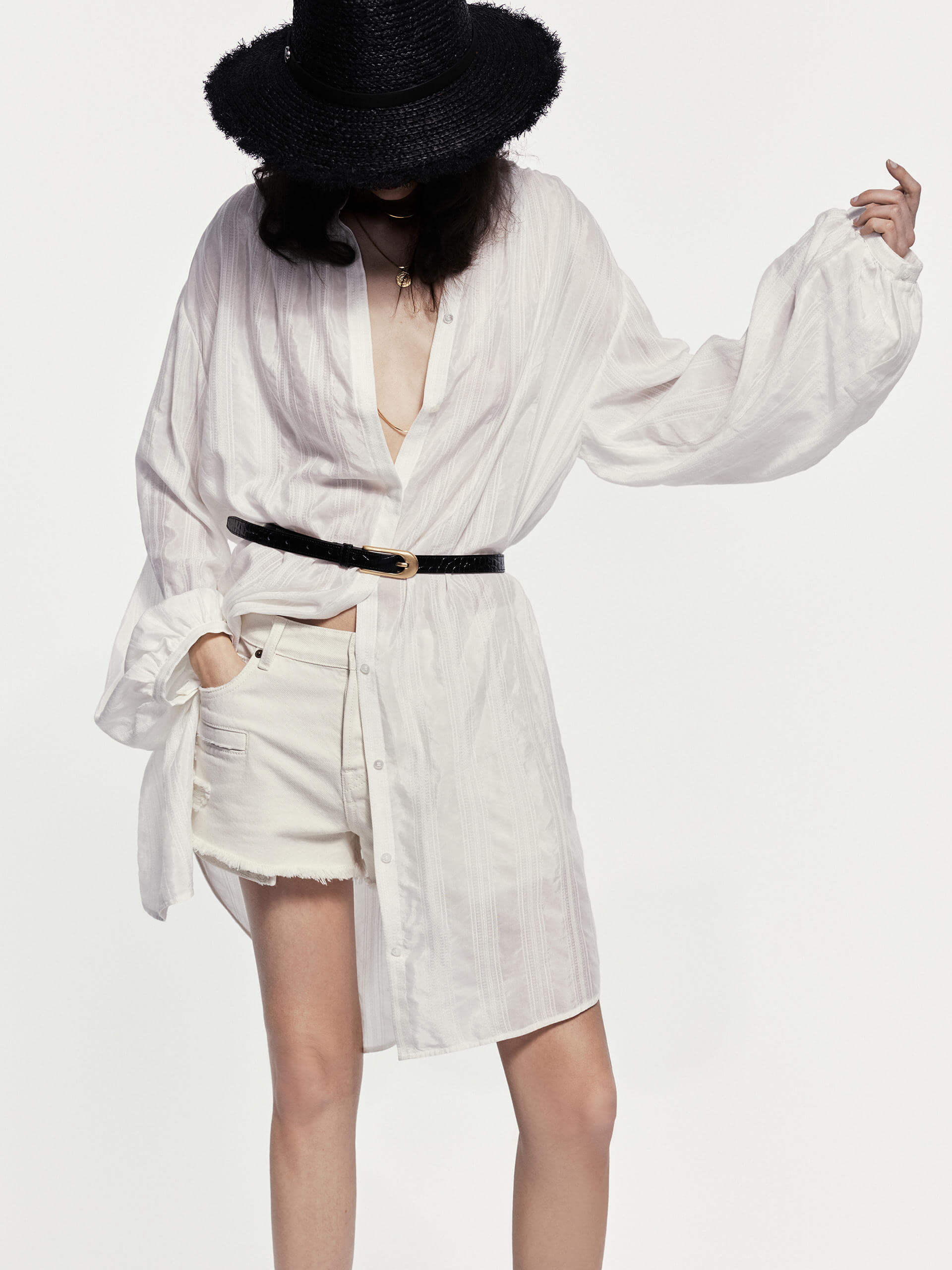 This dress exudes effortless sophistication with its shirt-style silhouette. Crafted from a luxurious blend of silk and cotton, the fabric drapes beautifully with a soft, lightweight feel. Features puff sleeves and mini length that add a romantic, modern vibe, while the pleated design creates gentle movement and flattering shape. With its understated elegance and timeless appeal, this dress perfectly captures the essence of the noir aesthetic.