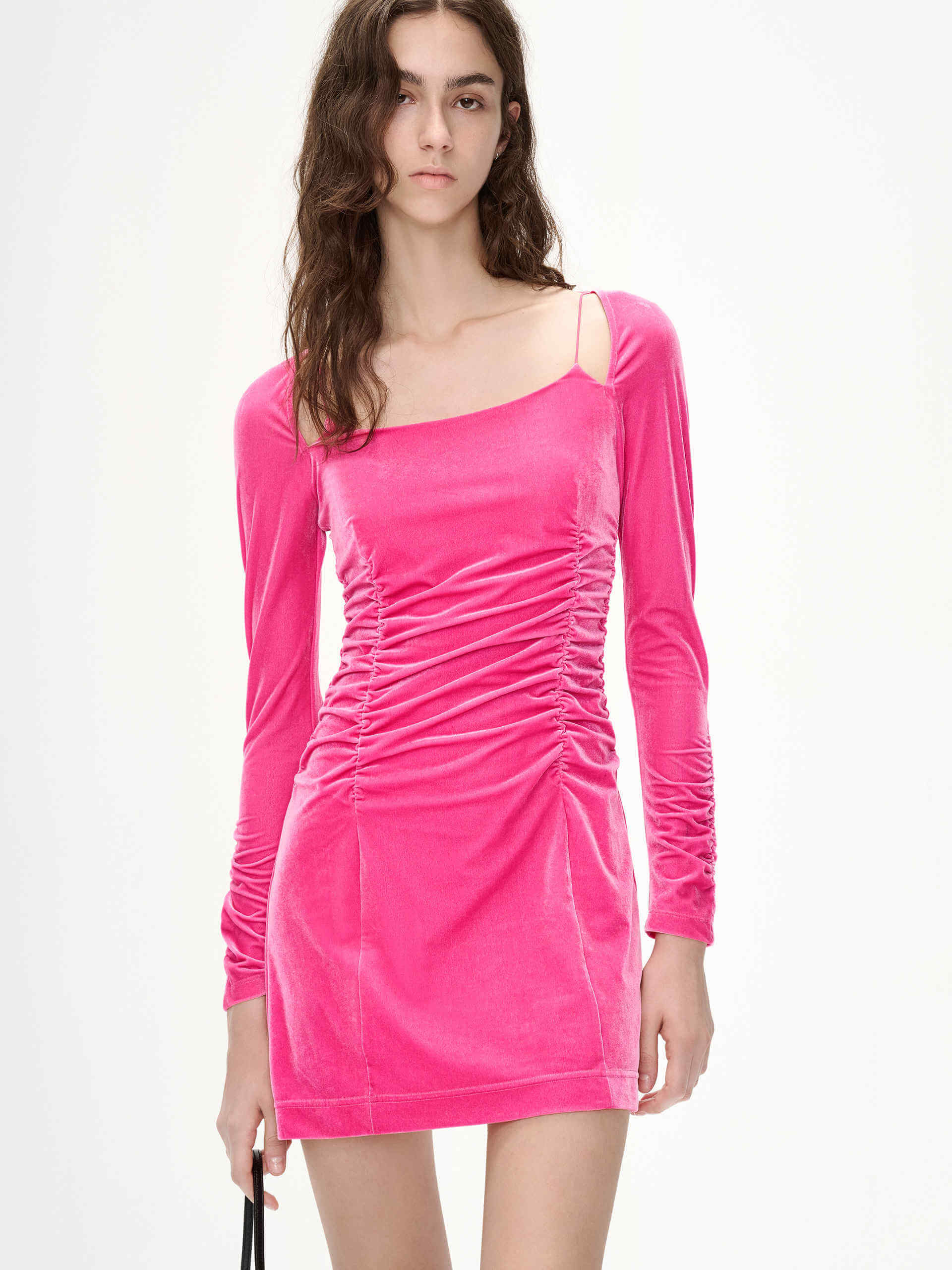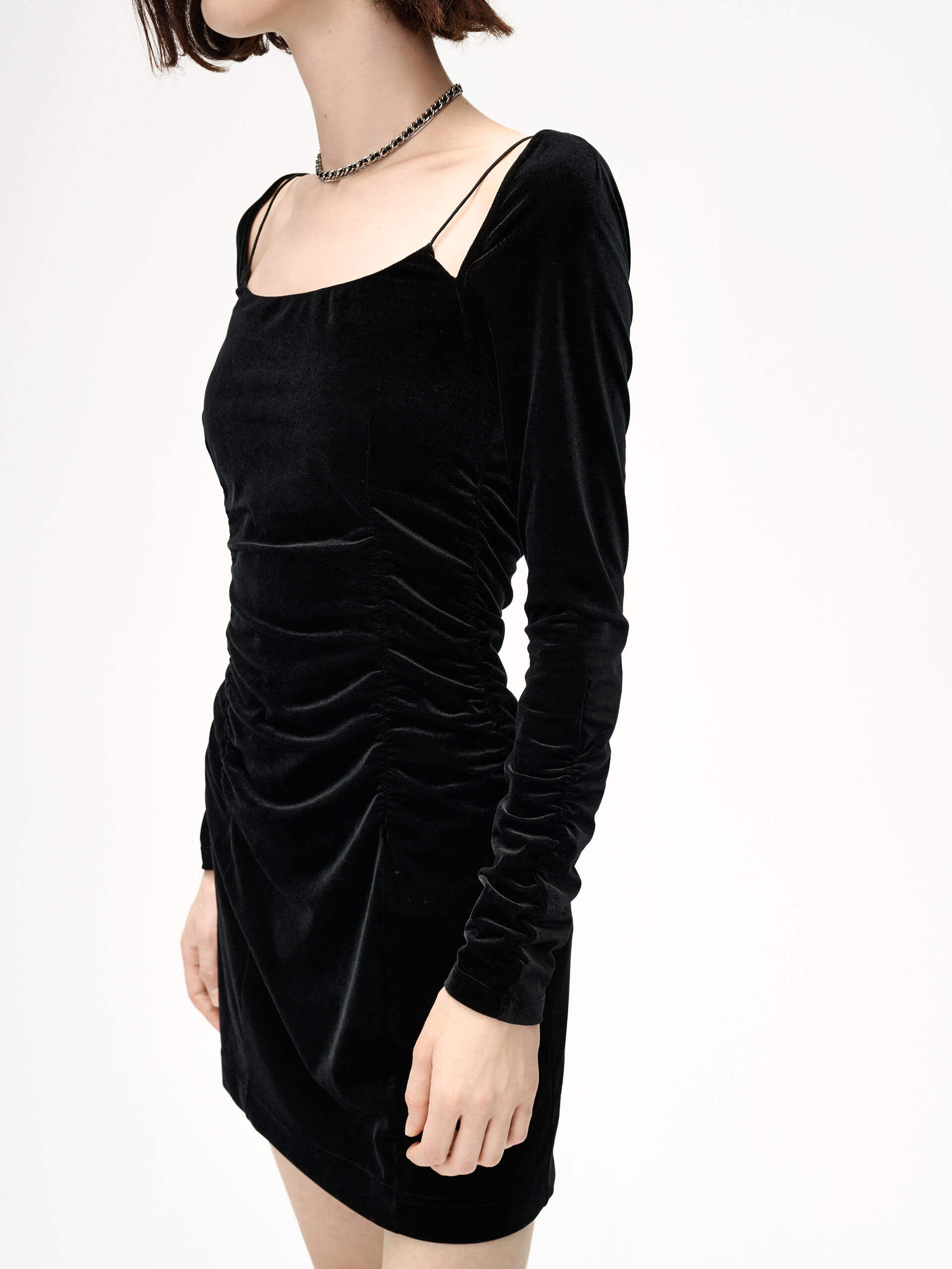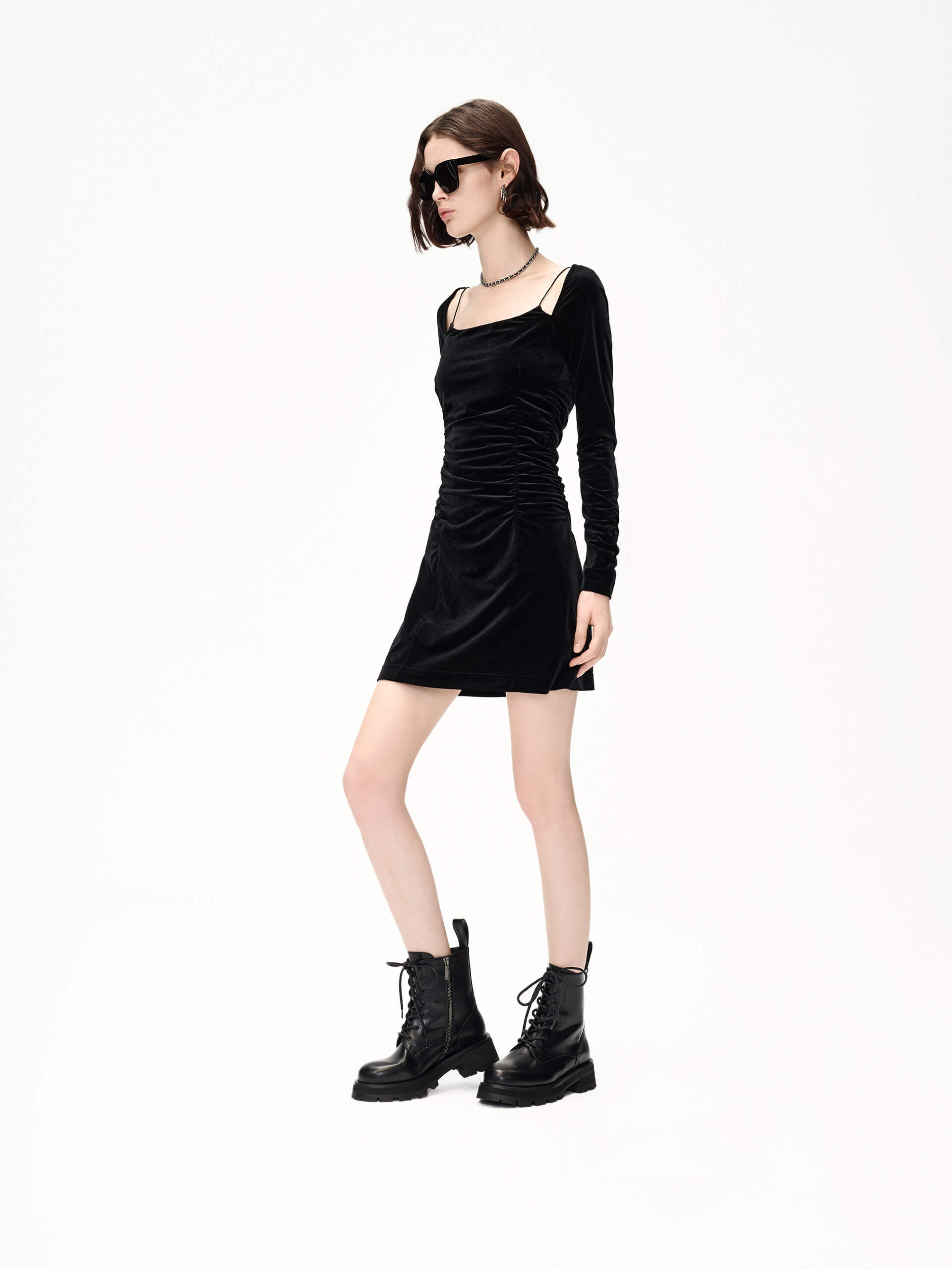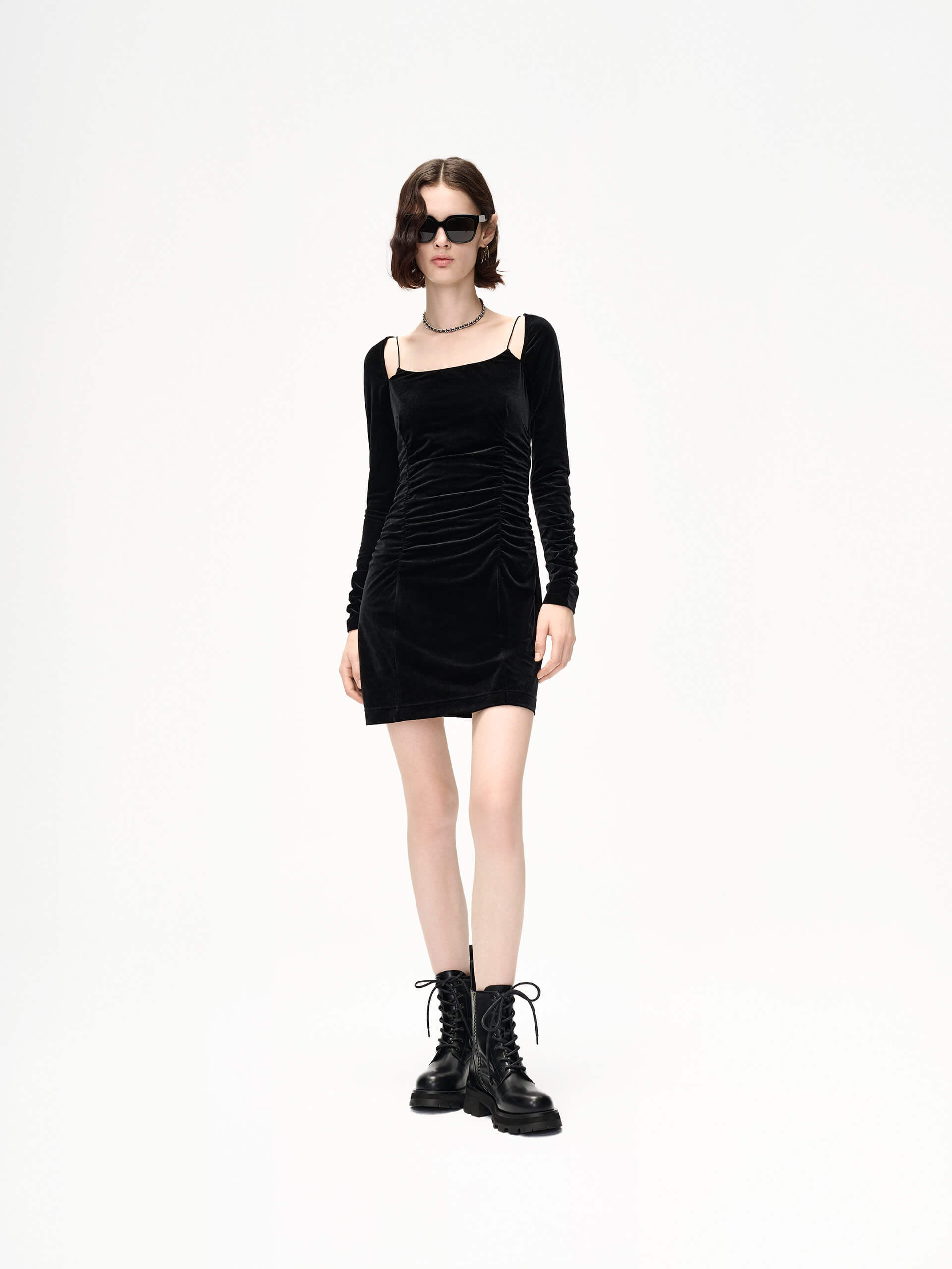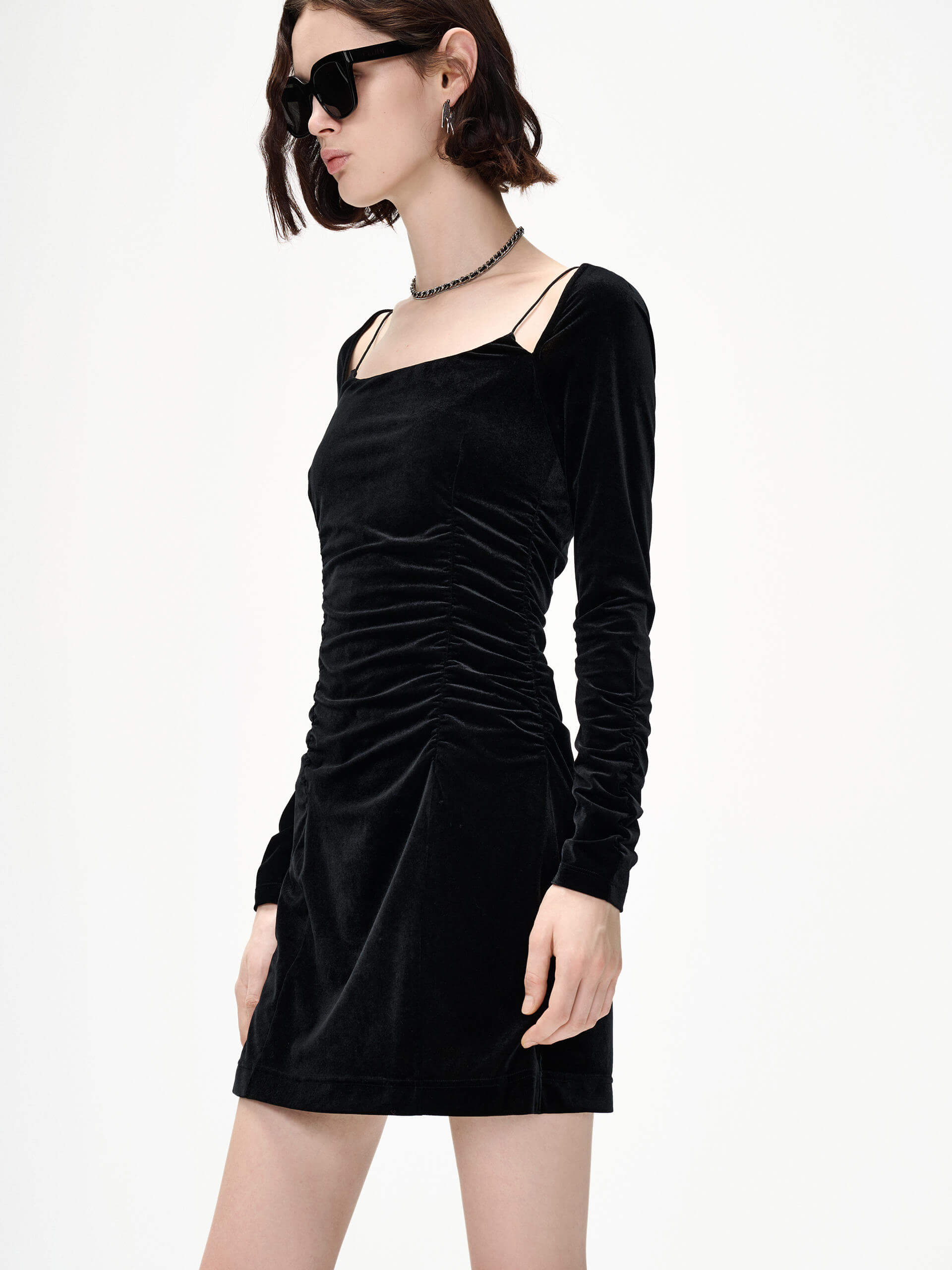 It's crafted from stretchy velvet fabric for a comfortable fit and features delicate pleating details along the waist and sleeves. A modern mini-length cut completes this timeless piece.