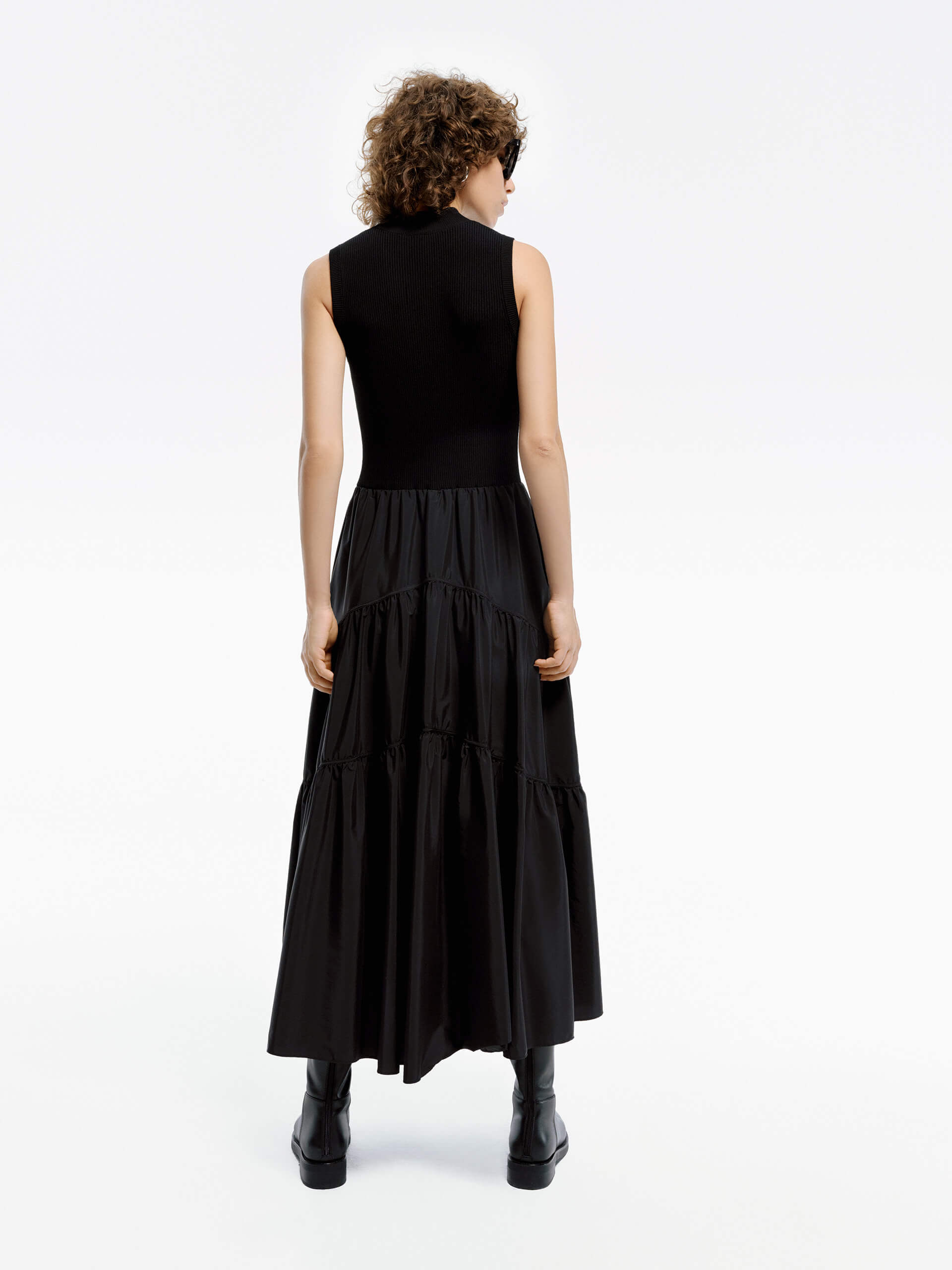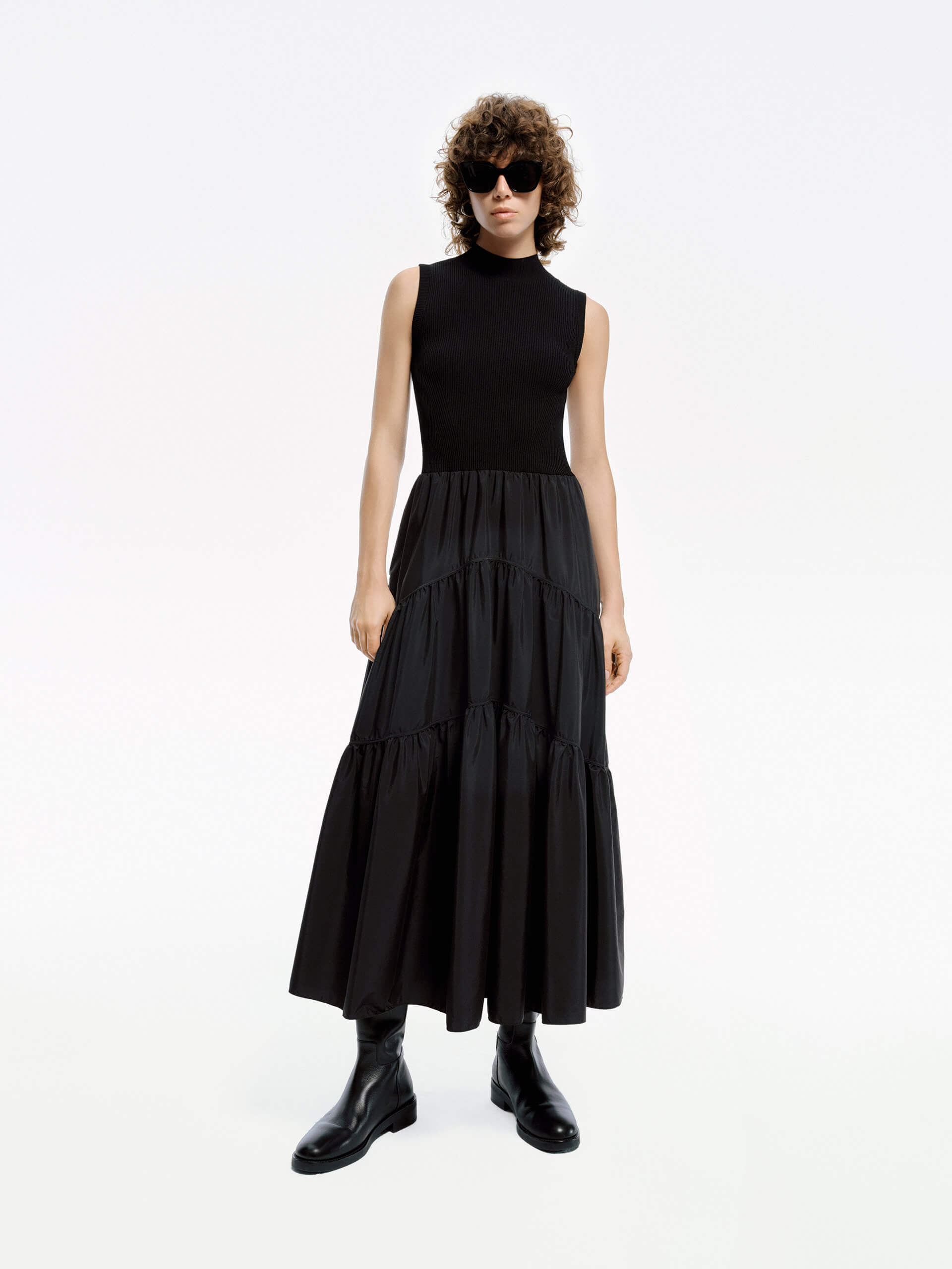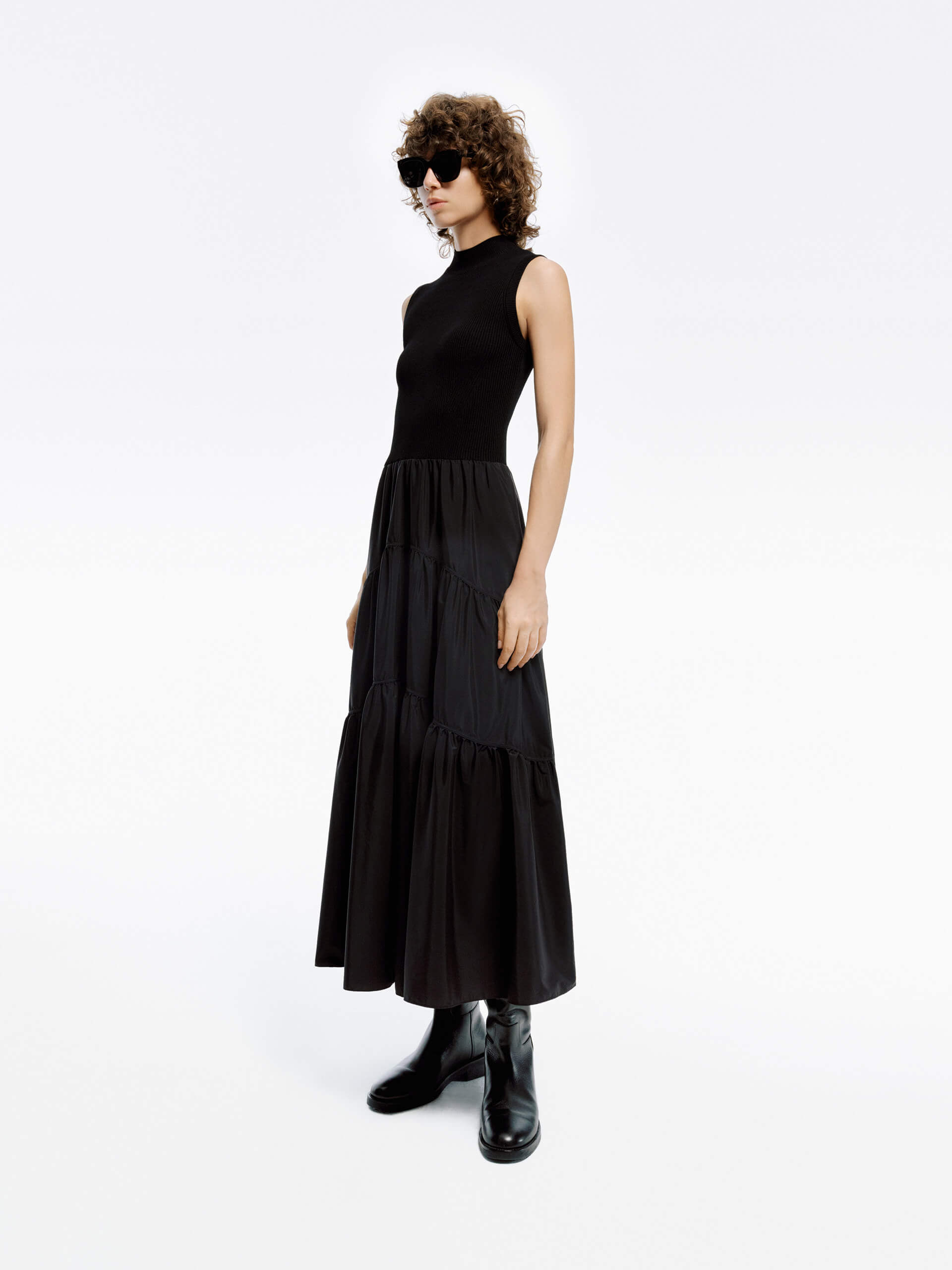 Our sleeveless midi dress is a worthwhile addition to your new-season wardrobe – it'll work for a whole host of SS events. It's designed with a slim jersey top and flares out to a flowy blend skirt that's trimmed with layered pleated and seams details.