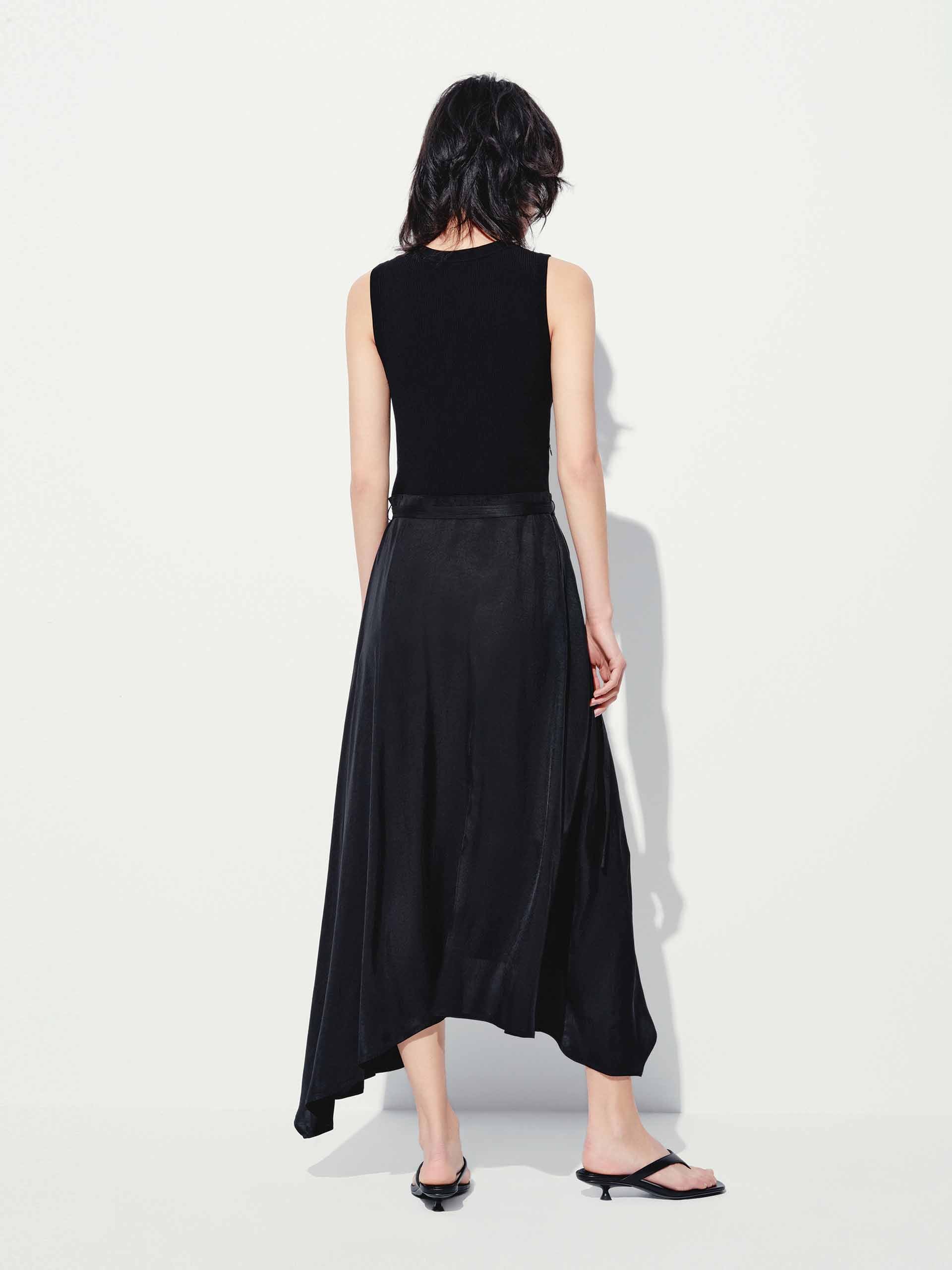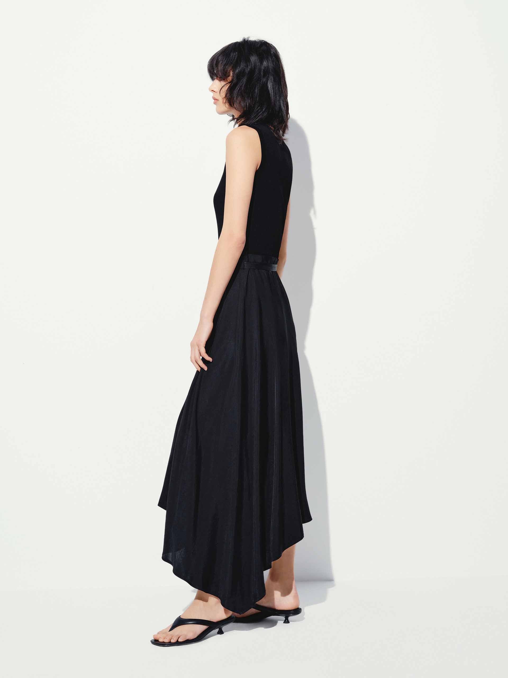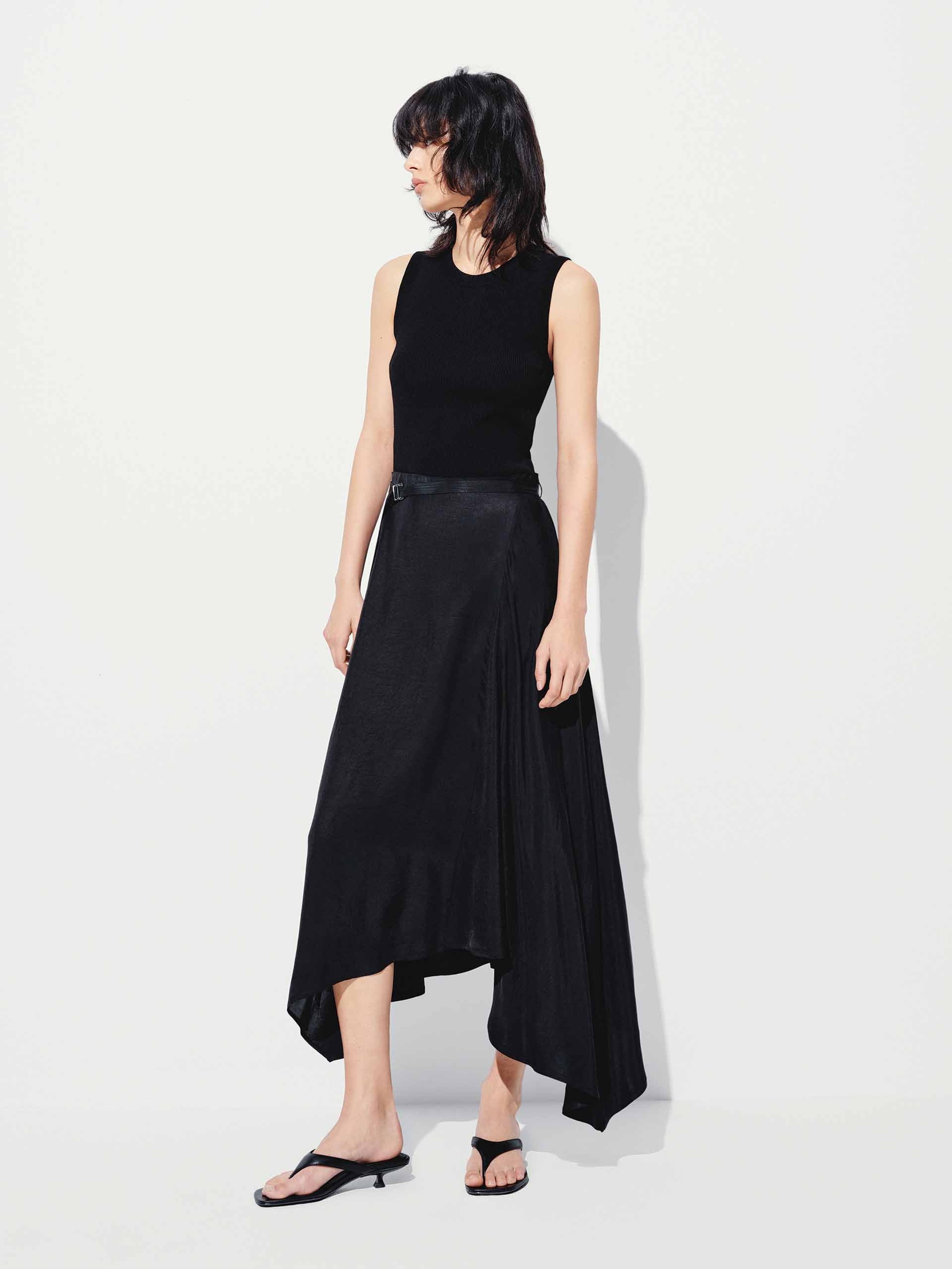 - Sleeveless, asymmetric hem
