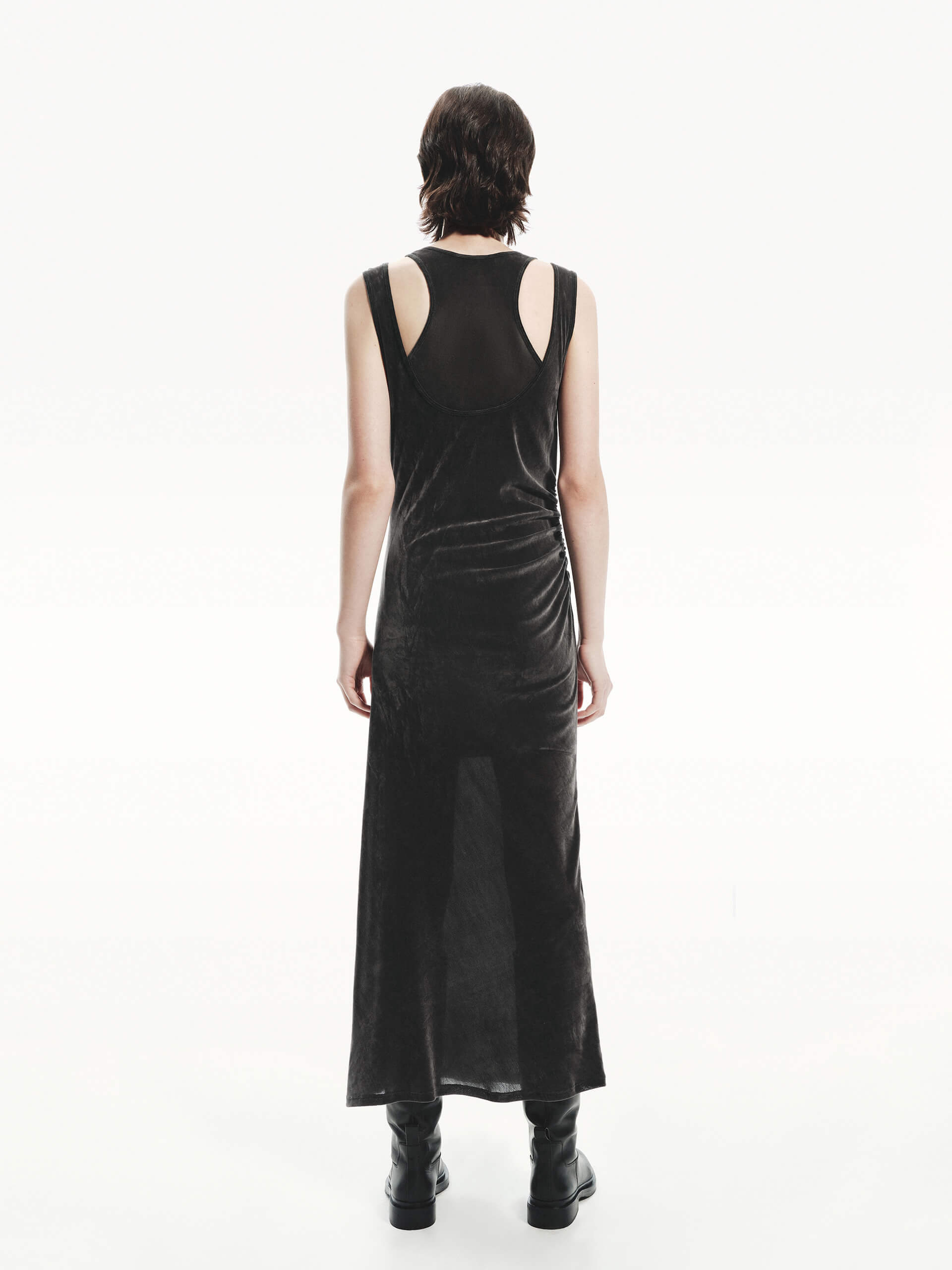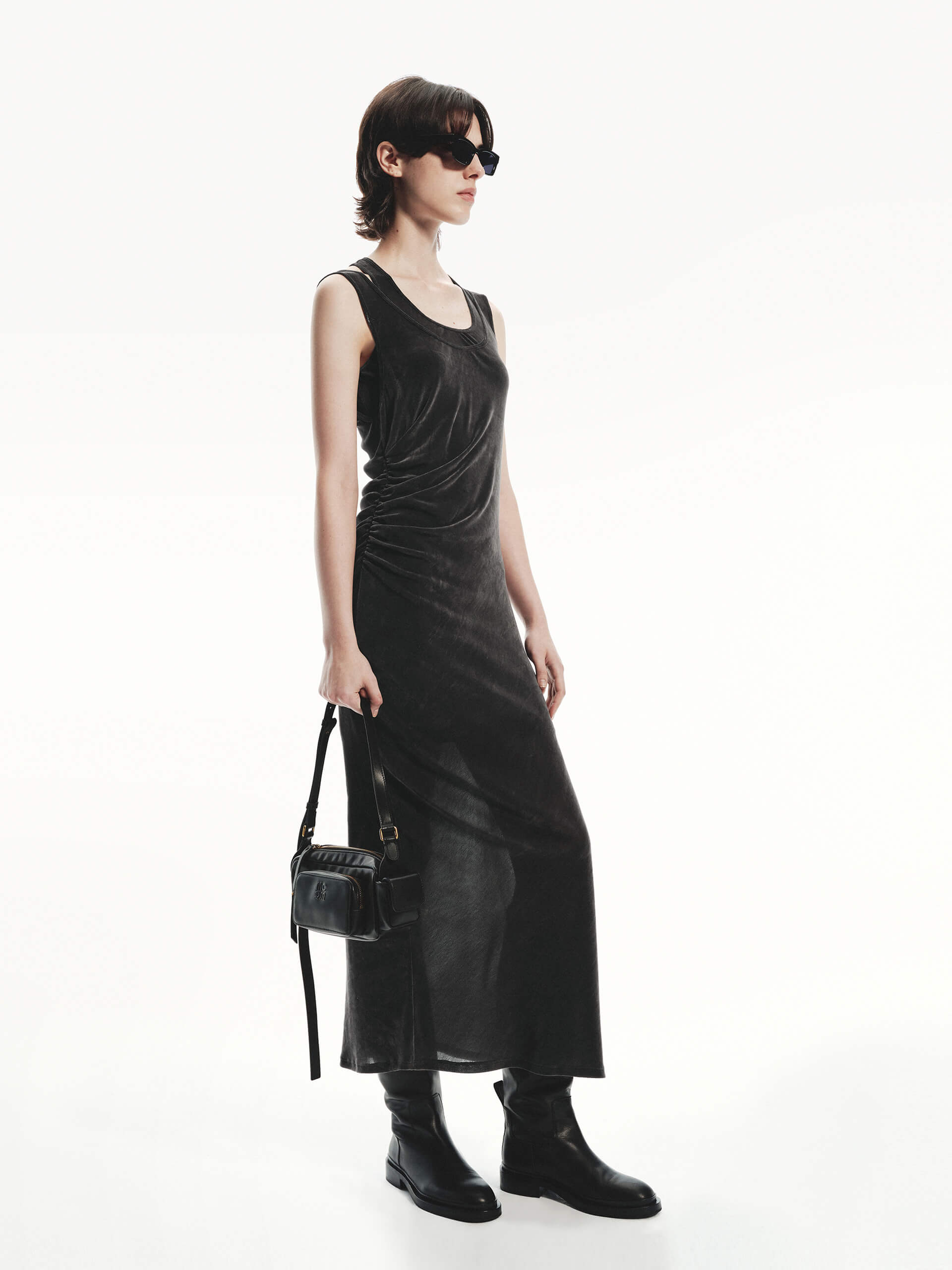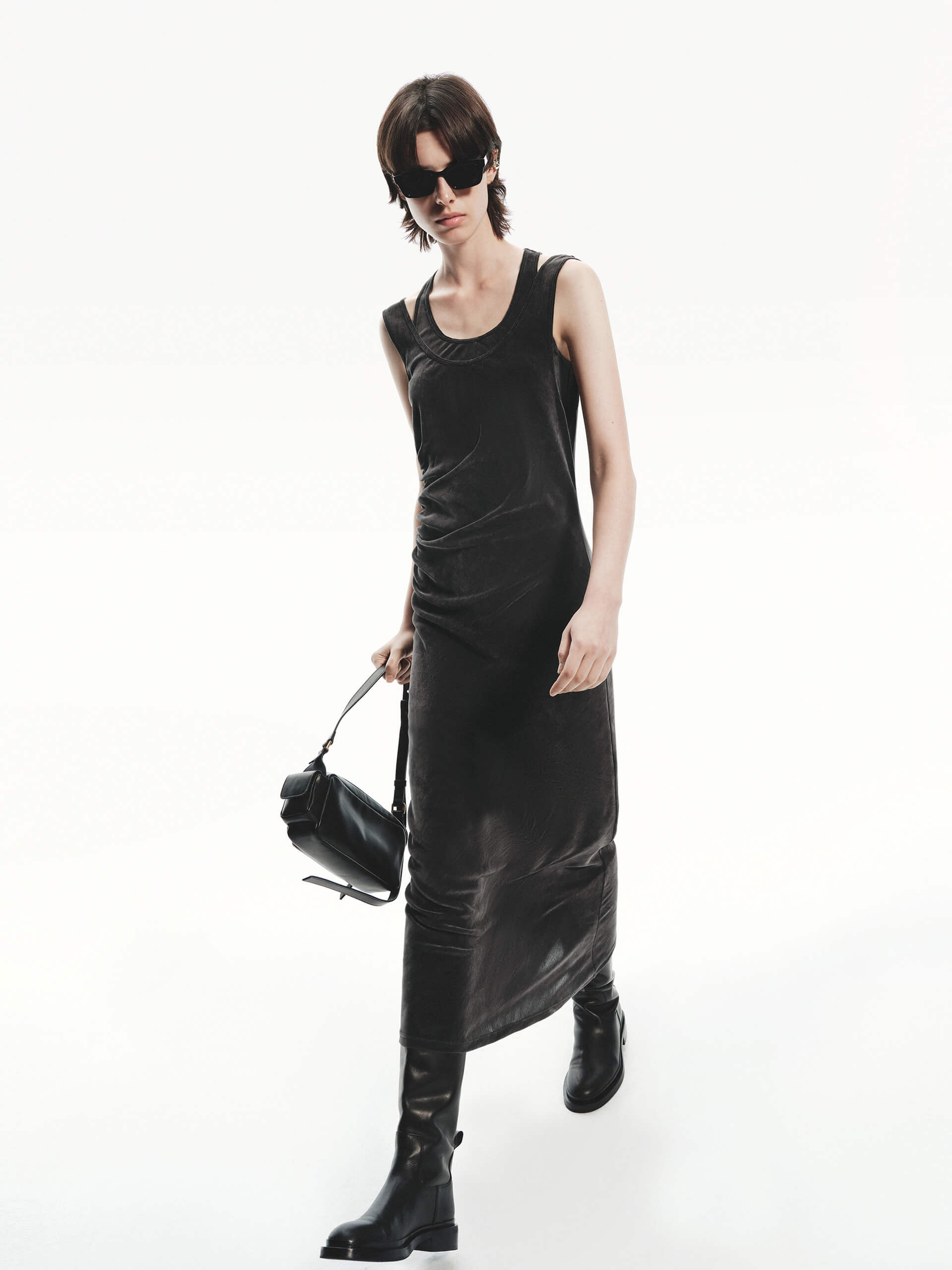 Exude modern elegance in our dress, a sophisticated two-piece set designed for a seamless and chic silhouette. This dress features a sleek slim fit and an elegant midi length that creates a beautifully elongated figure. The flattering U-neck and sleeveless detail highlight the collarbone and shoulders for a refined look. Delicate side pleating adds subtle texture and movement.