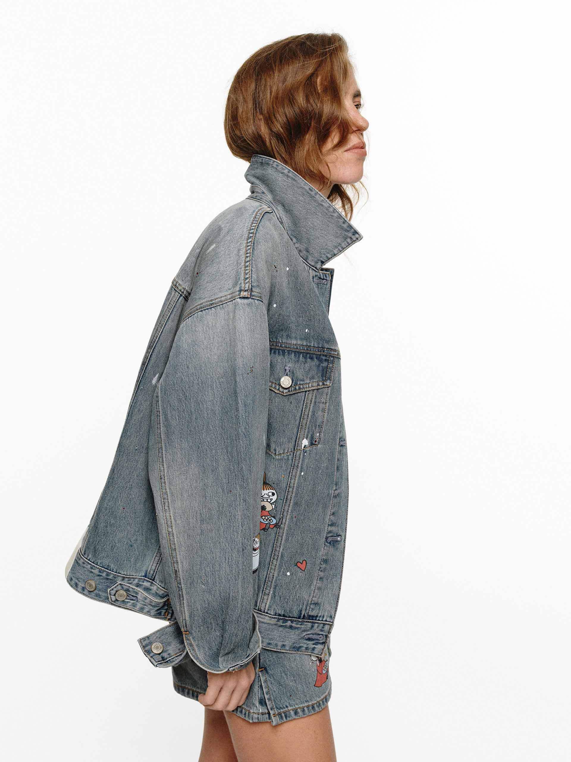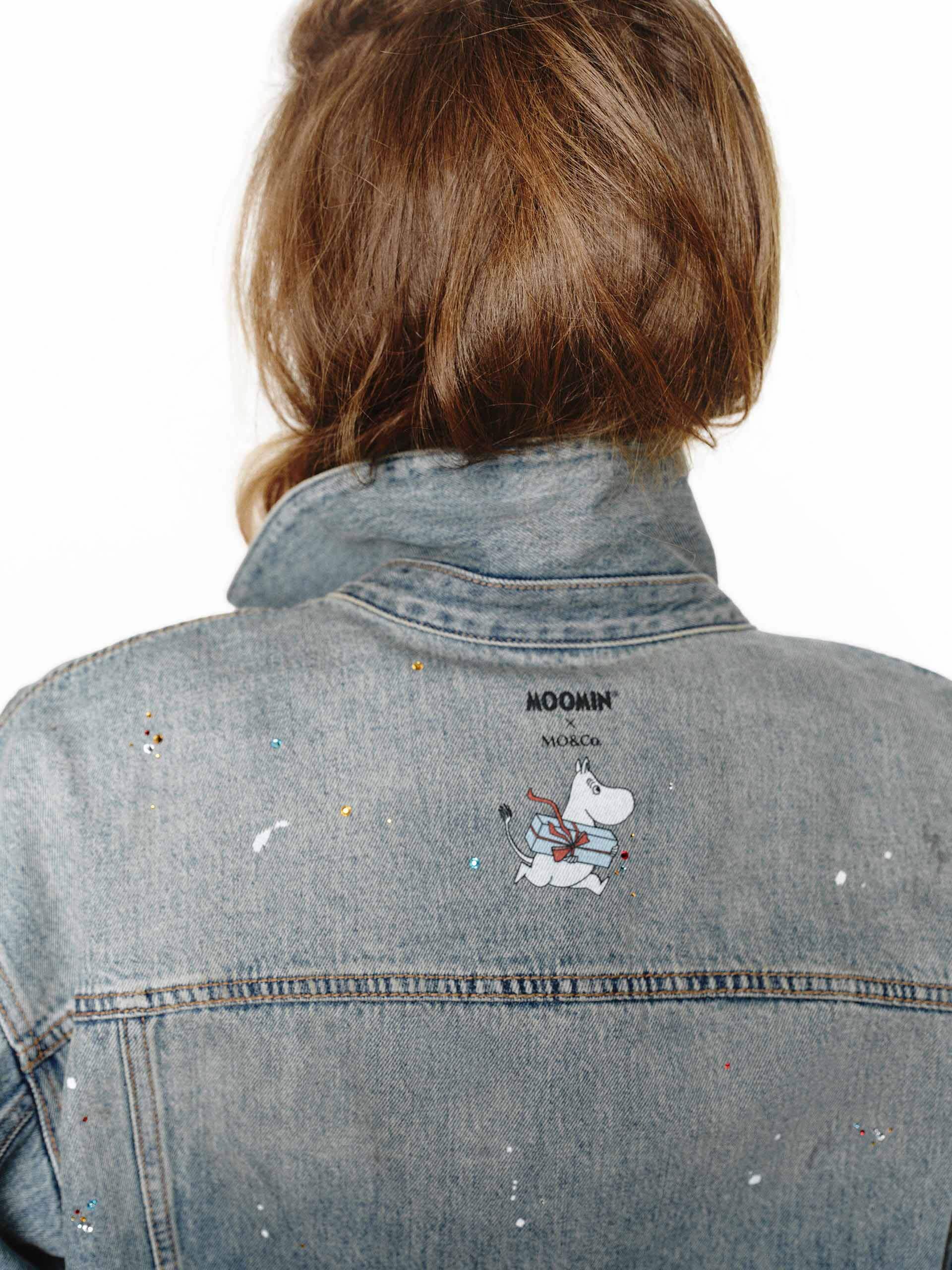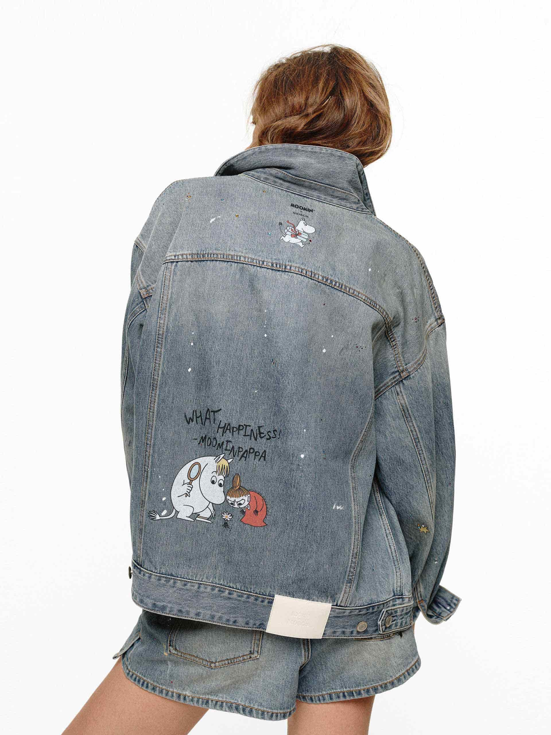 This MO&Co. x MOOMIN collaboration denim jacket offers a playful yet refined take on casual style. Vibrant graffiti, accompanied by colorful rhinestone details, adds a sense of story and fun. The loose fit and hip-length design create a flattering, slimming effect with ease.