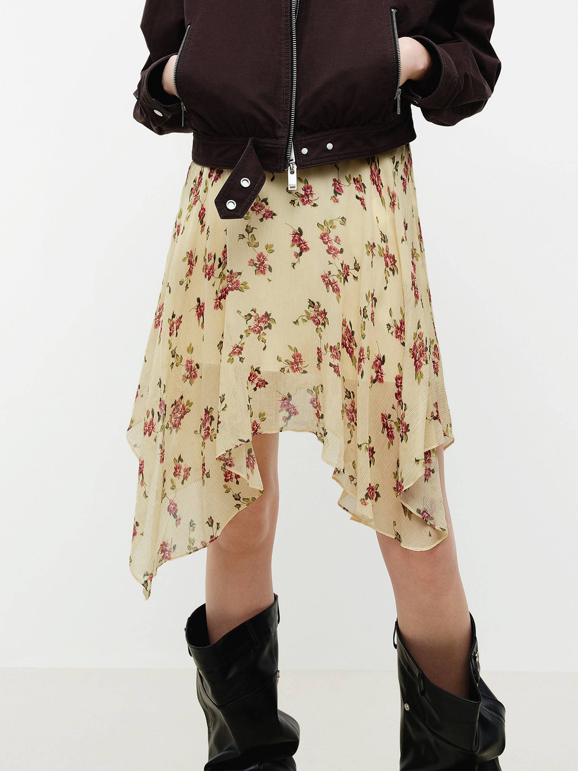 This skirt includes a lining and features an irregular hem that sways gracefully with movement. The full floral pattern design is fresh and bright, like a spring garden in bloom. Perfect for dates or getaways, it pairs easily with solid‑color tops and woven accessories to create a romantic, lightweight spring look.