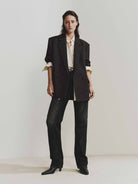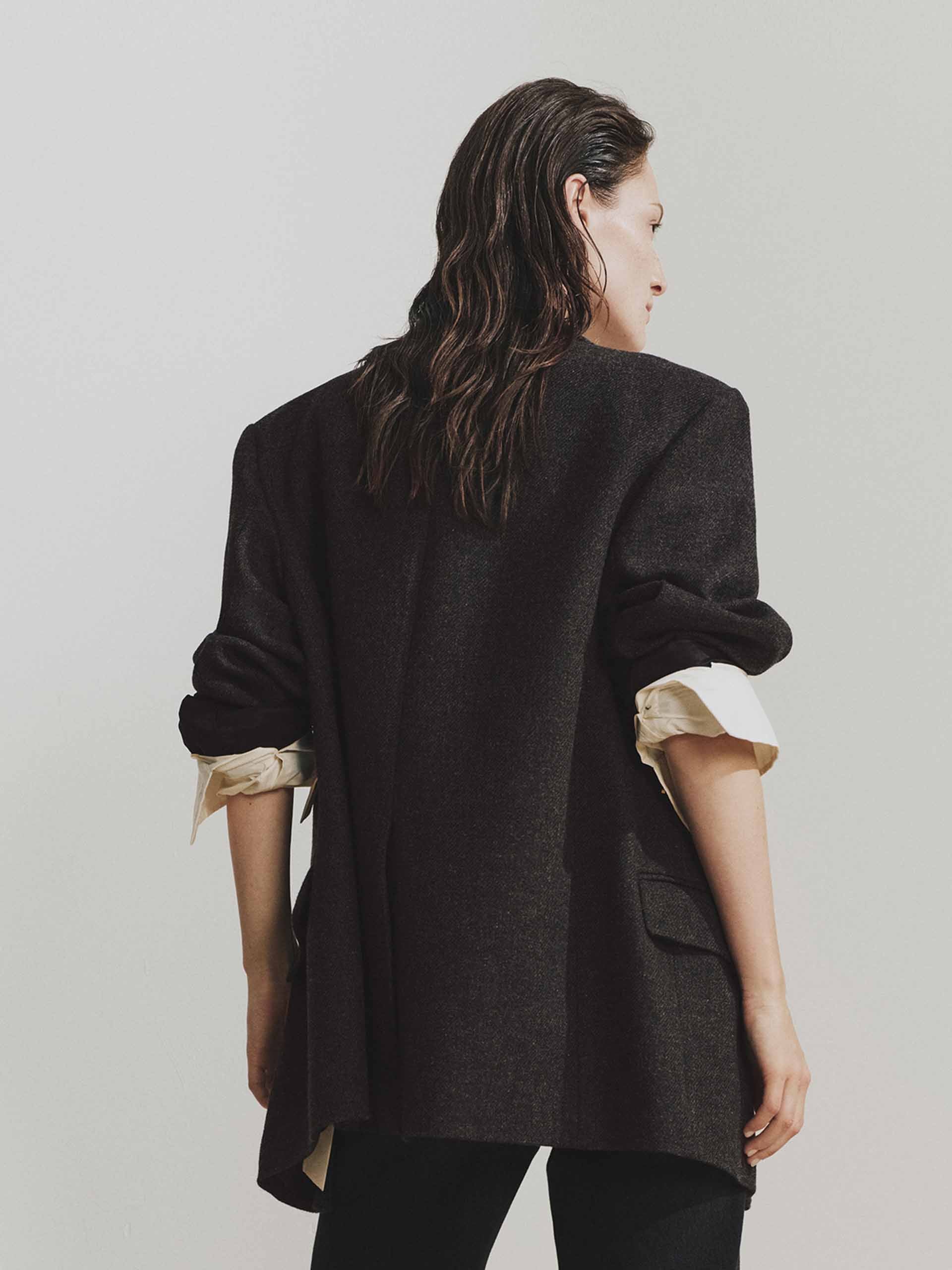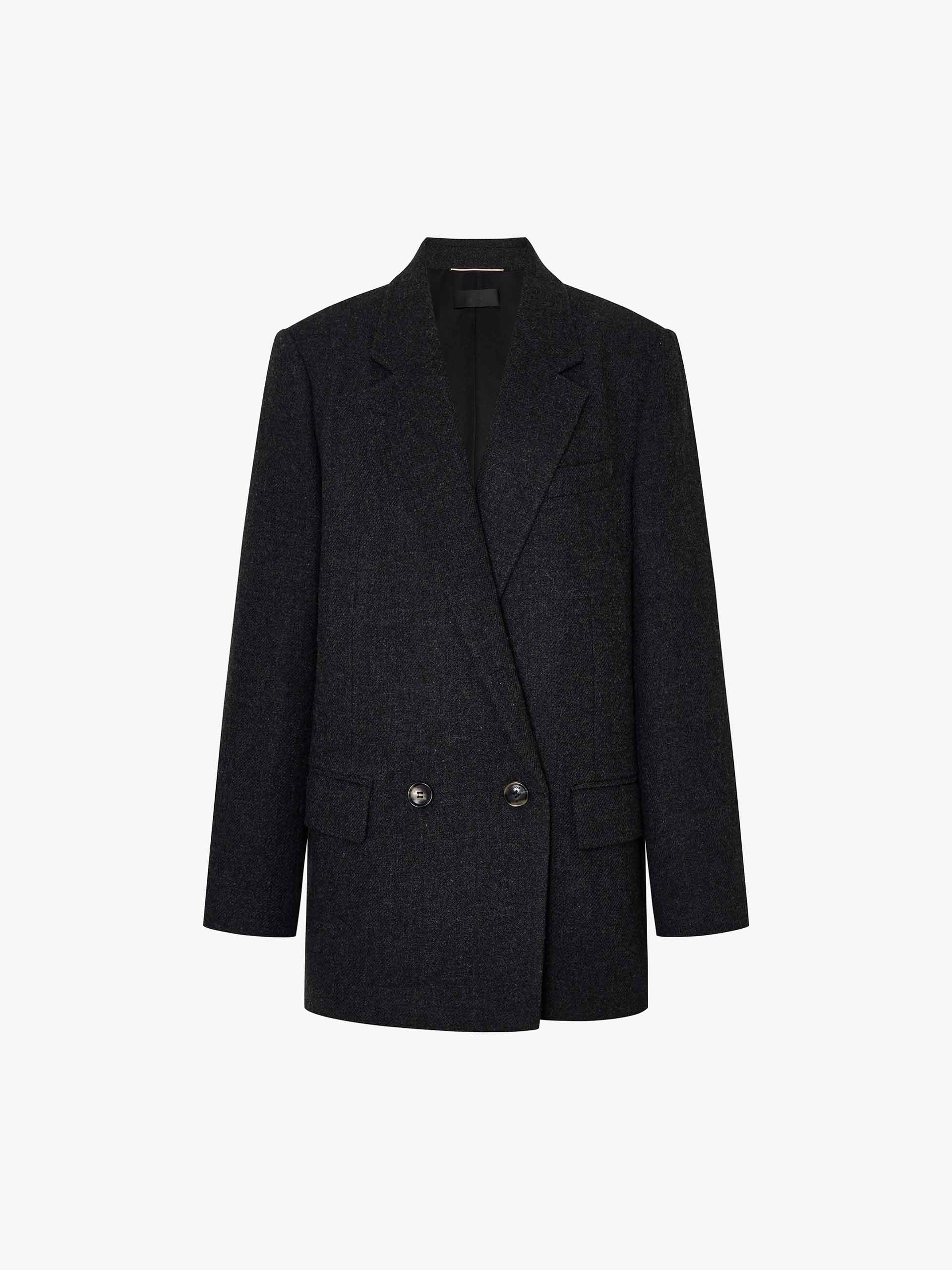 - Classic peak lapel and pad shoulder detail