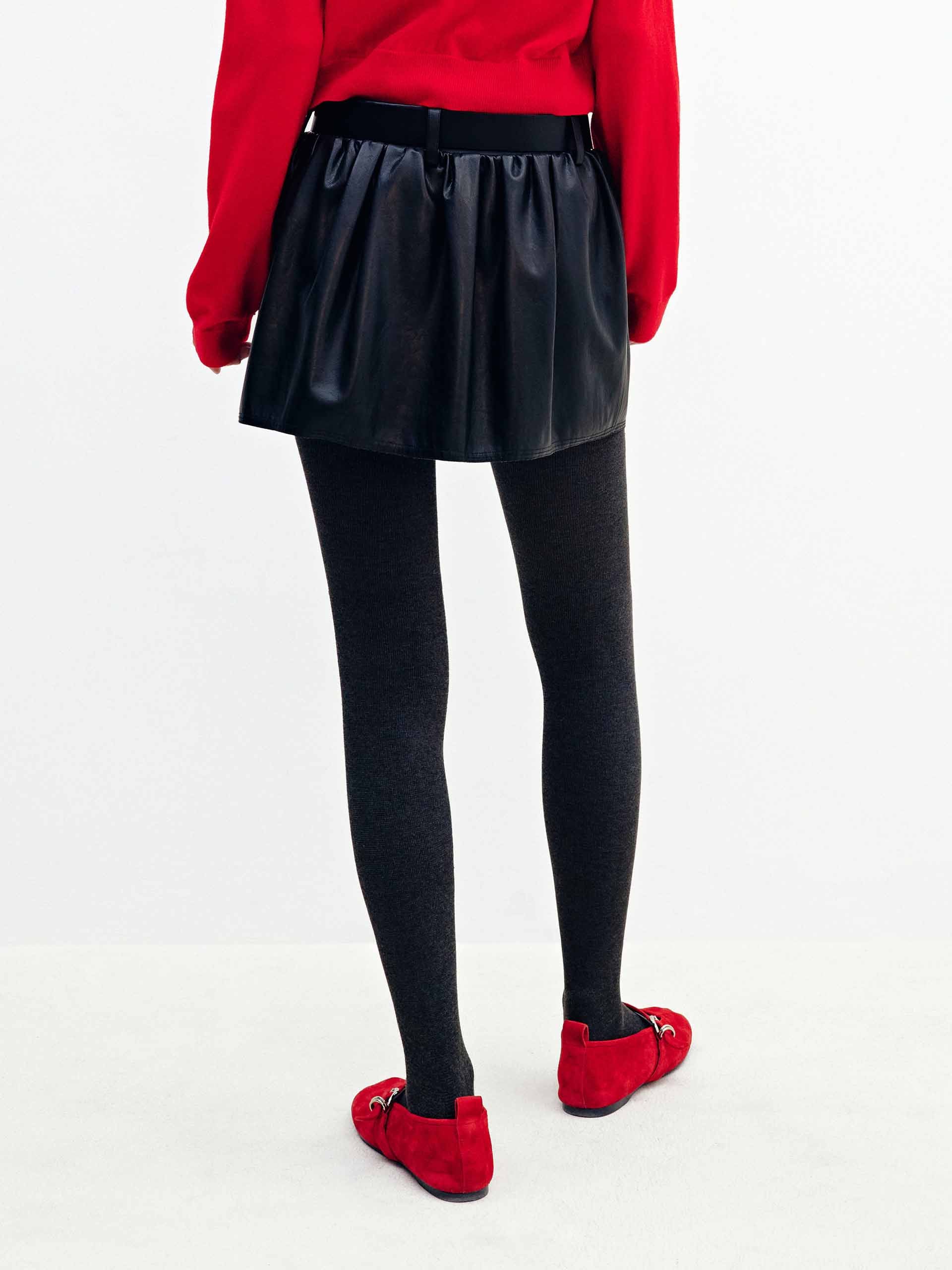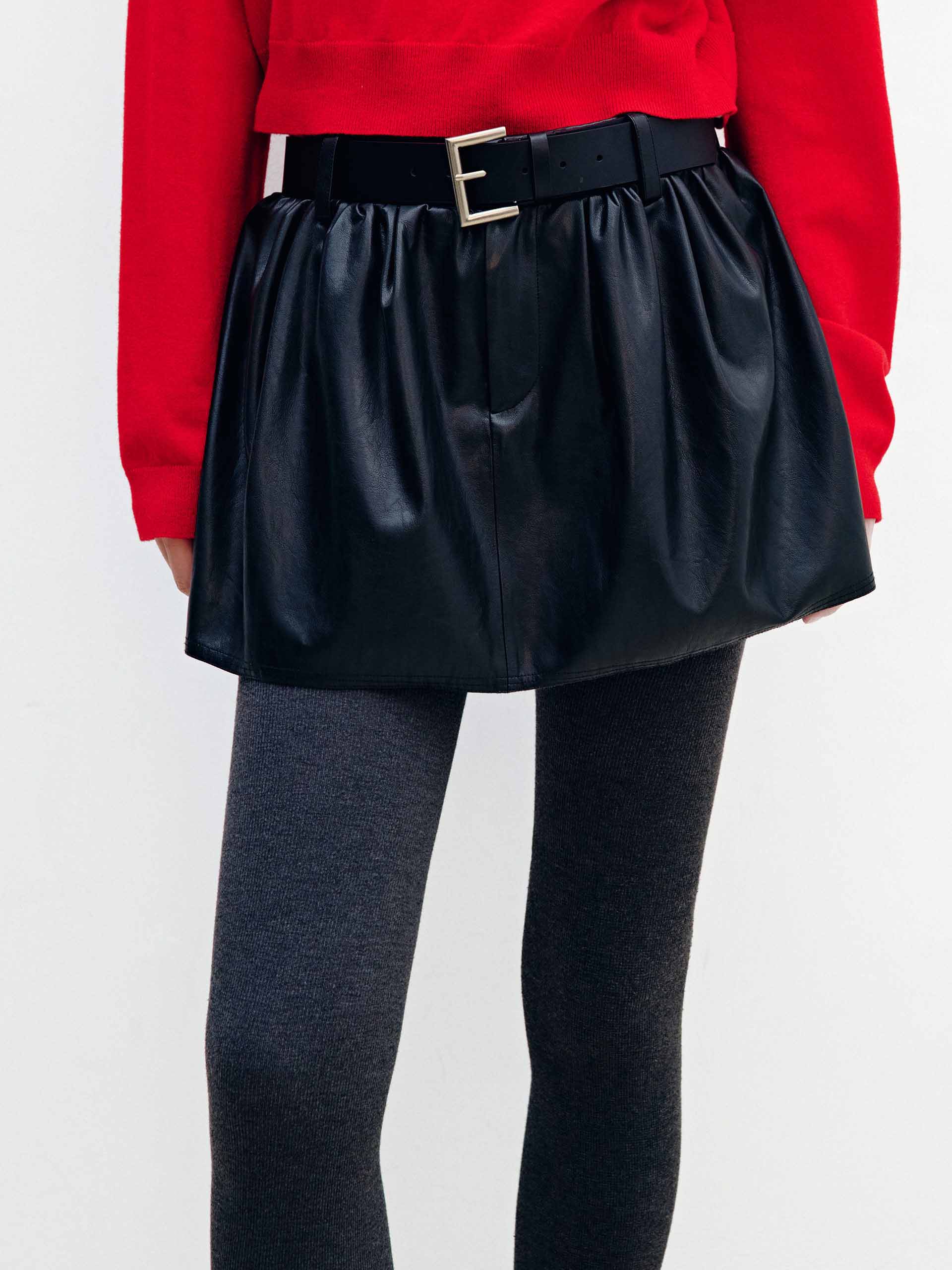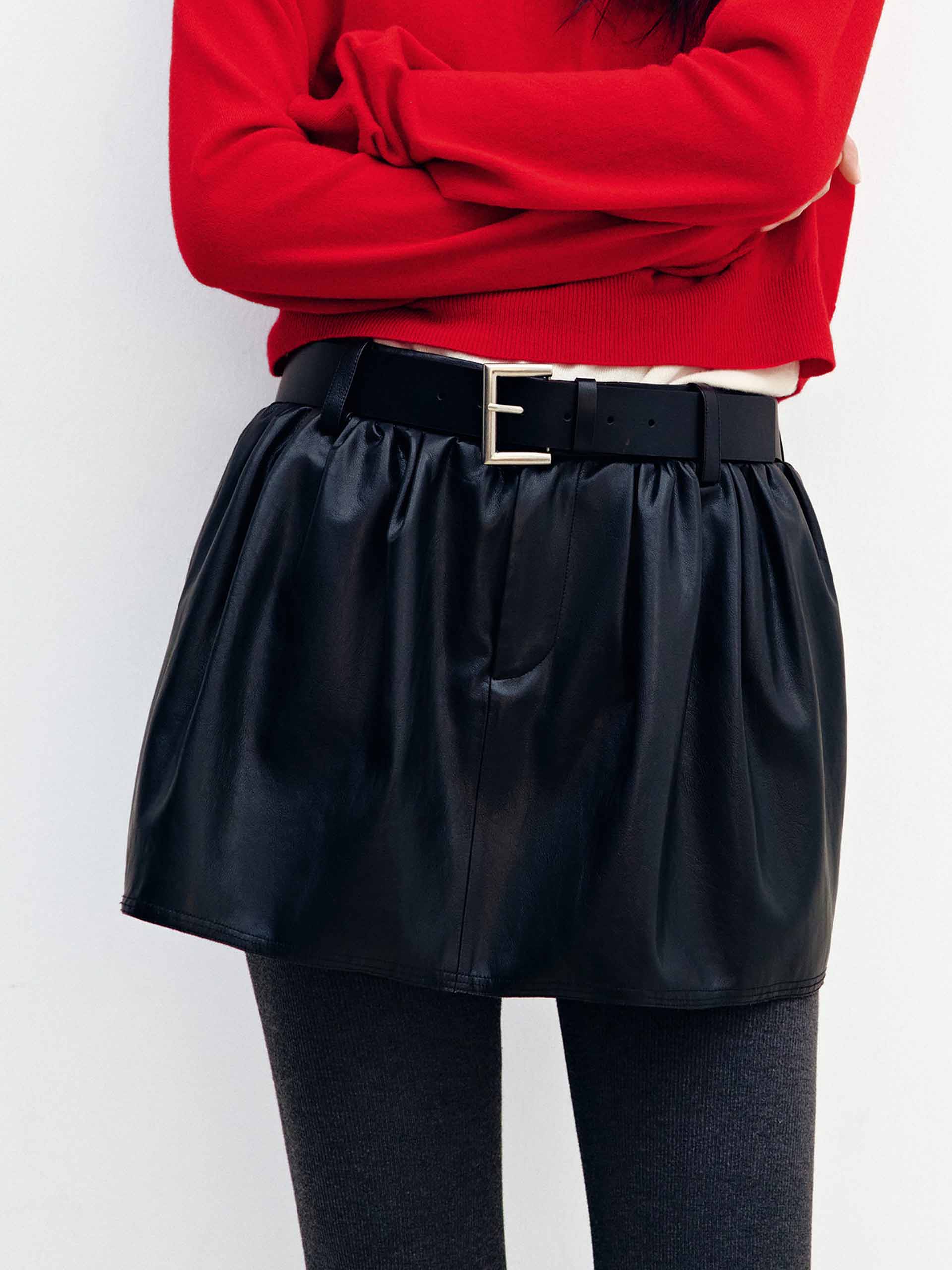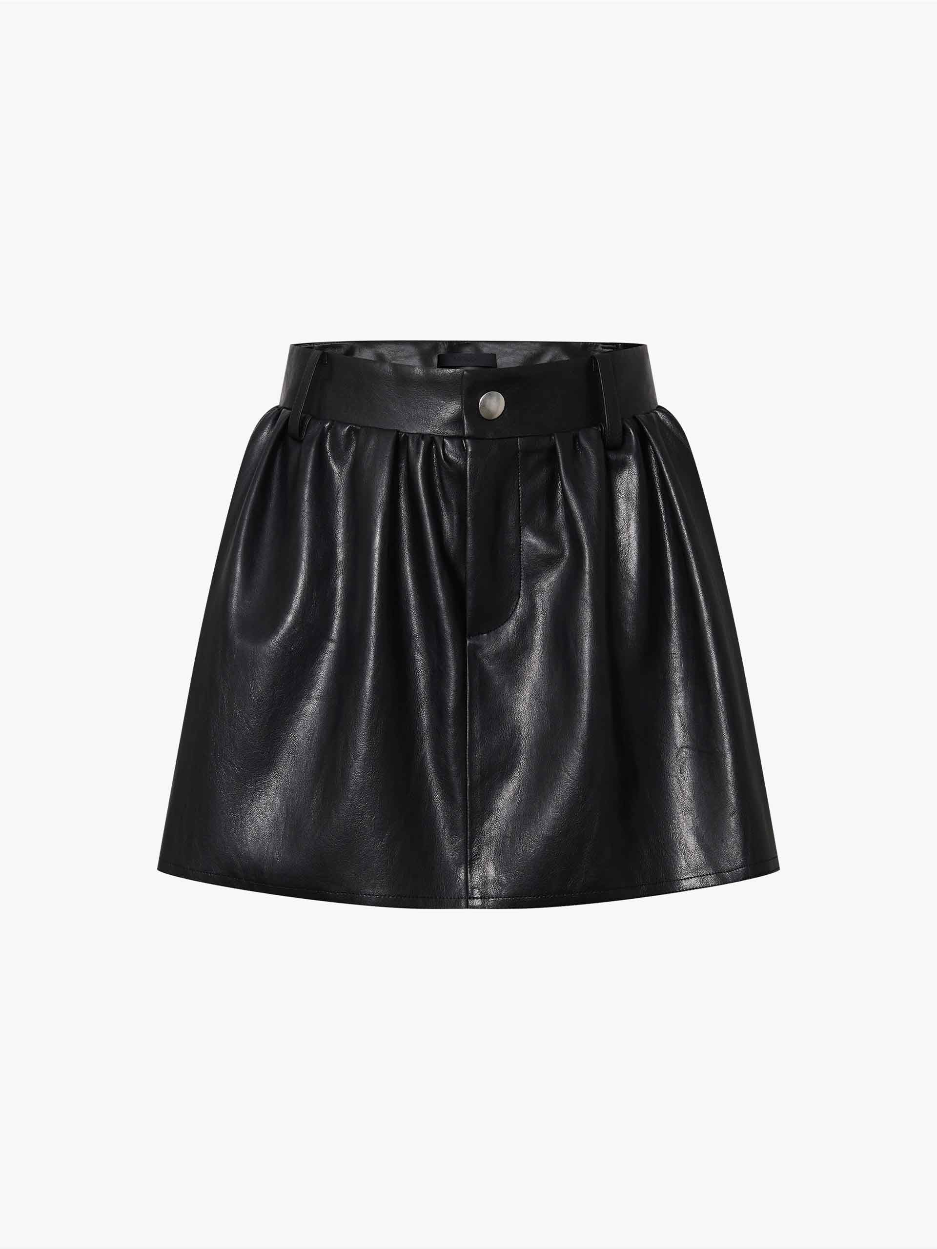 Commanding attention with a sleek silhouette, the skirt is crafted from luxurious PU leather. Its structured A-line cut and mini length are secured with a modern zip-snap button closure. Designed for confident wear, the addition of built-in shorts provides both comfort and ease, making it a bold statement piece for any contemporary wardrobe.