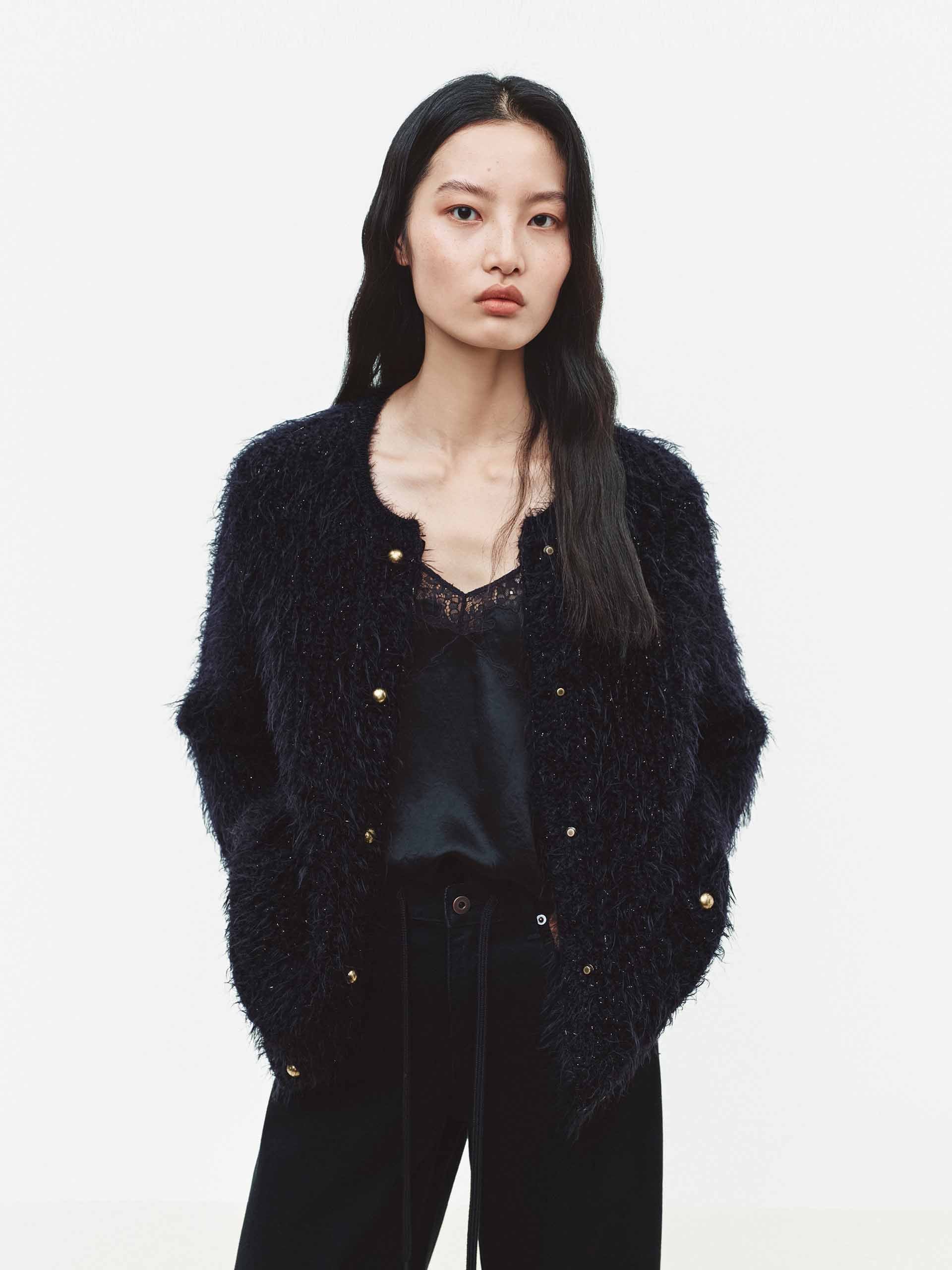 This cardigan is woven from gold and silver threads, its lustrous sheen creating a subtly elegant and sophisticated dark luxury style. The asymmetrical pockets and bronze metal buttons add a touch of casual individuality to any outfit.