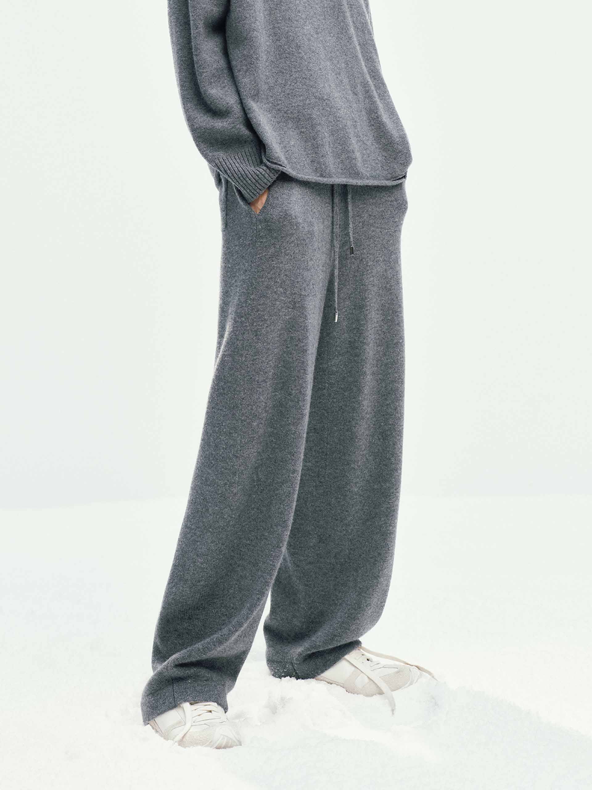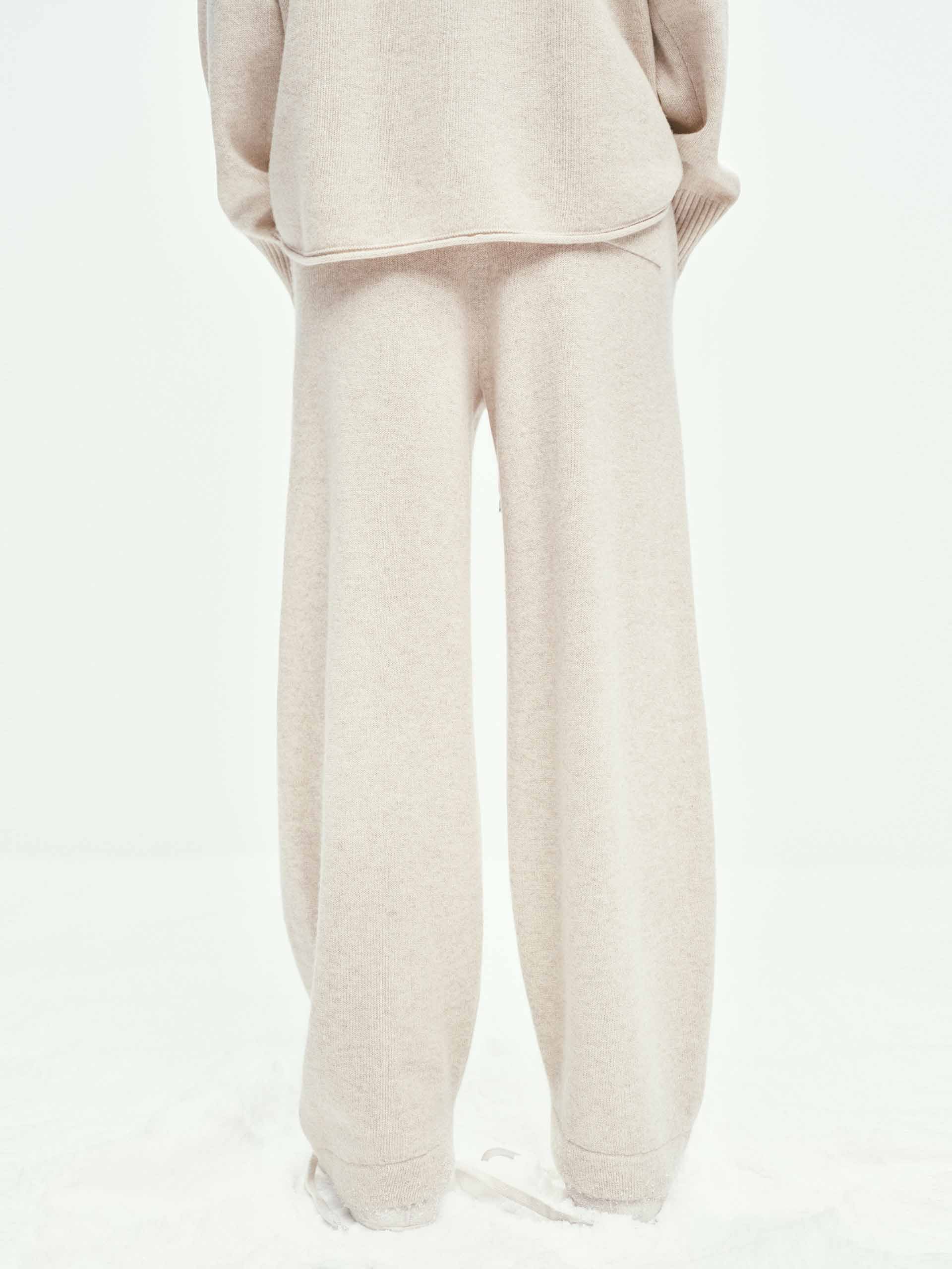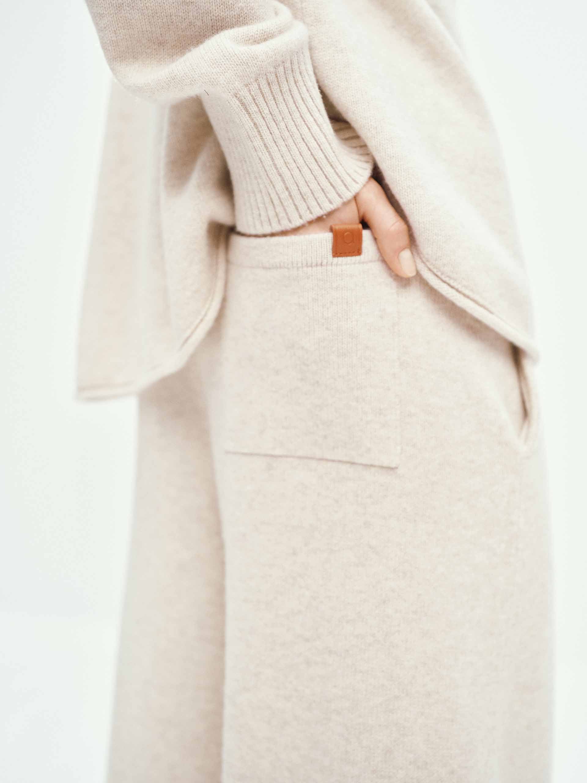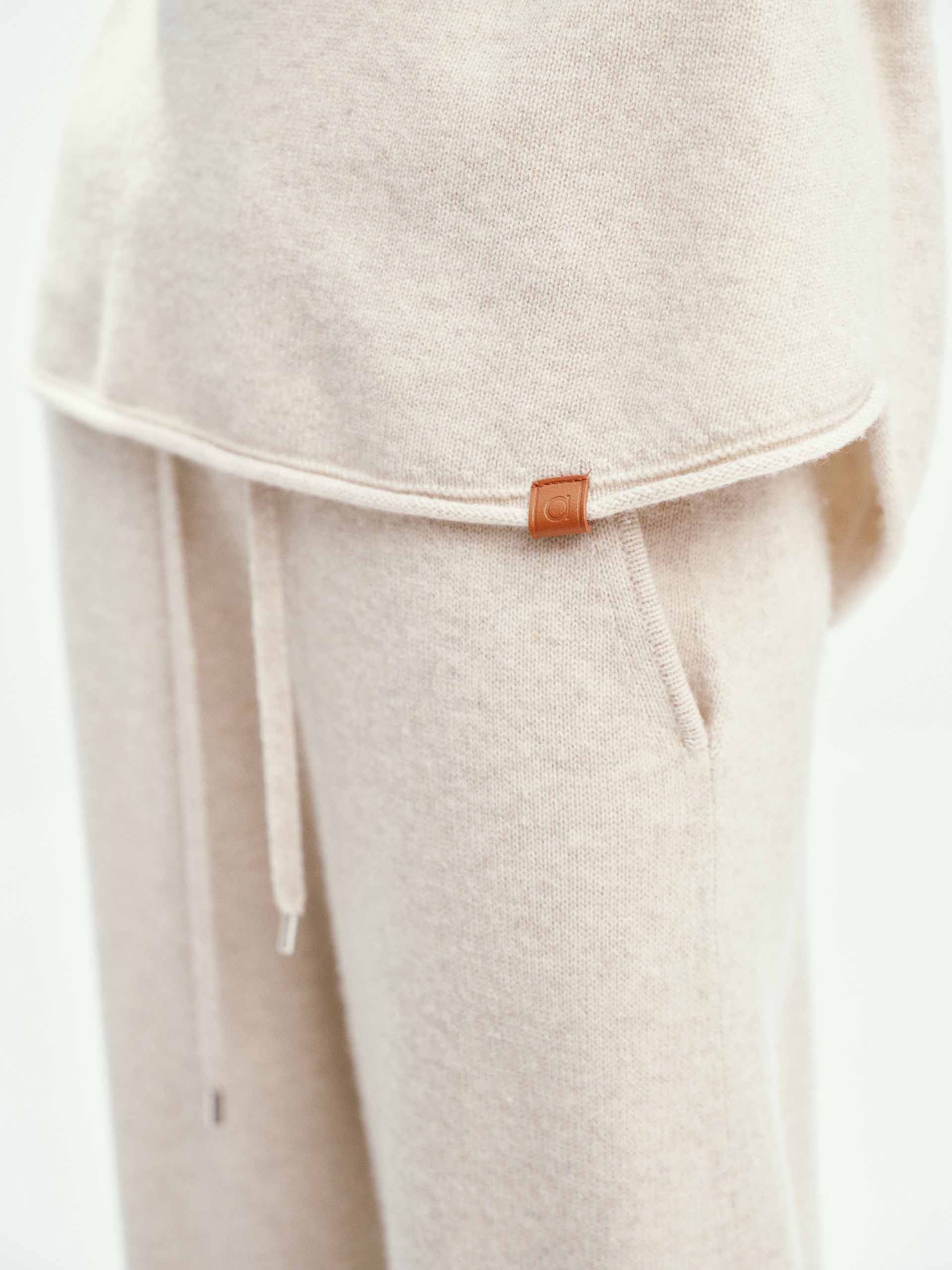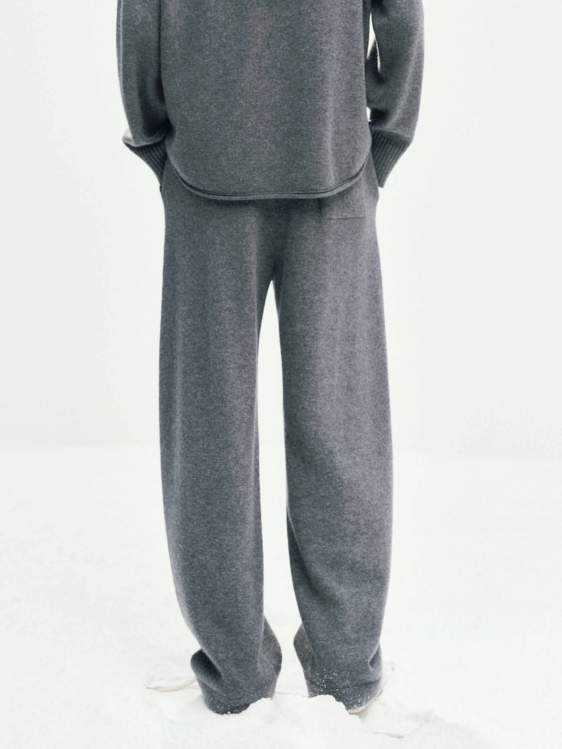 Embrace a bold and architectural silhouette with our trousers. Expertly tailored from a luxurious wool cashmere fabric, they offer both exceptional softness and a structured drape. The design is enhanced with elegant curved seams and practical side pockets, while the elasticated waistband with a drawstring detail ensures all-day comfort and a customizable, polished fit.