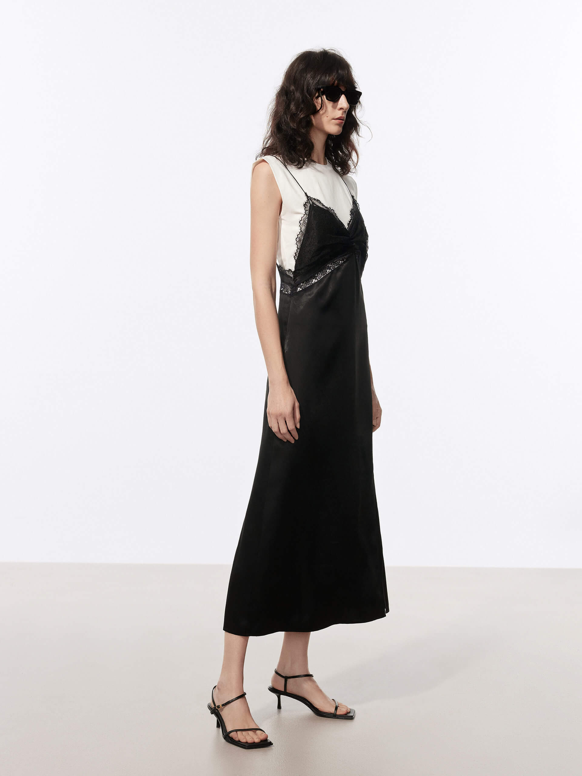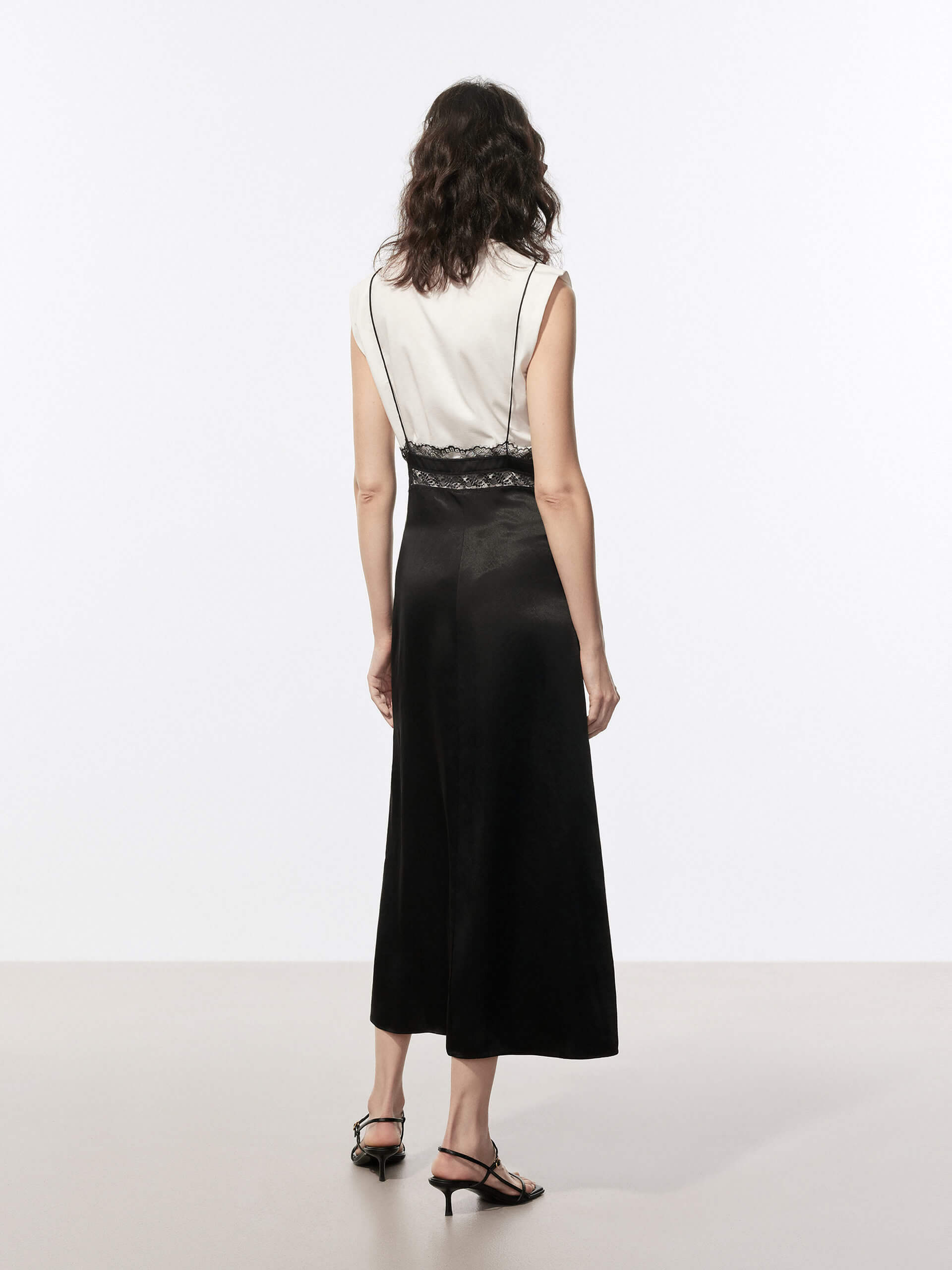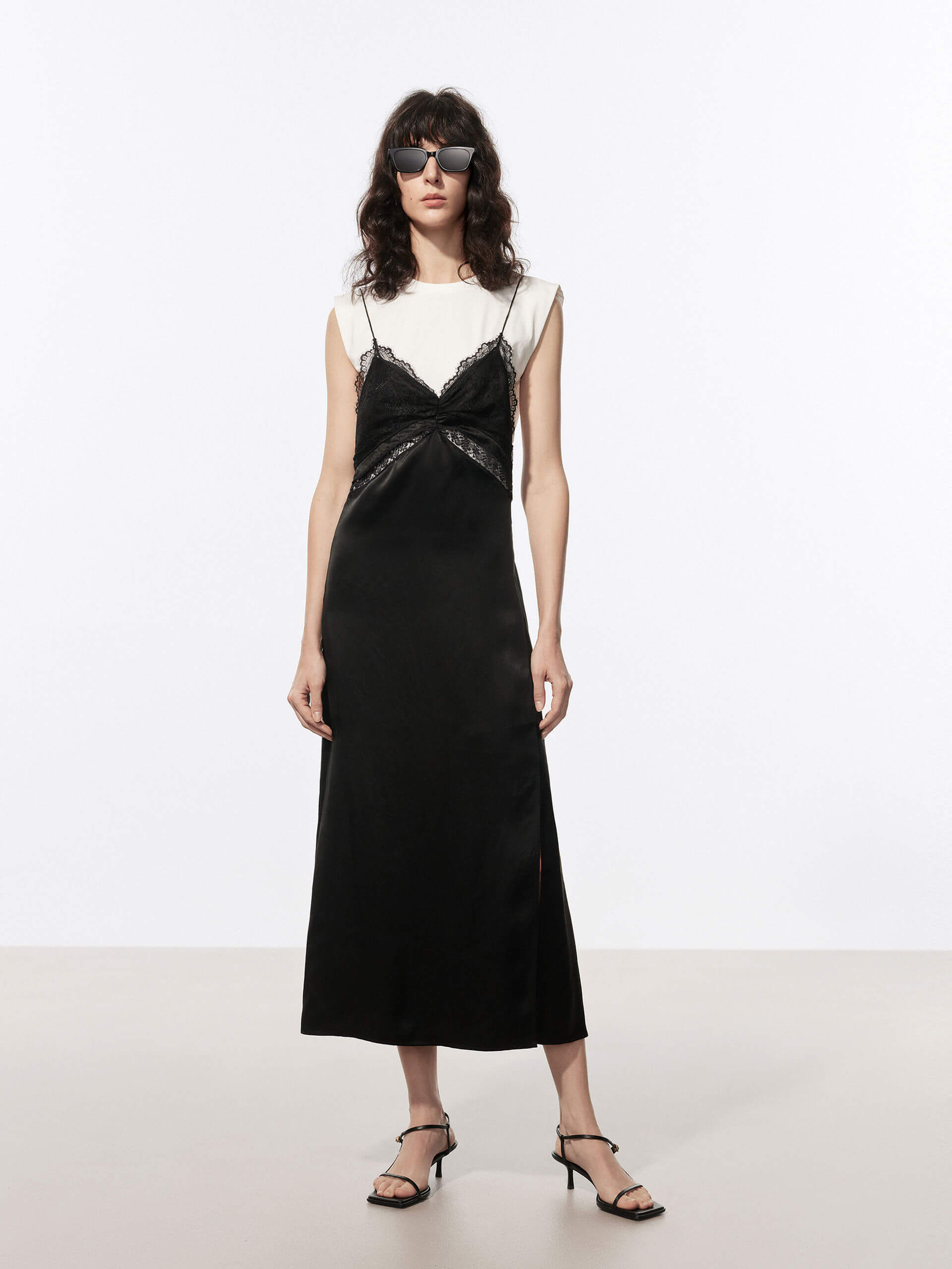 Made from soft and comfortable acetate material, it features a sleek and glossy finish. The side slit design and front lace detailing add a touch of elegance. Complete the look with the included white t-shirt for versatile layering options.