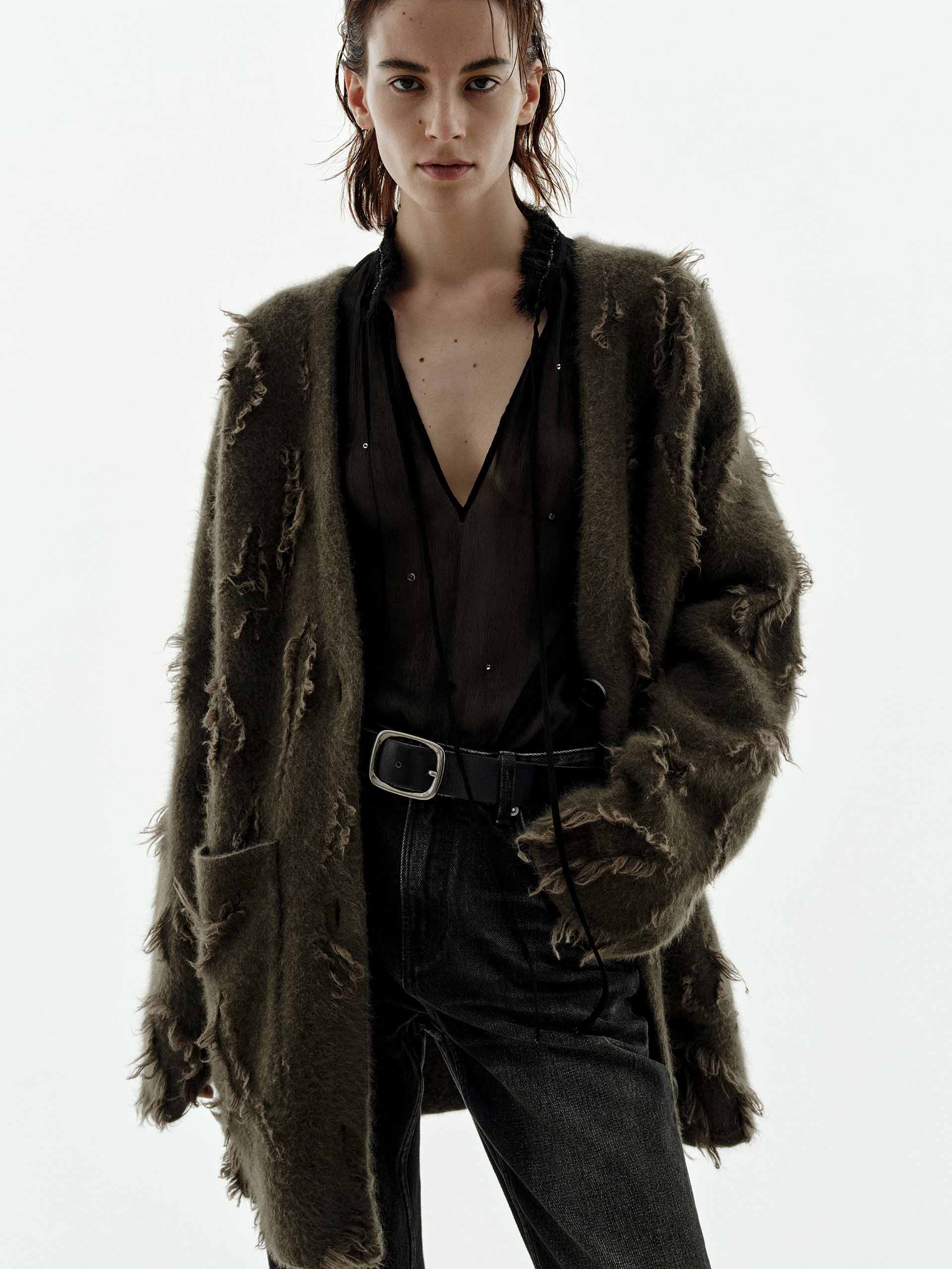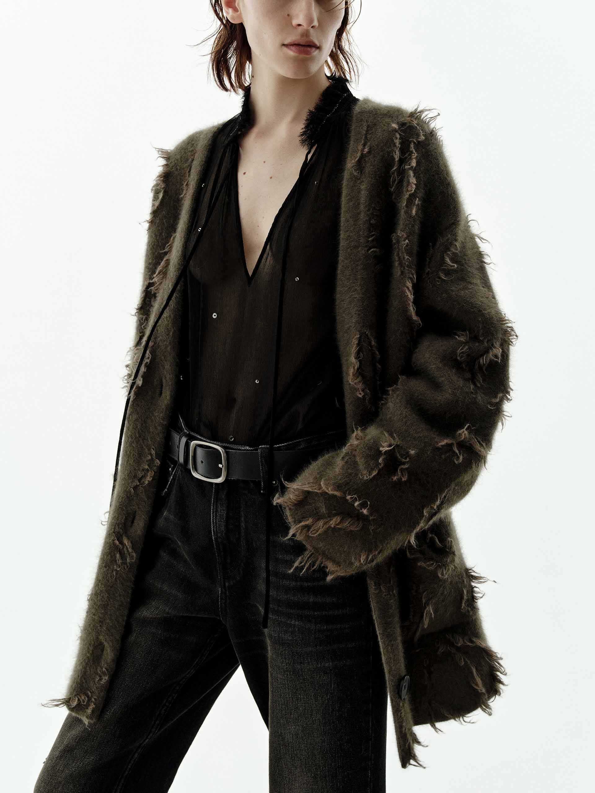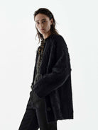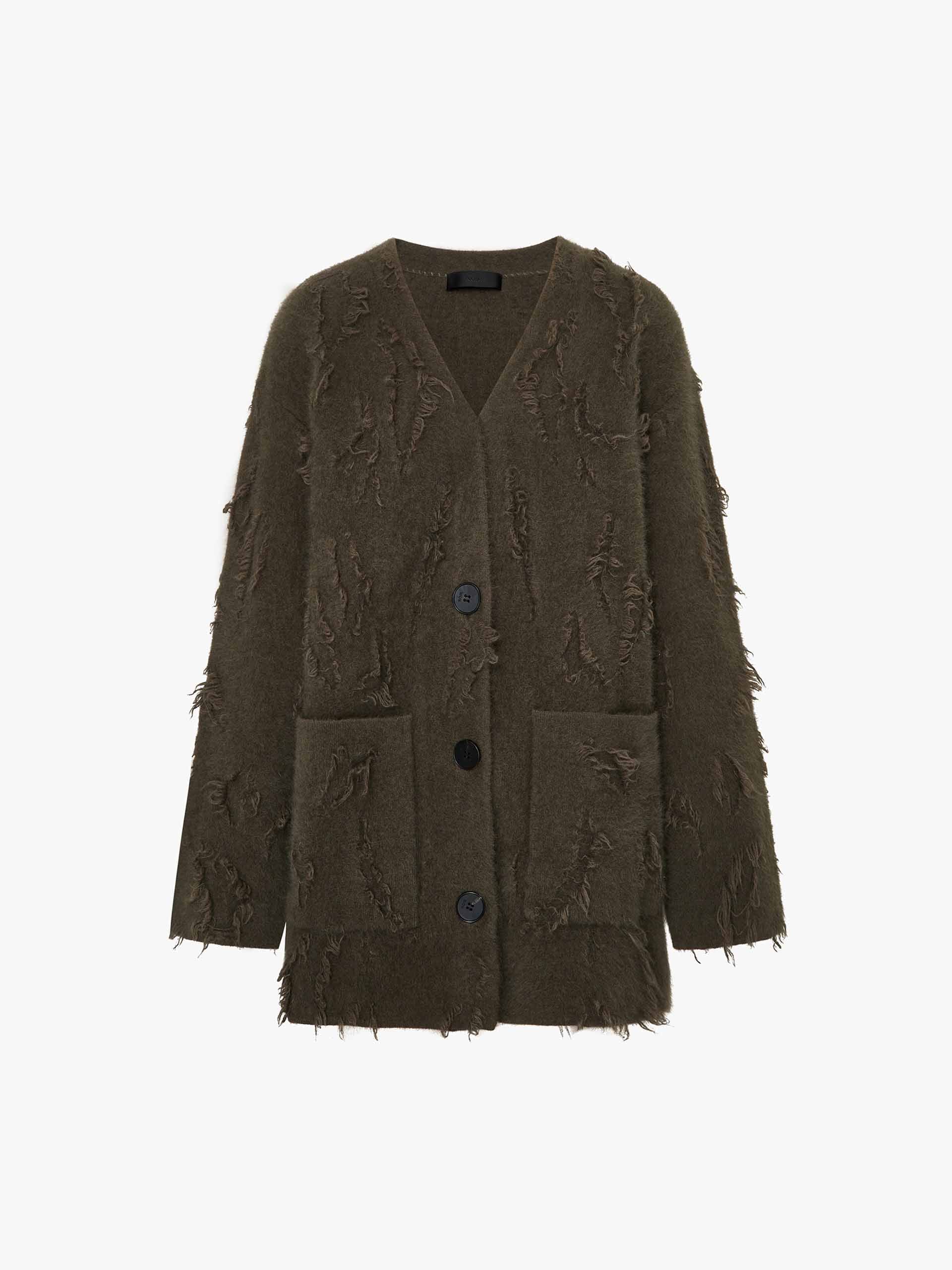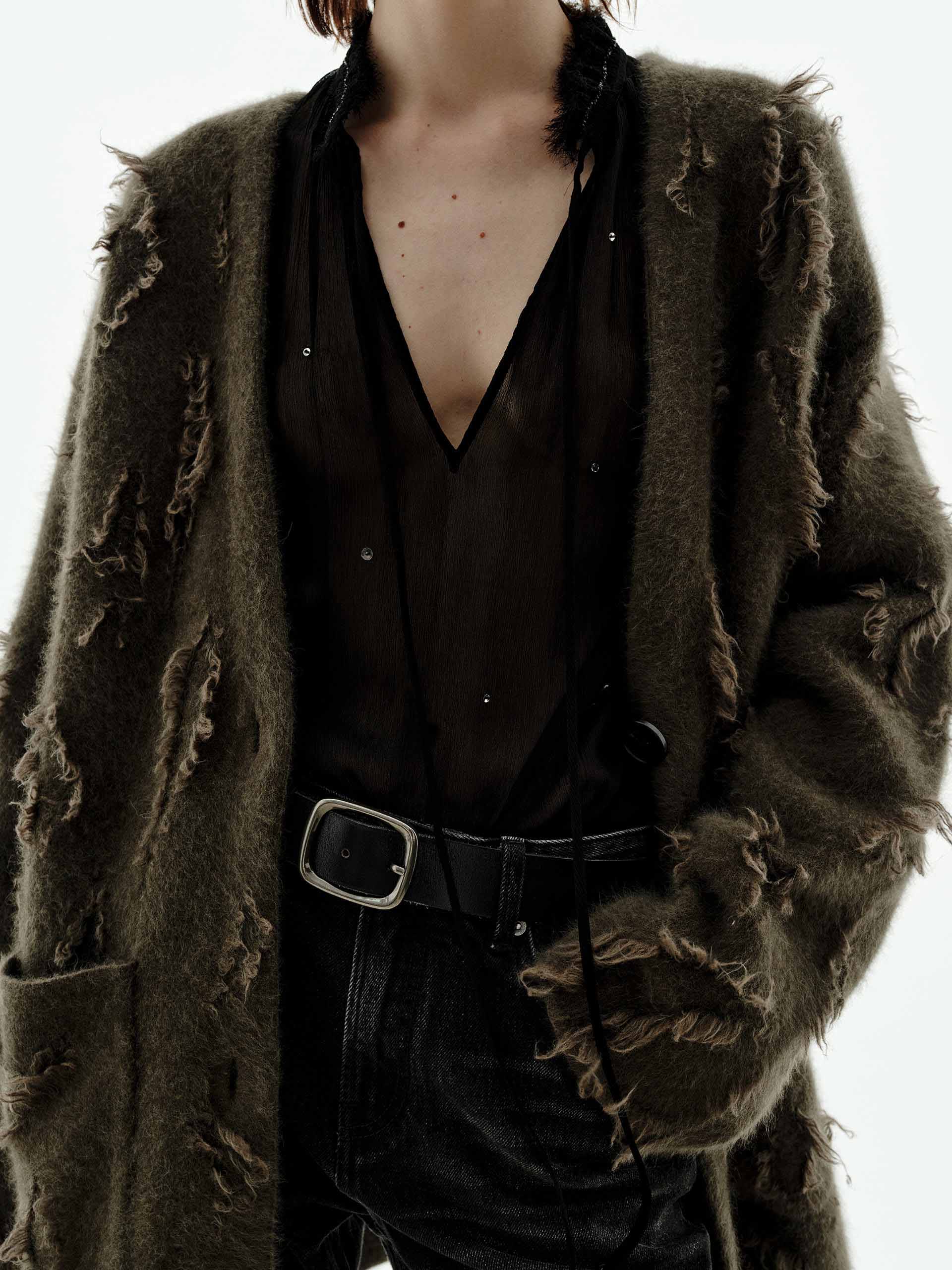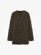 Embrace laid-back sophistication with this cardigan, designed for those who appreciate texture and effortless style. The V-neck and subtle button closure offer versatile styling options, while the raw hem and intentionally frayed tassel details add an edge of artistic imperfection. Functional patch pockets provide practicality without compromising the garment’s free-spirited vibe.