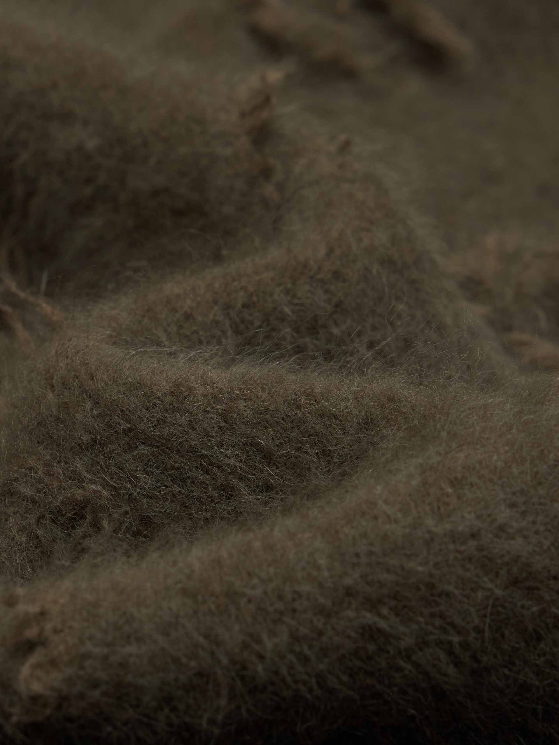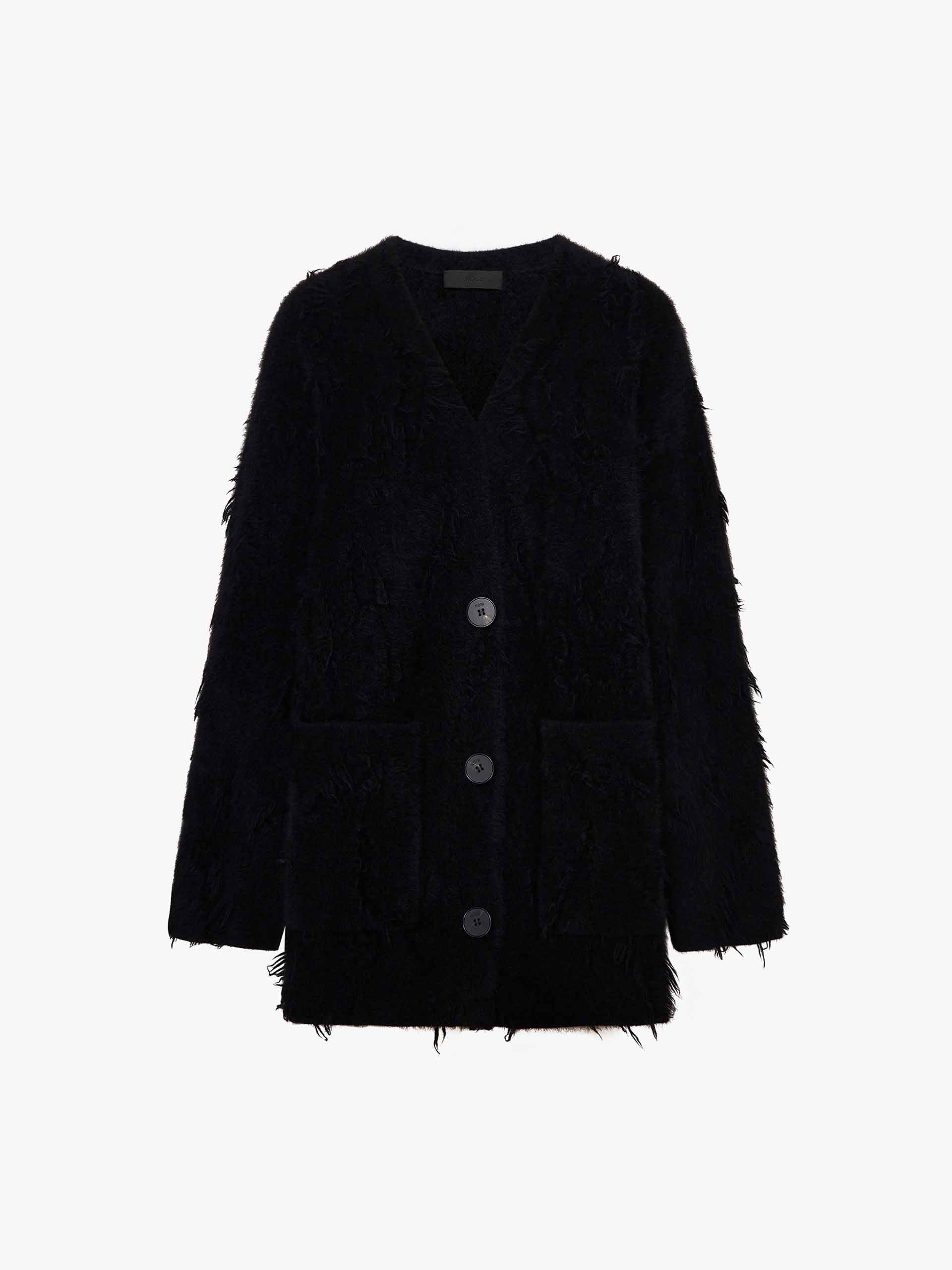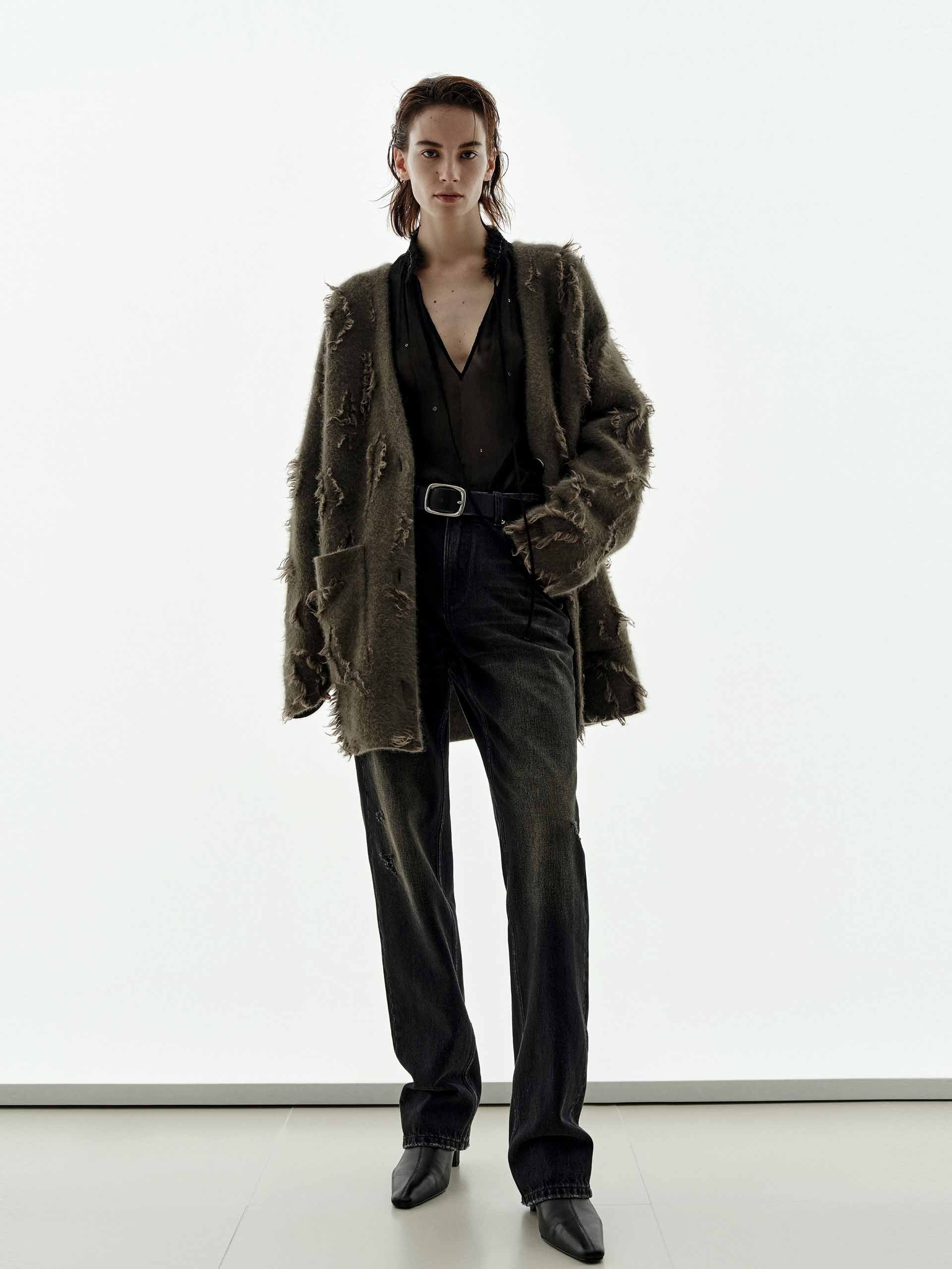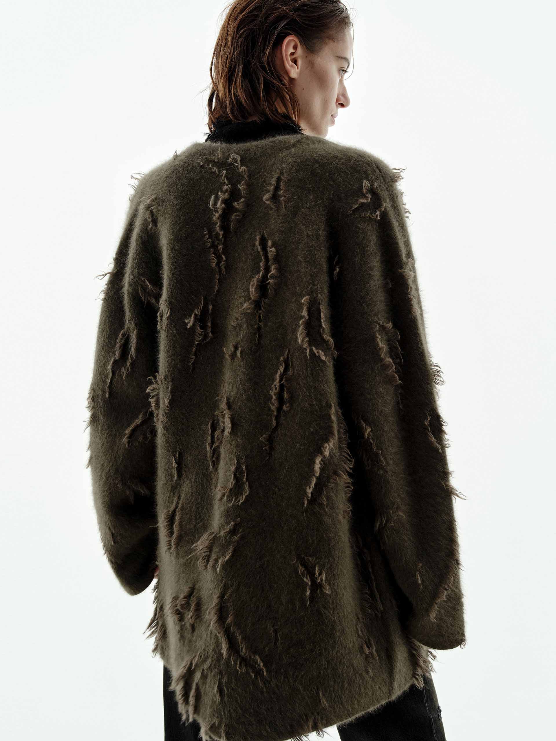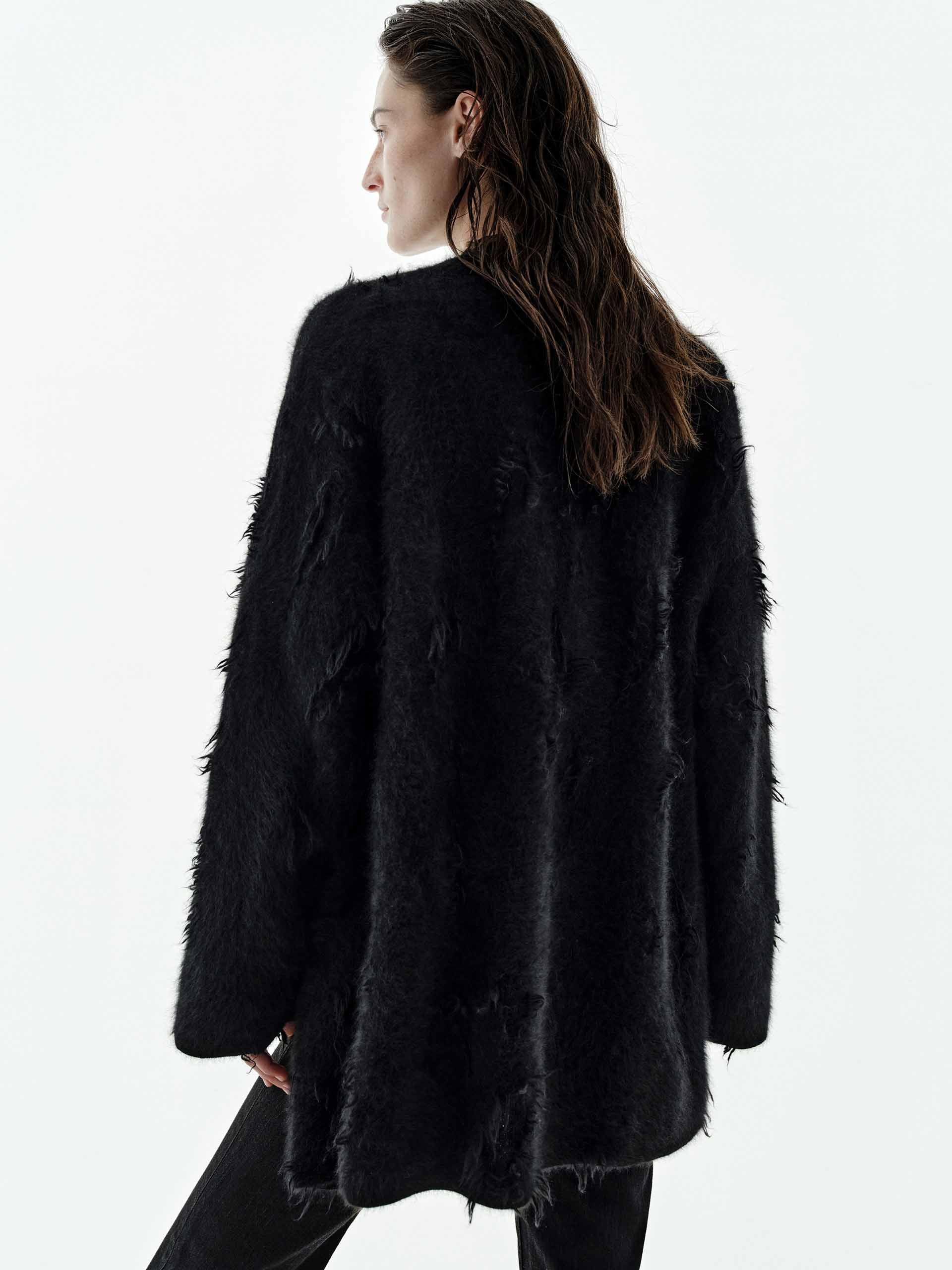 Embrace laid-back sophistication with this cardigan, designed for those who appreciate texture and effortless style. The V-neck and subtle button closure offer versatile styling options, while the raw hem and intentionally frayed tassel details add an edge of artistic imperfection. Functional patch pockets provide practicality without compromising the garment’s free-spirited vibe.