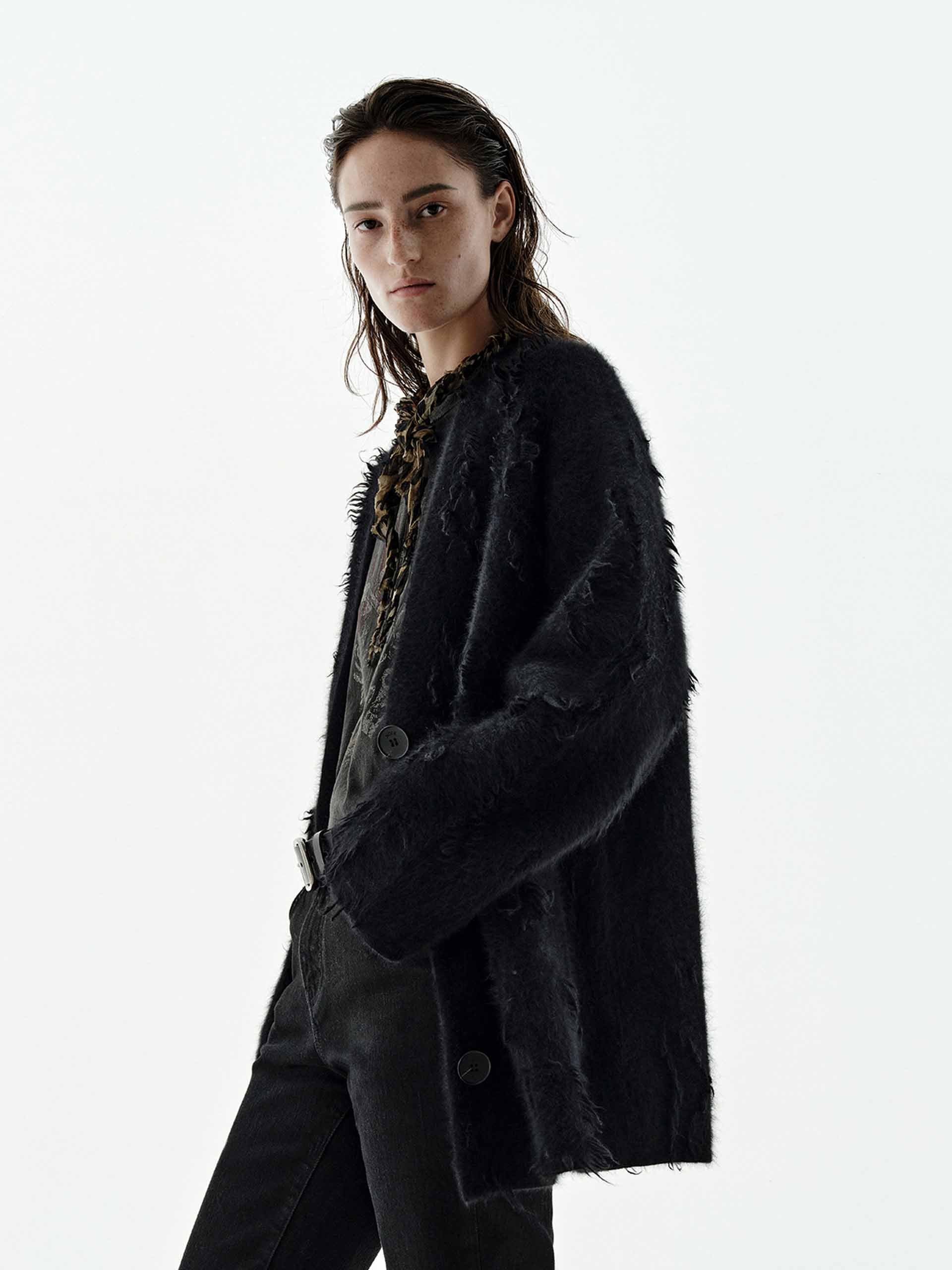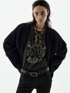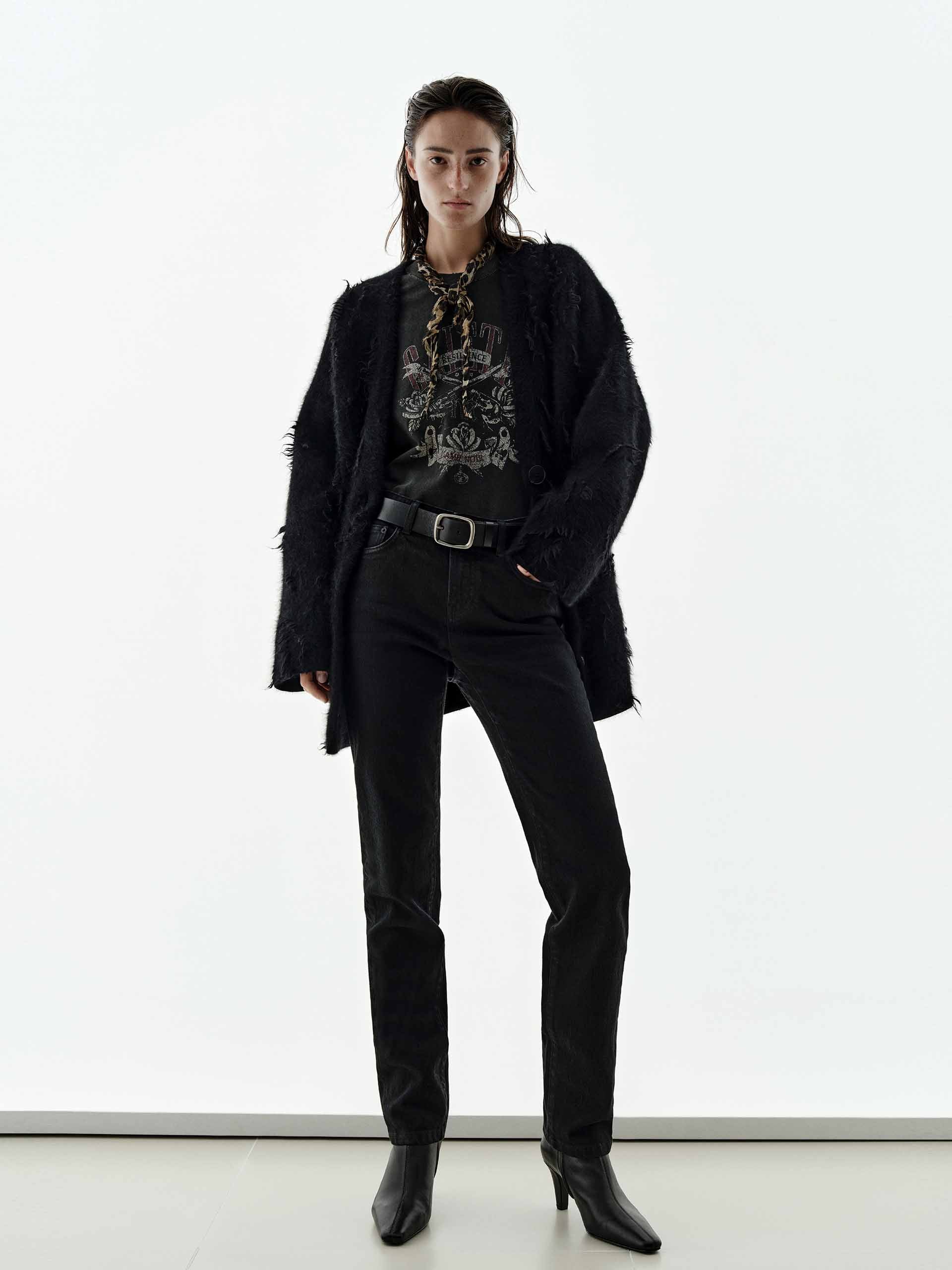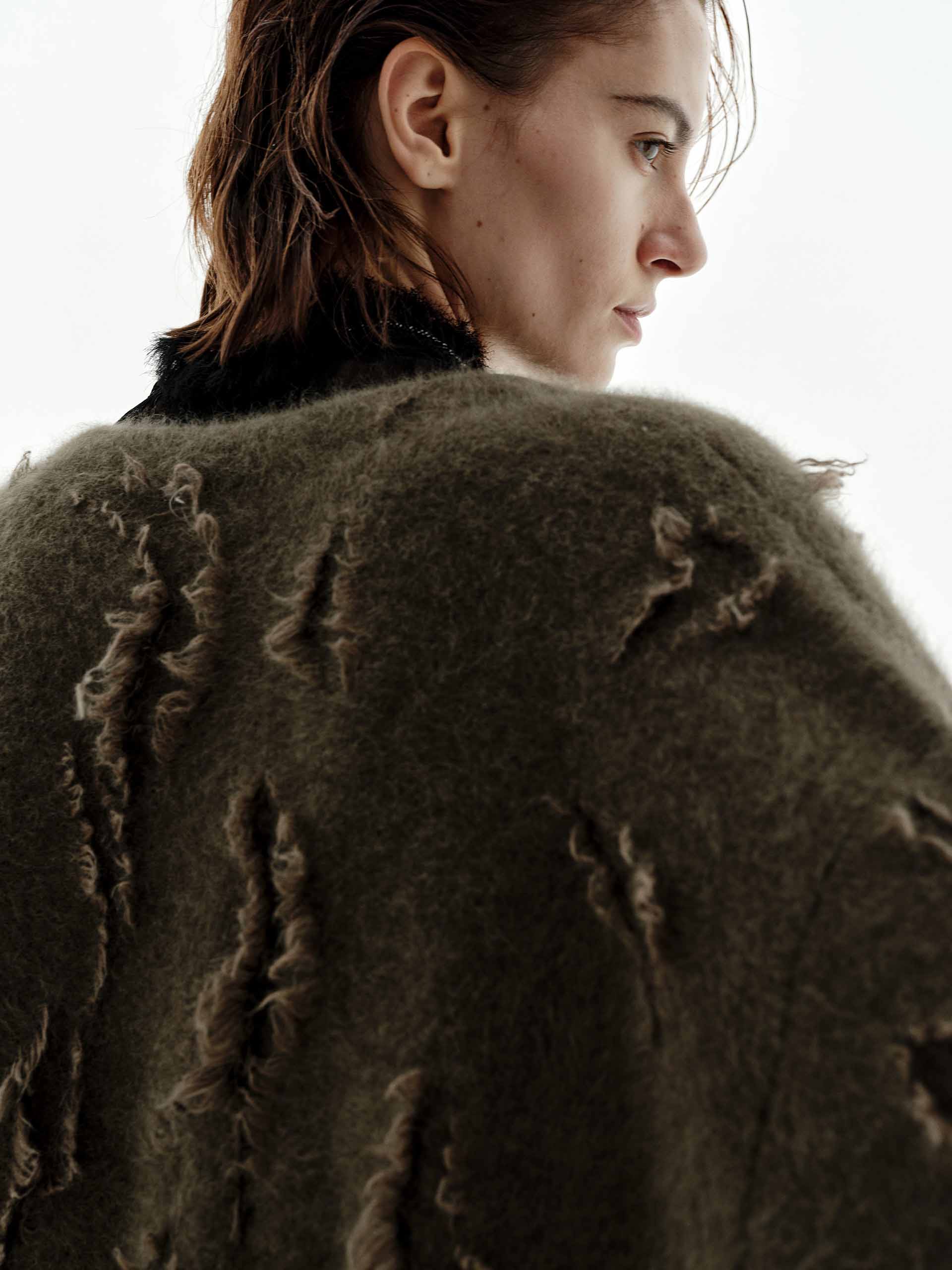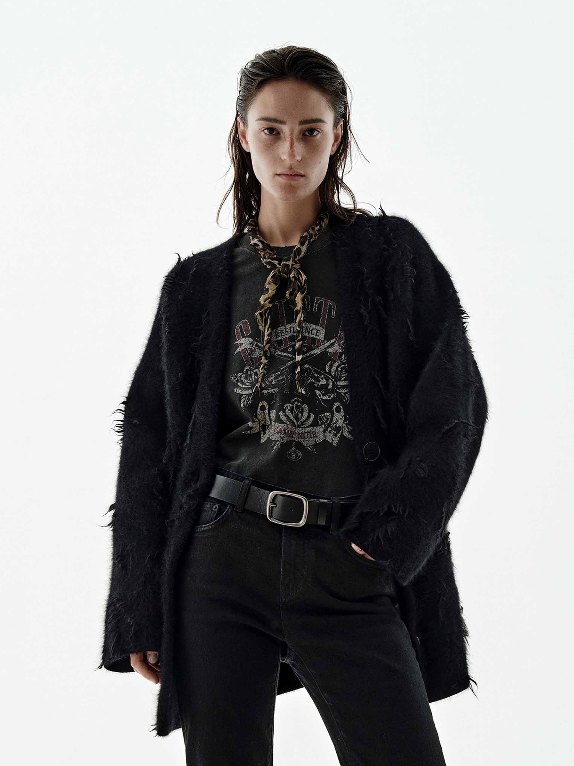 Embrace laid-back sophistication with this cardigan, designed for those who appreciate texture and effortless style. The V-neck and subtle button closure offer versatile styling options, while the raw hem and intentionally frayed tassel details add an edge of artistic imperfection. Functional patch pockets provide practicality without compromising the garment’s free-spirited vibe.