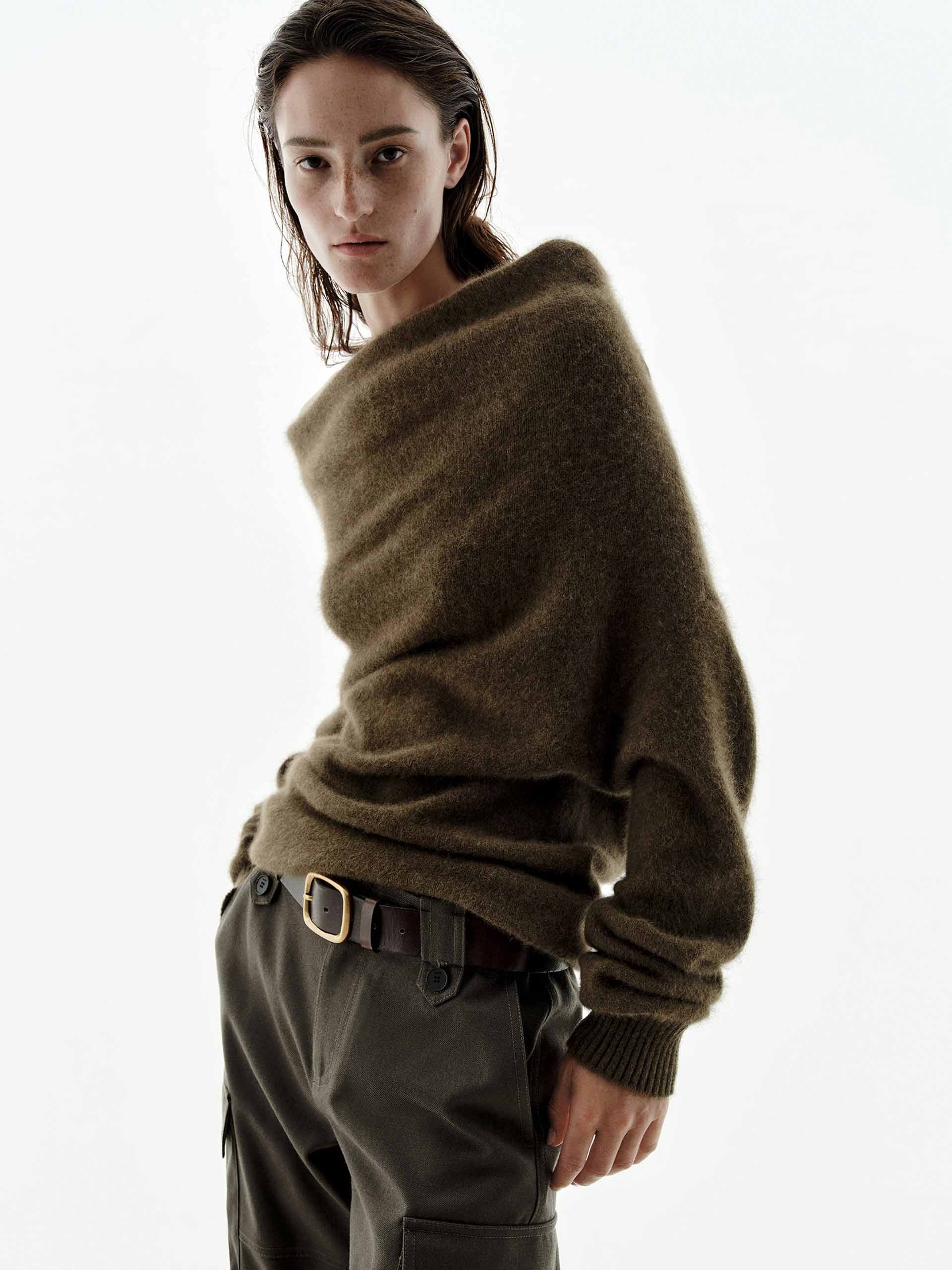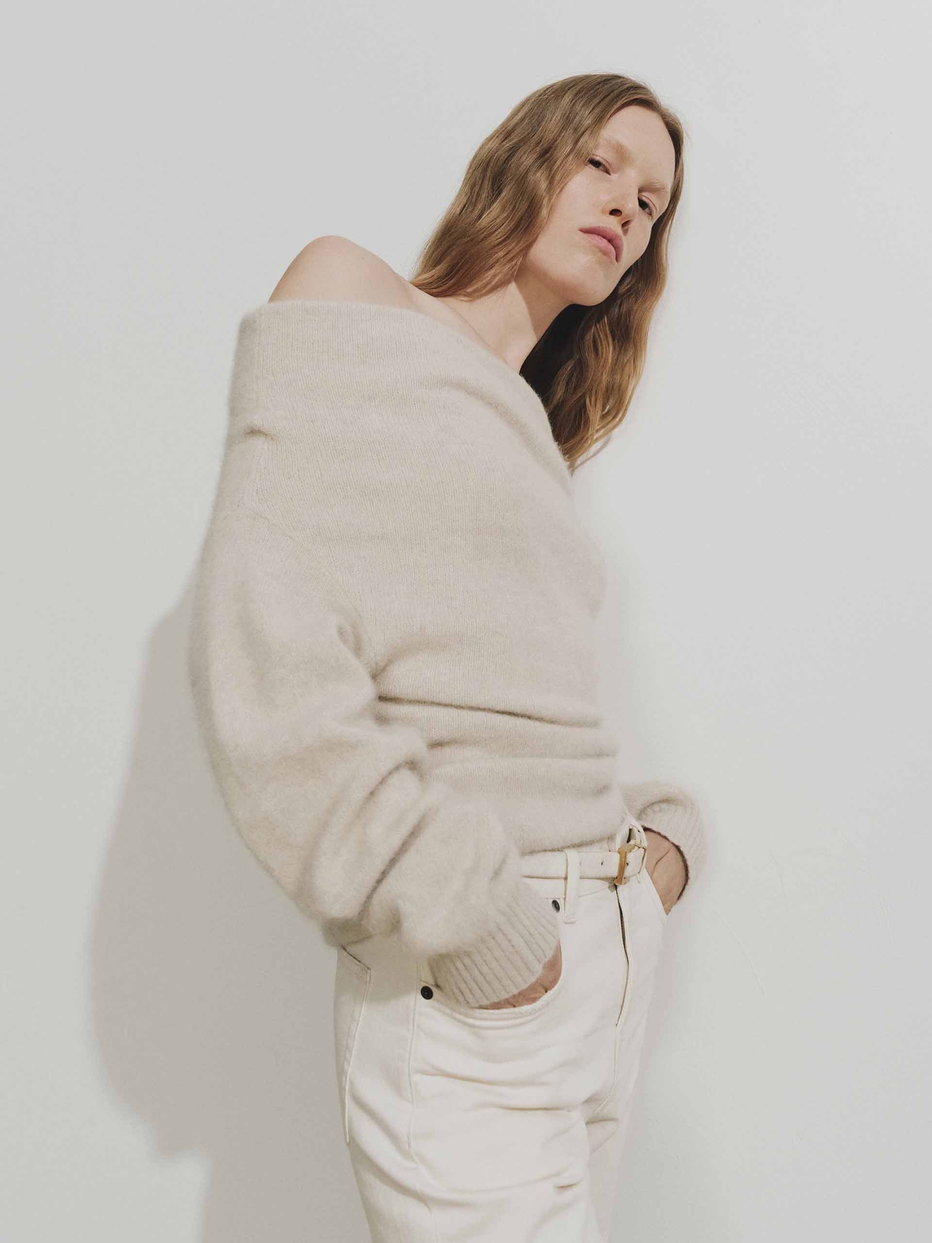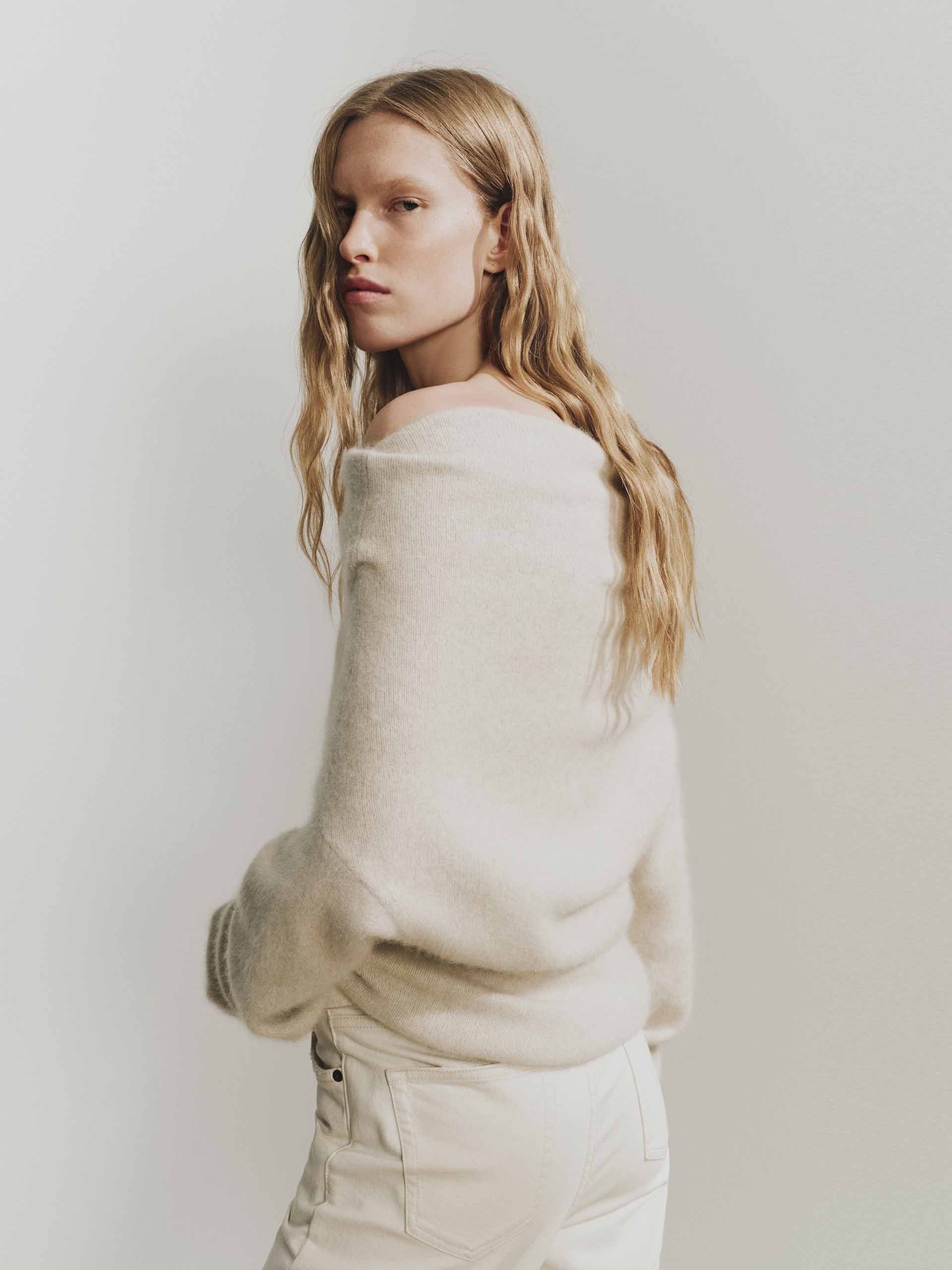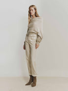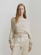 Indulge in understated luxury with our sweater. The chic off-shoulder neckline offers a subtle yet sophisticated touch, allowing for versatile styling, while the delicate ribbed trim adds structure and refinement to the cuffs and hem. Exquisitely made from 100% warm cashmere fabric, making it an essential and indulgent piece for your cold-weather wardrobe.