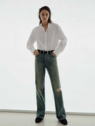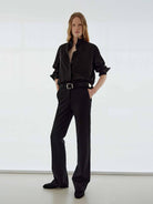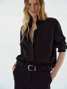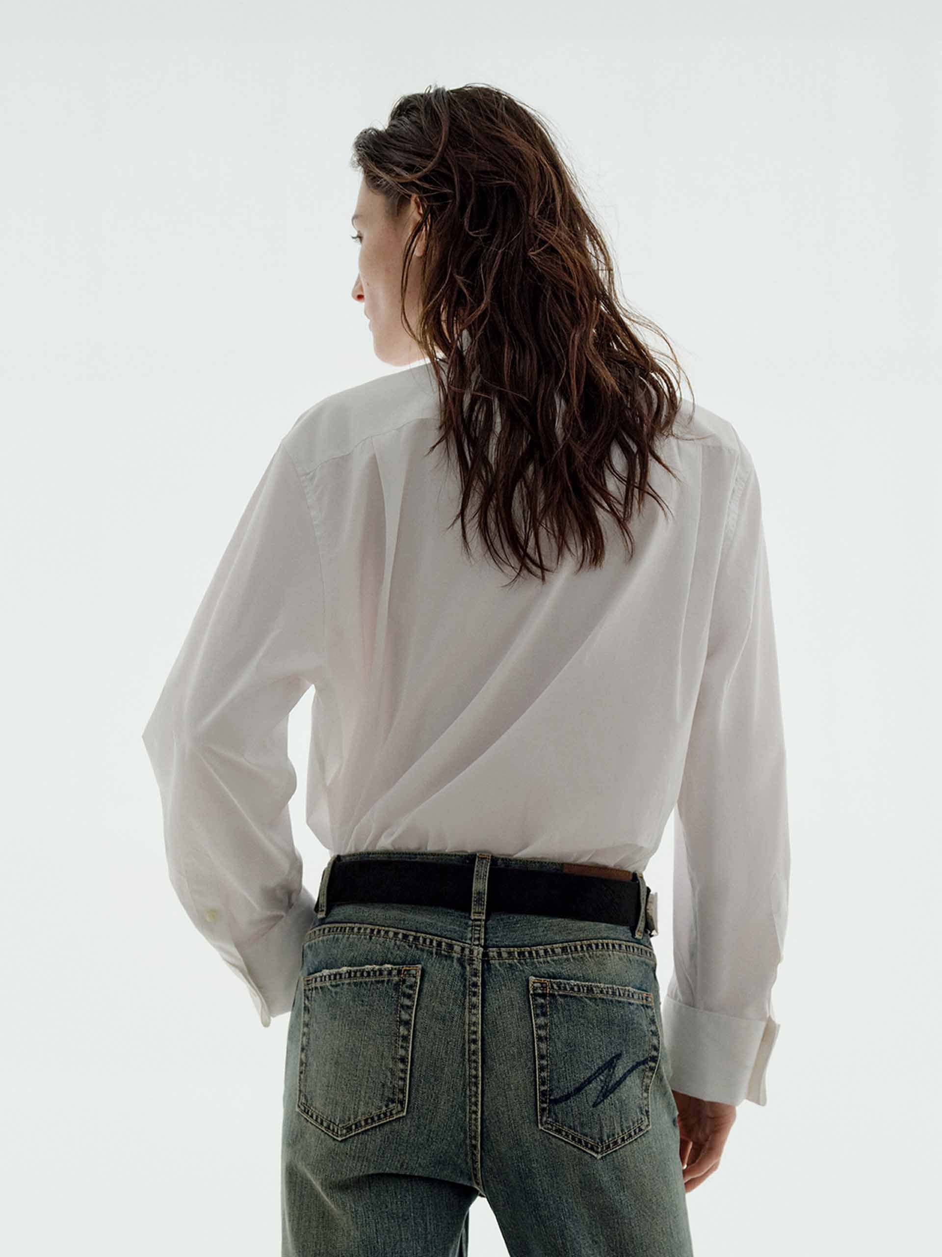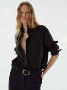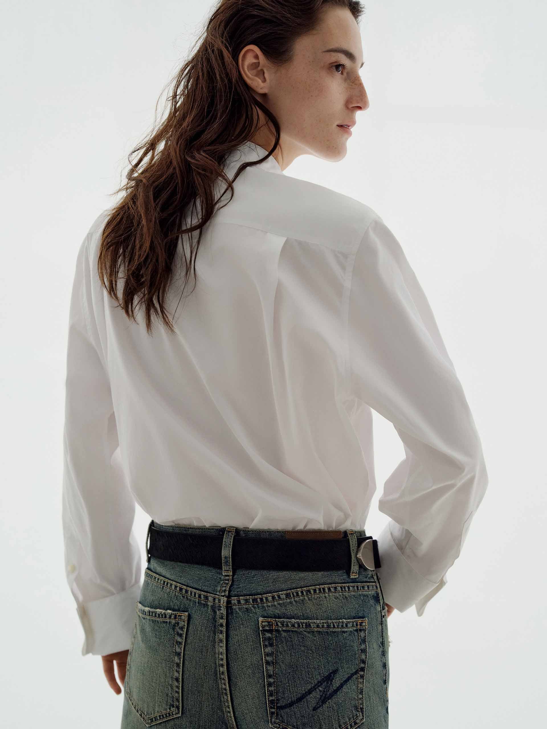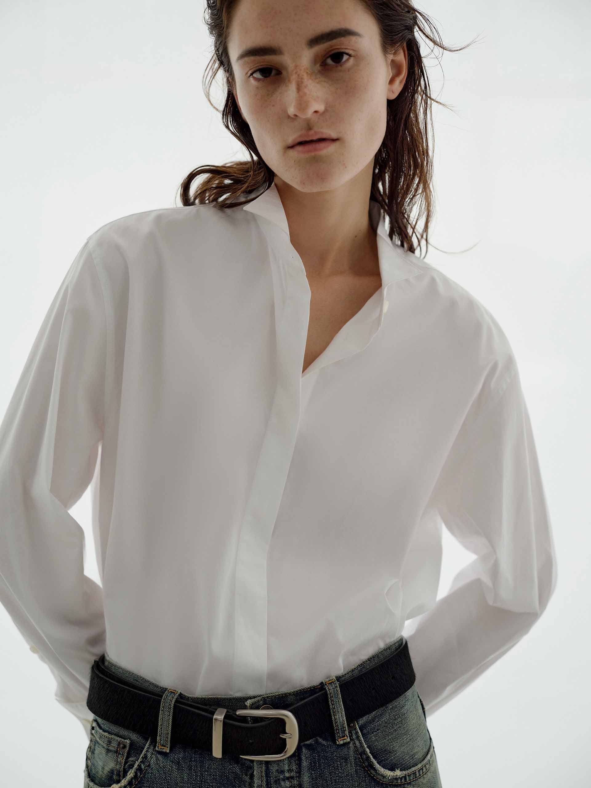 Sophistication meets subtle innovation in this shirt, where classic tailoring gets a contemporary update. The regular fit provides a polished yet comfortable silhouette, while the refined wing collar adds a touch of formal elegance. The back pleating ensures graceful movement and a flattering drape, while the discreet hidden button closure creates a sleek, uninterrupted line for a minimalist aesthetic.