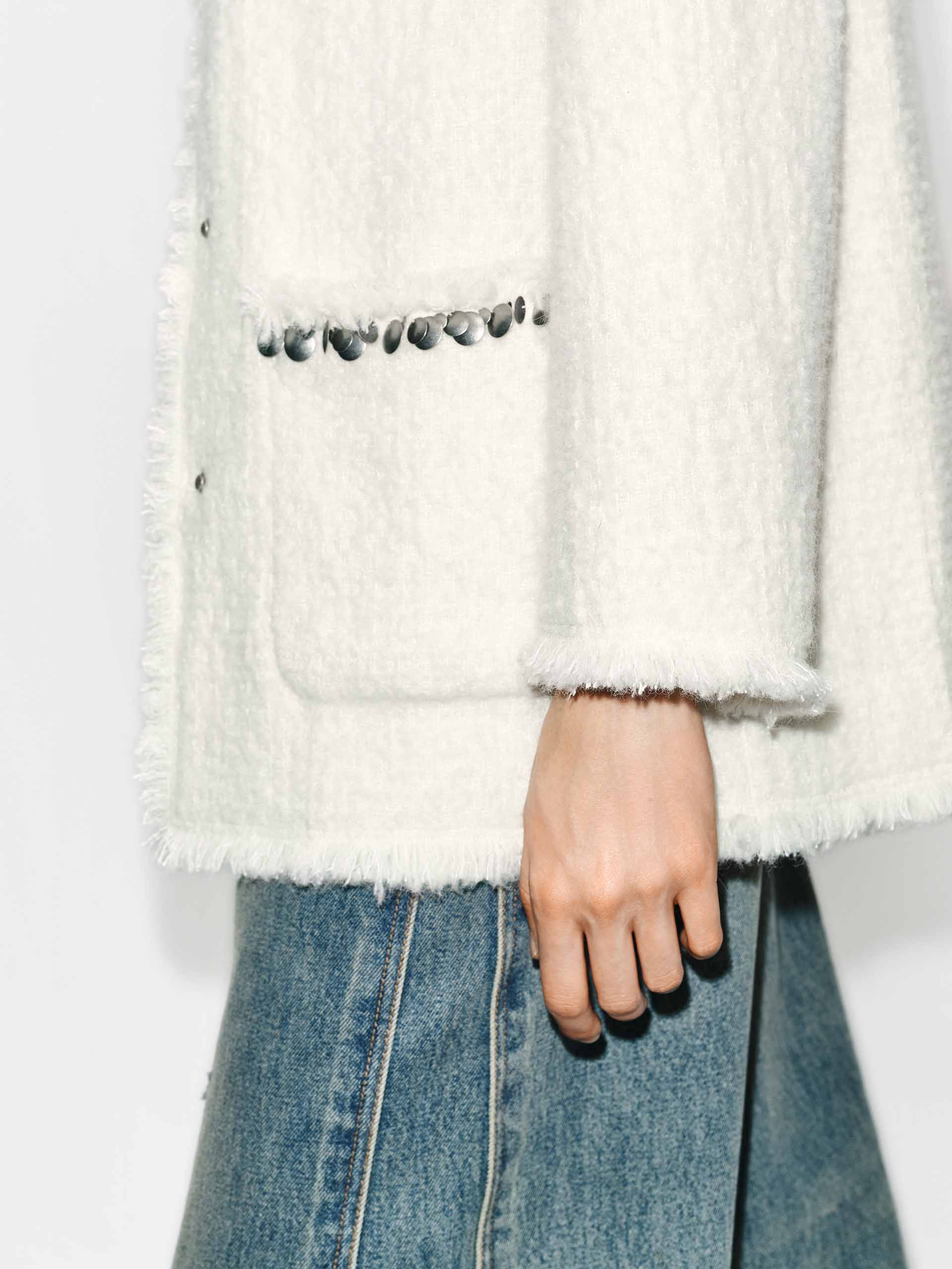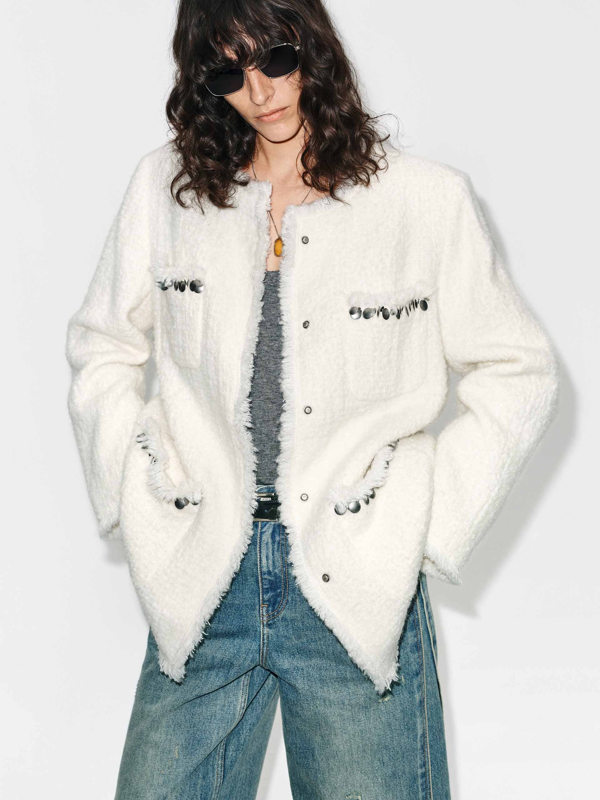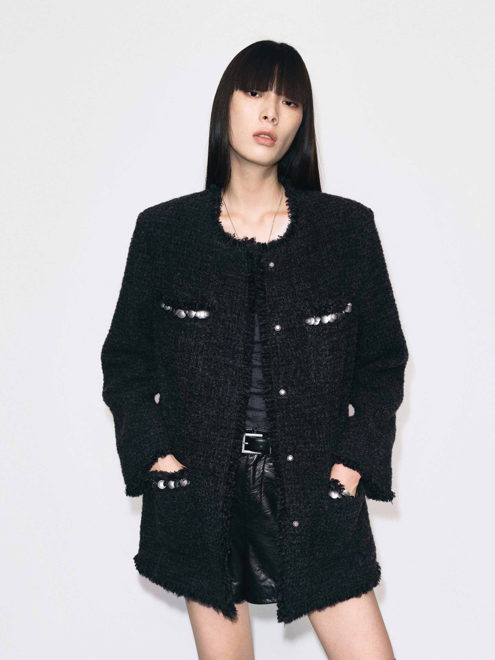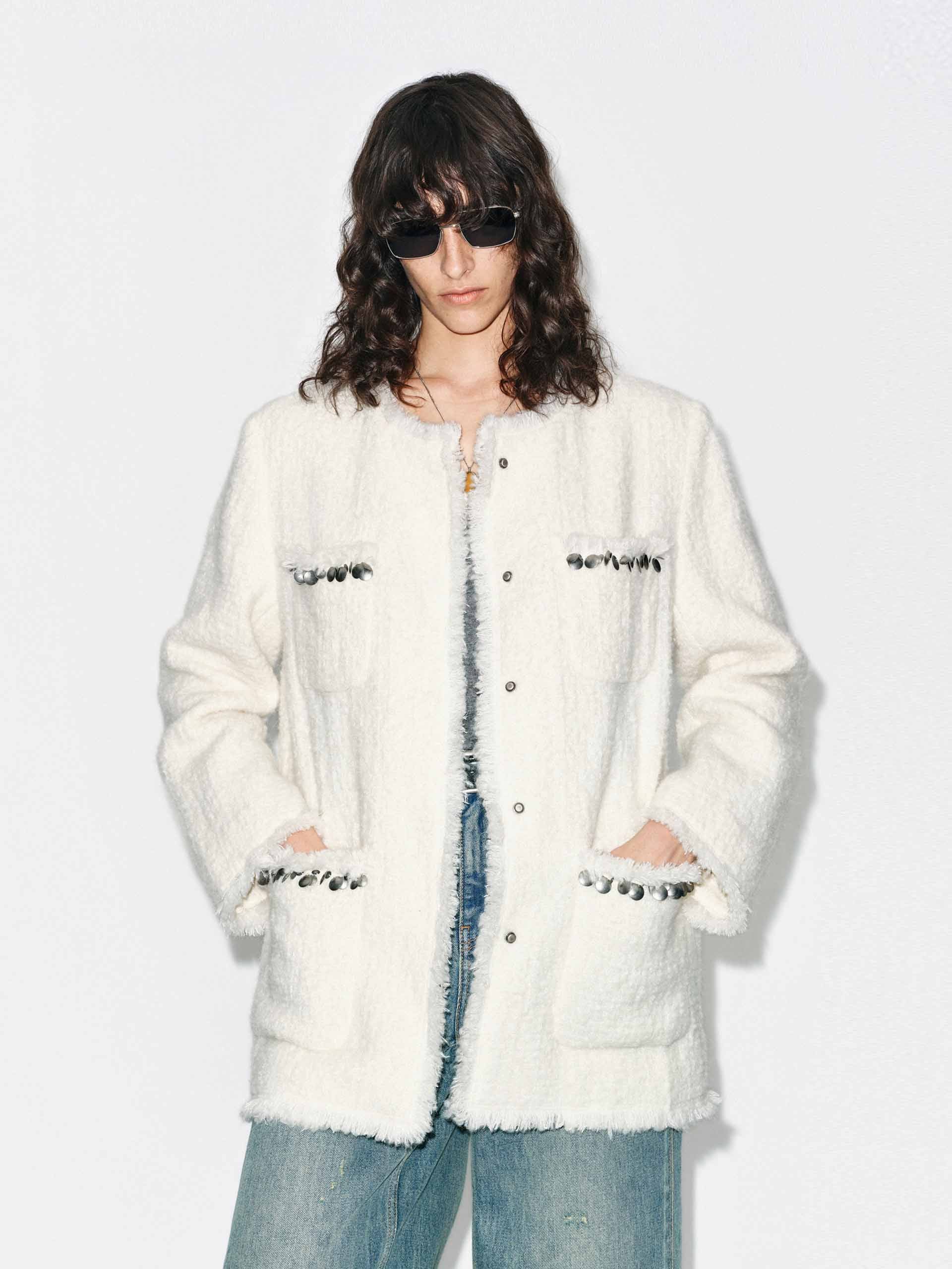 Embrace understated modernity with this coat. The spacious patch pockets and intentional raw trim detailing contribute to an aesthetic that is both utilitarian and refined. A sleek snap button closure effortlessly complements the minimalist collarless neckline, creating a piece that champions architectural simplicity and tactile texture for a truly sophisticated statement.