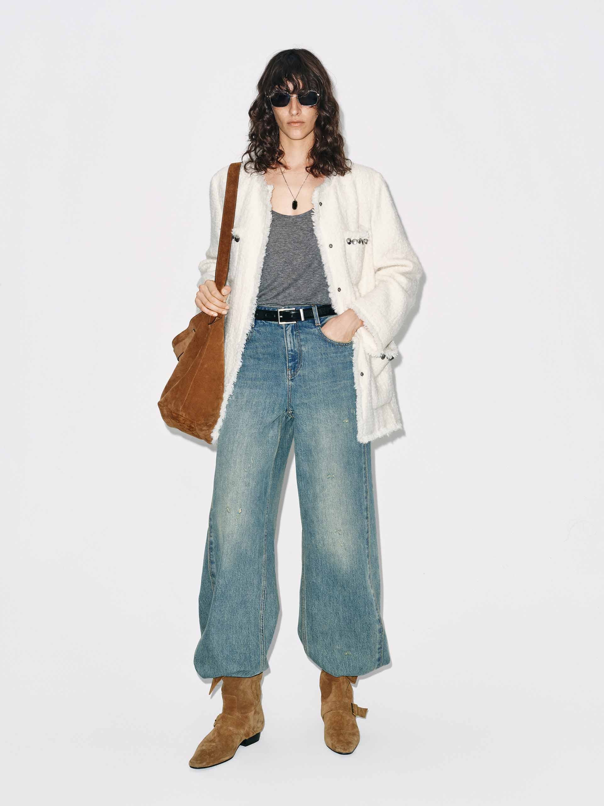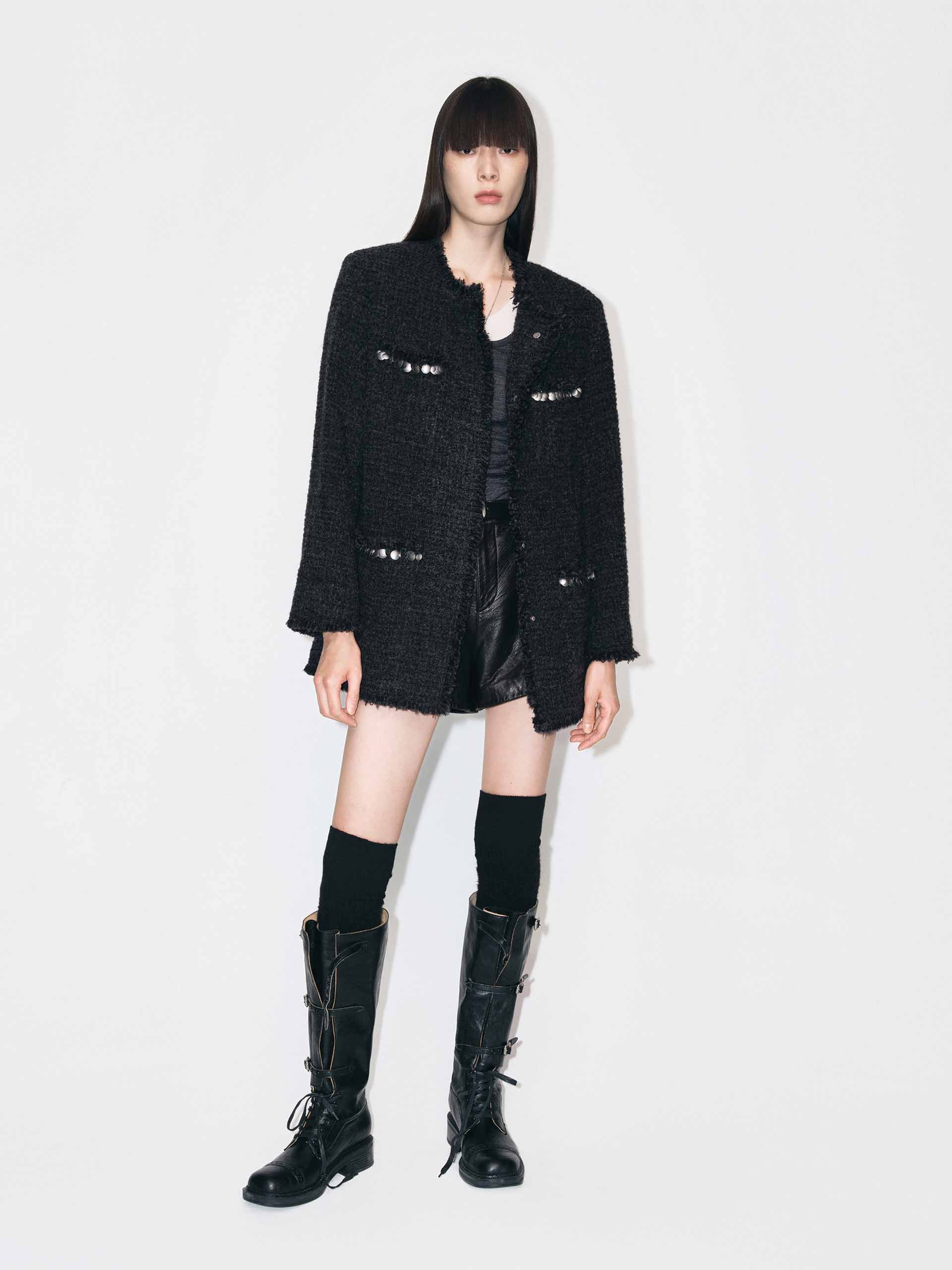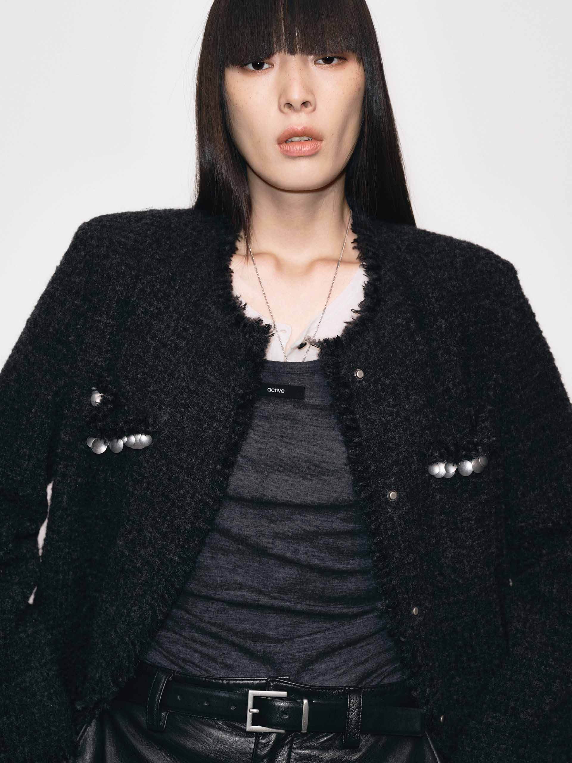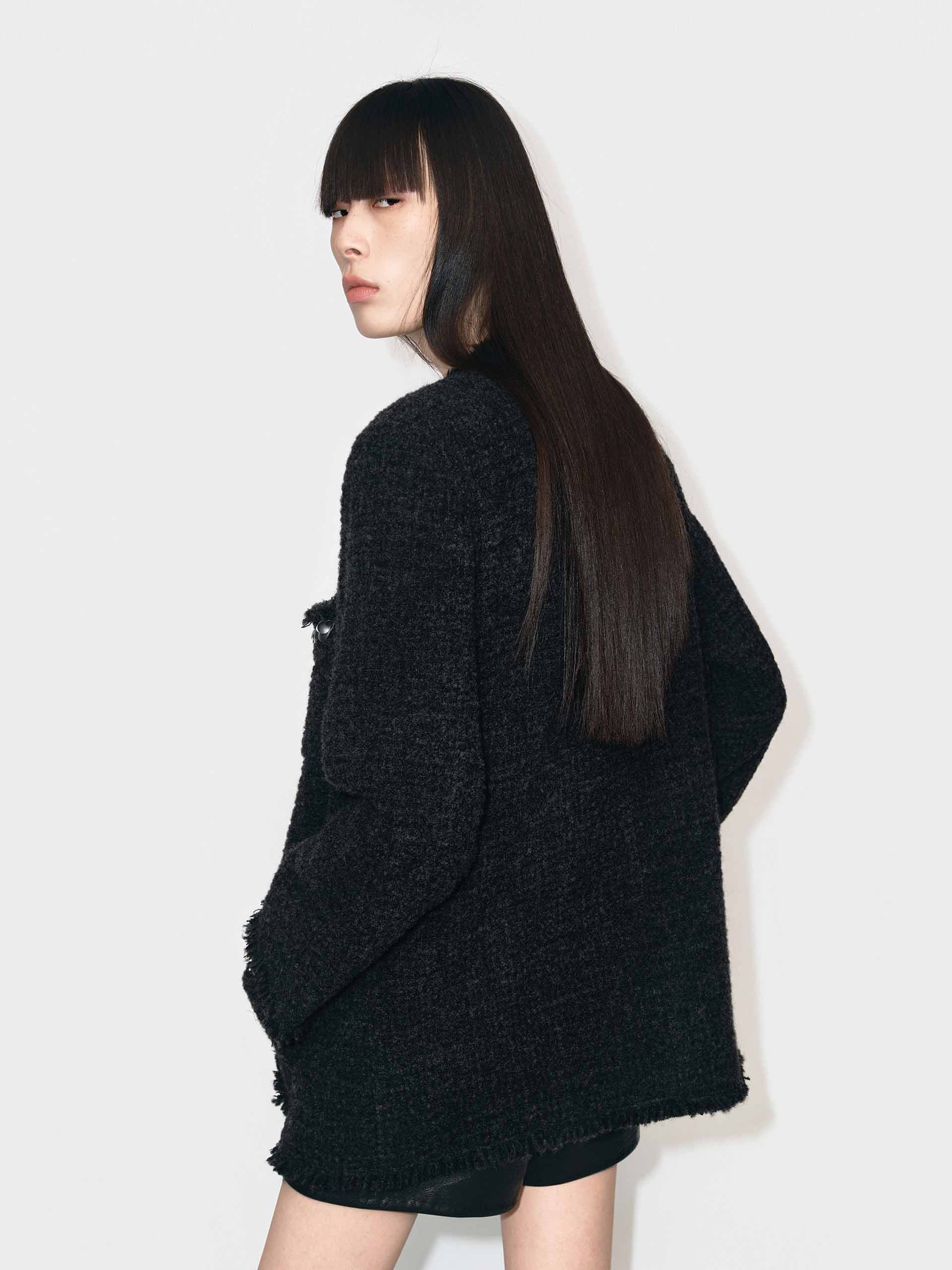 Embrace understated modernity with this coat. The spacious patch pockets and intentional raw trim detailing contribute to an aesthetic that is both utilitarian and refined. A sleek snap button closure effortlessly complements the minimalist collarless neckline, creating a piece that champions architectural simplicity and tactile texture for a truly sophisticated statement.