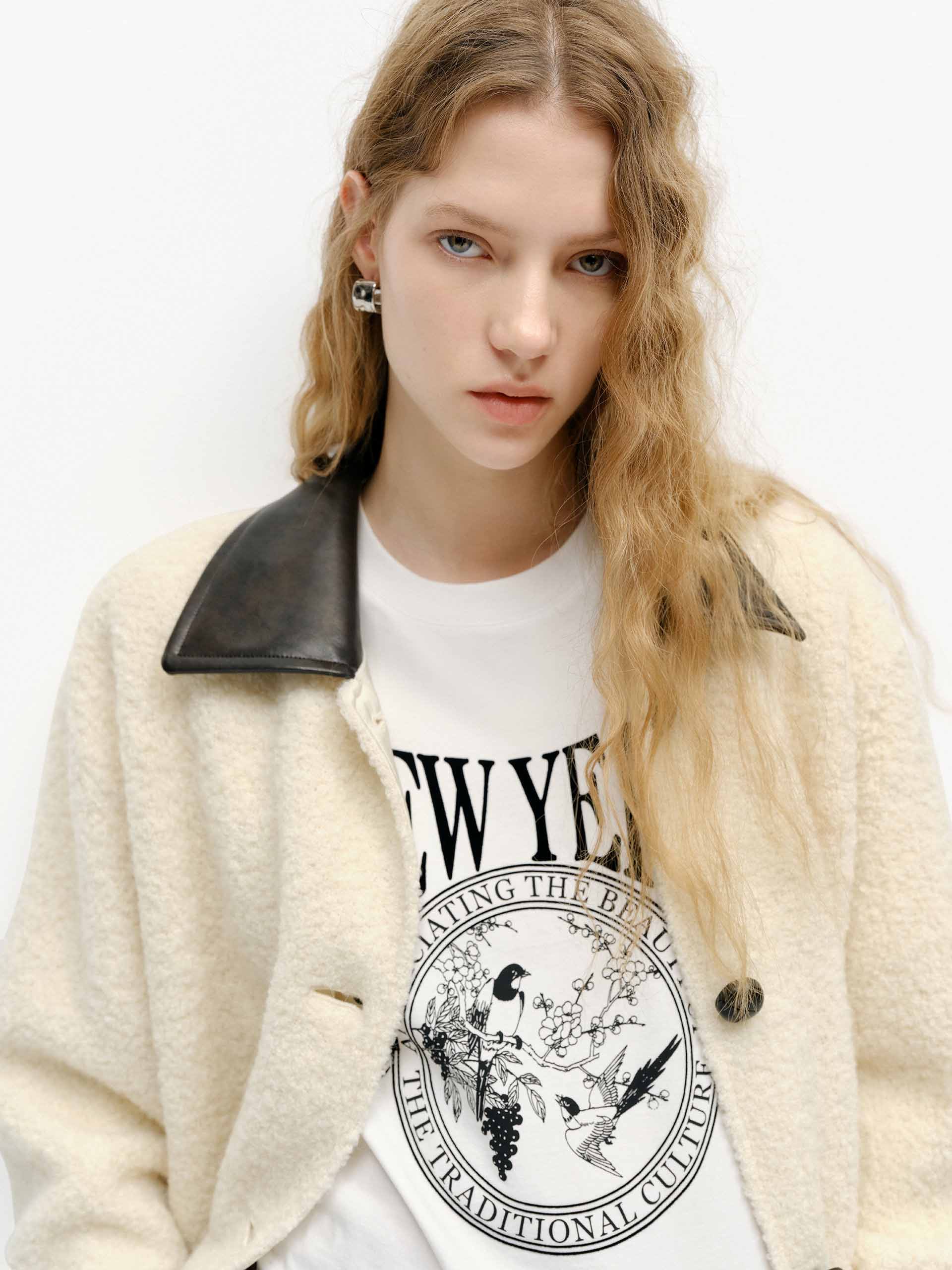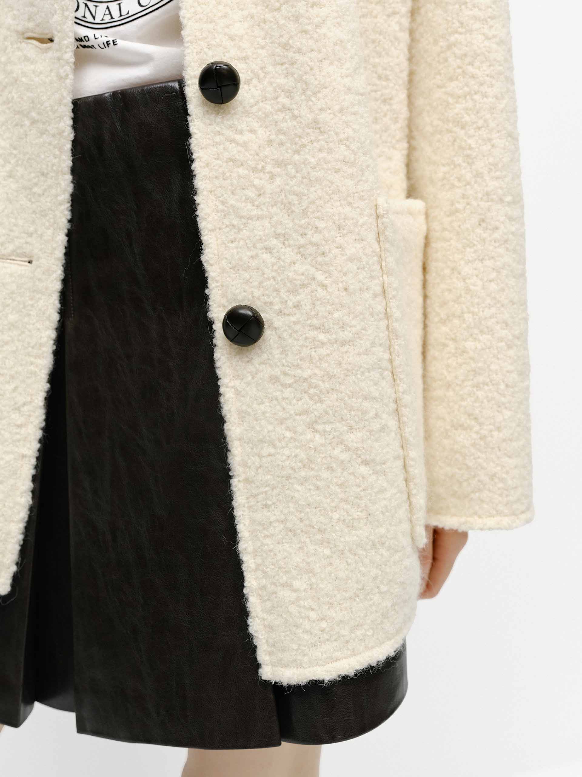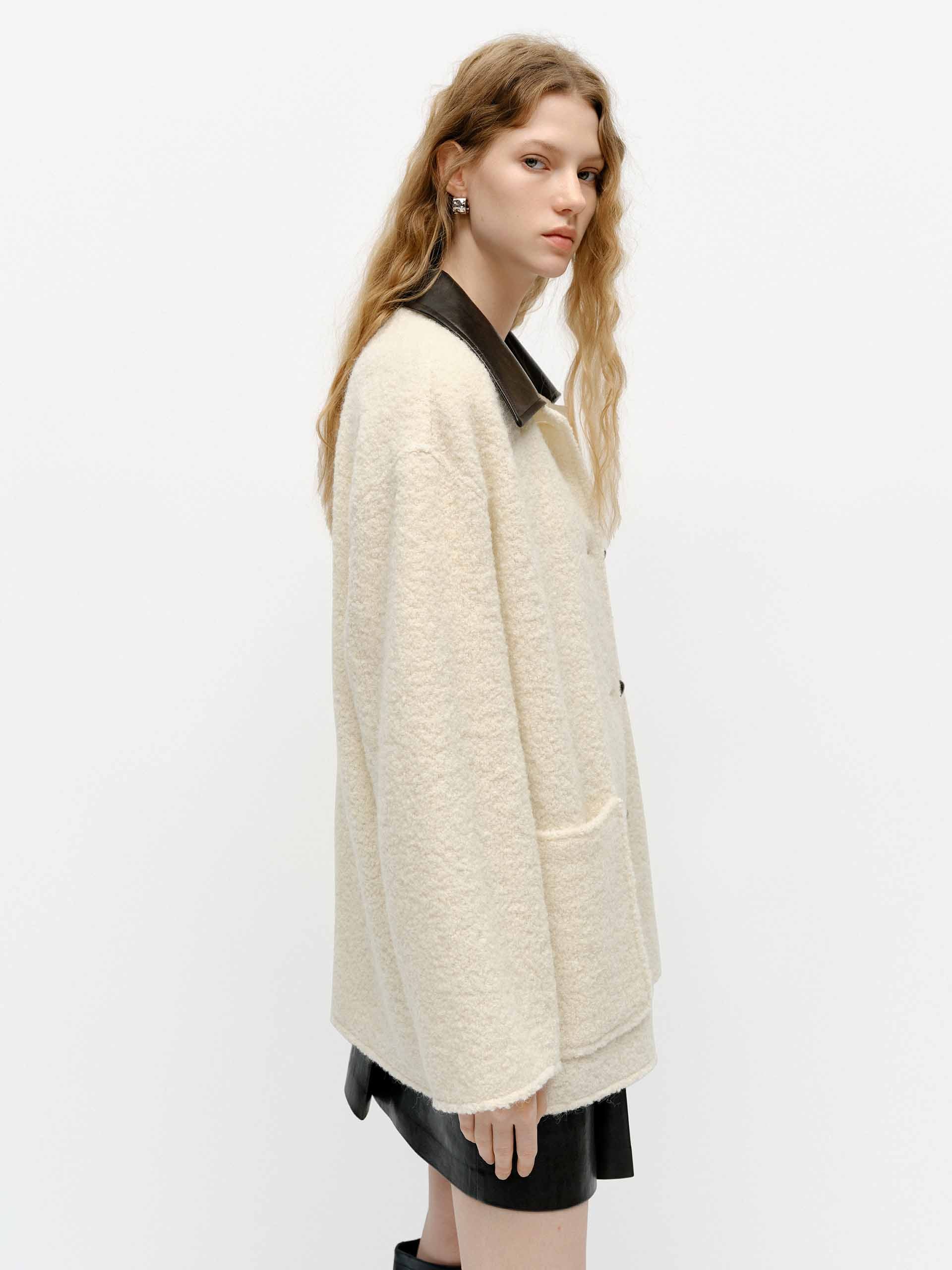 This coat is made with a blend of wool and Alpacaa hint of other fibers. It's rendered in a subdued beige hue with boucle knit textured and features a contrast PU collar design, patch pocket, and button closure offering a modern twist. Cut in a relaxed shape that is easy to layer for the transitional season.