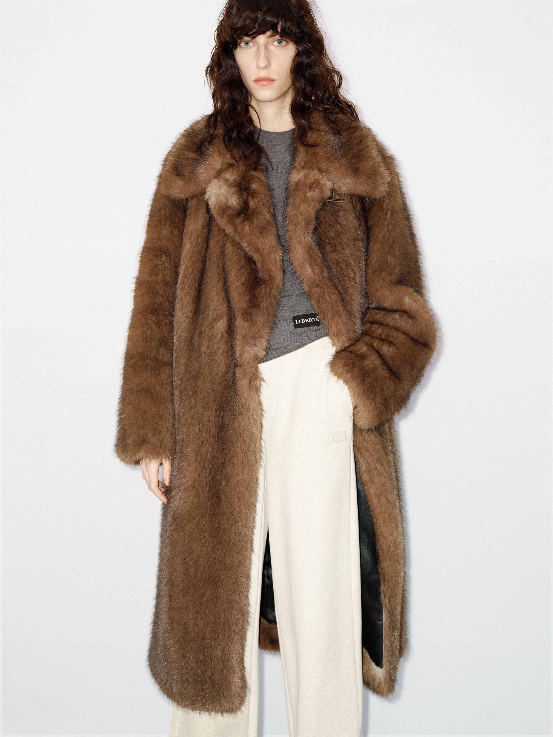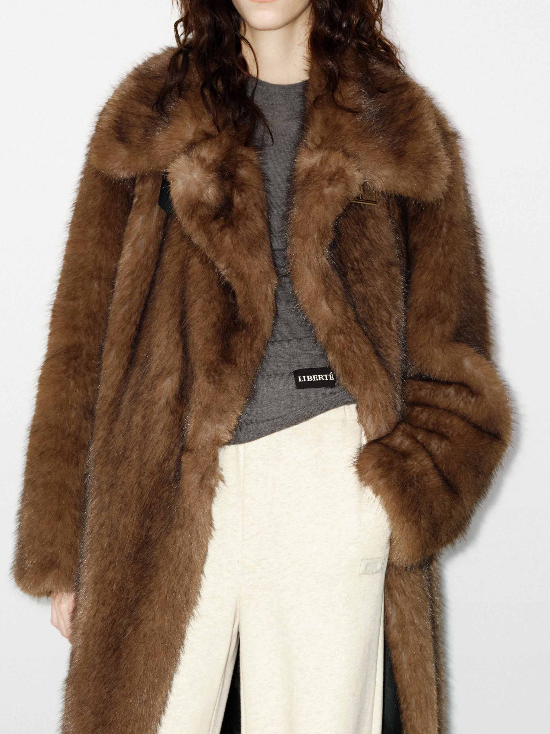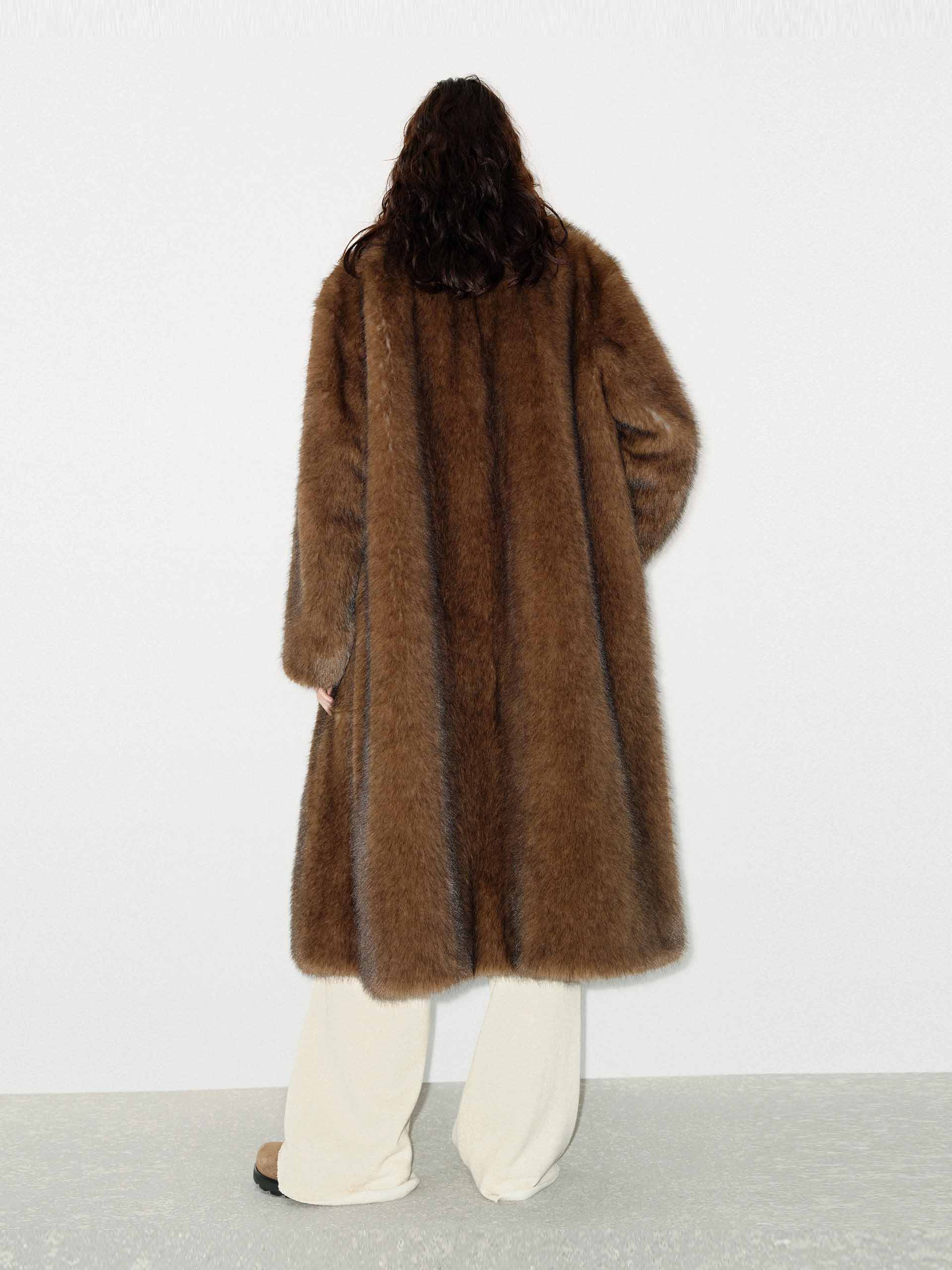Discover the perfect blend of coziness and refinement with this coat. It's crafted from faux shearling and offers a rich brown hue that will provide warmth in the winter months. Features a longline silhouette, lapel, and smooth lining for a stylish look.