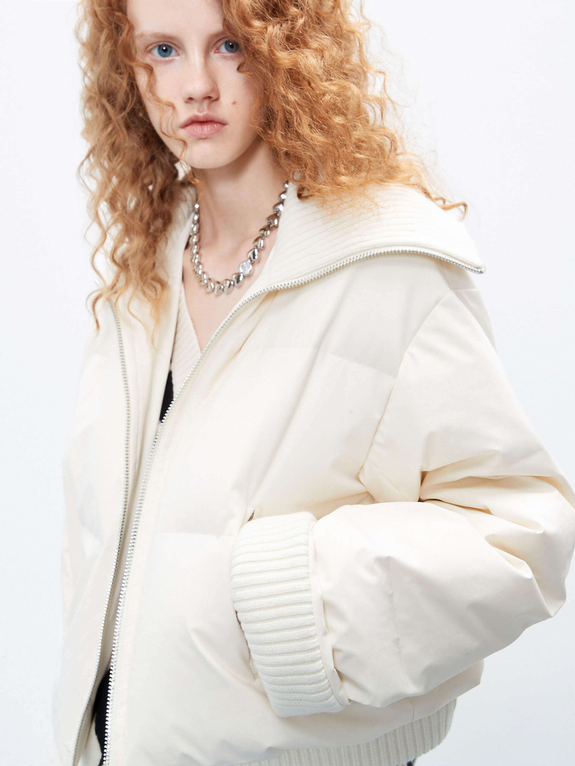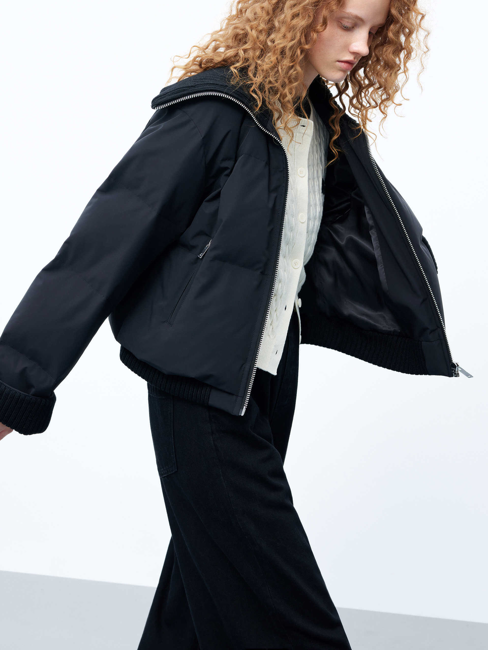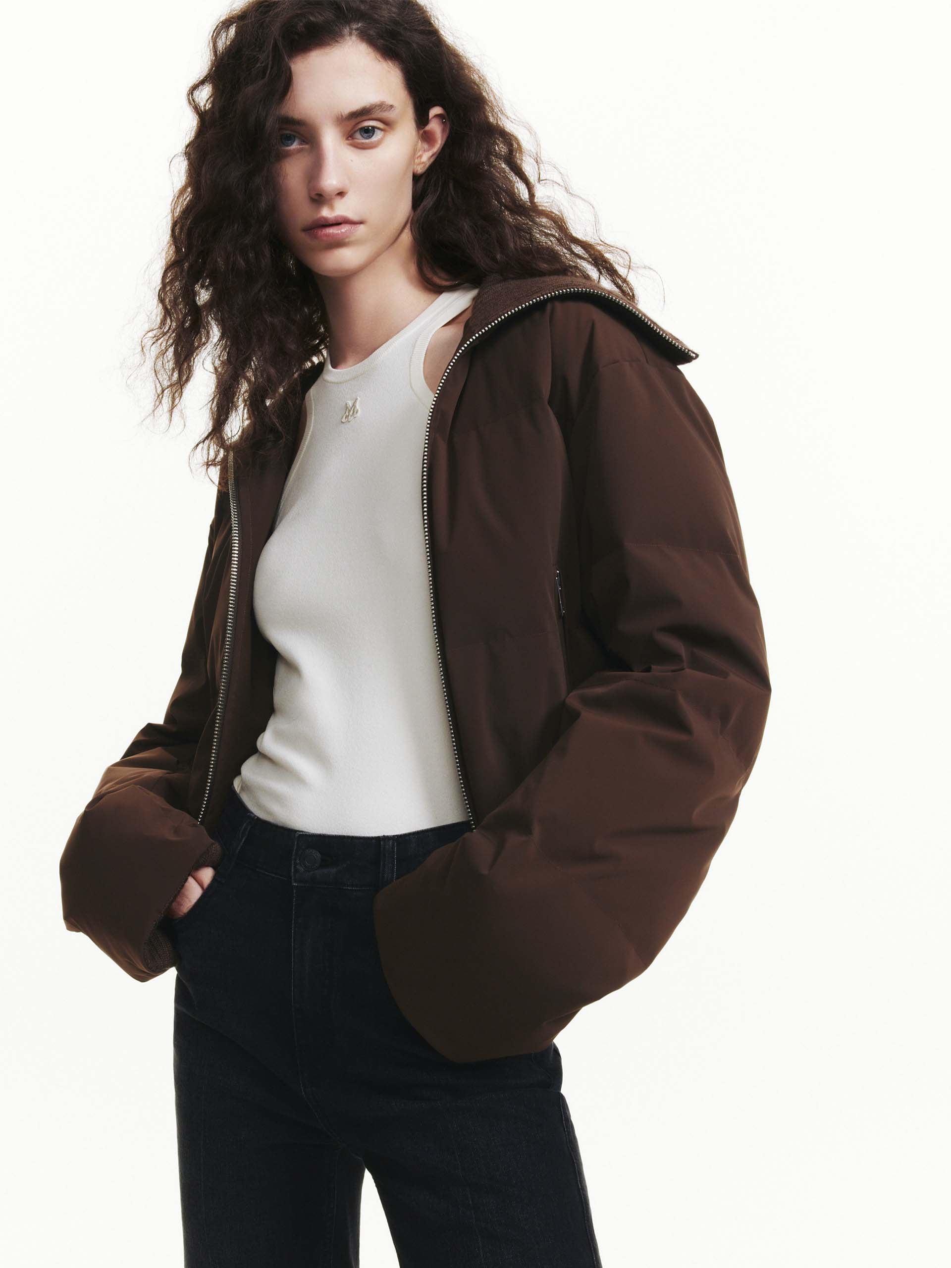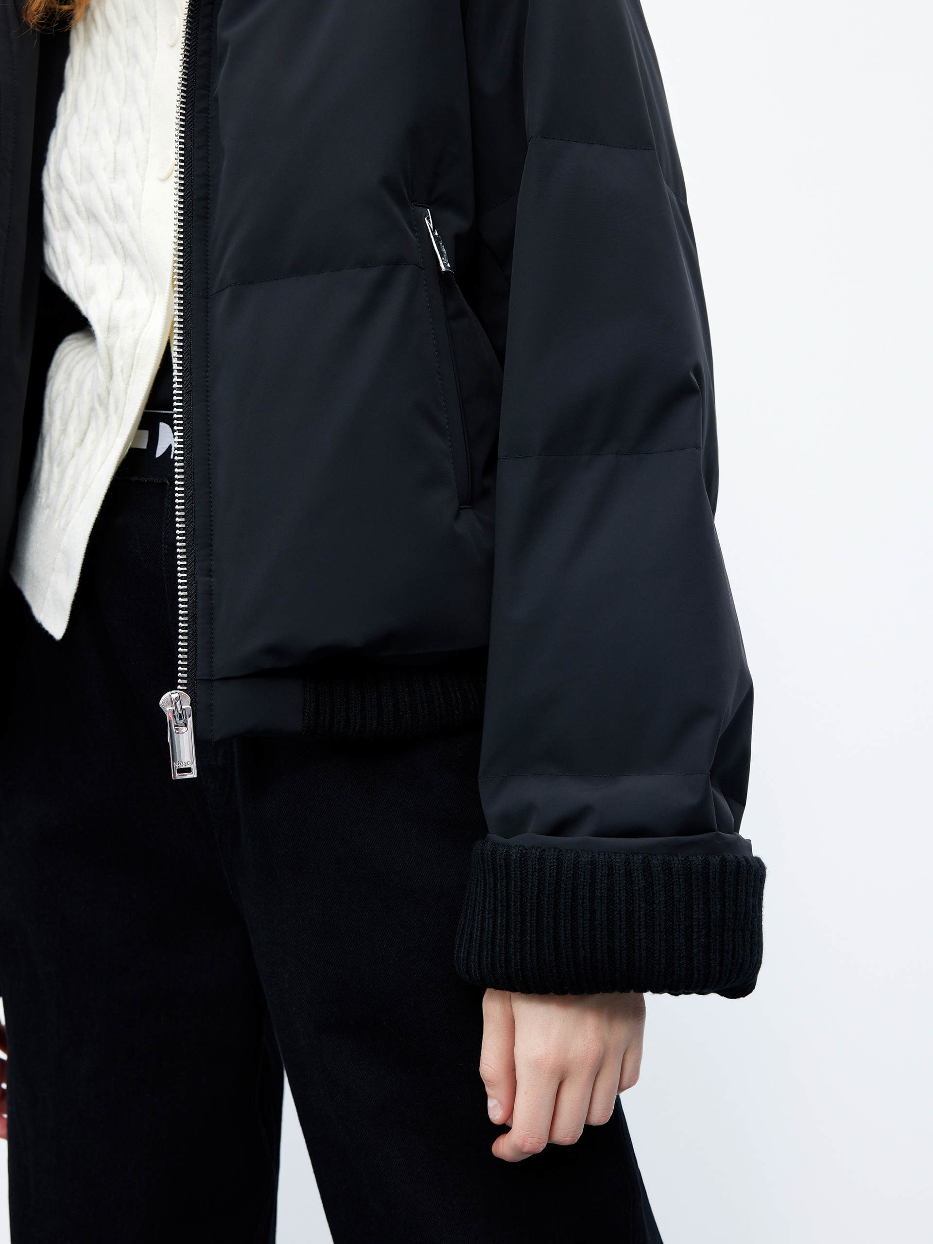 Introducing the shell down jacket – filled with 90% duck down for luxurious warmth. A zip-up collar ensures a snug fit, while ribbed trims at the hem, cuffs and collar add a unique detail to this short-cut style. You'll be toasty warm and look stylishly chic. Enjoy warmth and quality all winter long.