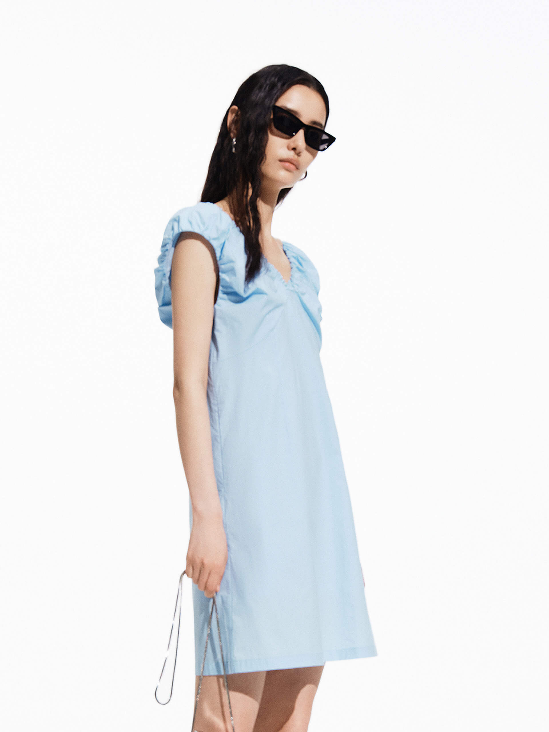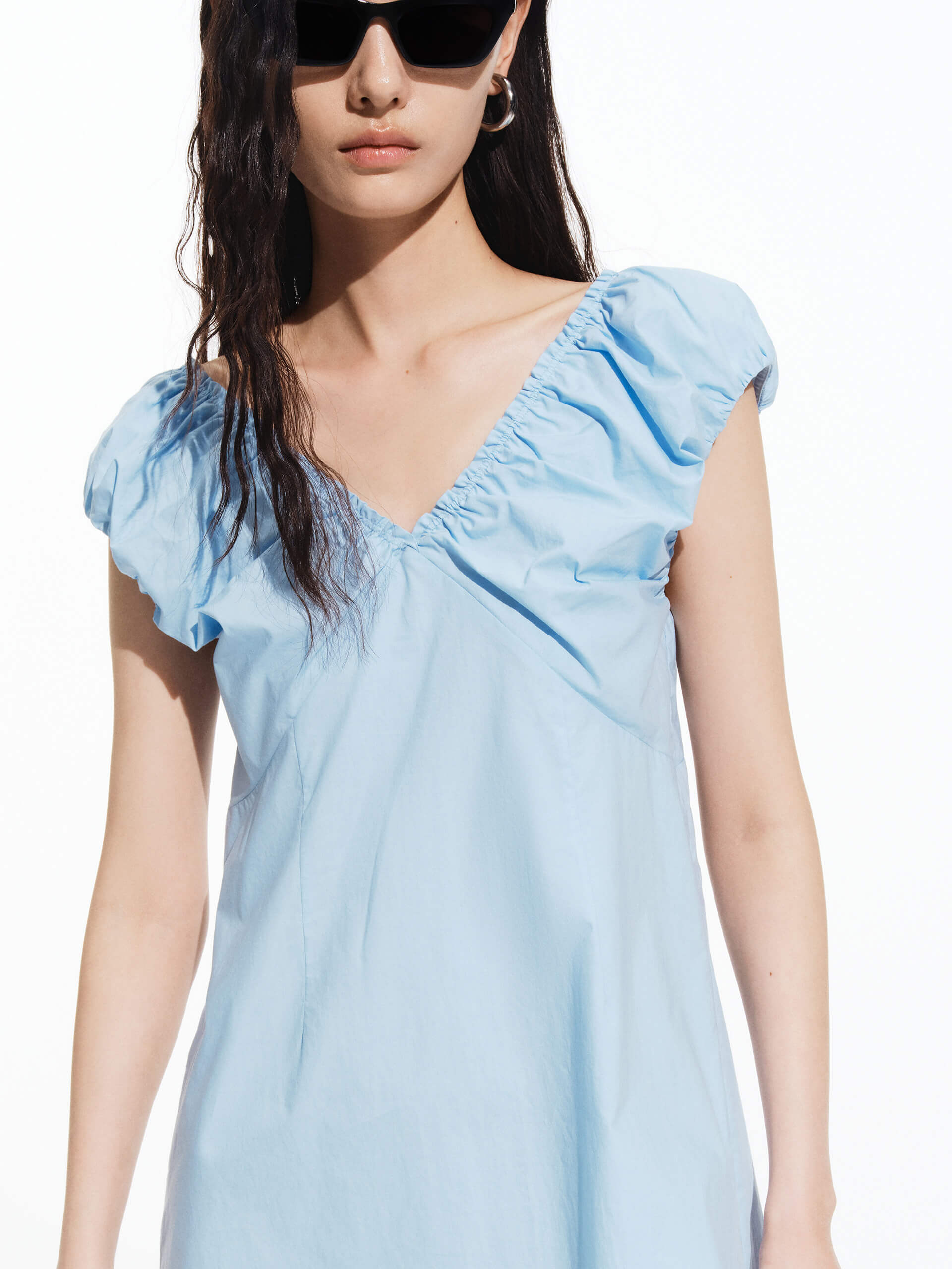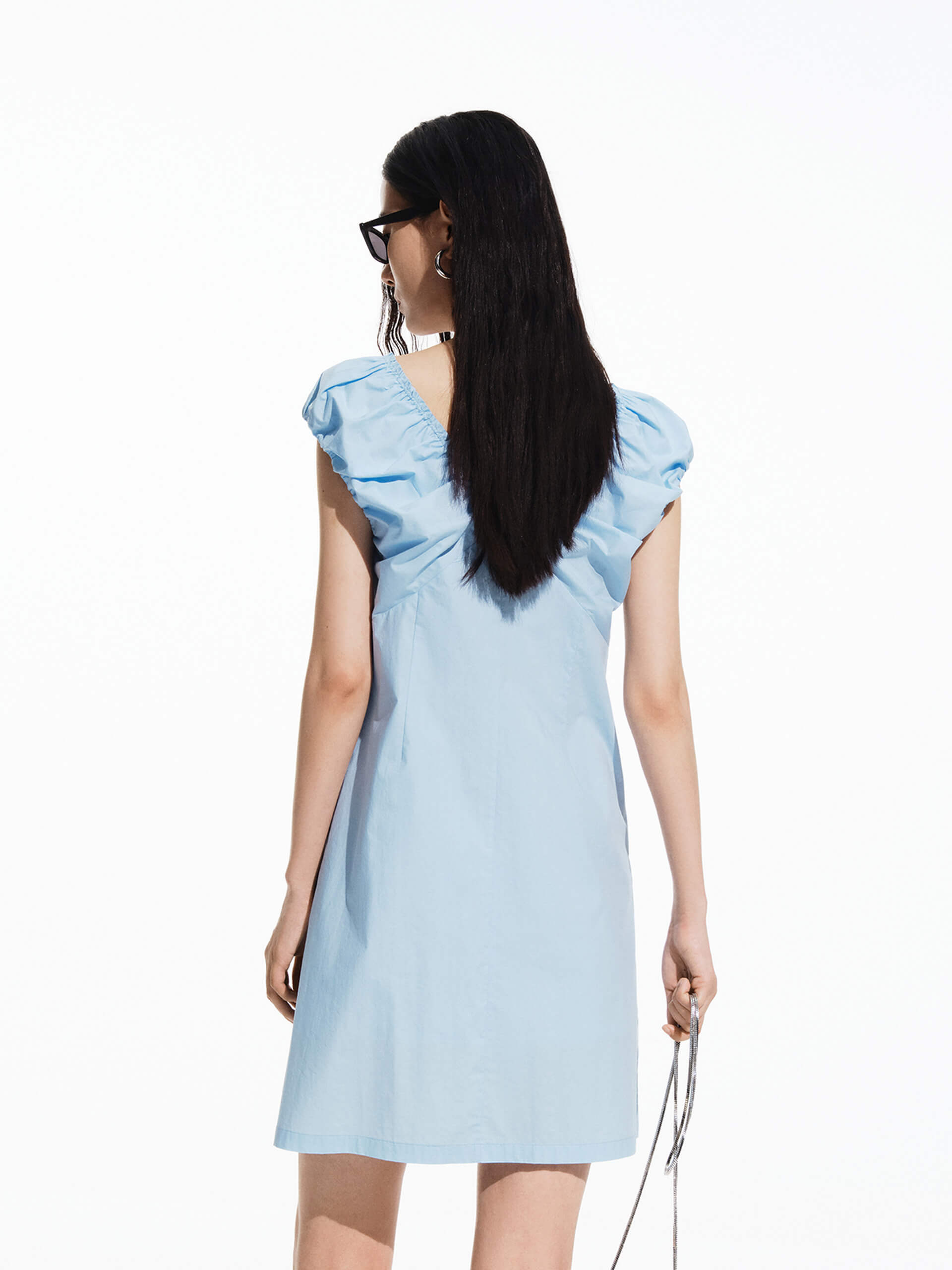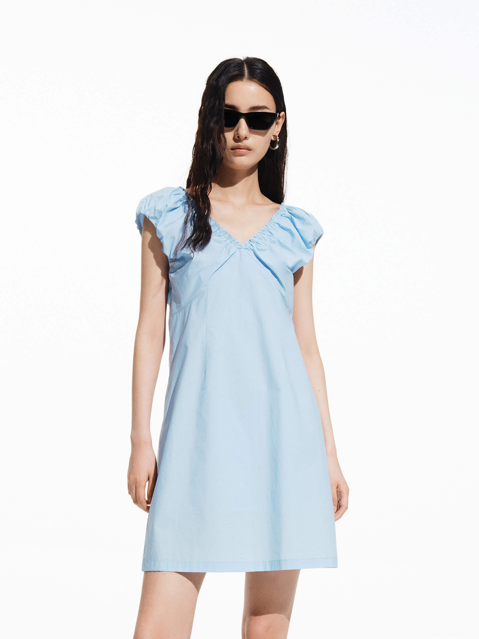 This dress is made of 100% cotton, ensuring it is breathable and comfortable to wear. It features a V-neck design with pleated details, adding a touch of elegance and texture to the neckline. This dress has a hidden zipper on the side, allowing for easy and seamless wearing, and the mini length hits just above the knee, looking playful and stylish.