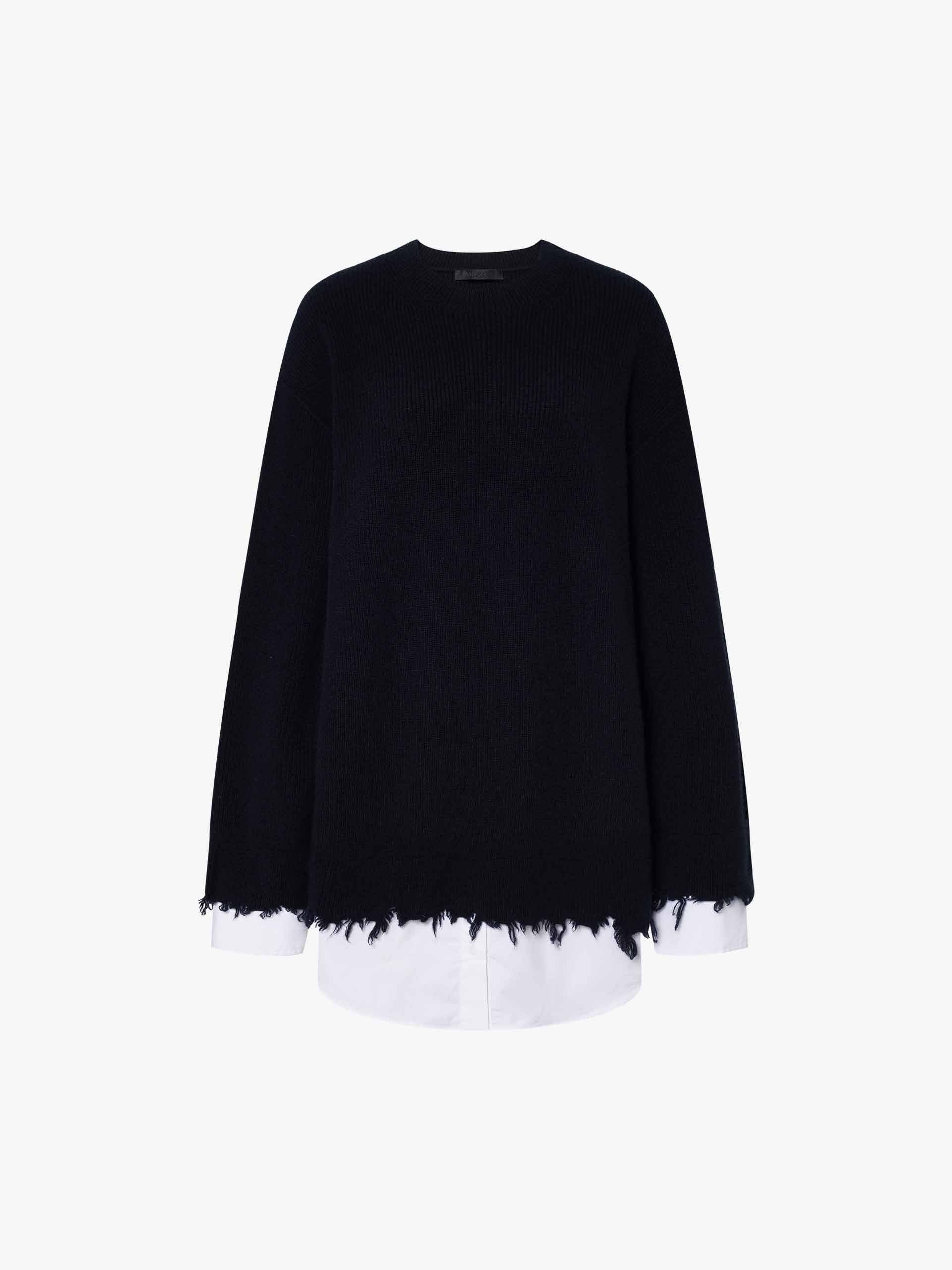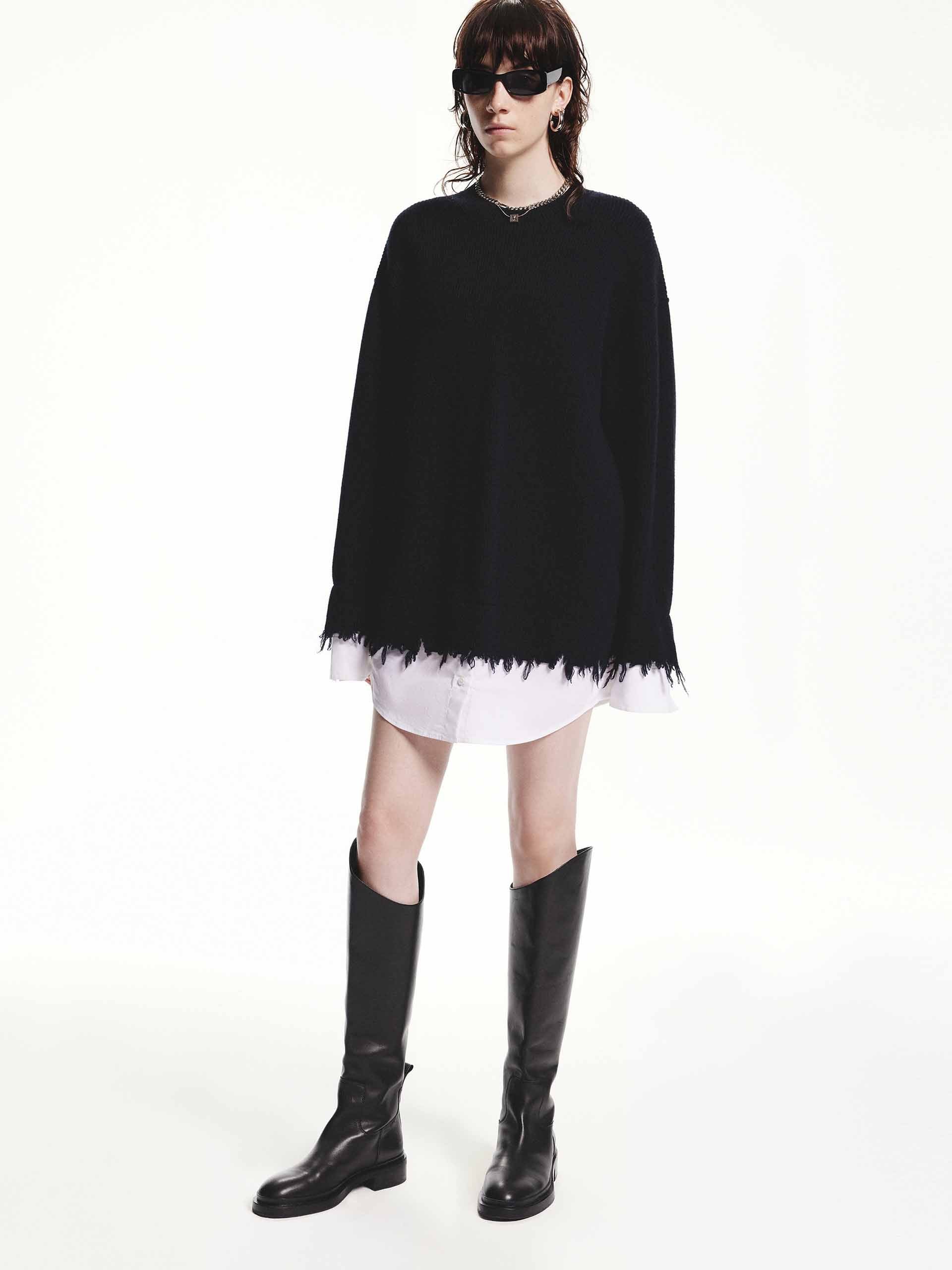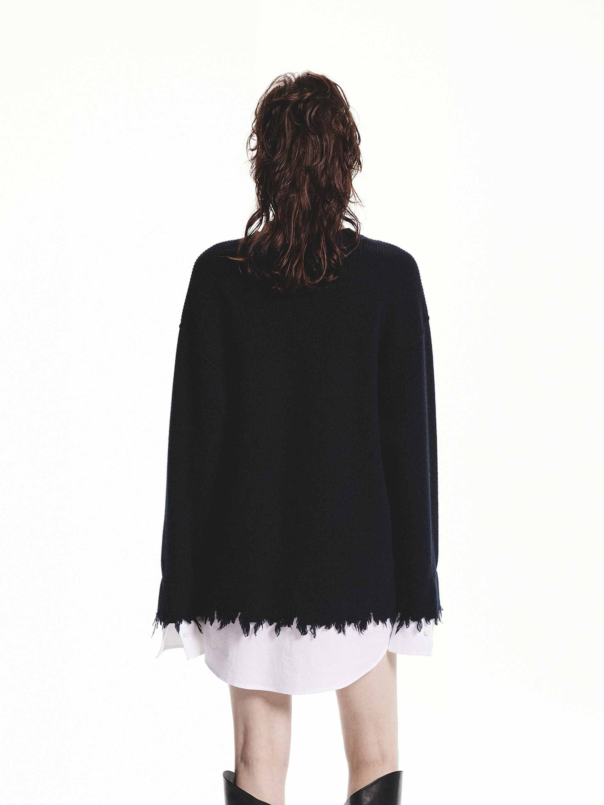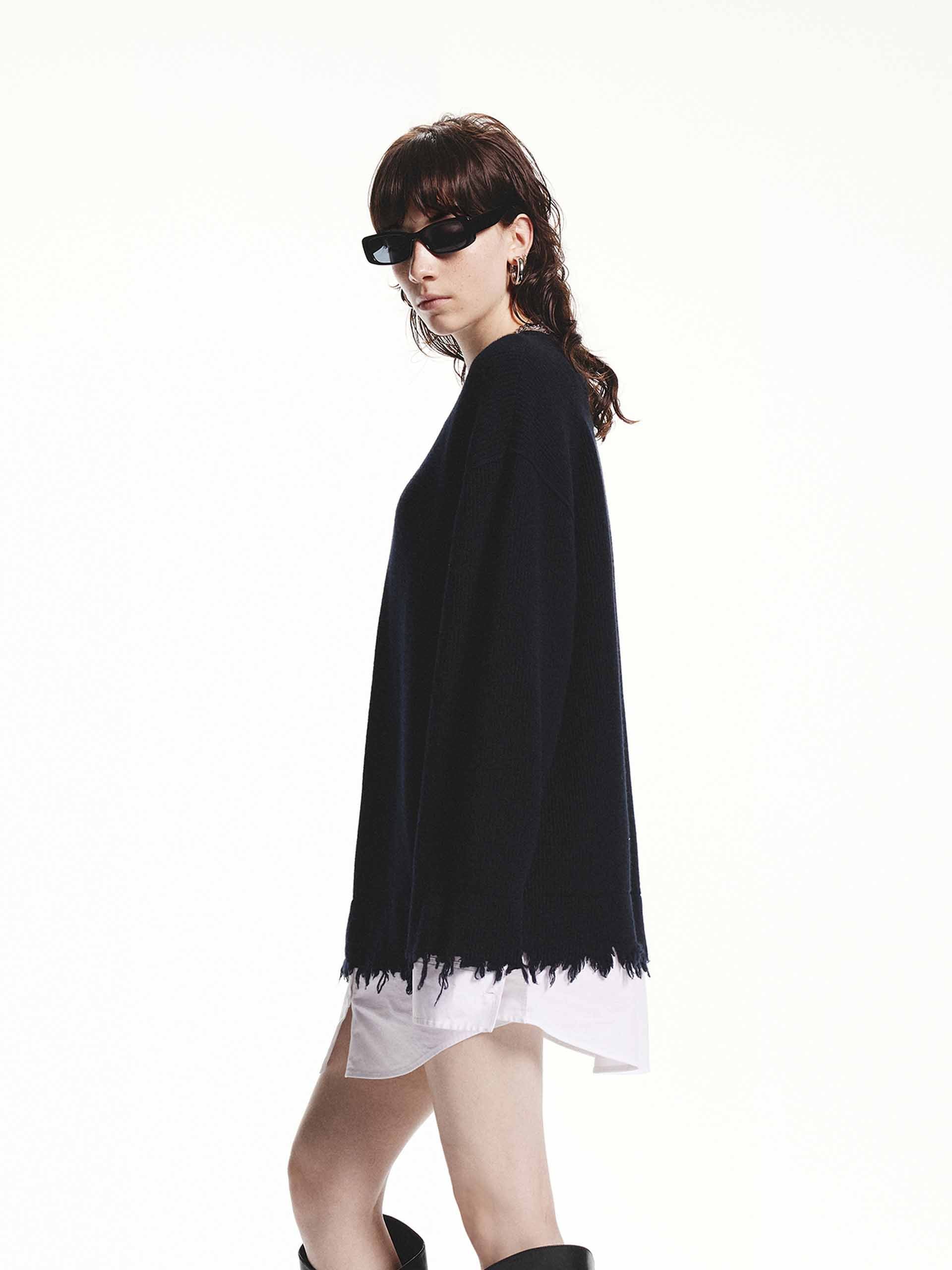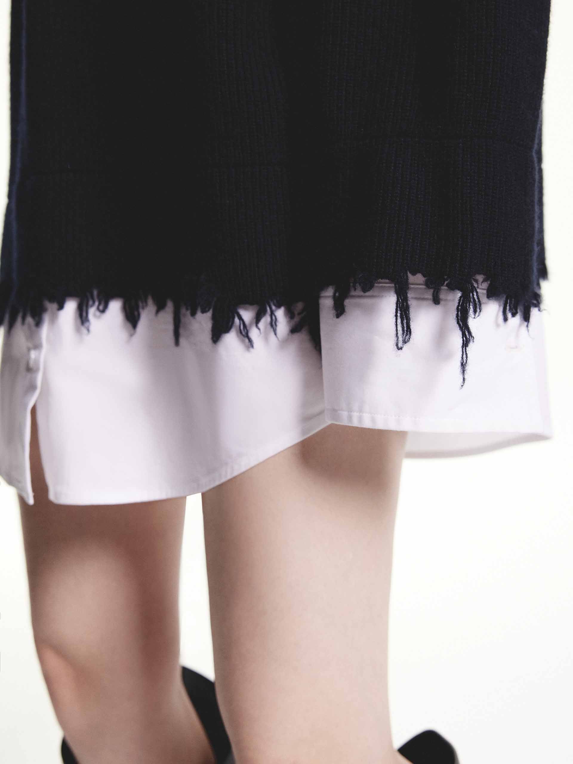 It offers warmth and comfort and is made with 100% wool and a cotton blend paneled detail. This dress has a round neck and the contrast raw detail adds a unique visual effect to the dress, while the loose fit allows for easy movement and a flattering silhouette.