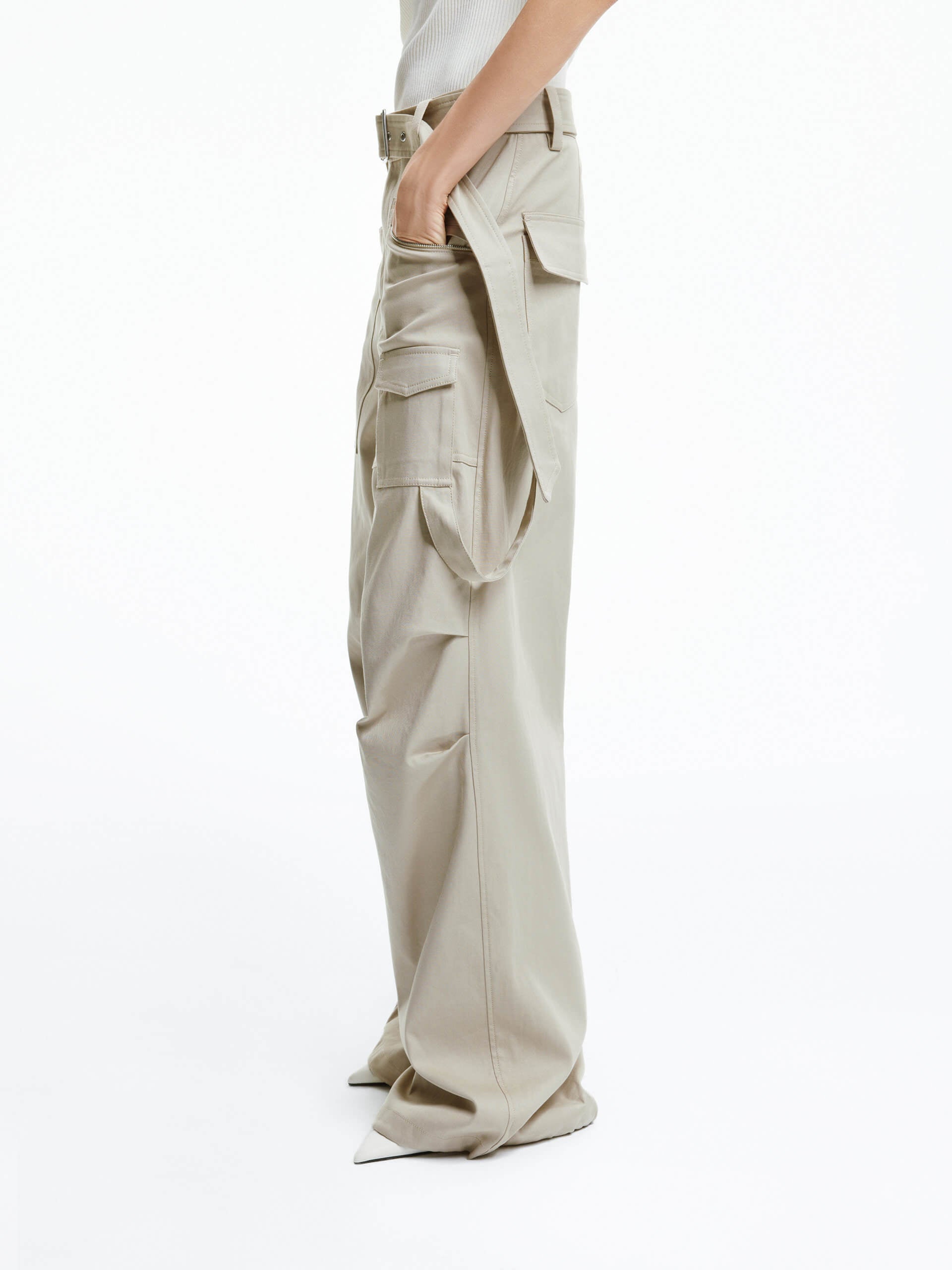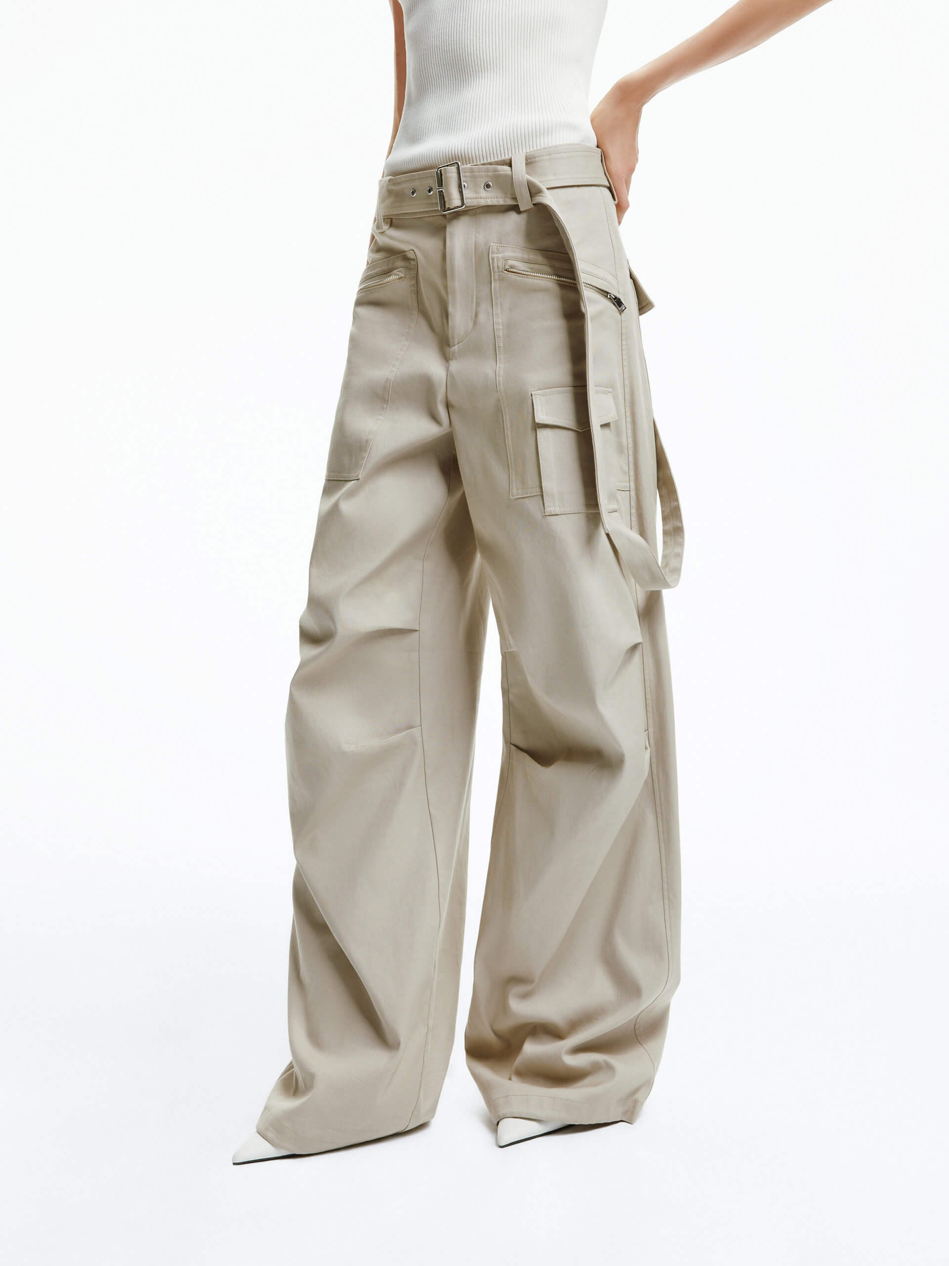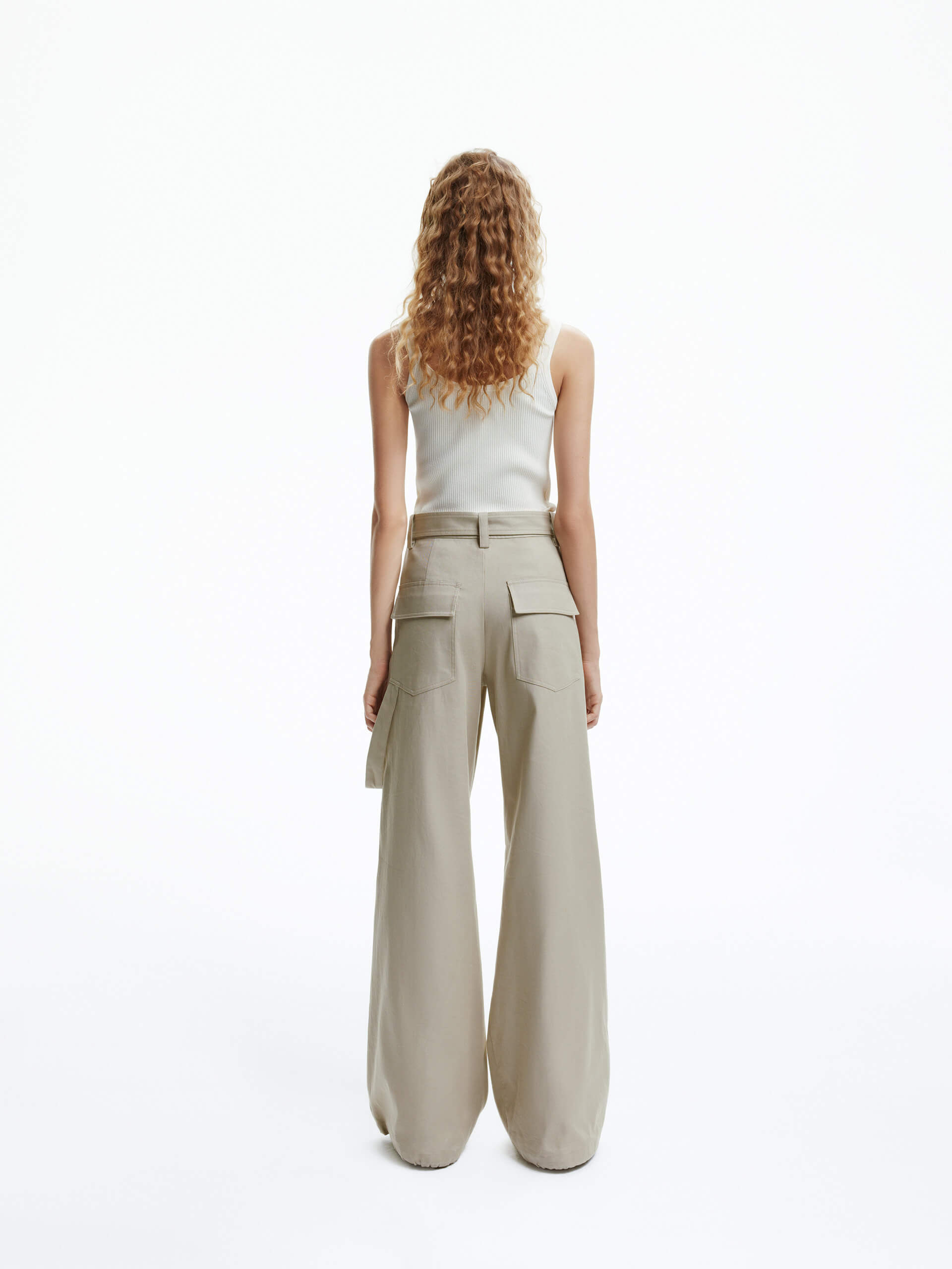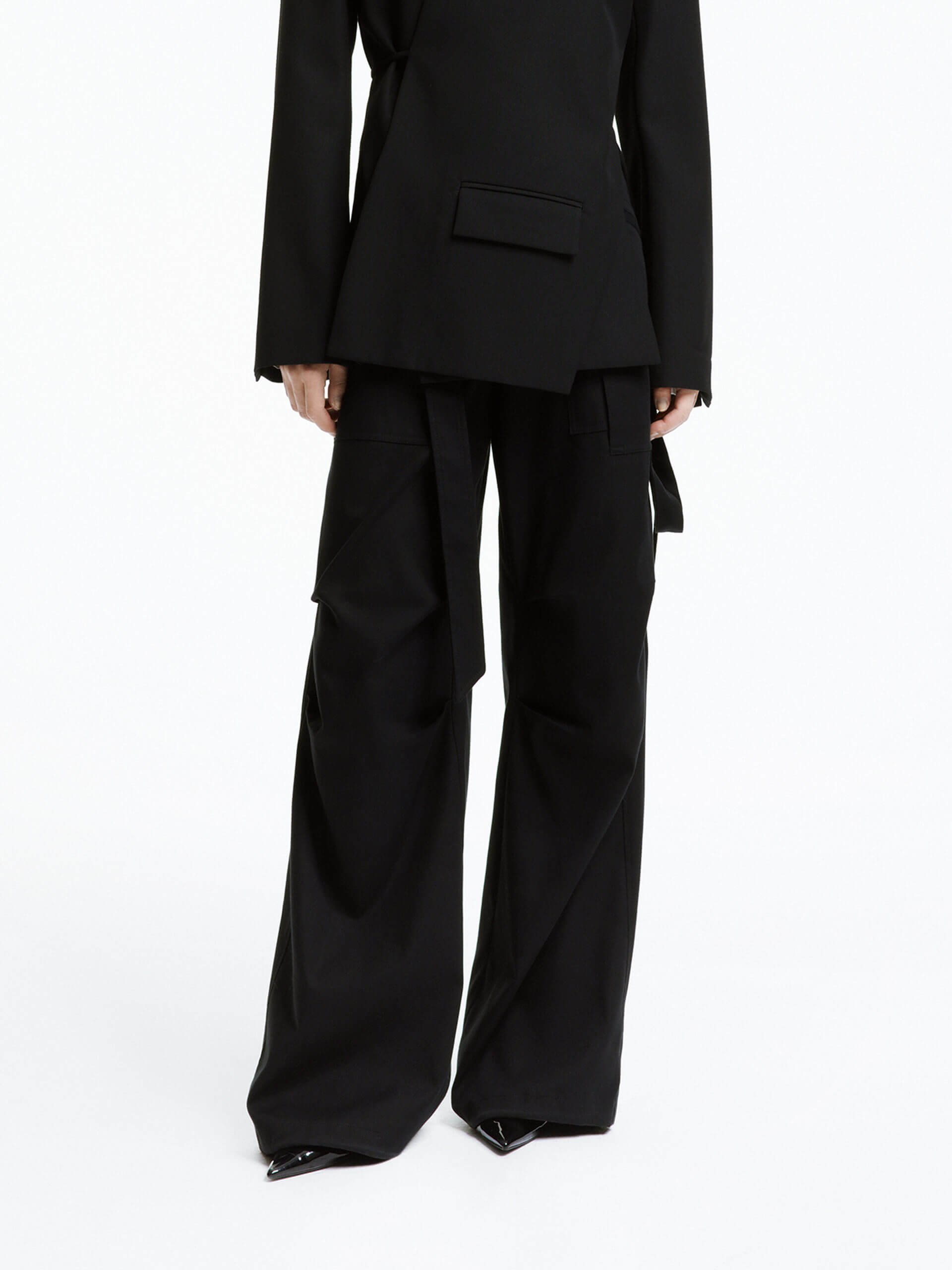 Elevate your casual style with our pants. Crafted from a comfy cotton blend, these pants offer a relaxed fit and wide legs that will pool effortlessly over your shoes. The folded details at the knee add a touch of industrial chic. Perfectly pairs with a fitted top for a laid-back yet trendy look.