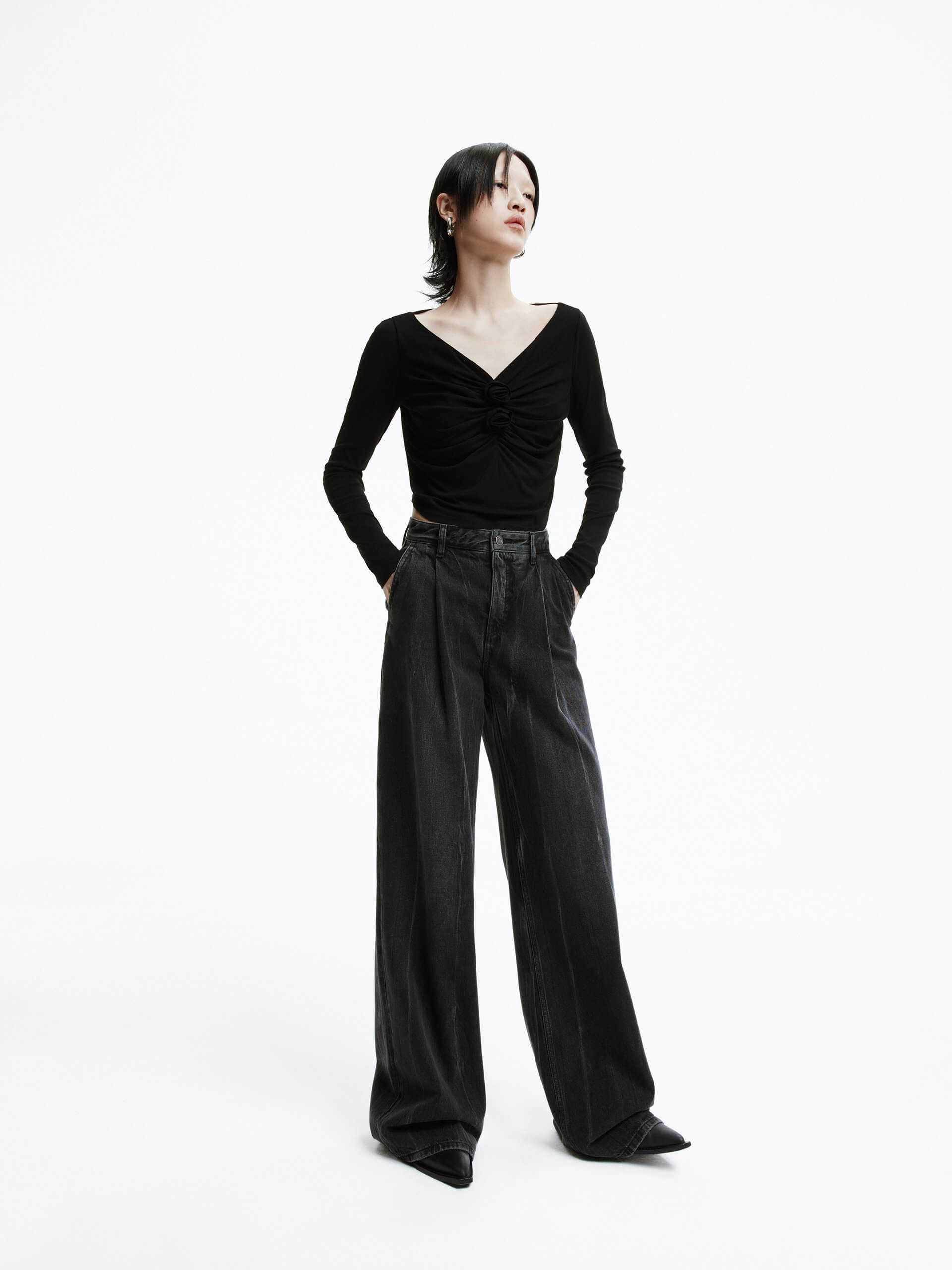- Wide leg, high-rise, floor-length