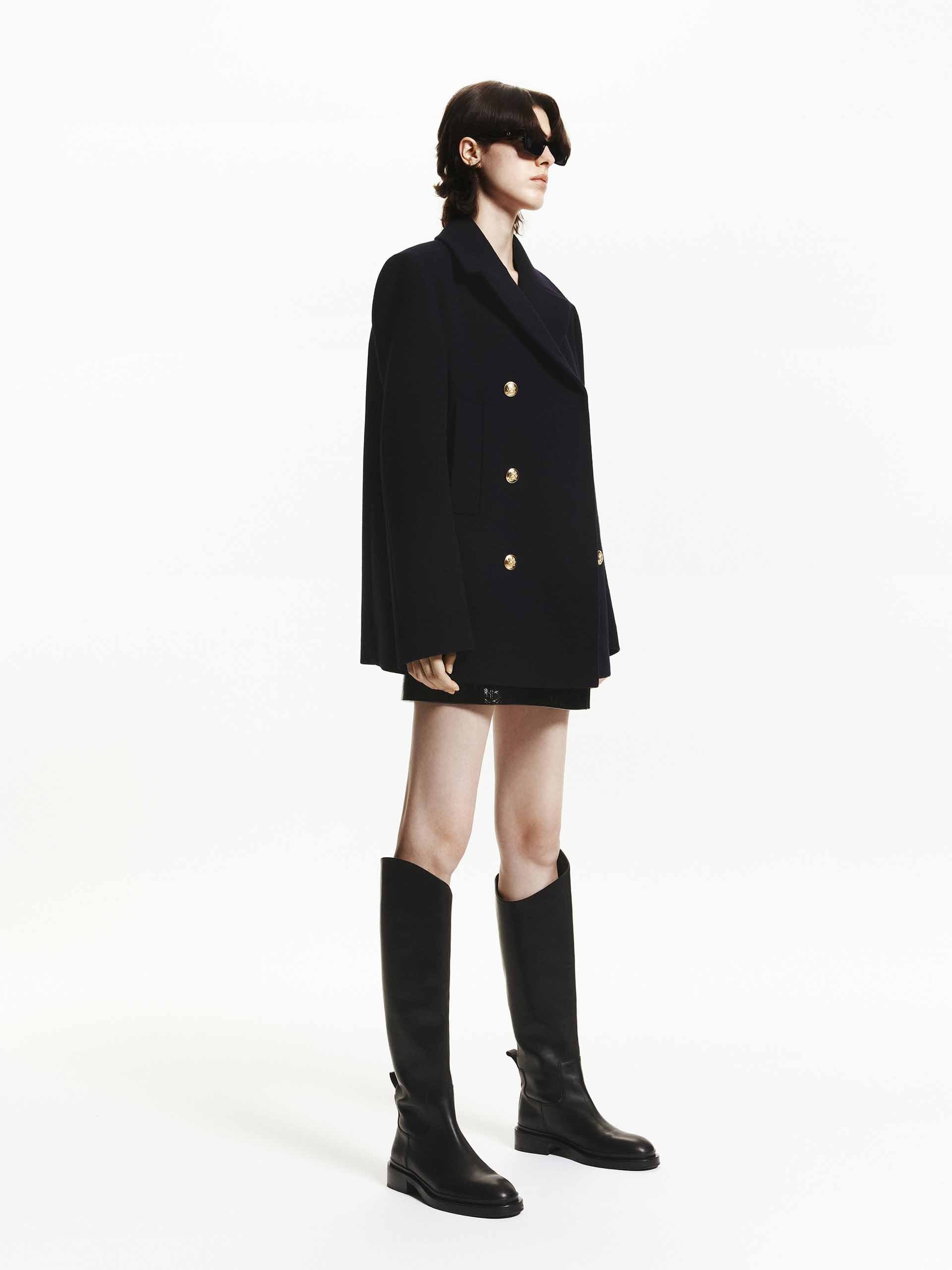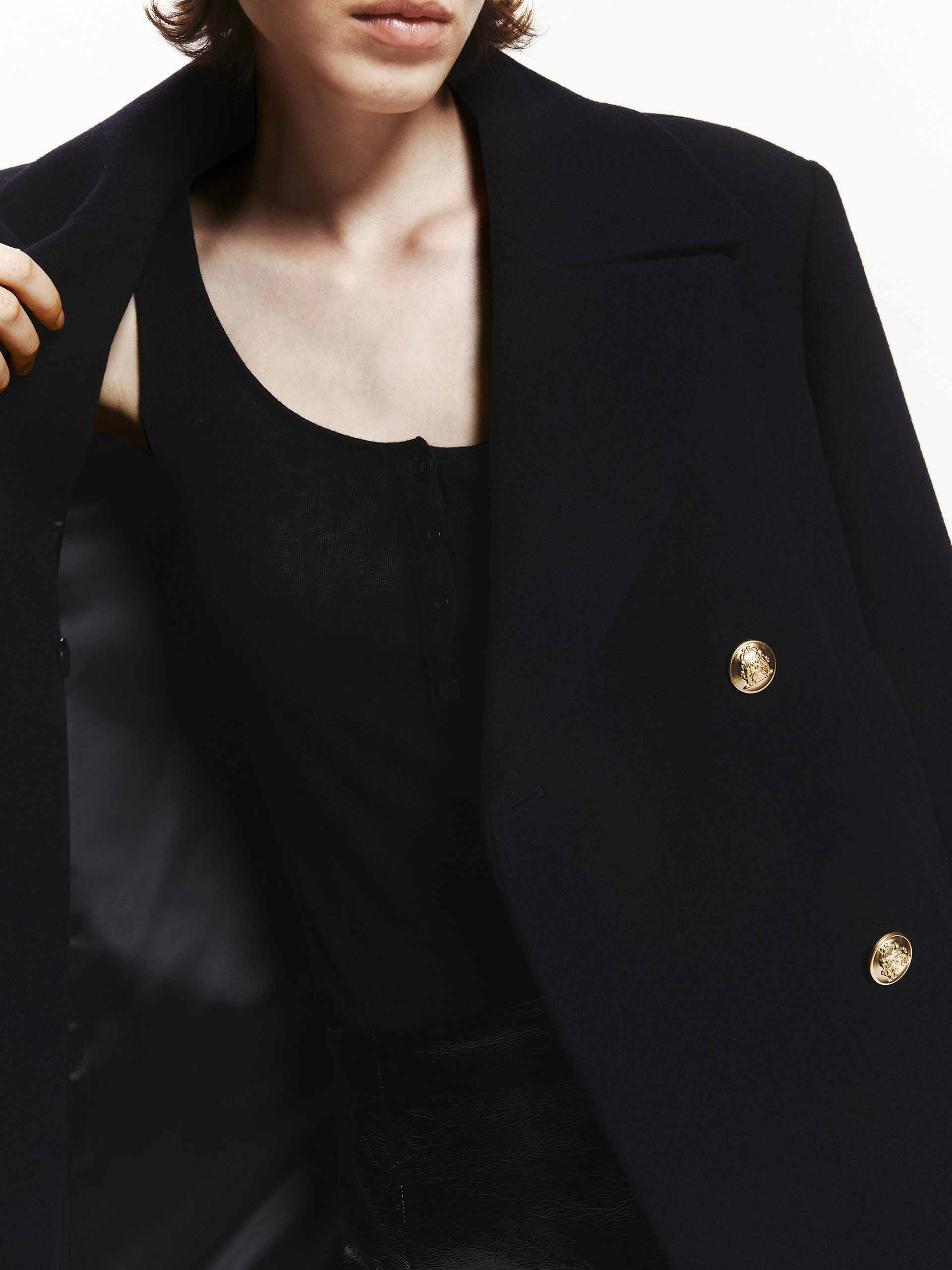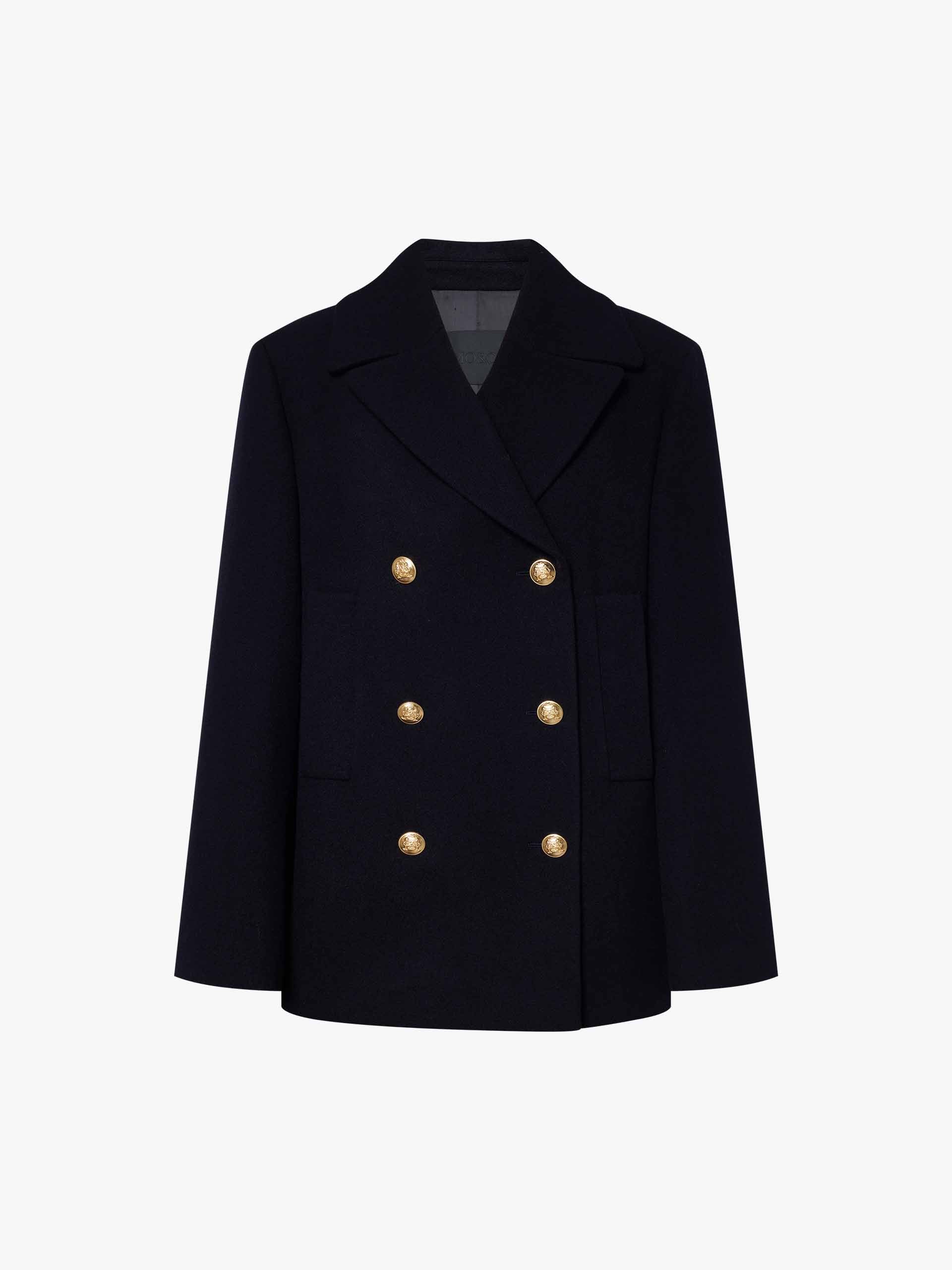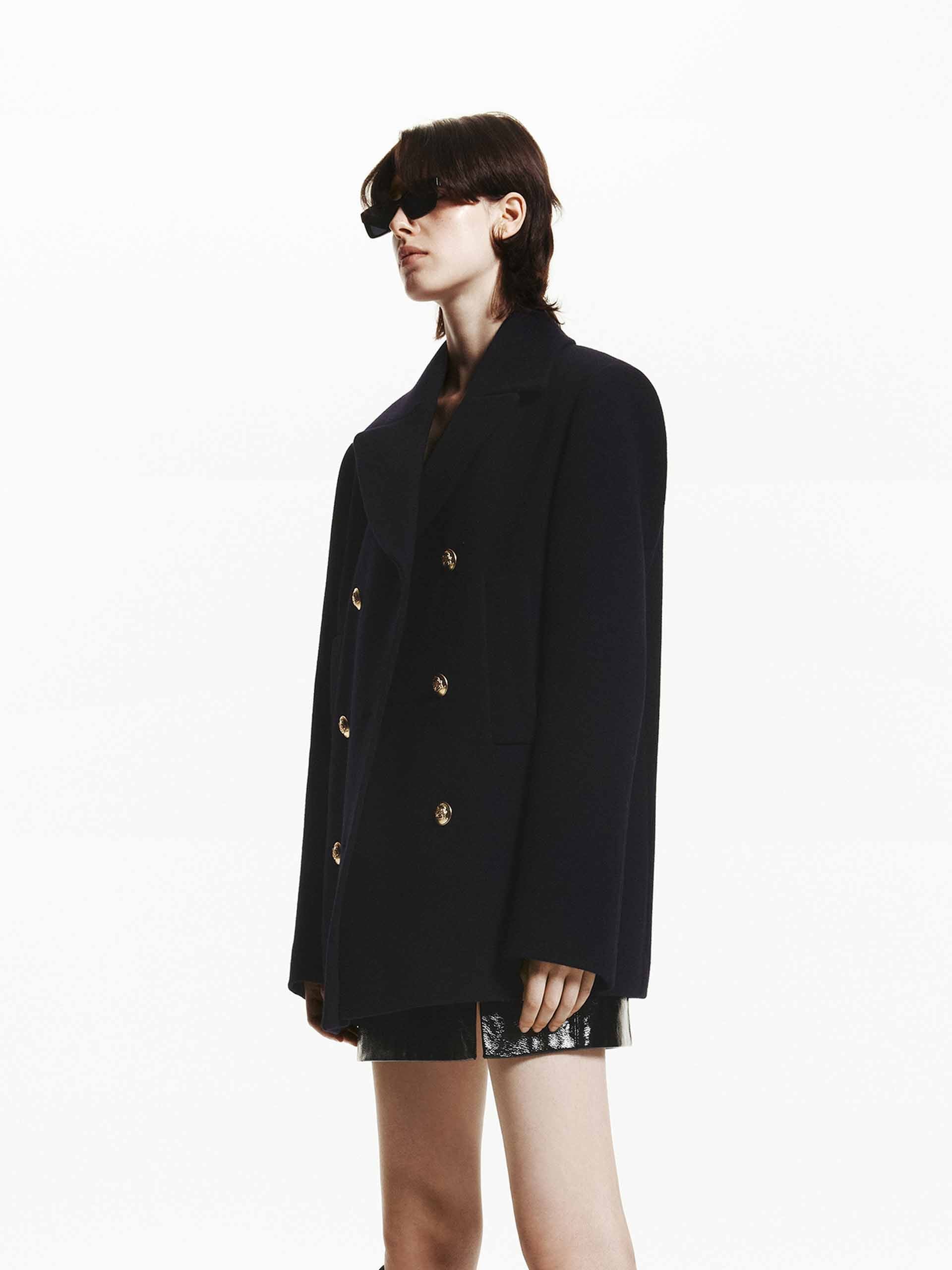Classic design codes are subtly reimagined in this double-breasted coat. It's crafted from premium merino wool in a navy blue hue and has a weighty hand feel and structured silhouette. Combined with a classic lapel collar, side pockets, and delicate metal buttons, it offers both function and fashion.