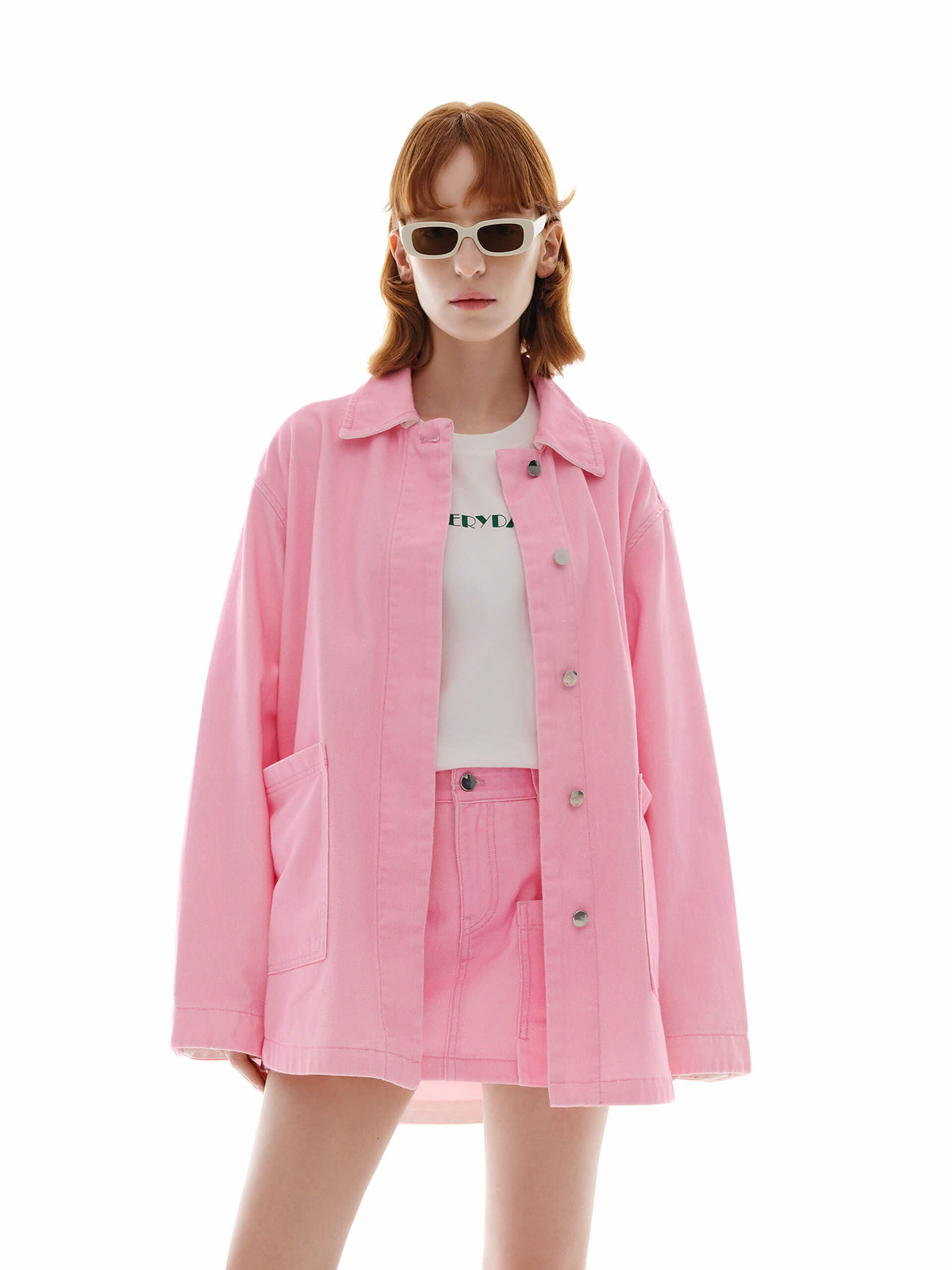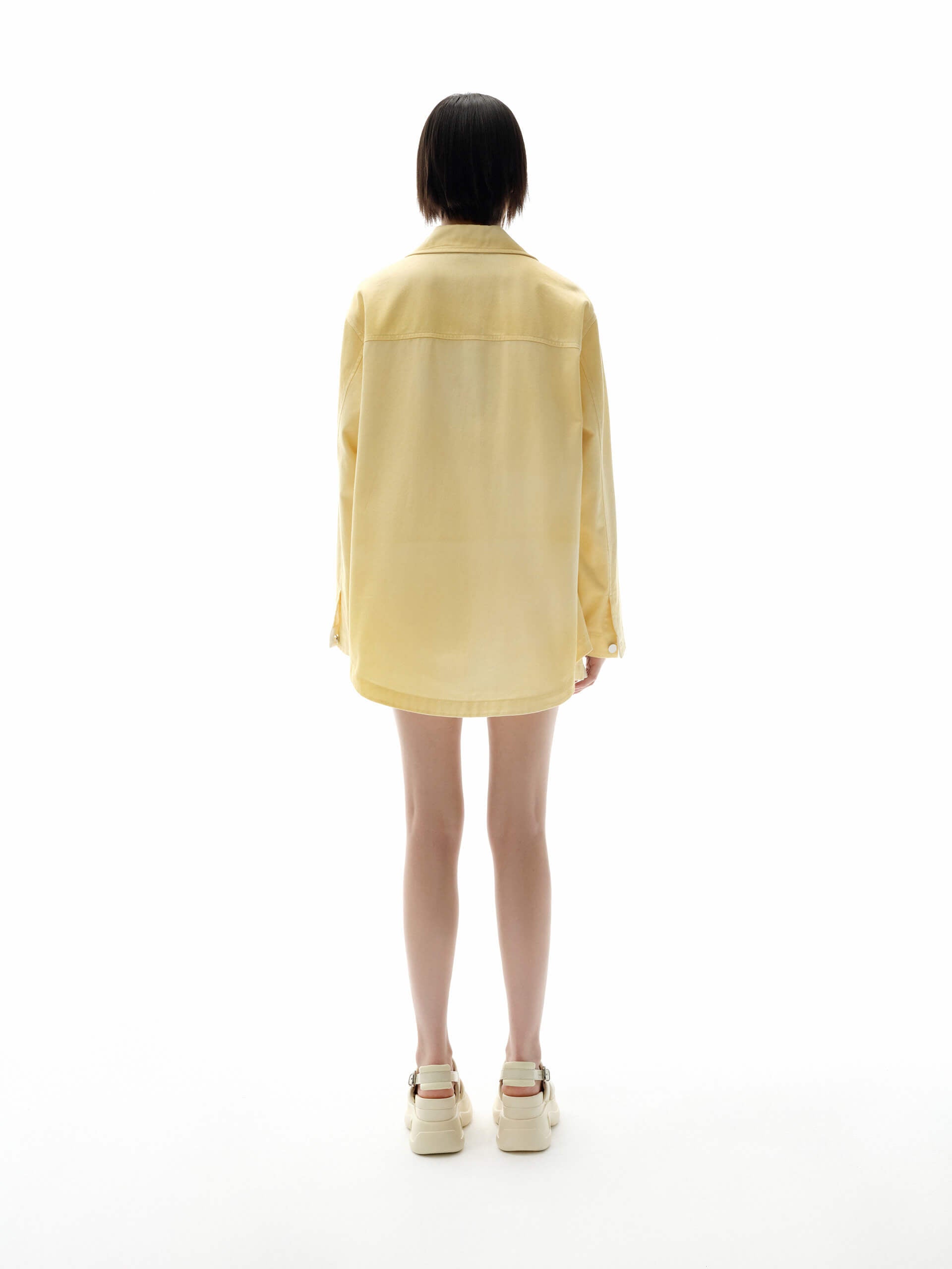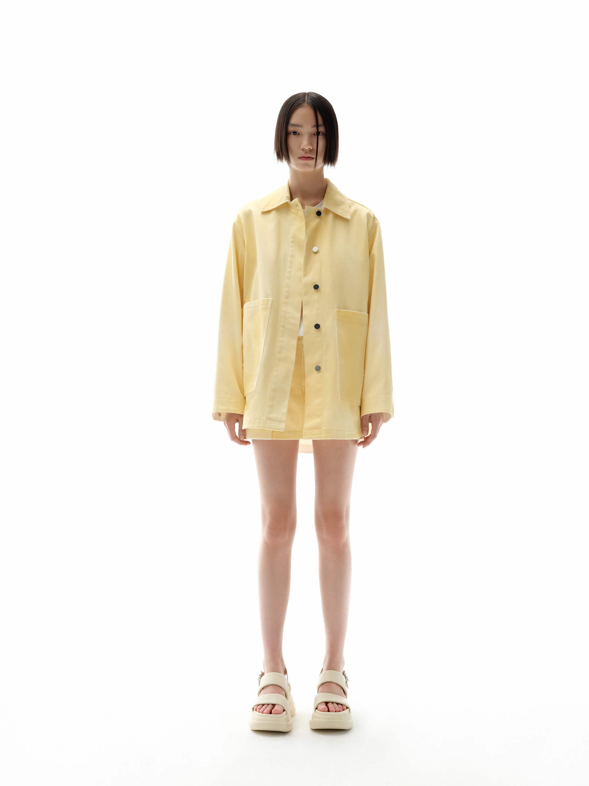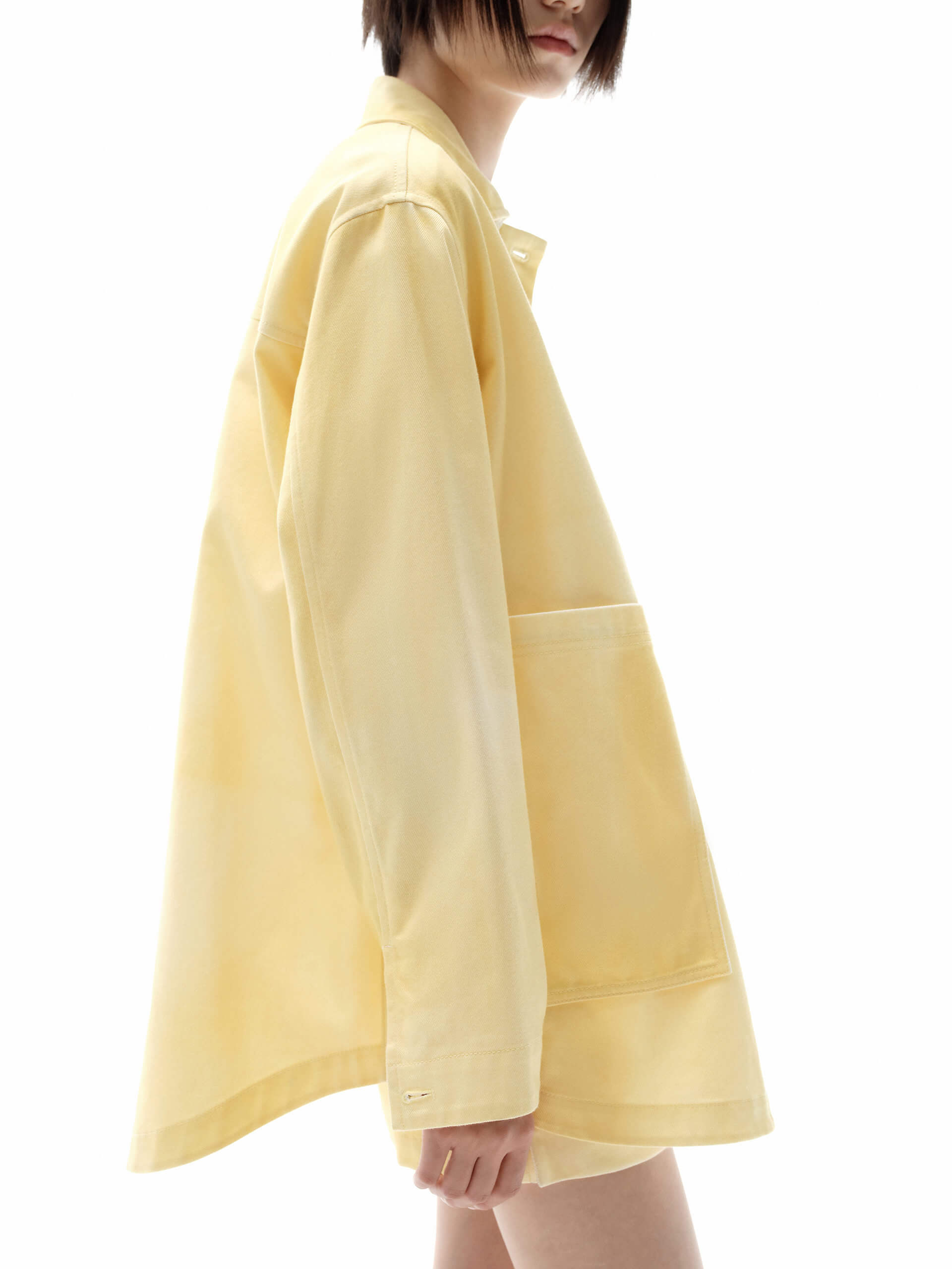 - Loose shirt cut, lapel collar